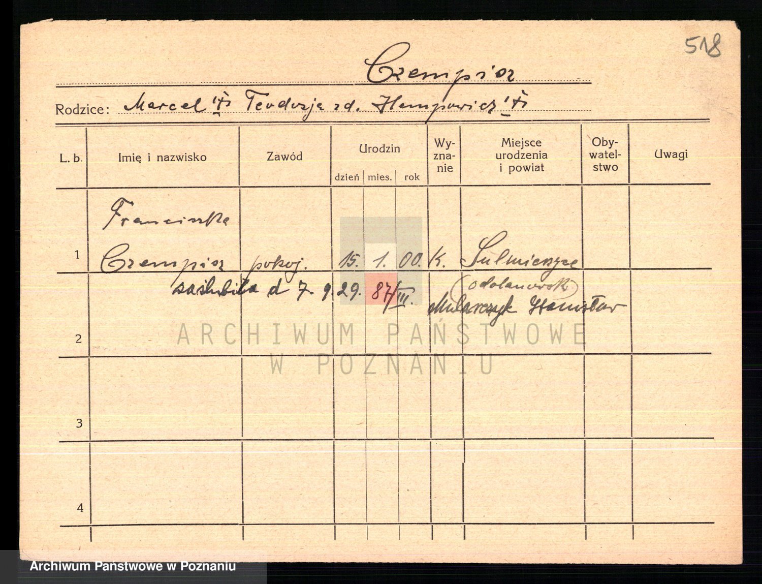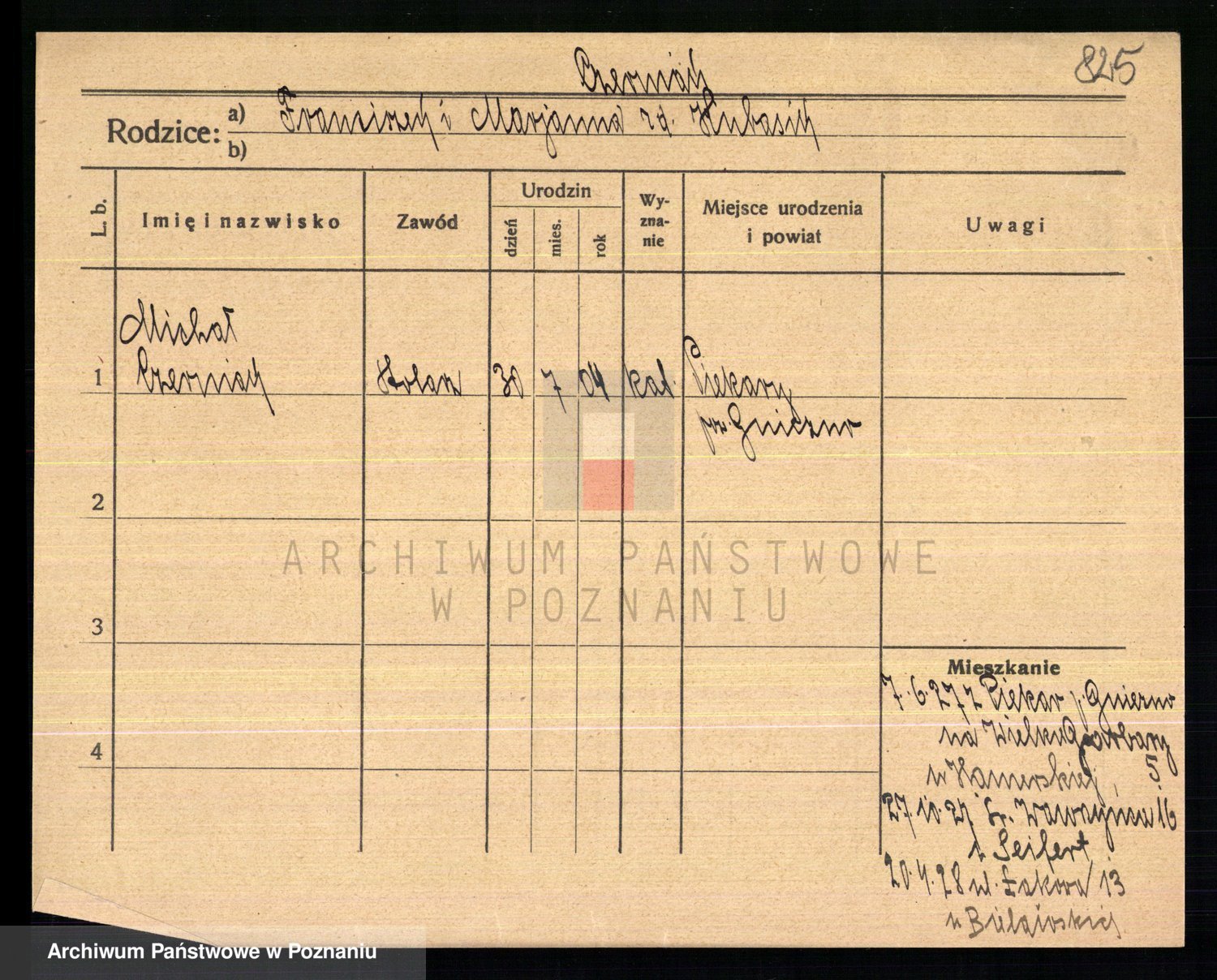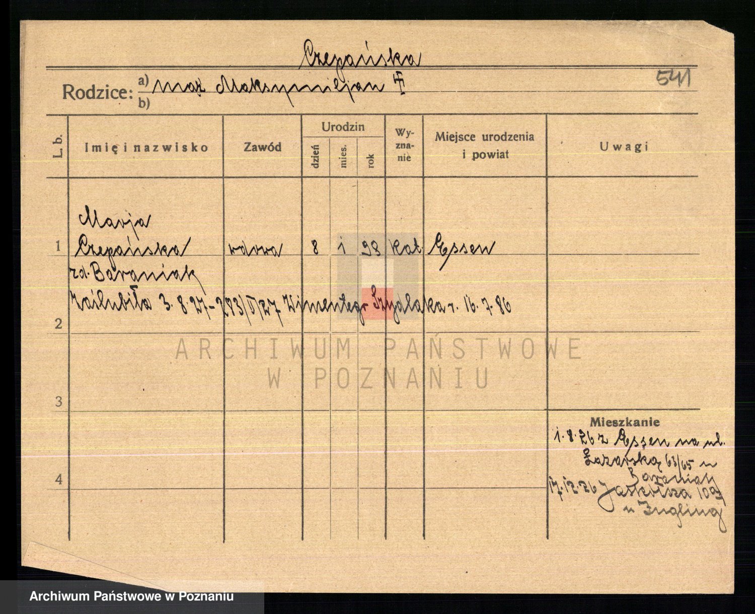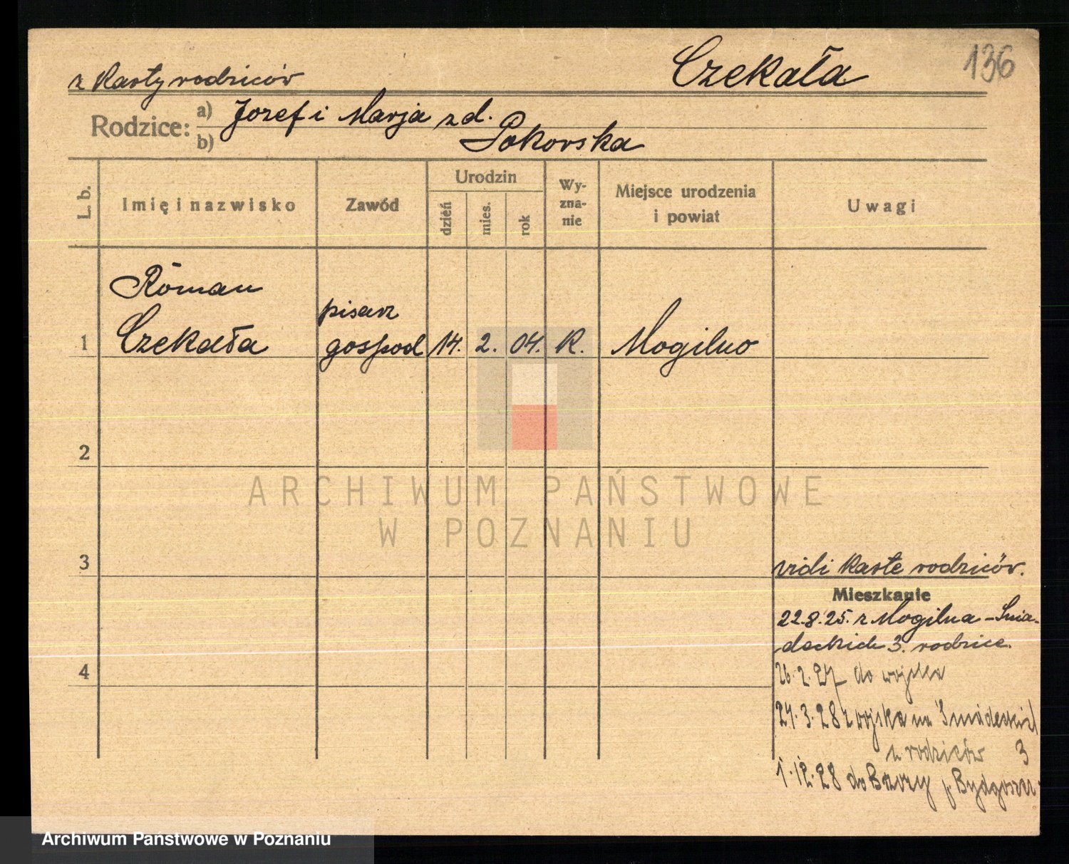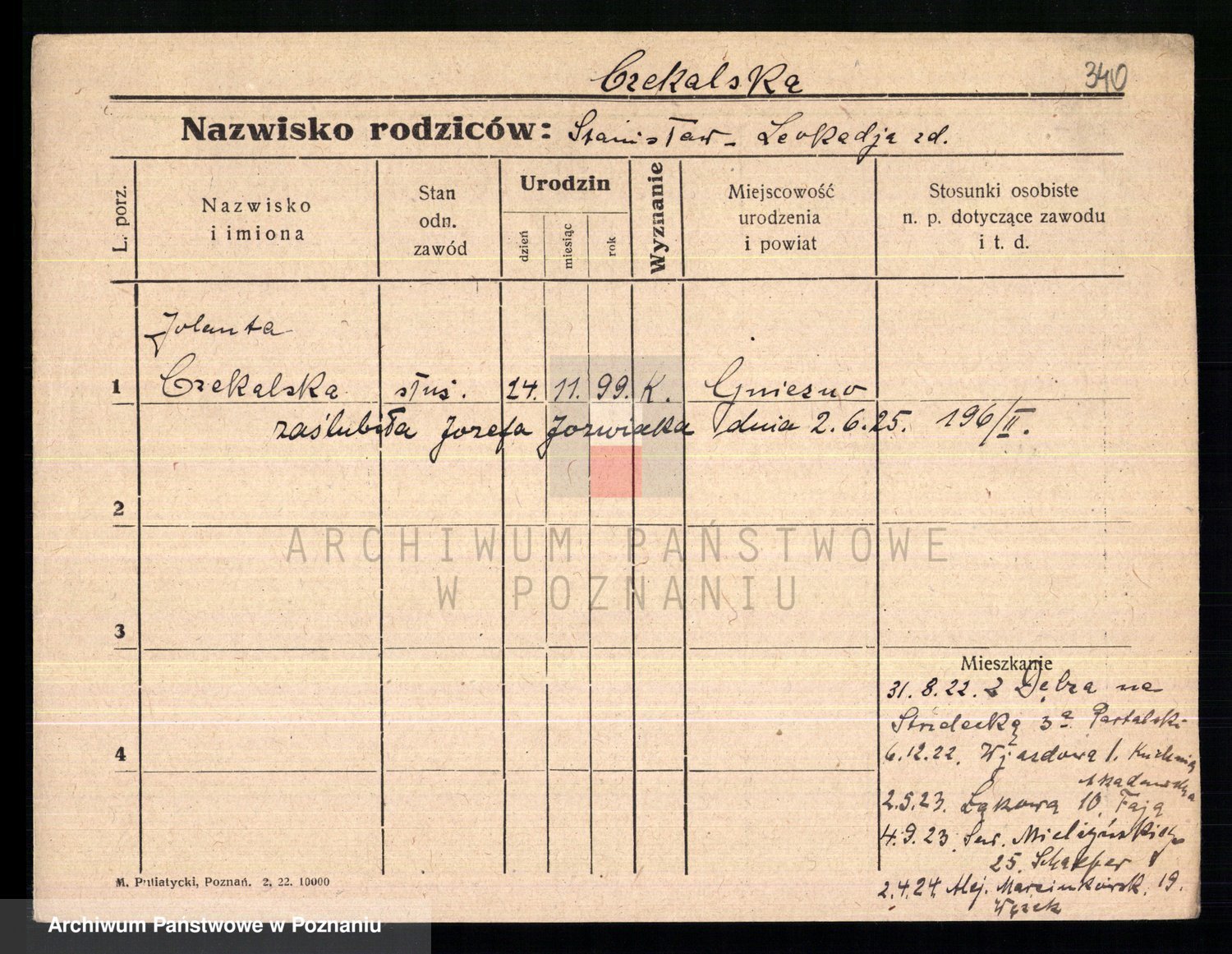 Podgląd karty osobowej dostępny jest po kliknięciu na nazwisko lub ikonkę karty. Można dokonywać powiększenia (ikony na górze) lub przechodzić między kolejnymi skanami (strzałki po bokach).