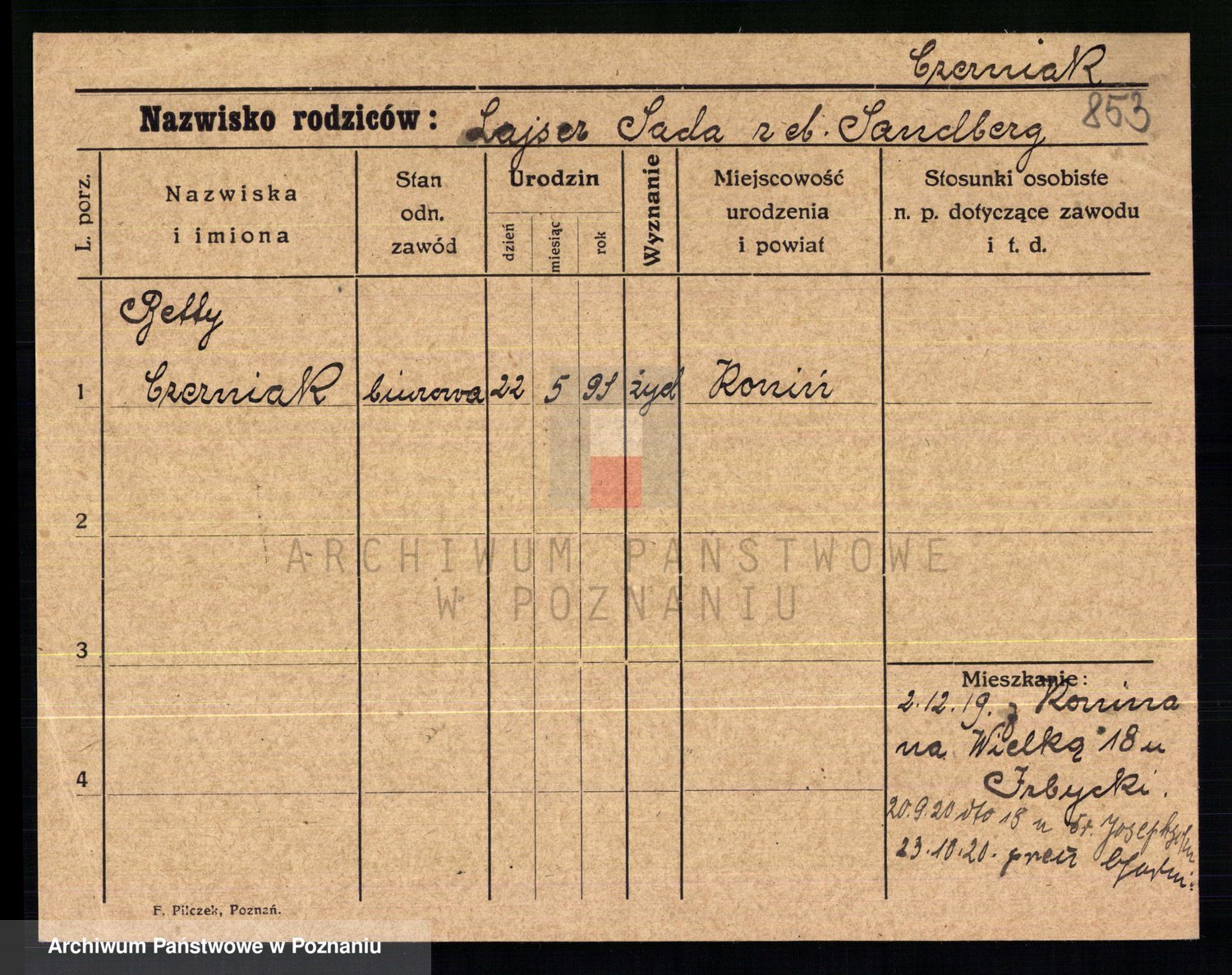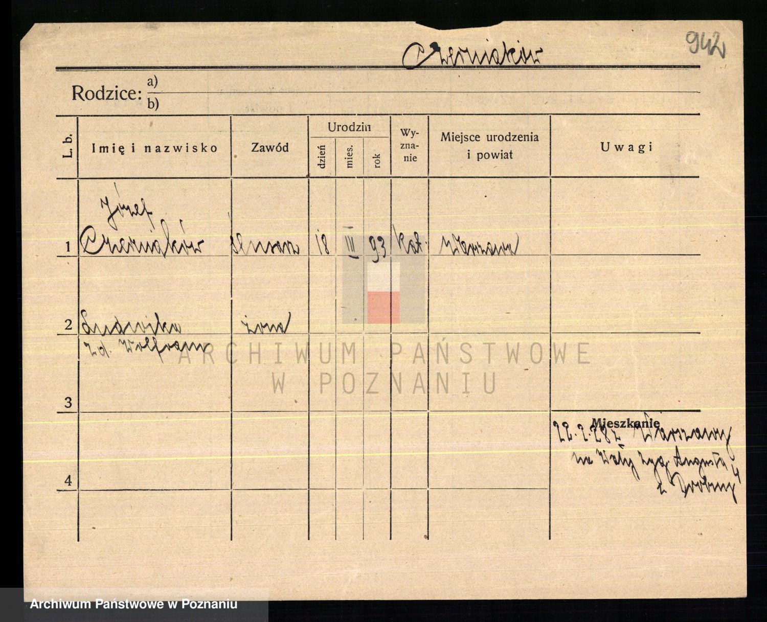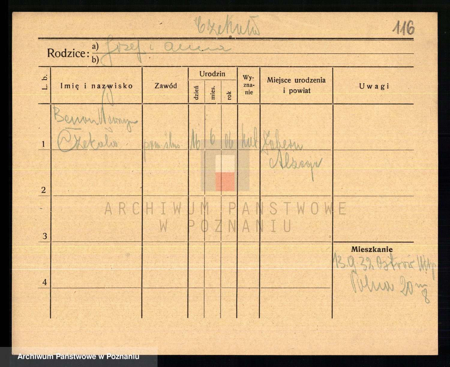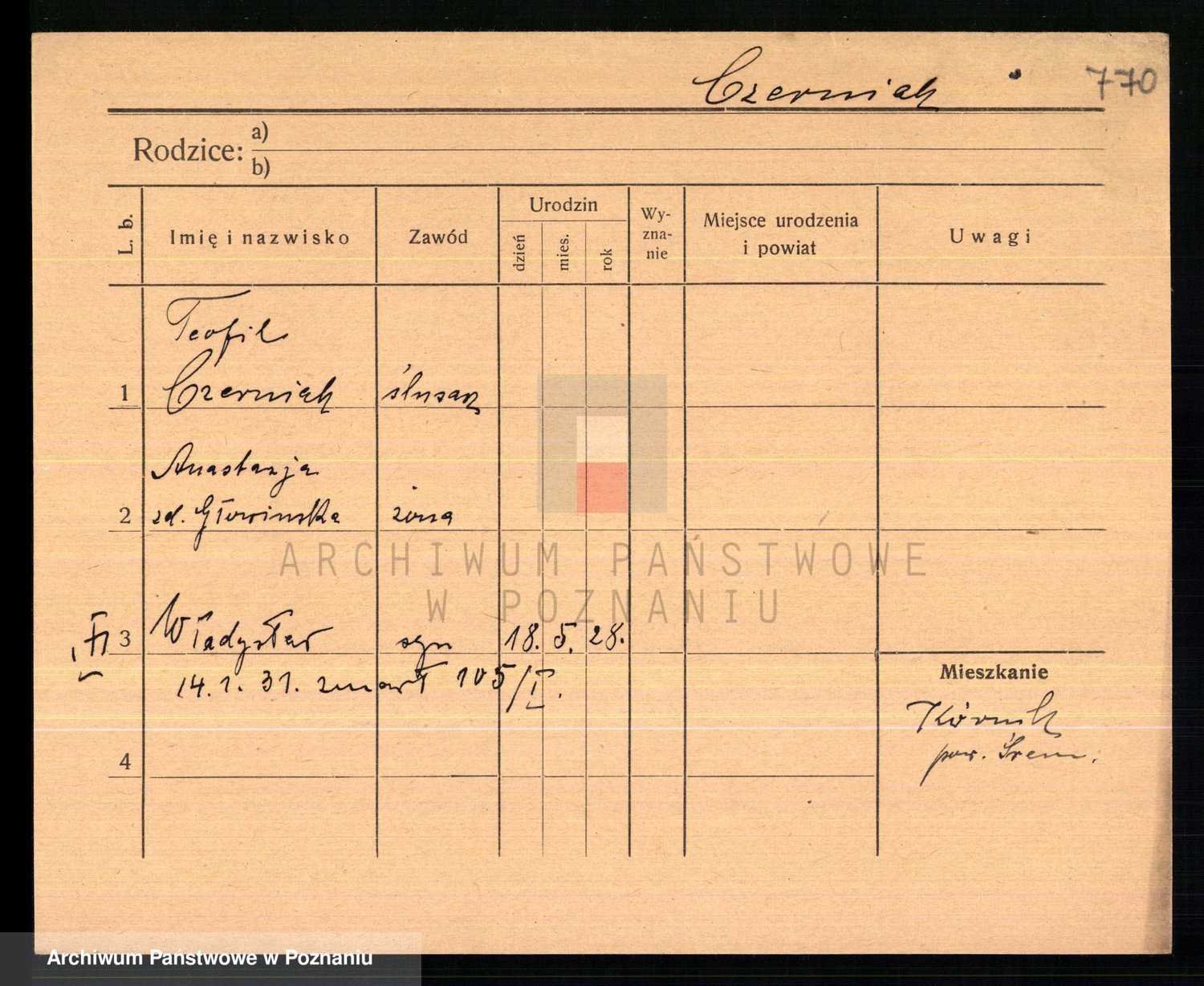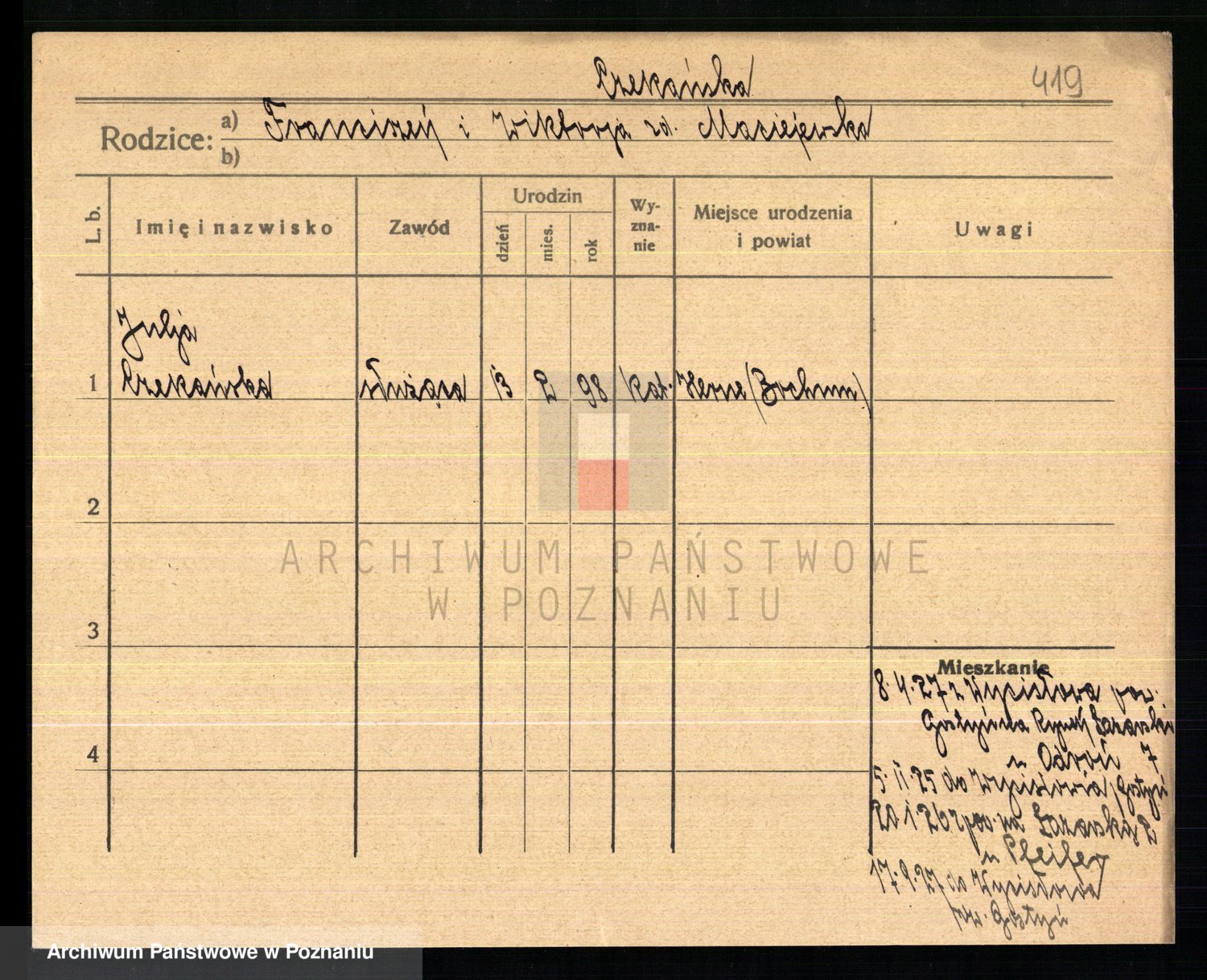 Podgląd karty osobowej dostępny jest po kliknięciu na nazwisko lub ikonkę karty. Można dokonywać powiększenia (ikony na górze) lub przechodzić między kolejnymi skanami (strzałki po bokach).