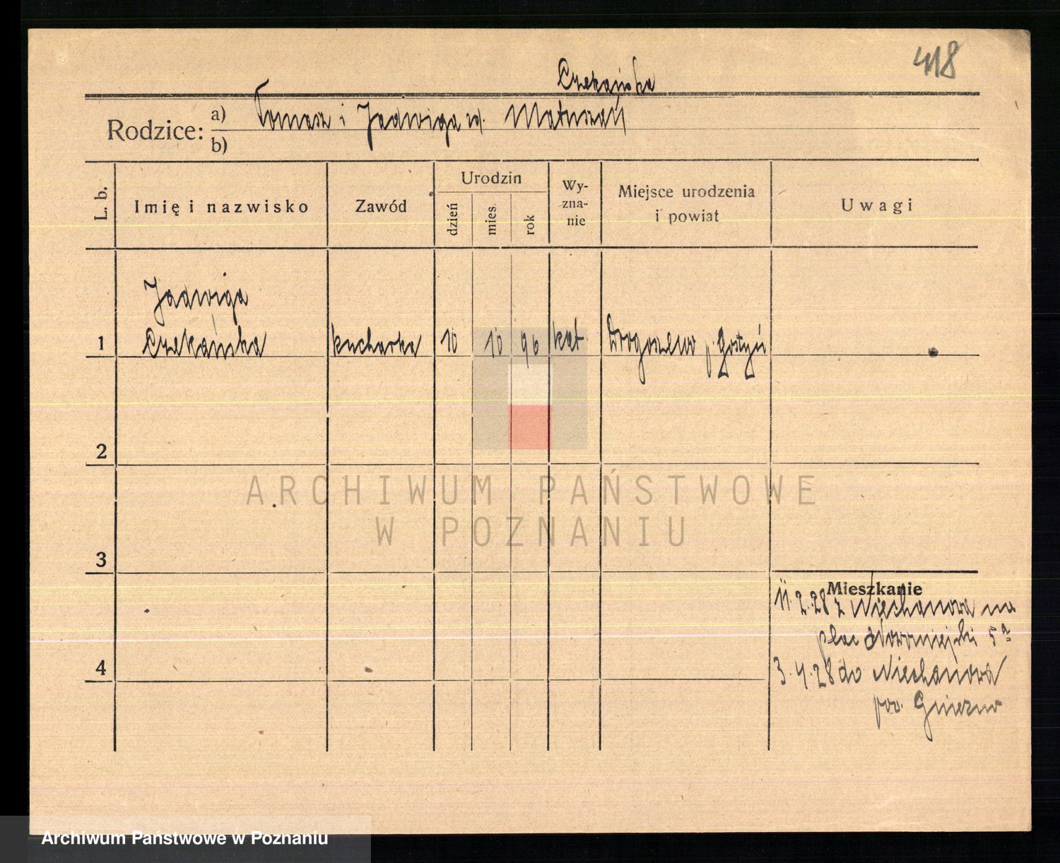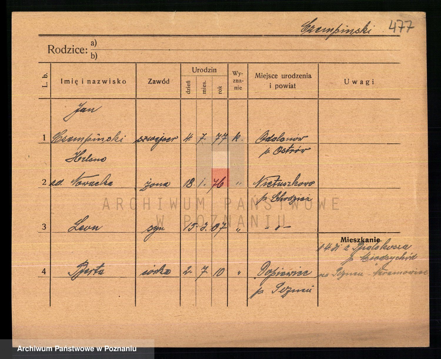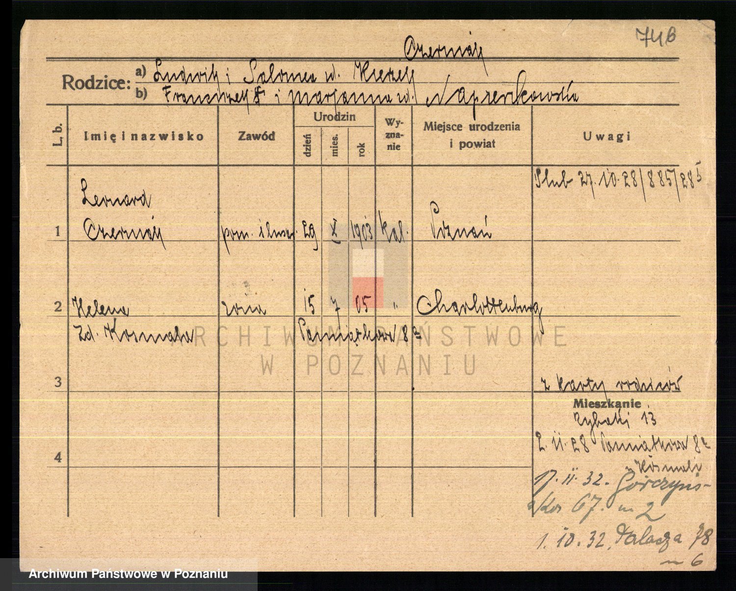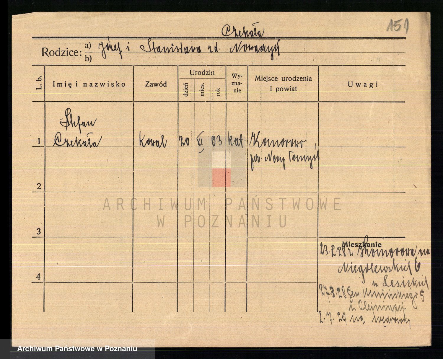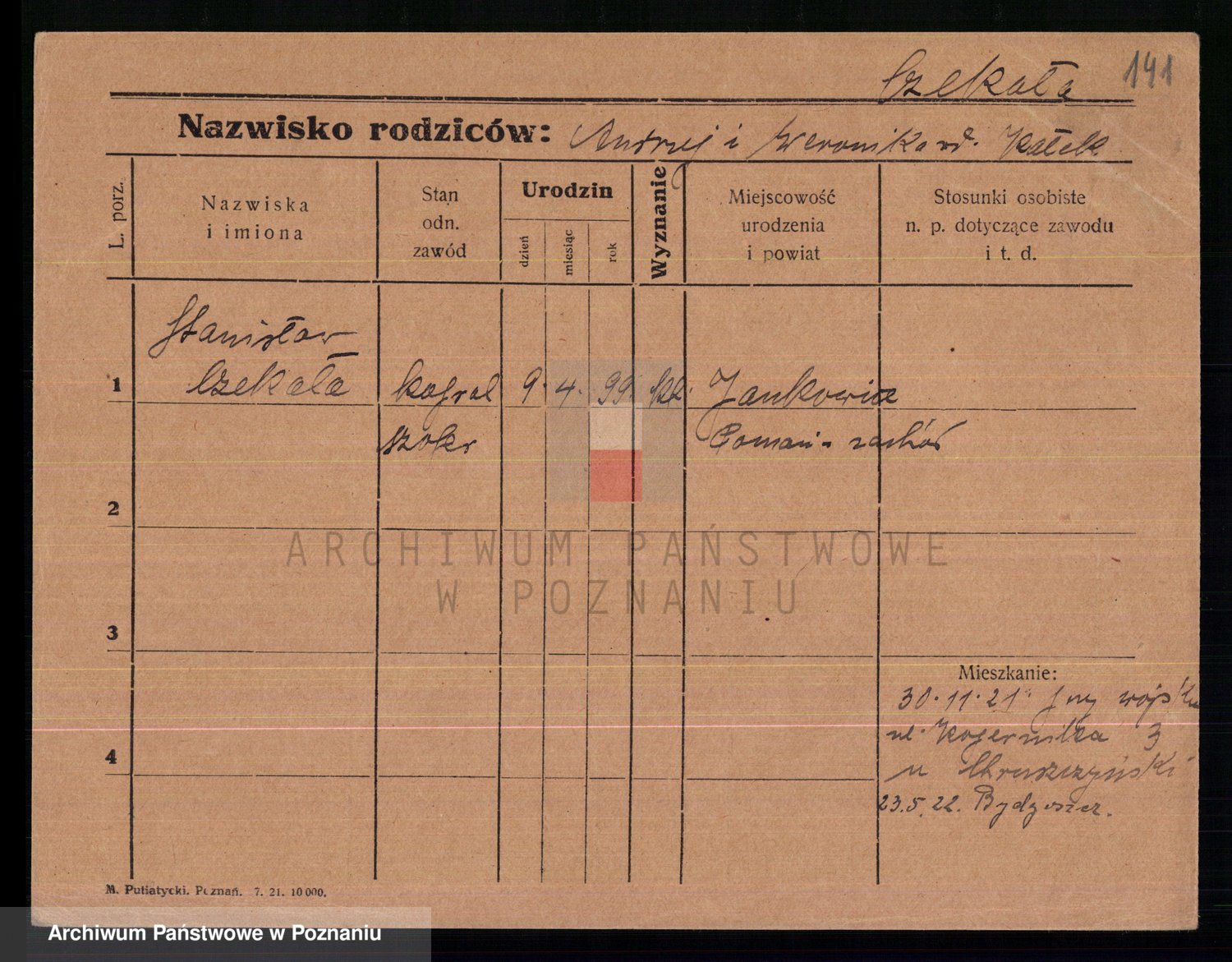 Podgląd karty osobowej dostępny jest po kliknięciu na nazwisko lub ikonkę karty. Można dokonywać powiększenia (ikony na górze) lub przechodzić między kolejnymi skanami (strzałki po bokach).