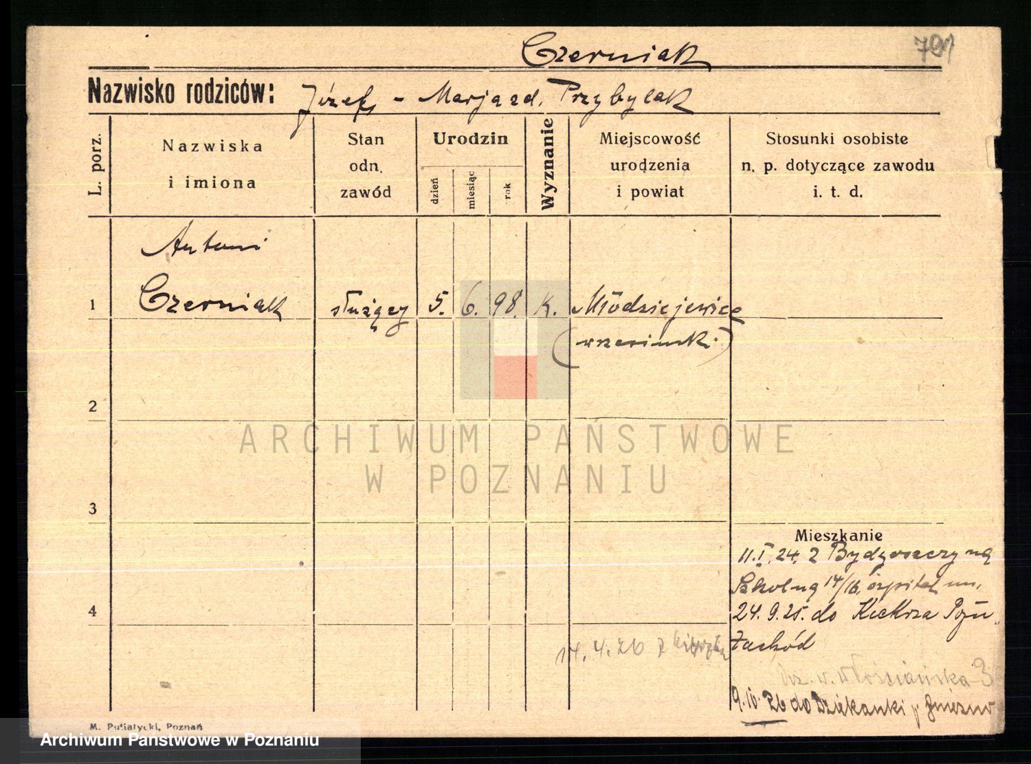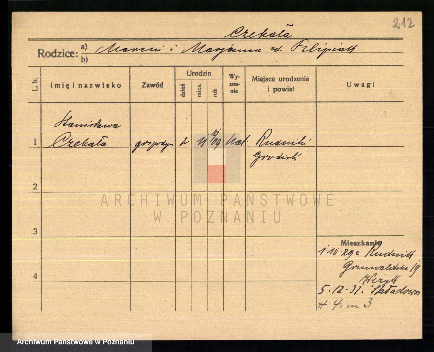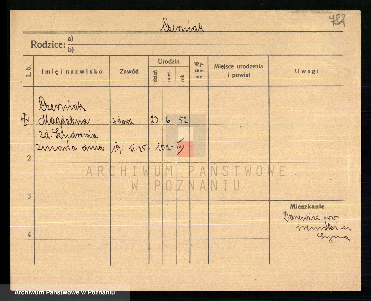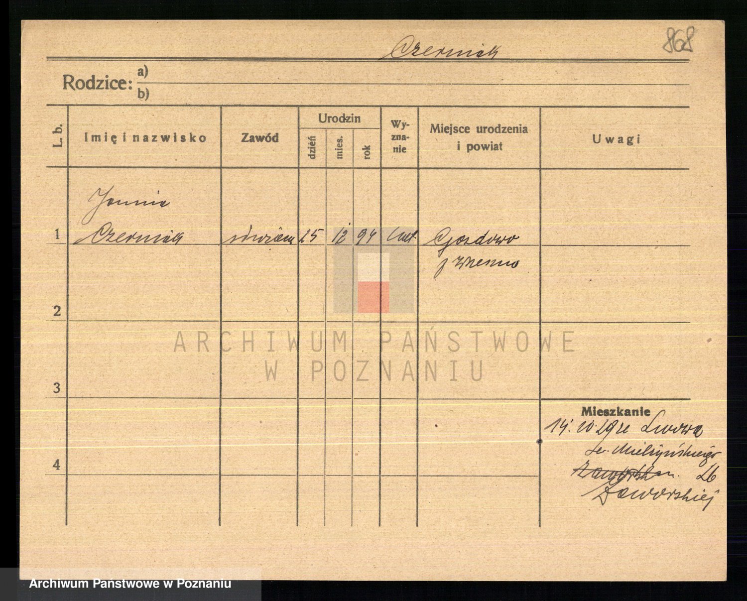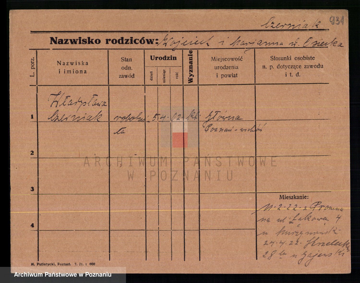 Podgląd karty osobowej dostępny jest po kliknięciu na nazwisko lub ikonkę karty. Można dokonywać powiększenia (ikony na górze) lub przechodzić między kolejnymi skanami (strzałki po bokach).