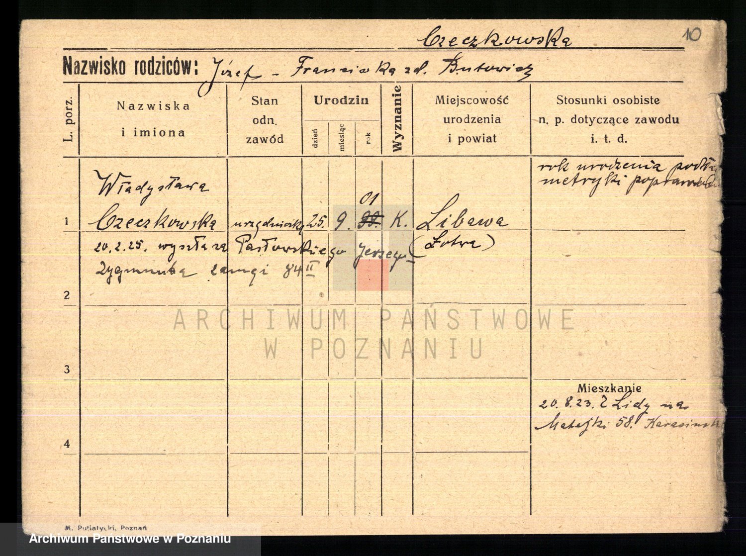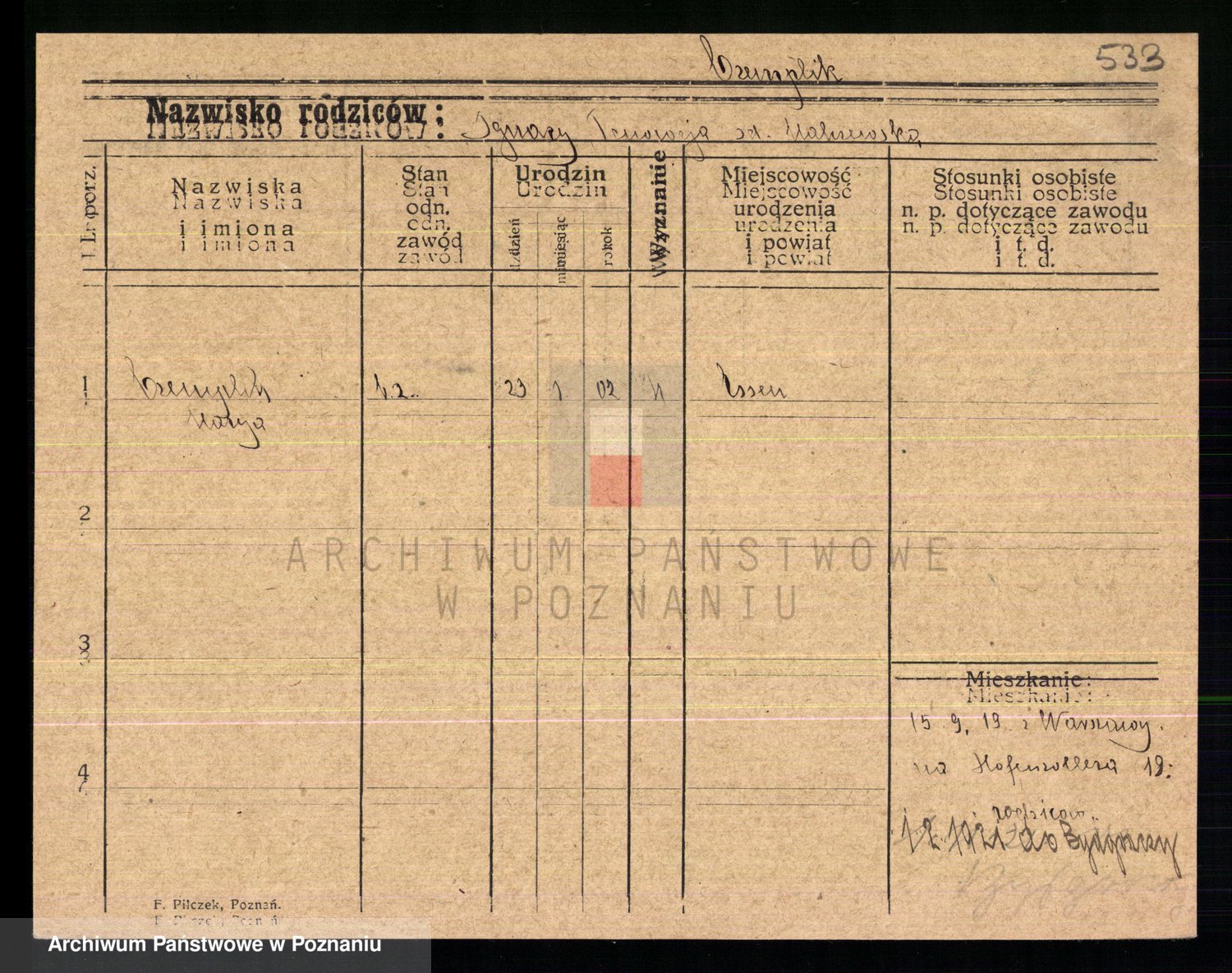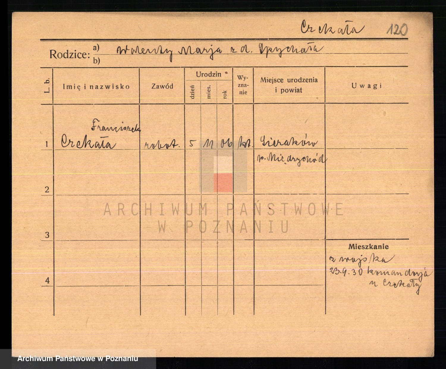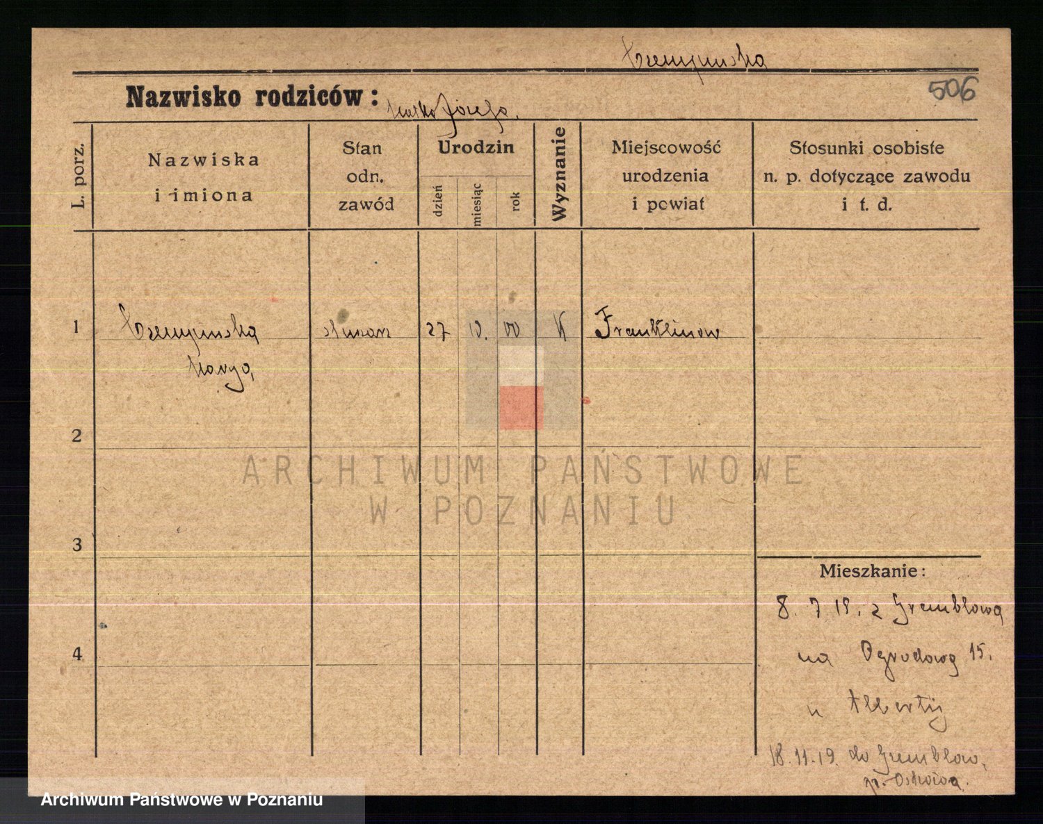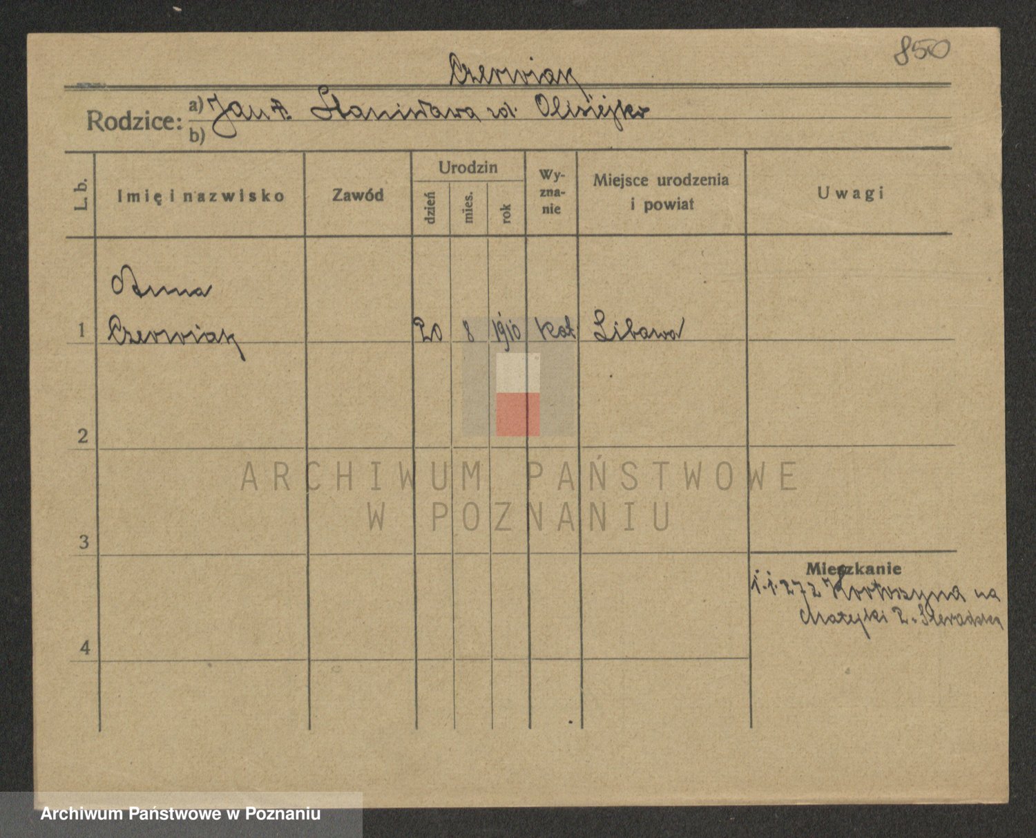 Podgląd karty osobowej dostępny jest po kliknięciu na nazwisko lub ikonkę karty. Można dokonywać powiększenia (ikony na górze) lub przechodzić między kolejnymi skanami (strzałki po bokach).