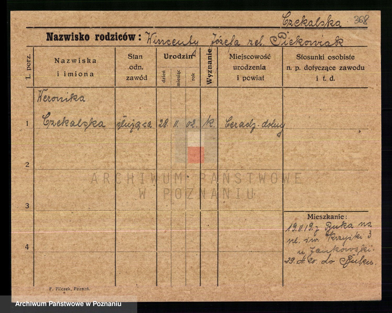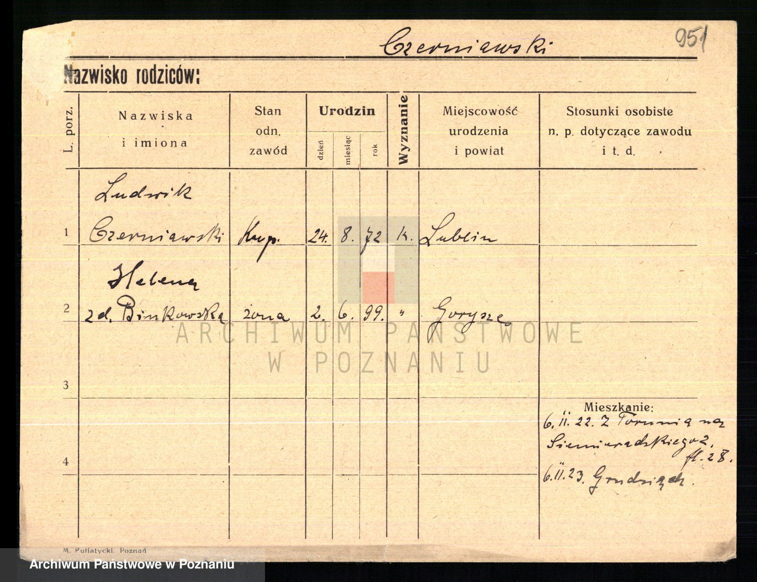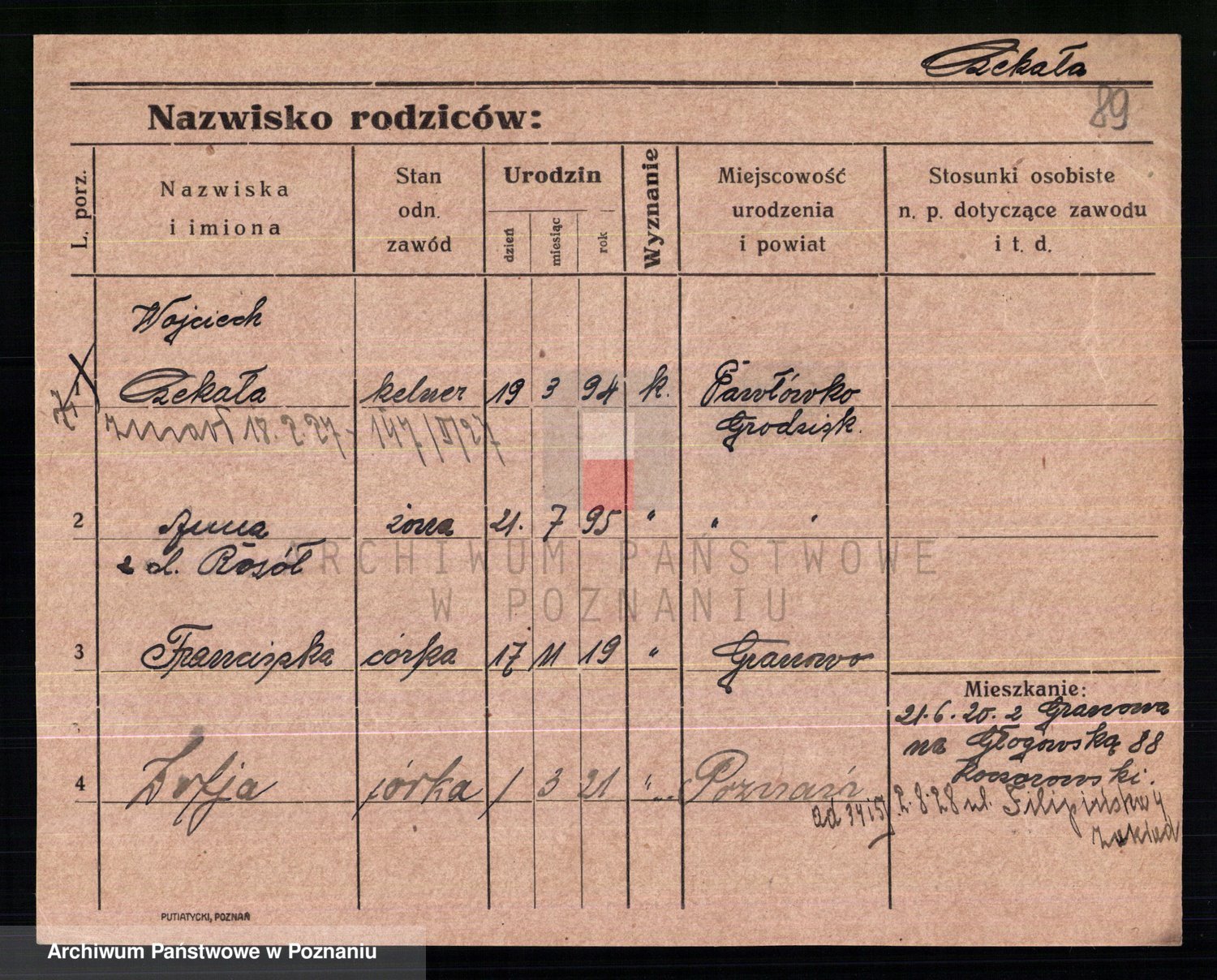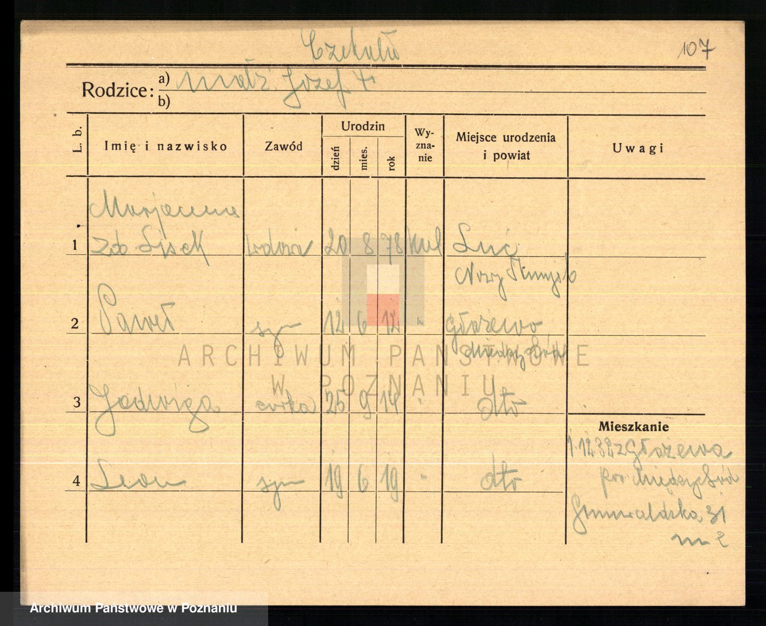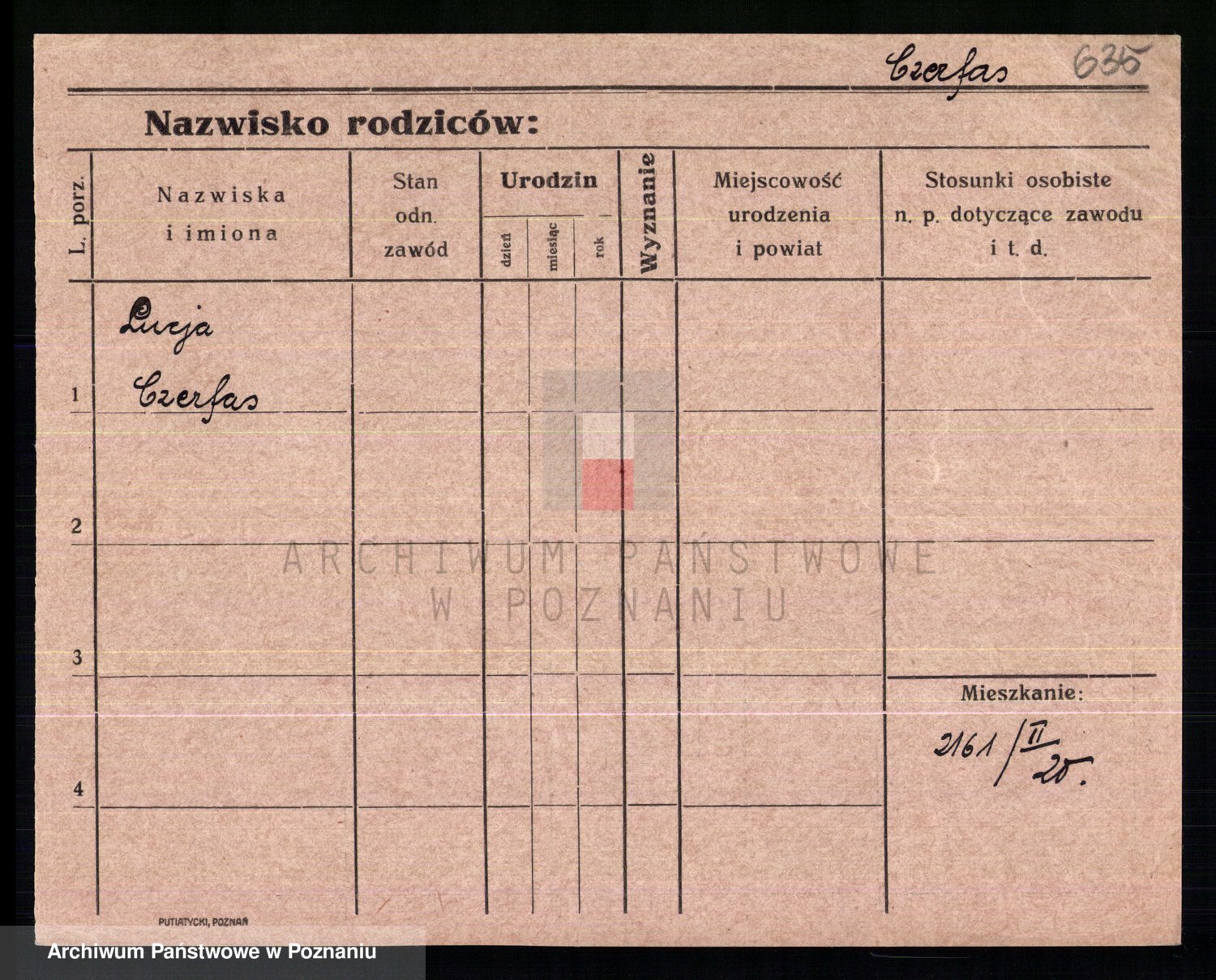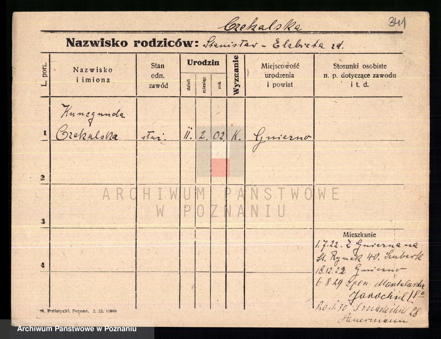 Podgląd karty osobowej dostępny jest po kliknięciu na nazwisko lub ikonkę karty. Można dokonywać powiększenia (ikony na górze) lub przechodzić między kolejnymi skanami (strzałki po bokach).