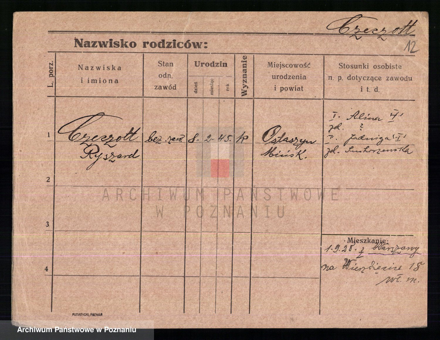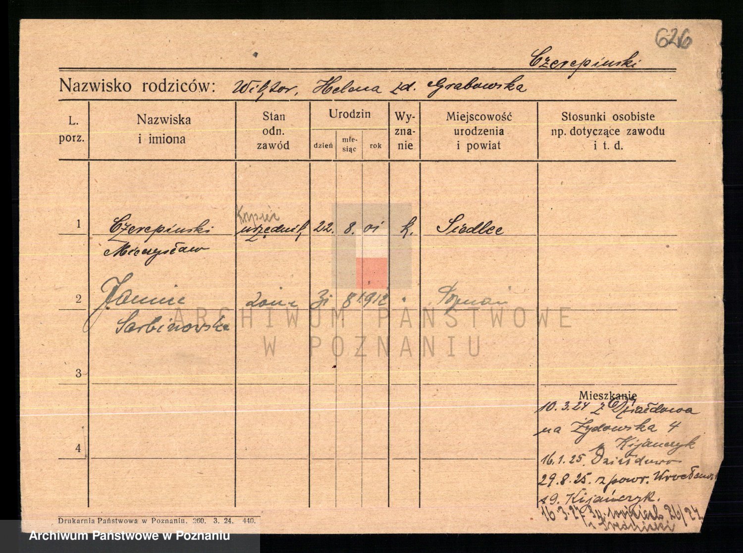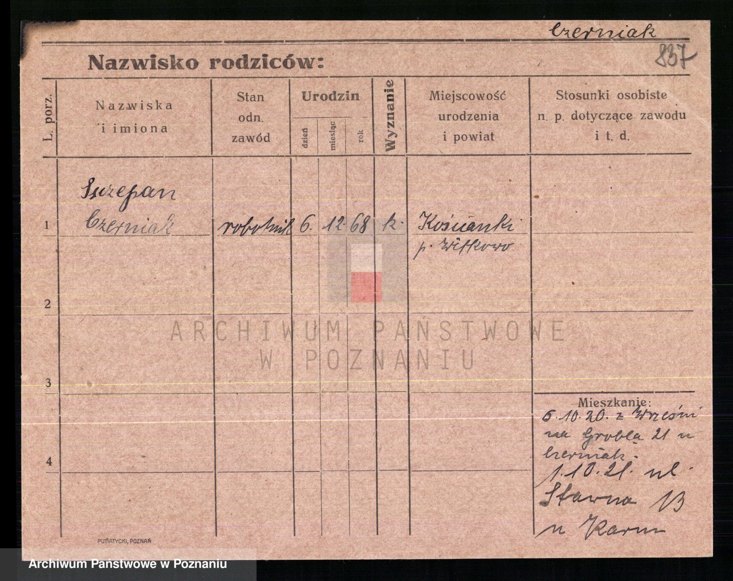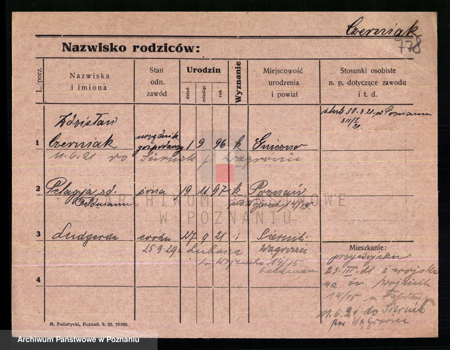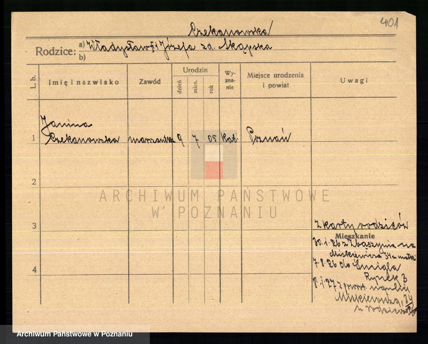 Podgląd karty osobowej dostępny jest po kliknięciu na nazwisko lub ikonkę karty. Można dokonywać powiększenia (ikony na górze) lub przechodzić między kolejnymi skanami (strzałki po bokach).