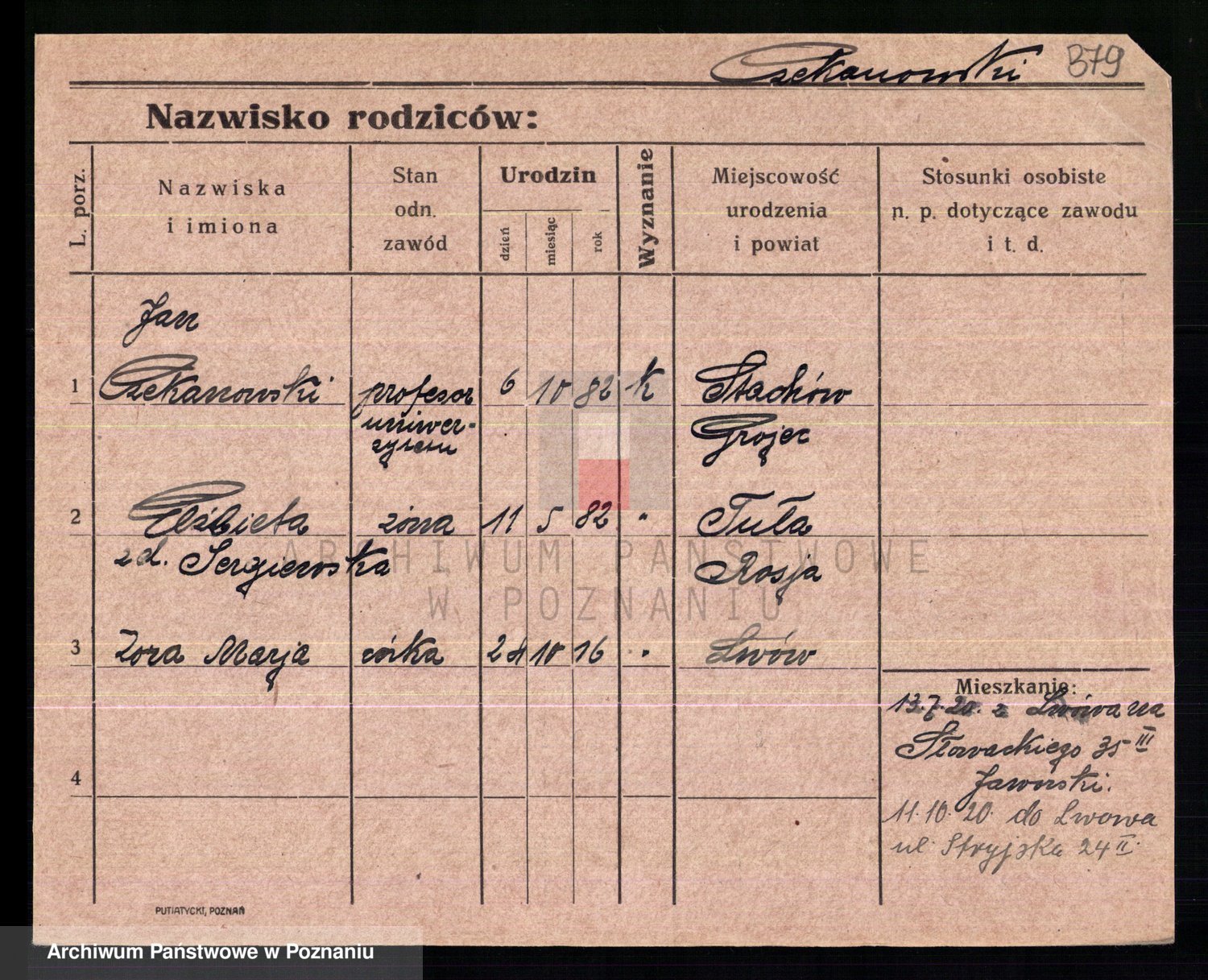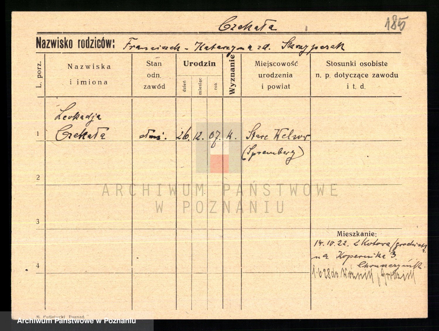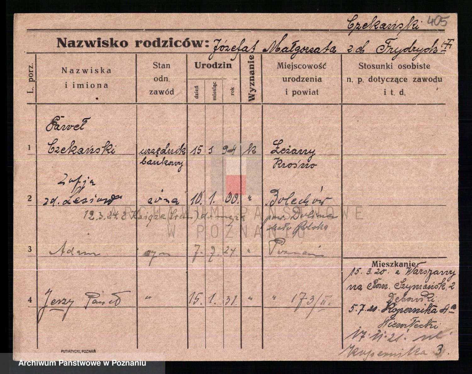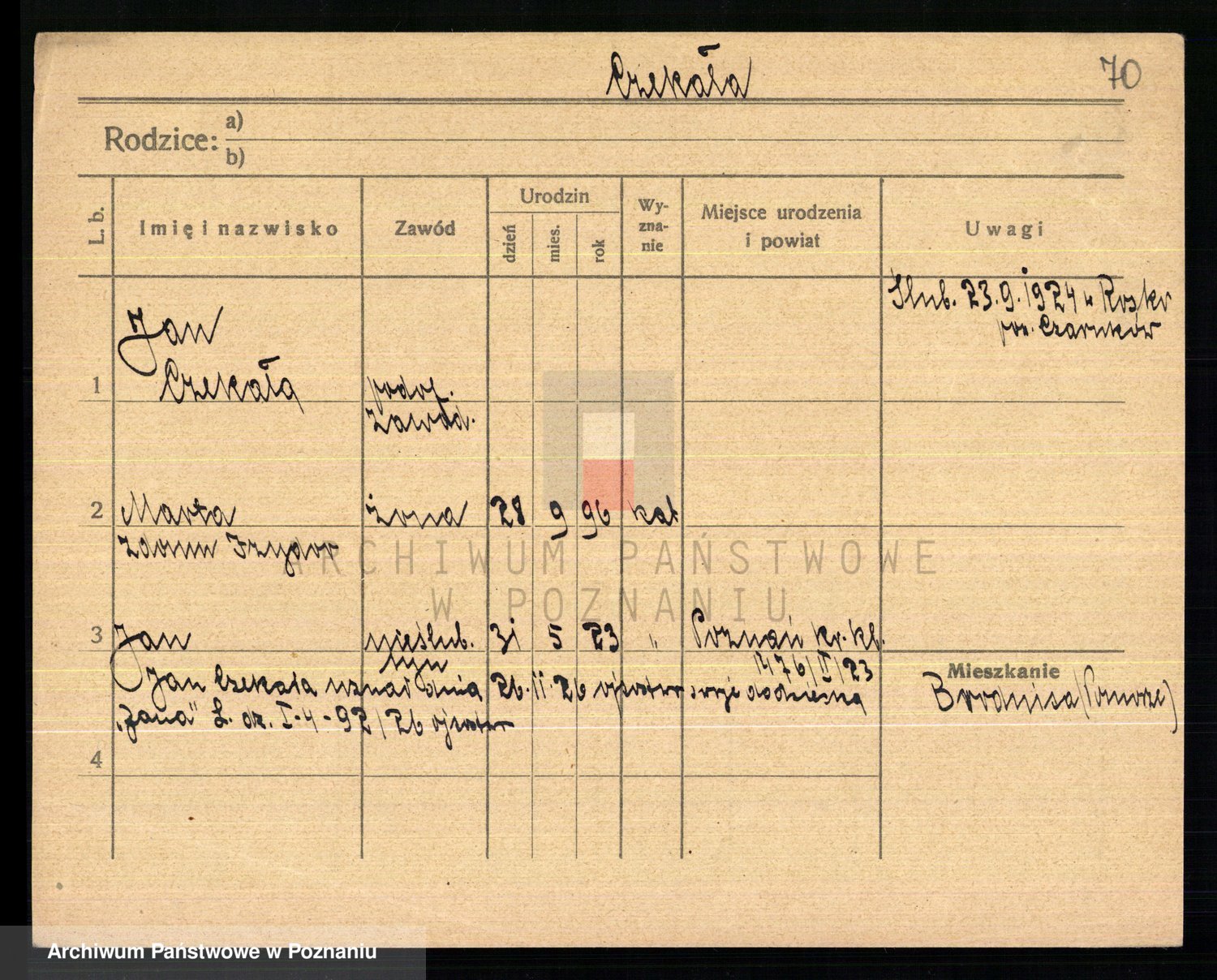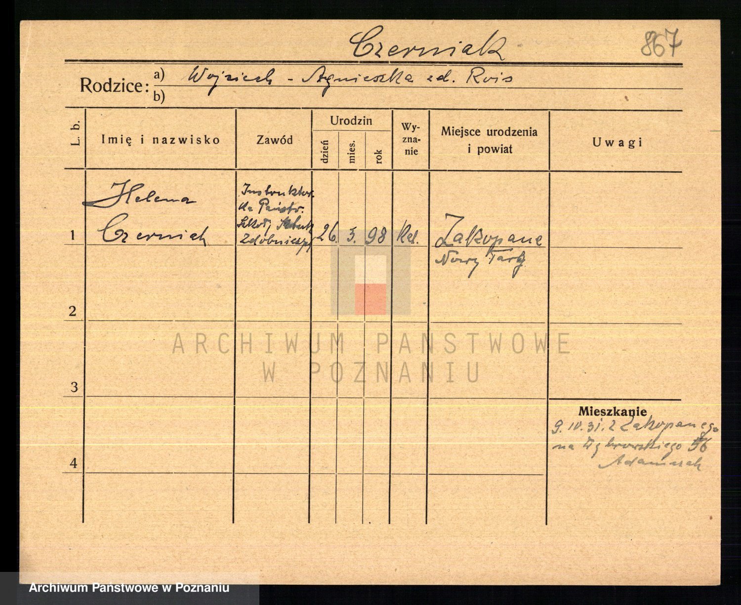 Podgląd karty osobowej dostępny jest po kliknięciu na nazwisko lub ikonkę karty. Można dokonywać powiększenia (ikony na górze) lub przechodzić między kolejnymi skanami (strzałki po bokach).