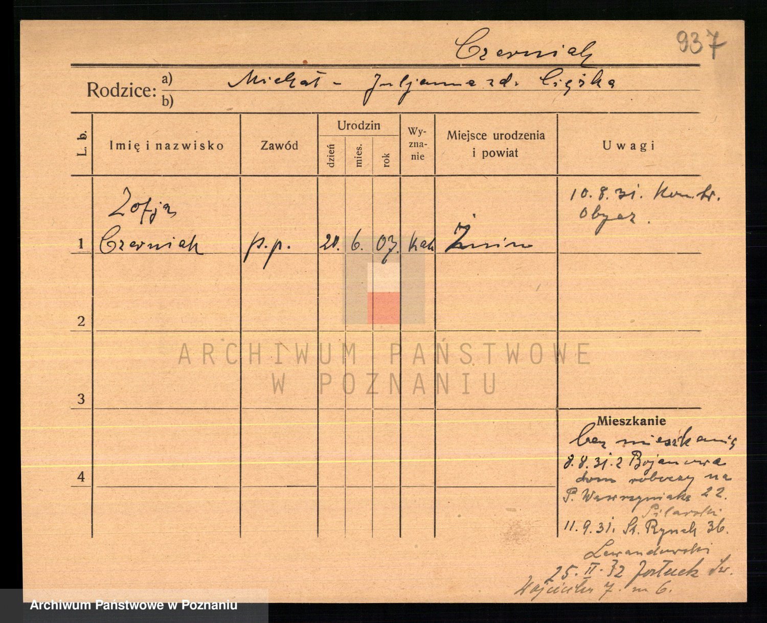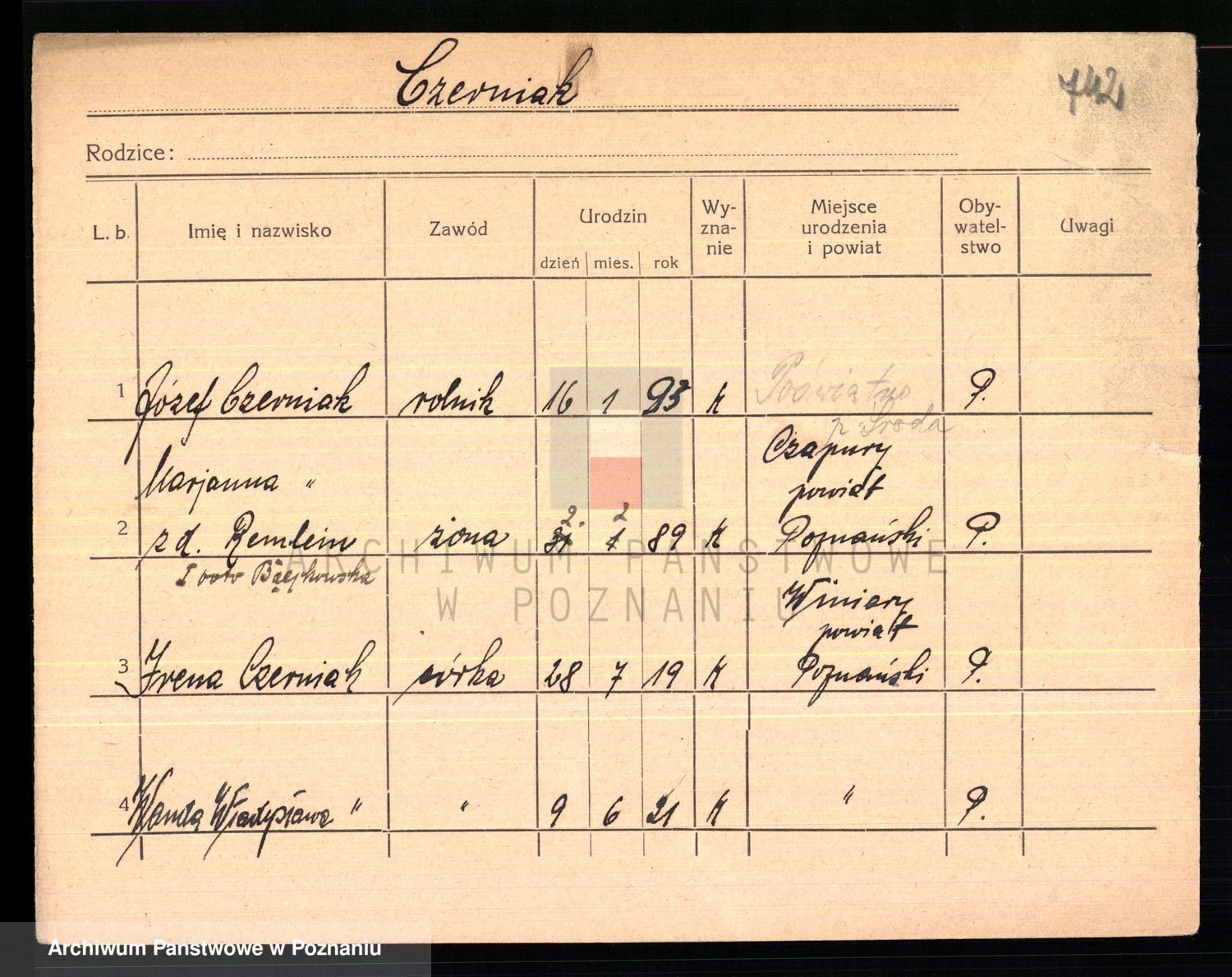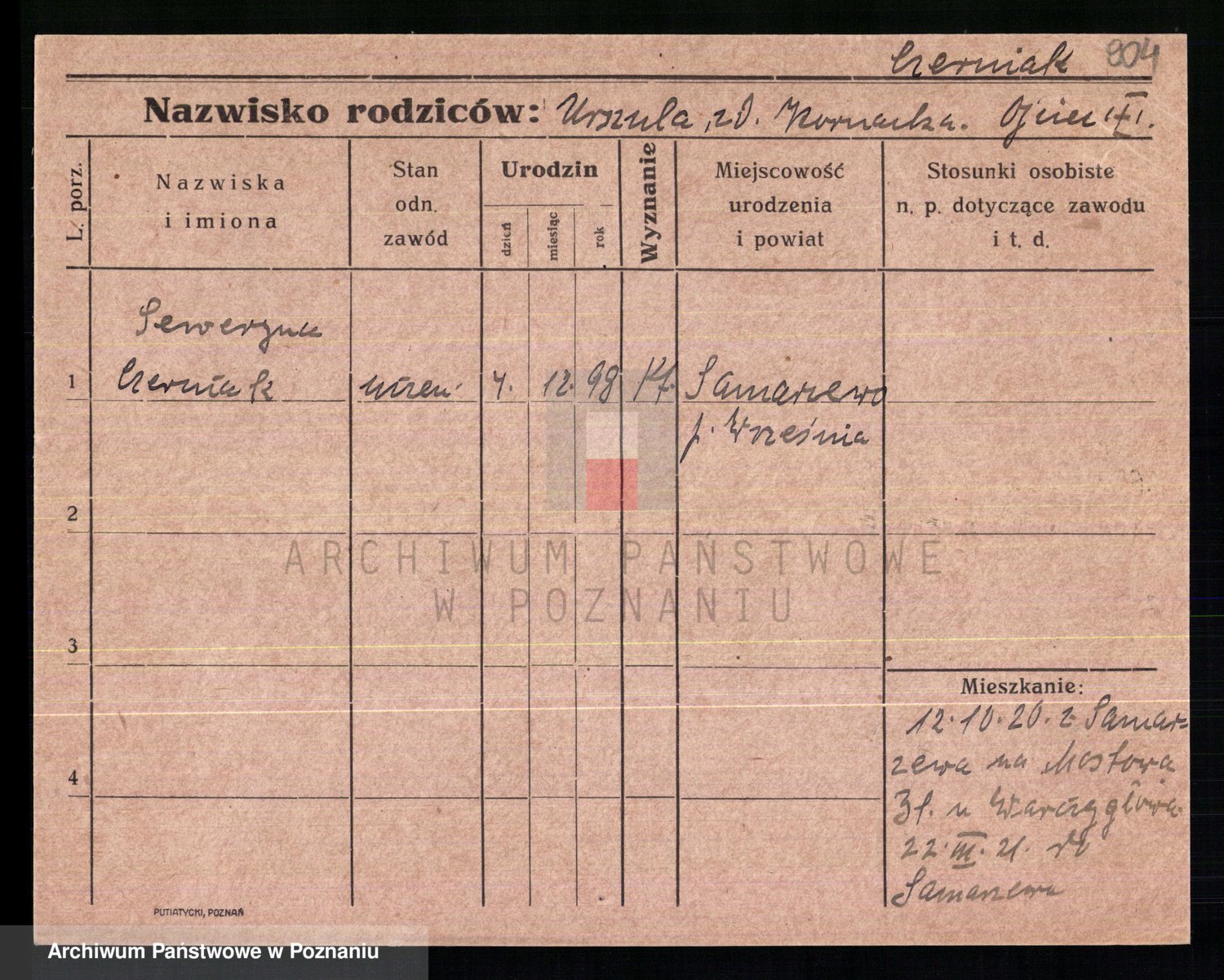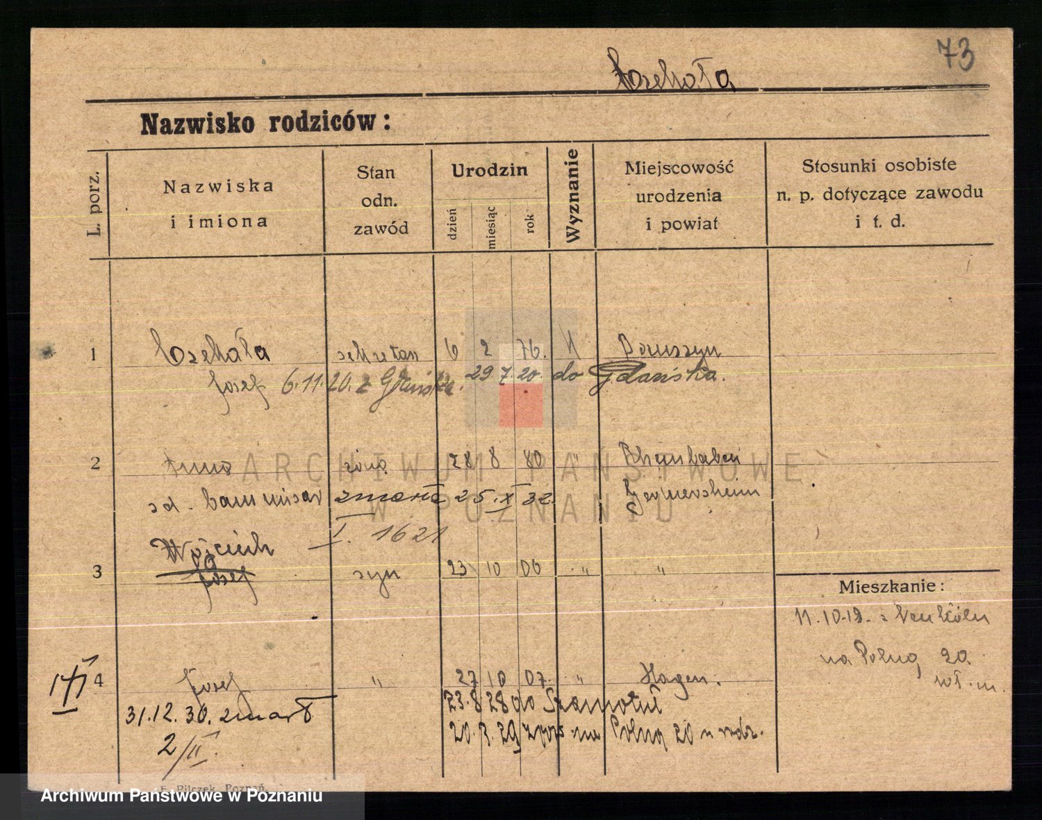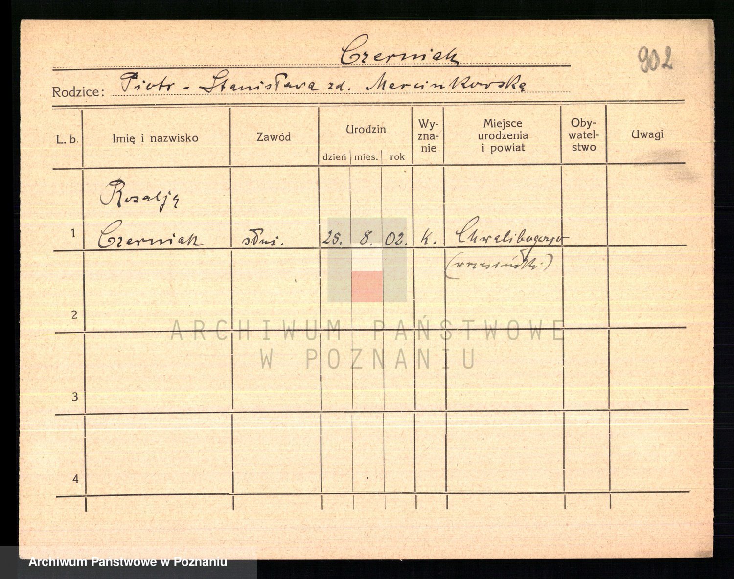 Podgląd karty osobowej dostępny jest po kliknięciu na nazwisko lub ikonkę karty. Można dokonywać powiększenia (ikony na górze) lub przechodzić między kolejnymi skanami (strzałki po bokach).