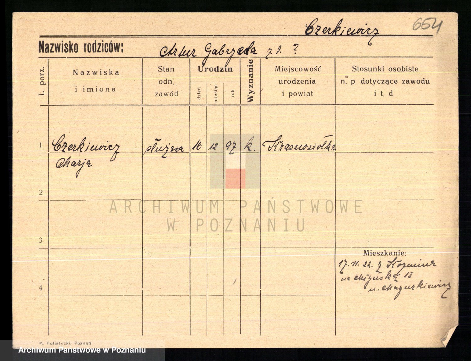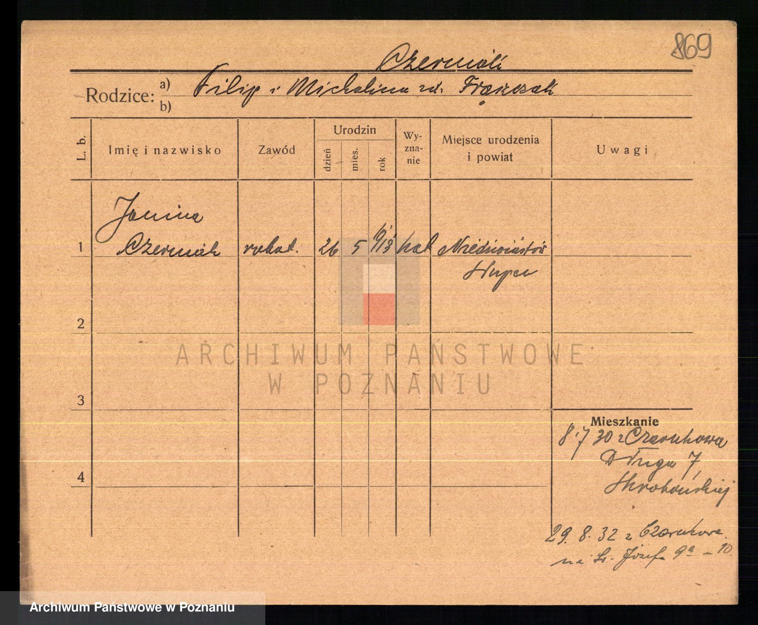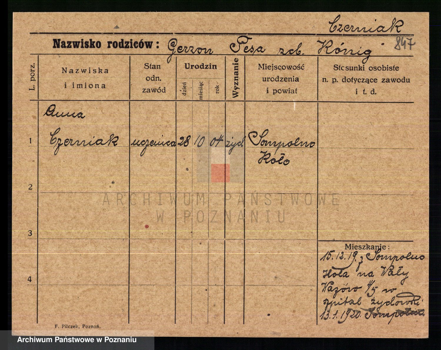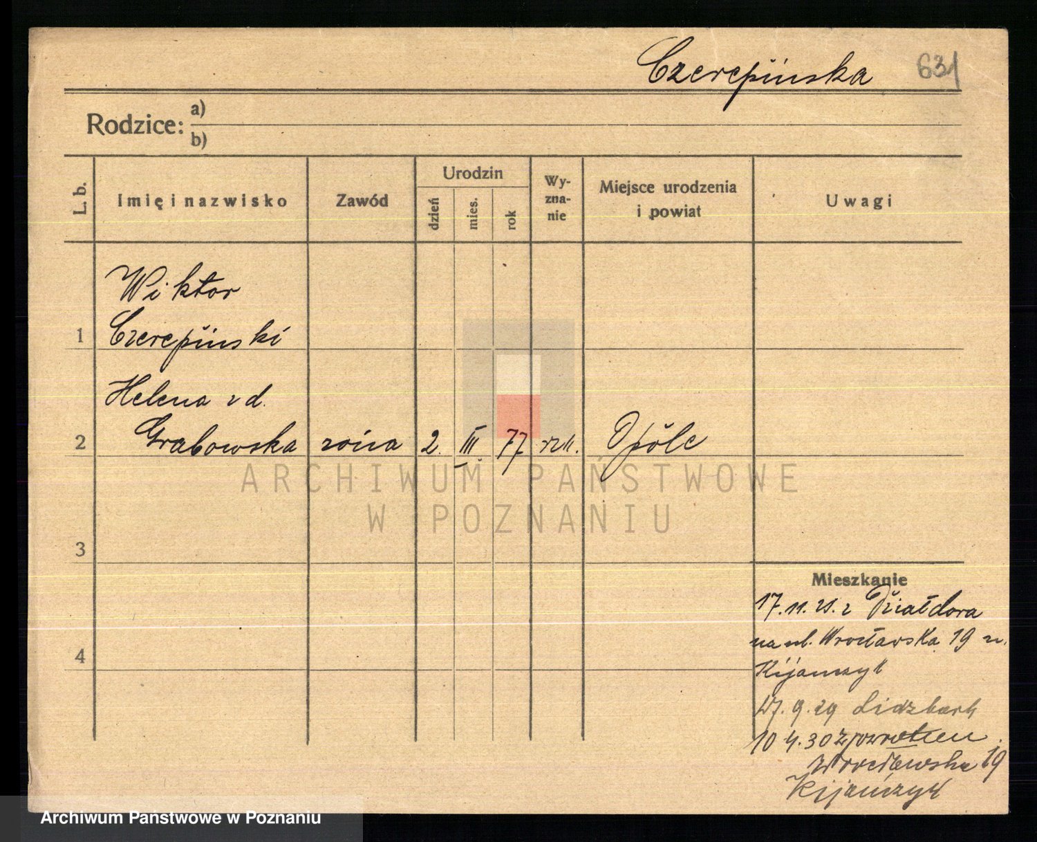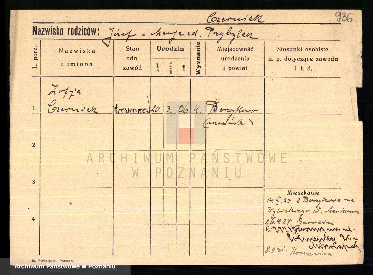 Podgląd karty osobowej dostępny jest po kliknięciu na nazwisko lub ikonkę karty. Można dokonywać powiększenia (ikony na górze) lub przechodzić między kolejnymi skanami (strzałki po bokach).