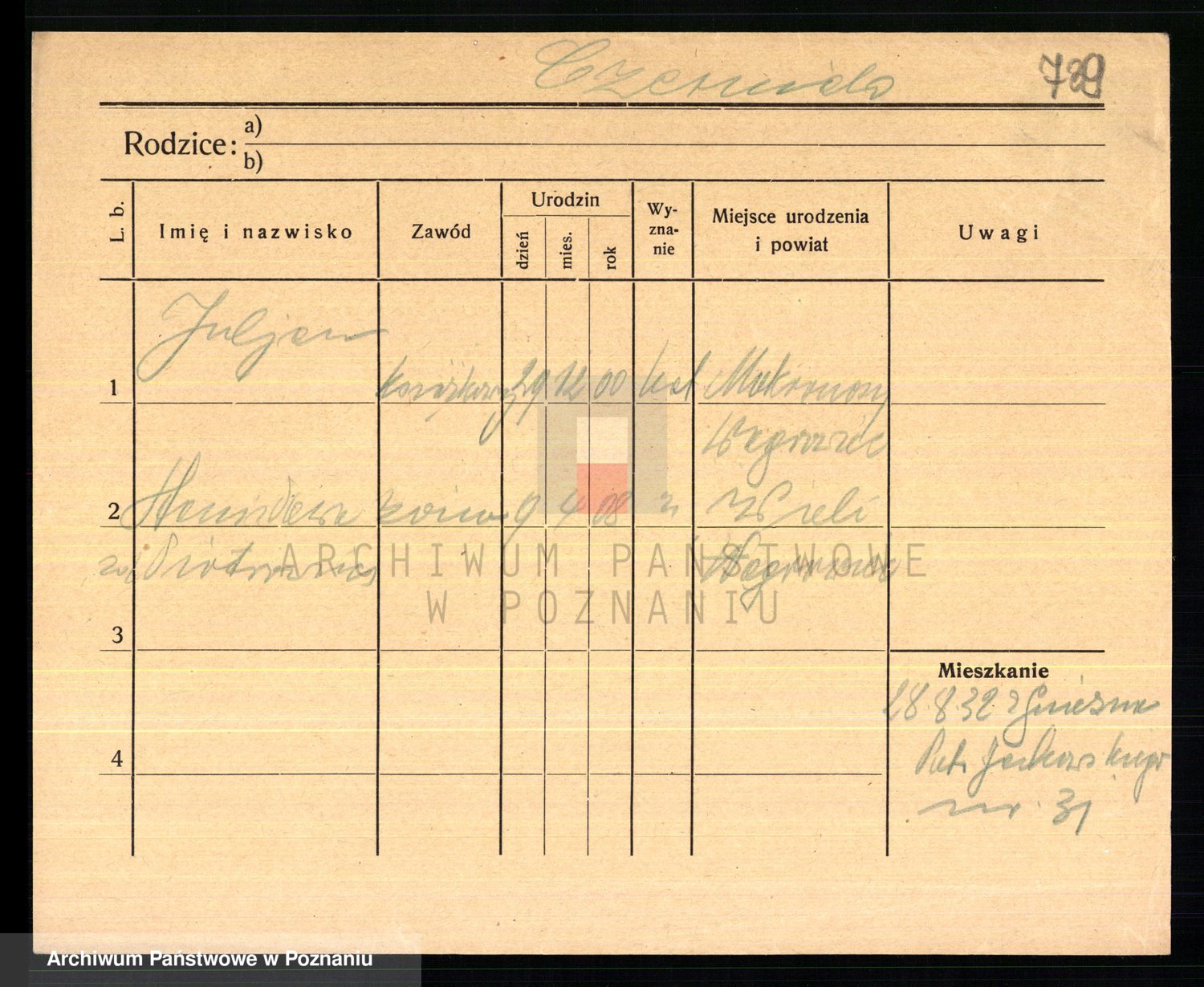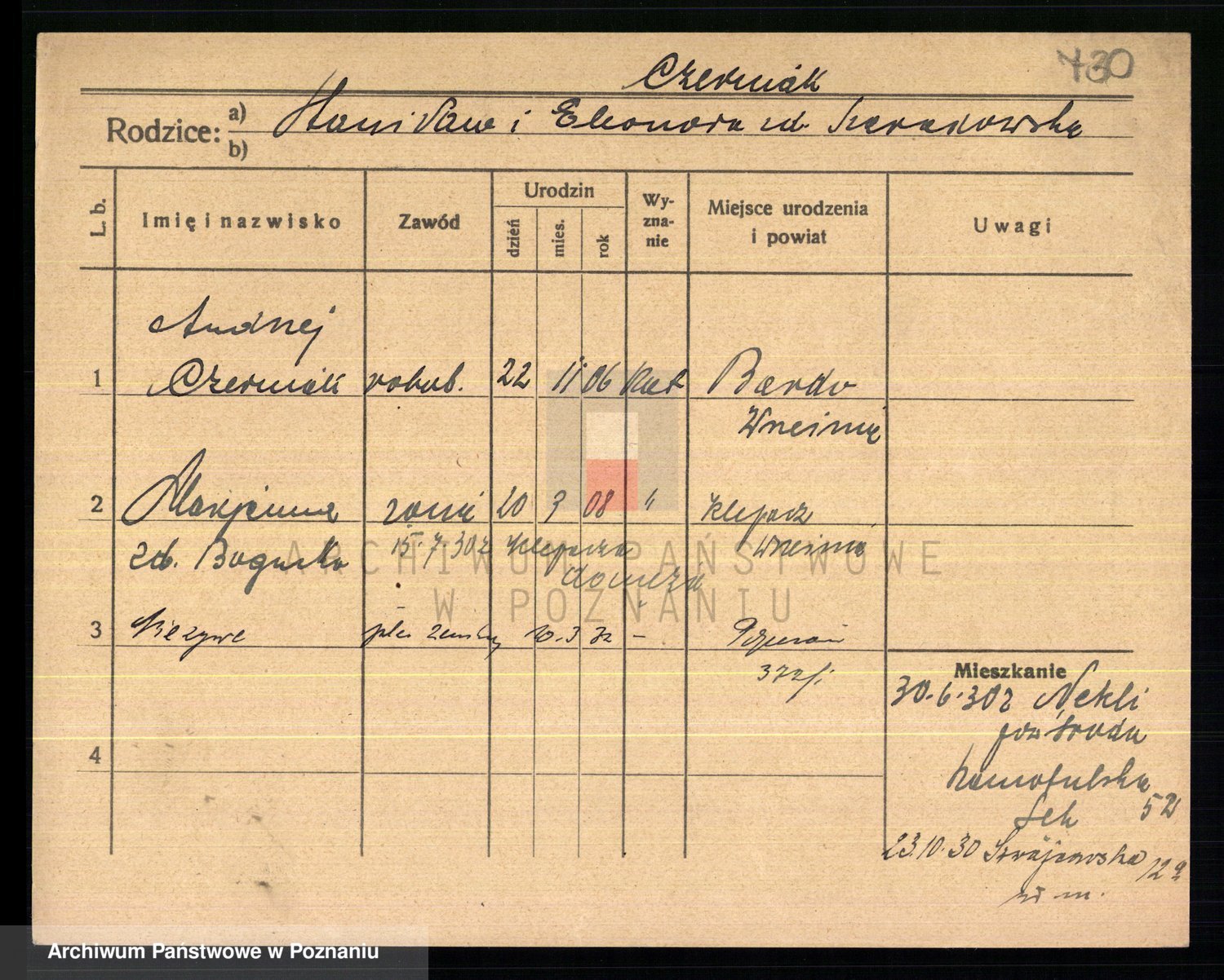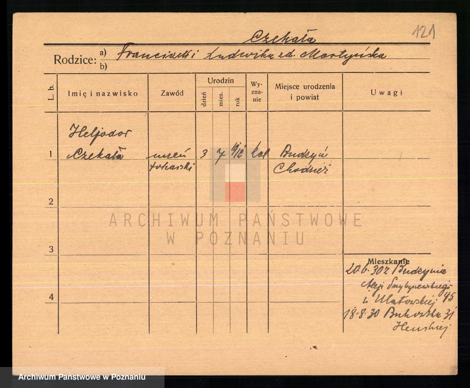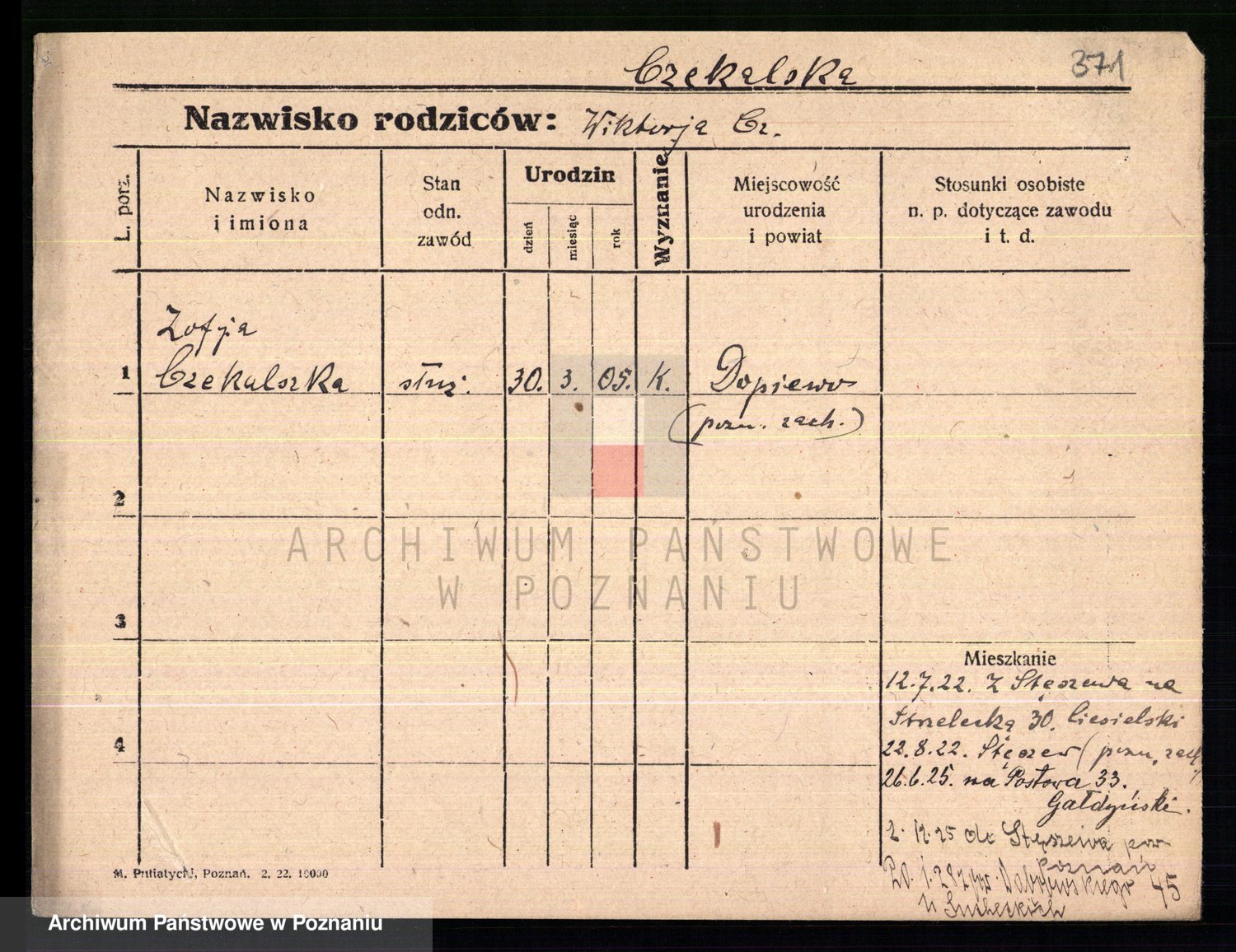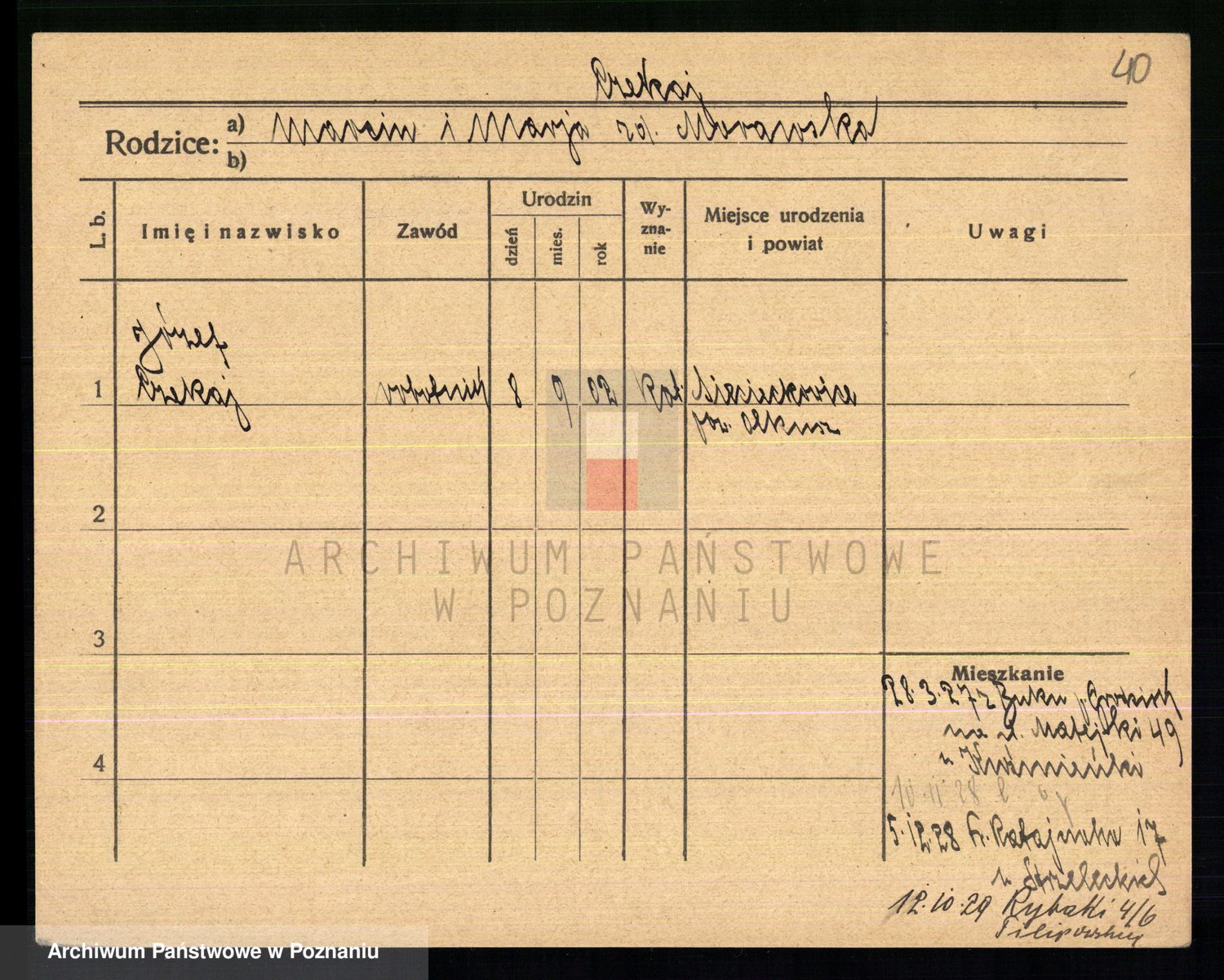 Podgląd karty osobowej dostępny jest po kliknięciu na nazwisko lub ikonkę karty. Można dokonywać powiększenia (ikony na górze) lub przechodzić między kolejnymi skanami (strzałki po bokach).