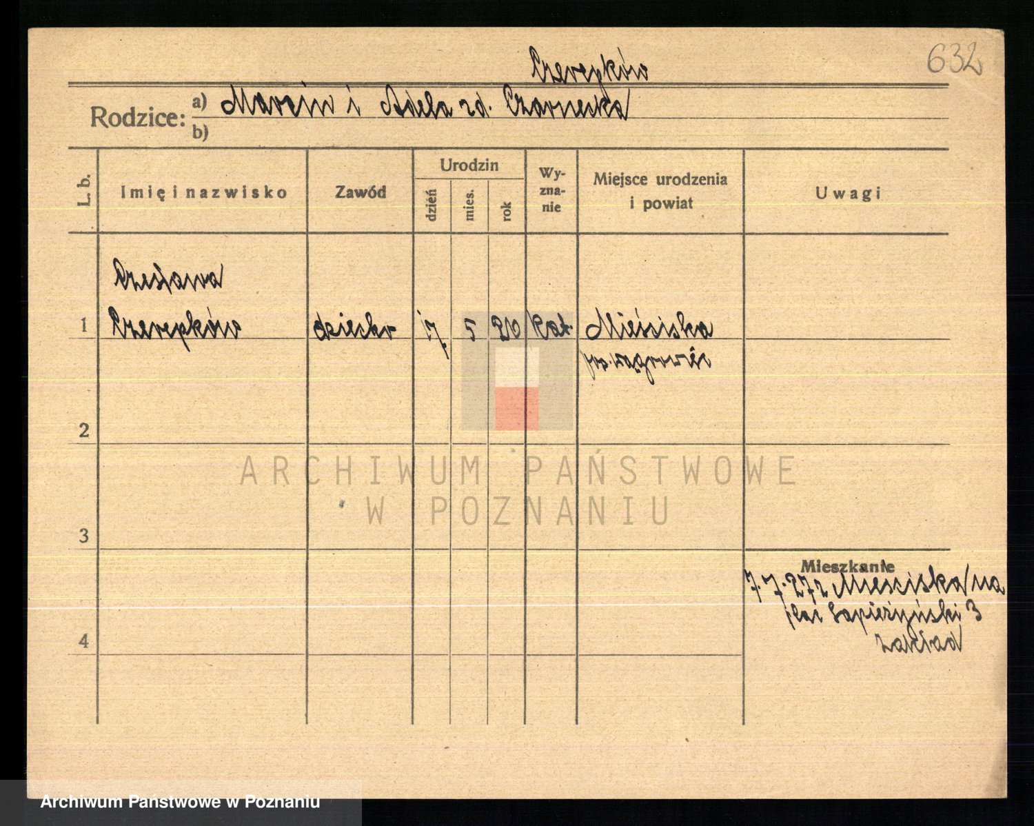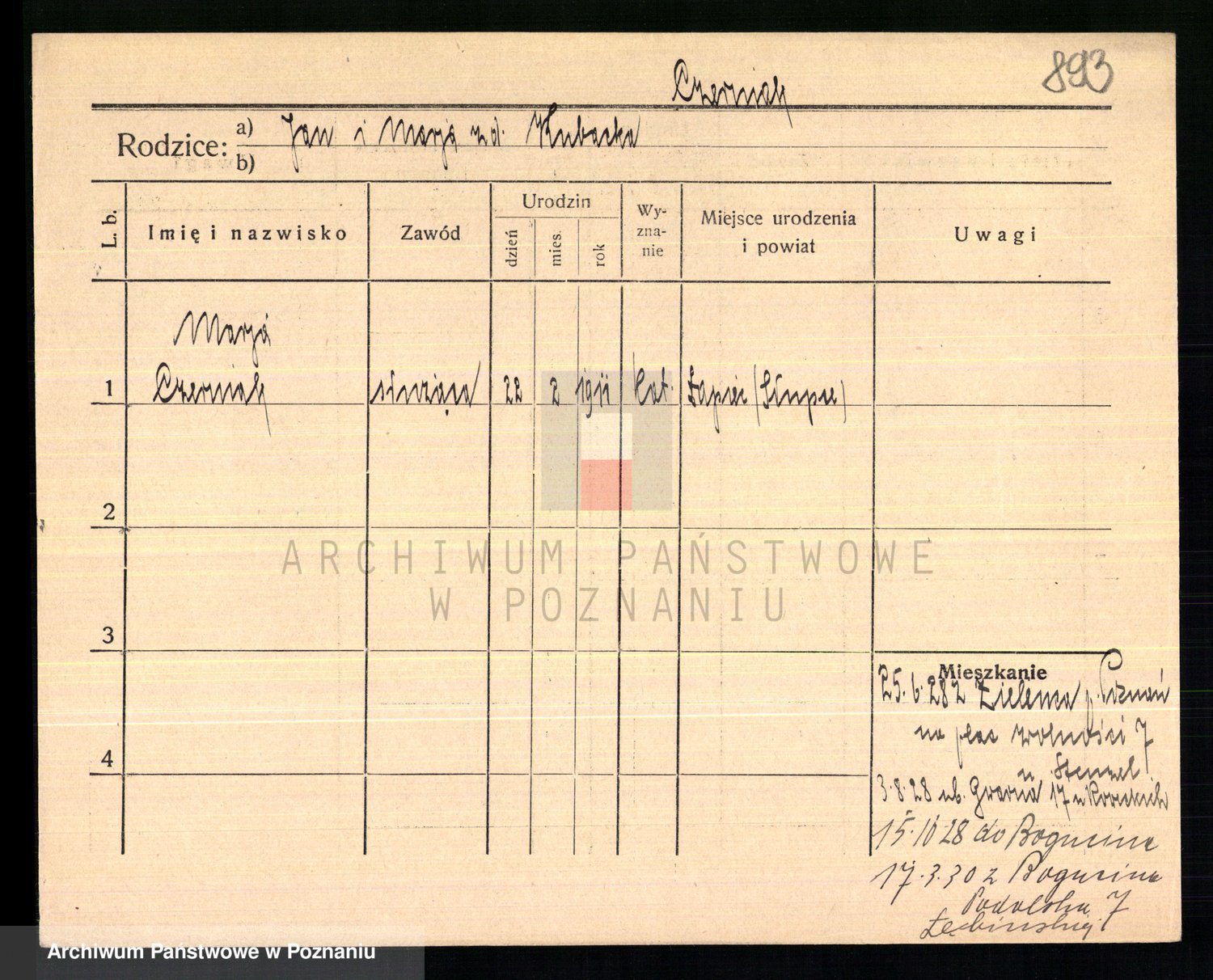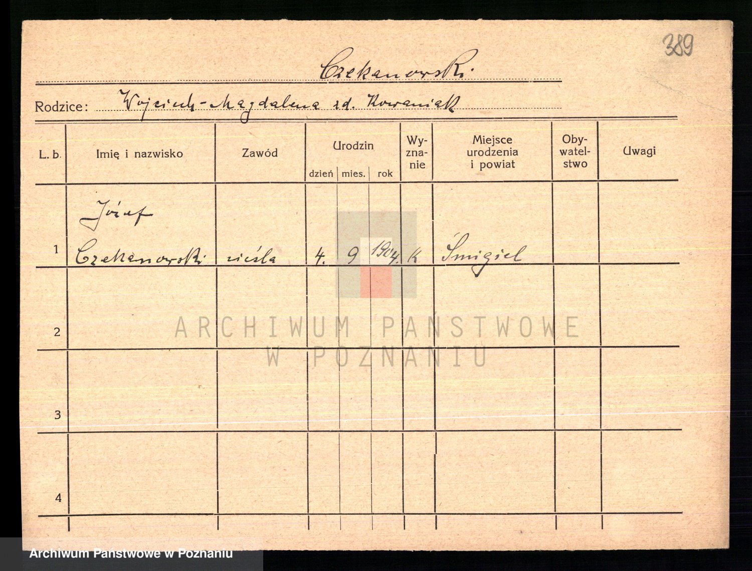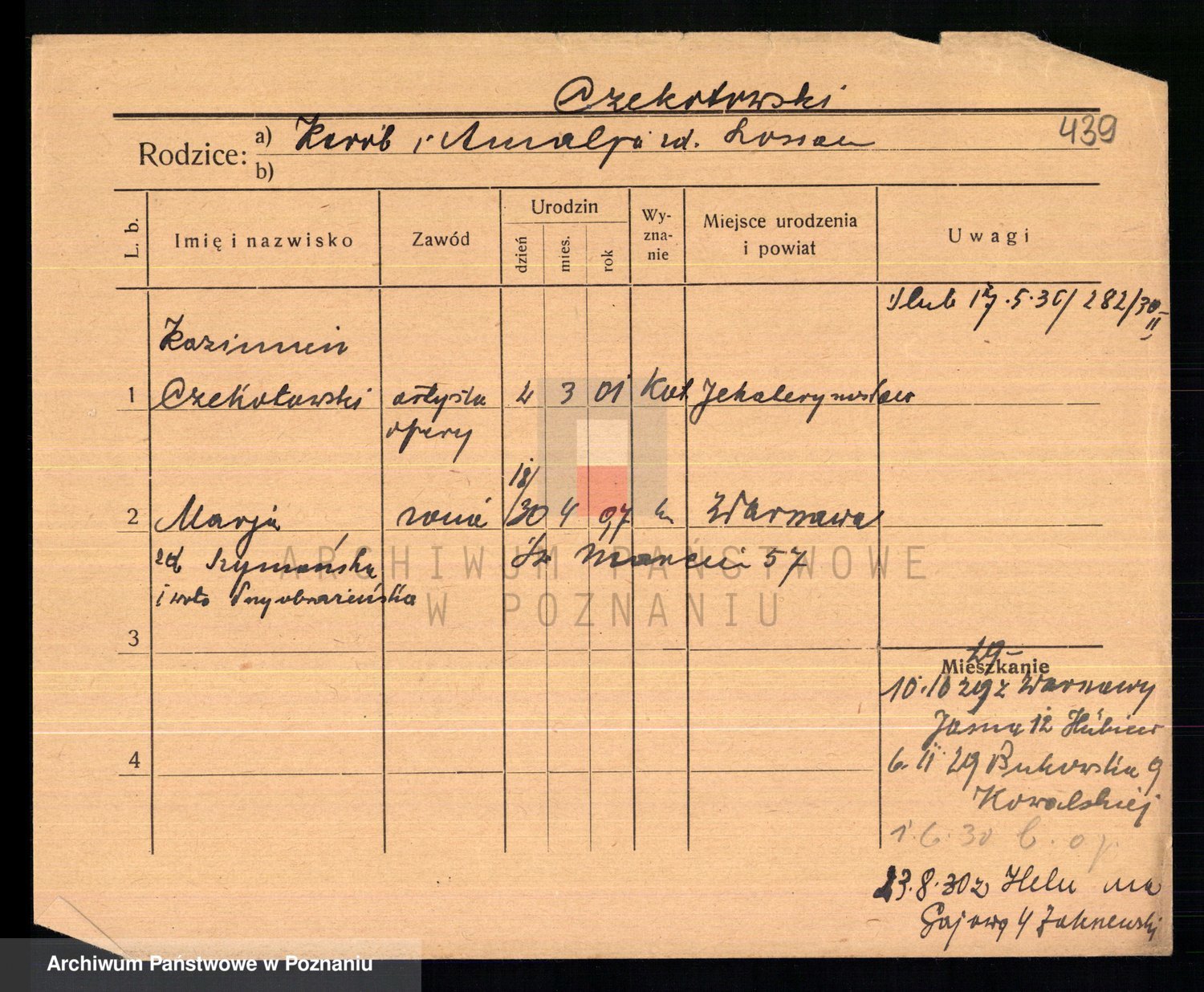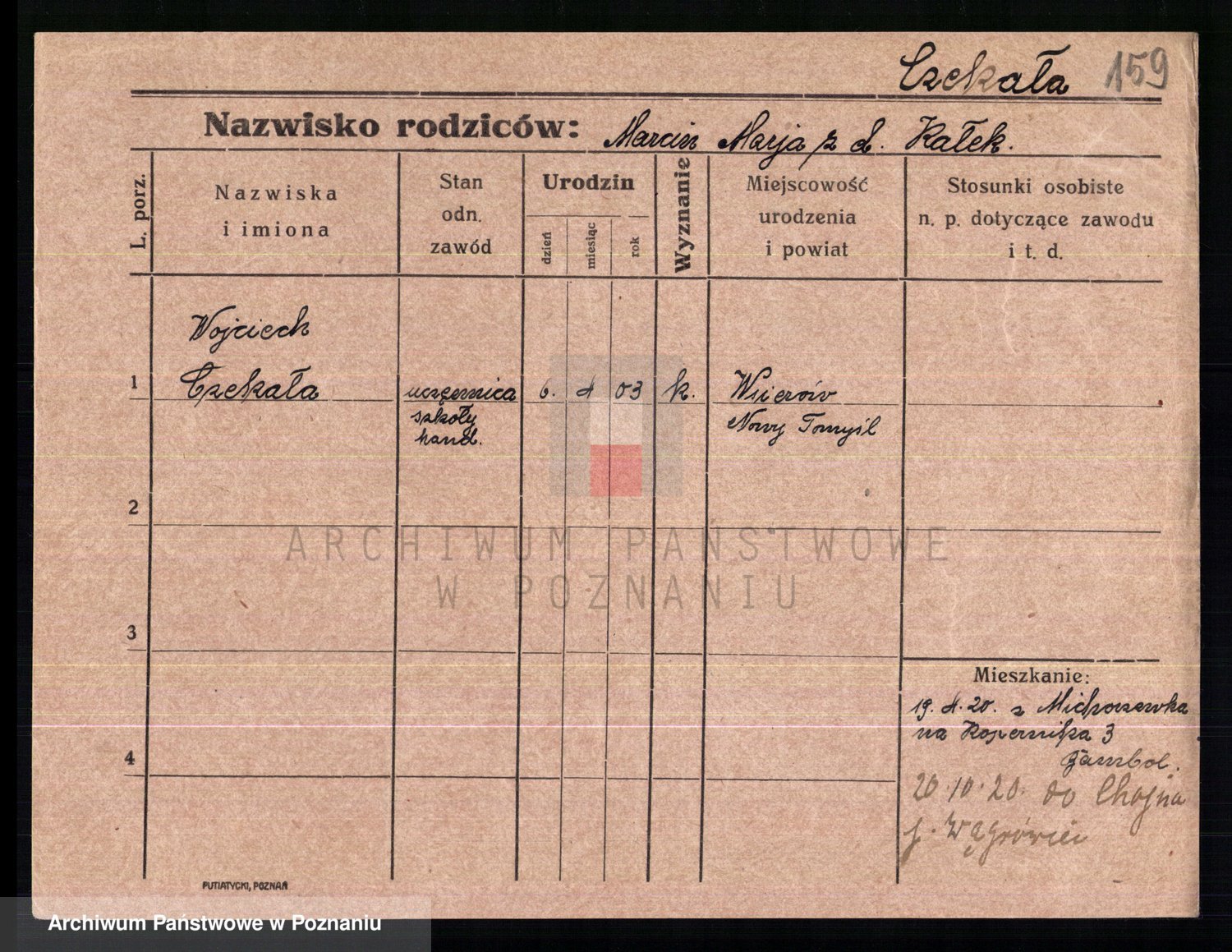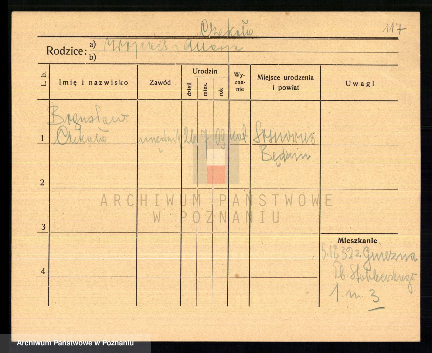 Podgląd karty osobowej dostępny jest po kliknięciu na nazwisko lub ikonkę karty. Można dokonywać powiększenia (ikony na górze) lub przechodzić między kolejnymi skanami (strzałki po bokach).