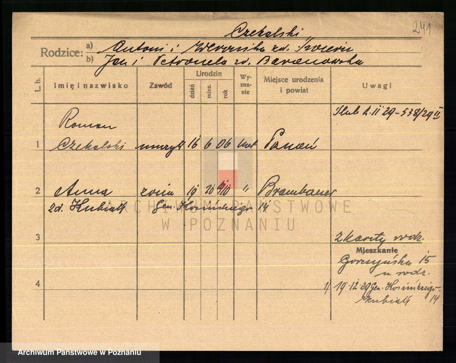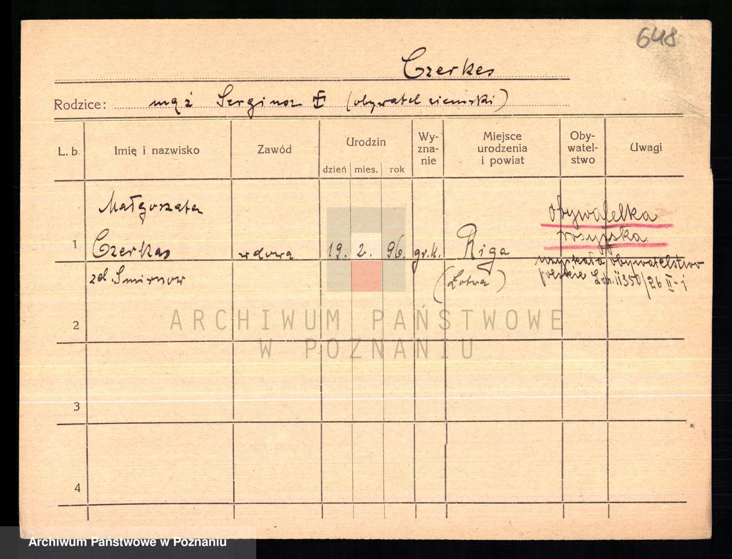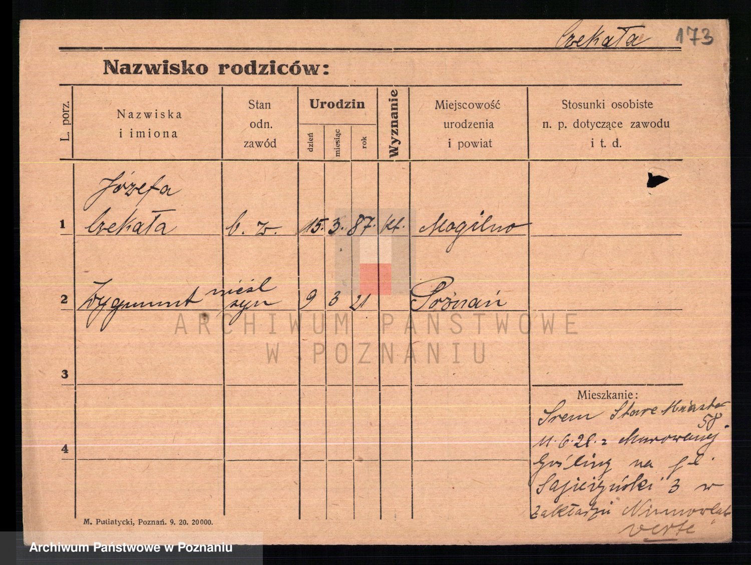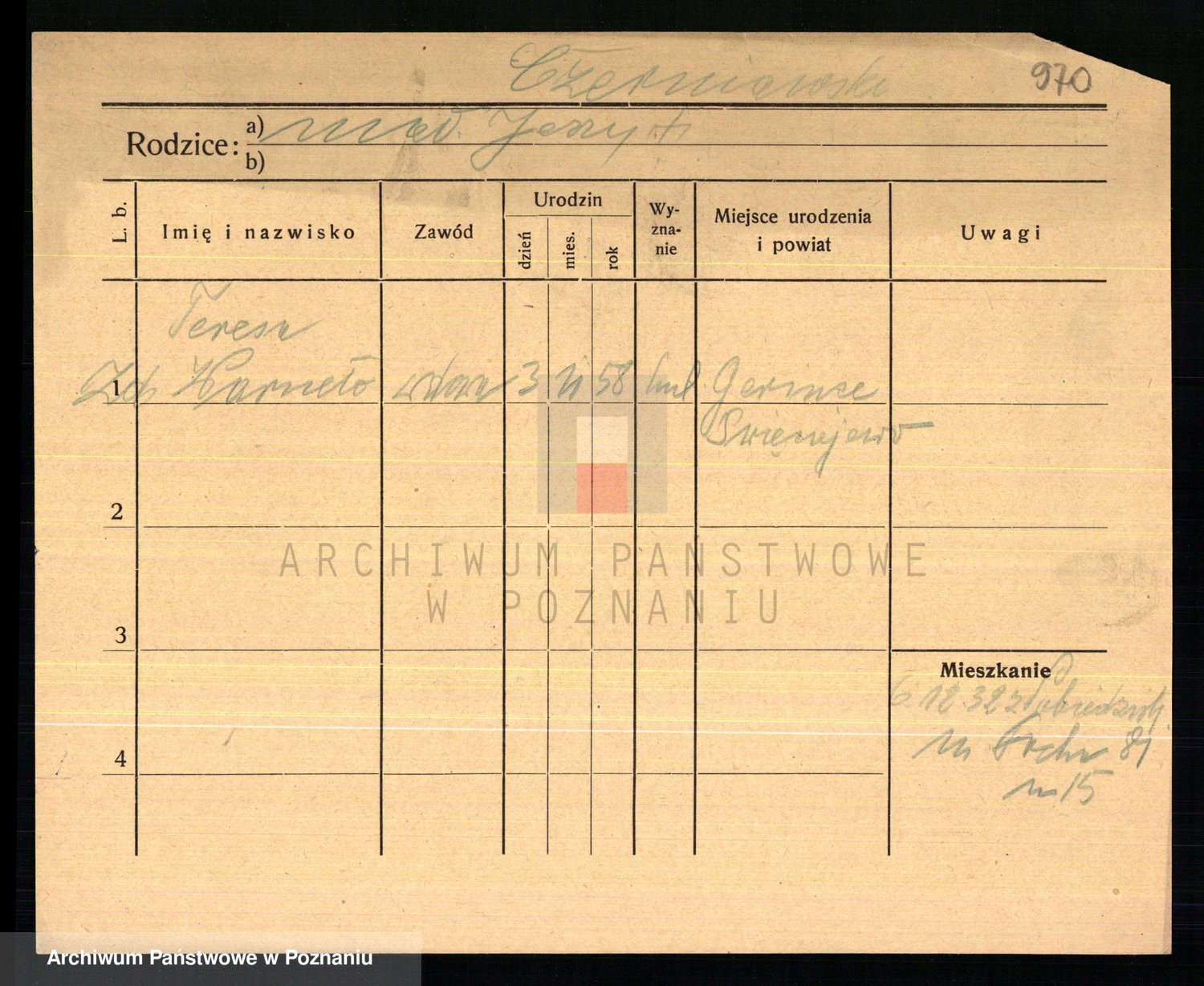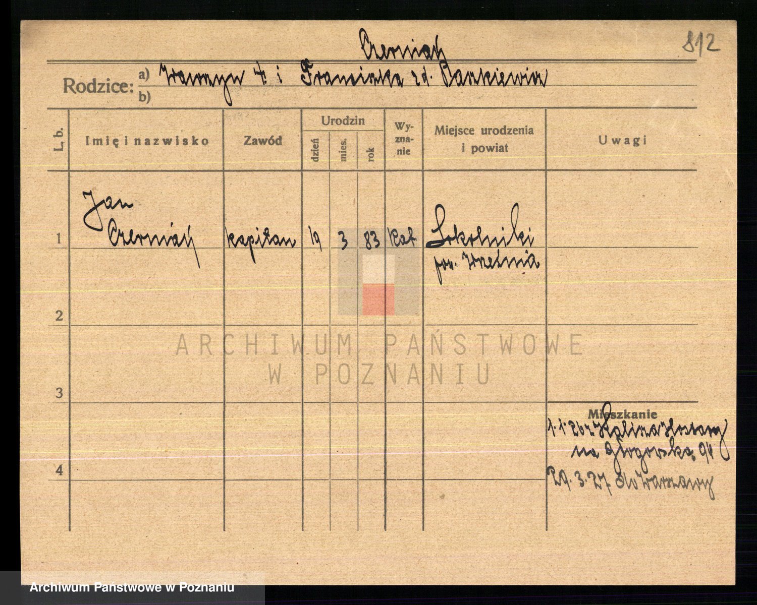 Podgląd karty osobowej dostępny jest po kliknięciu na nazwisko lub ikonkę karty. Można dokonywać powiększenia (ikony na górze) lub przechodzić między kolejnymi skanami (strzałki po bokach).