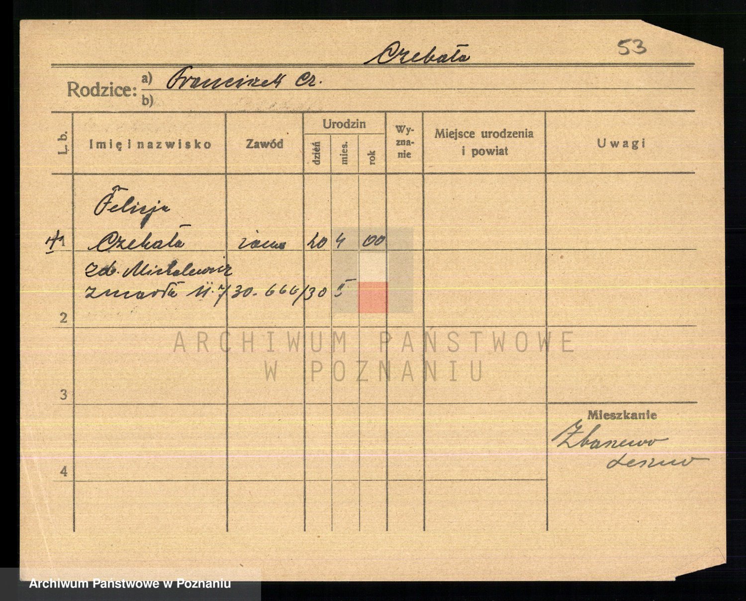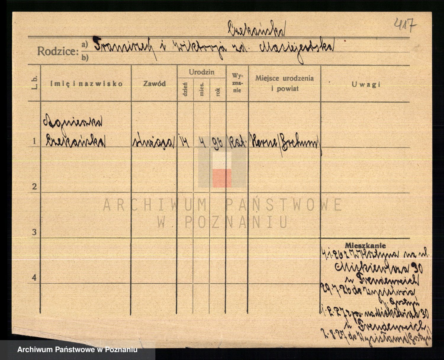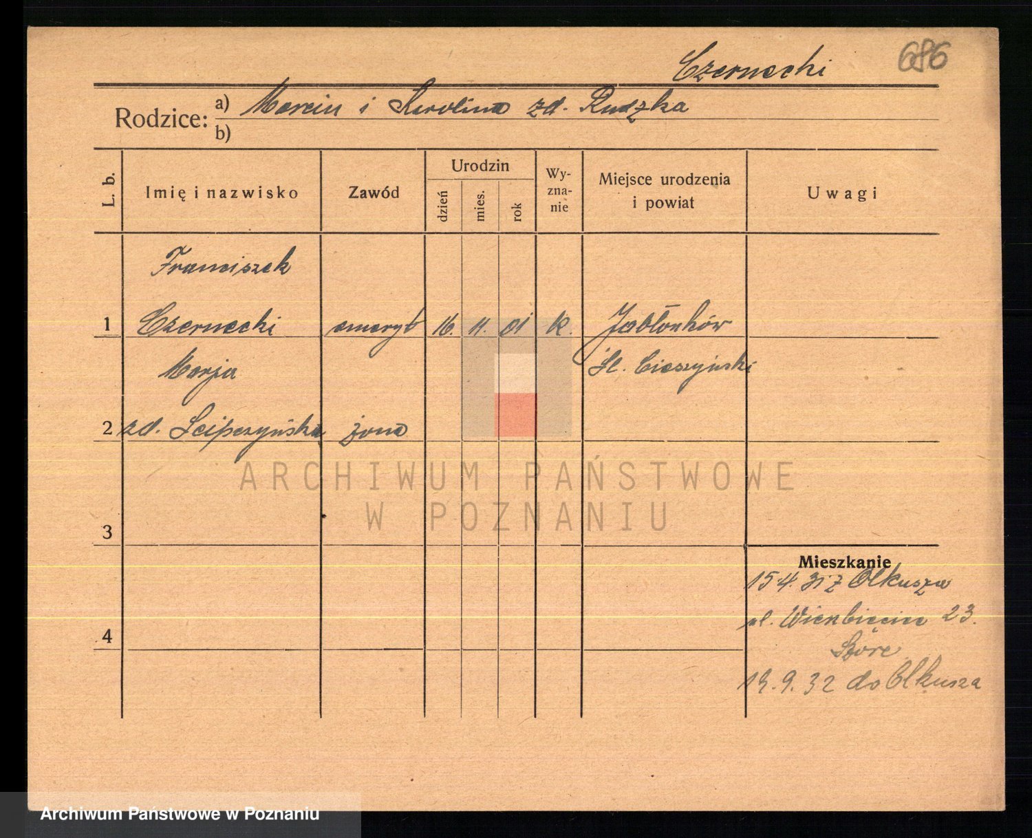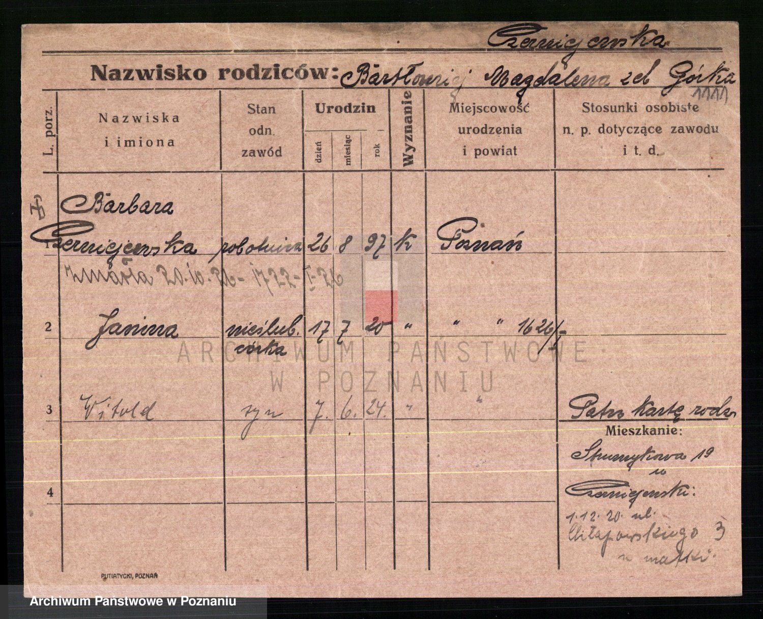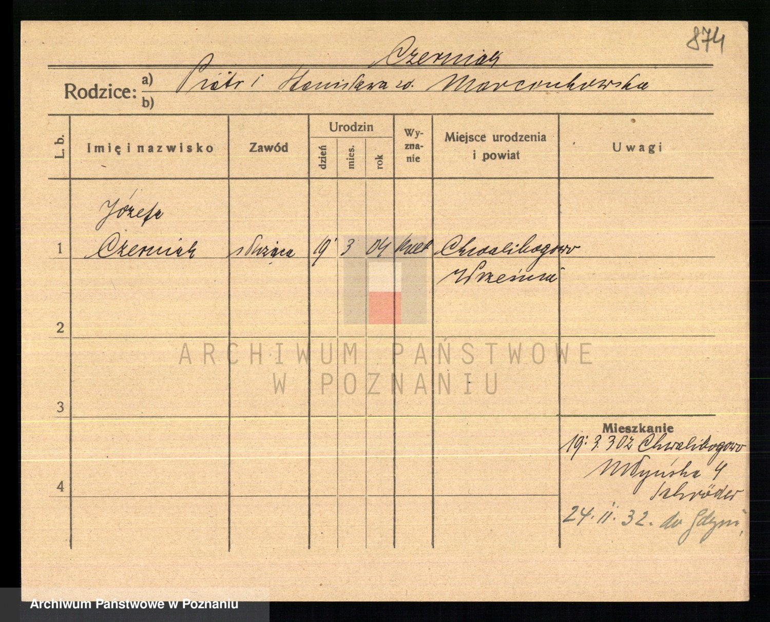 Podgląd karty osobowej dostępny jest po kliknięciu na nazwisko lub ikonkę karty. Można dokonywać powiększenia (ikony na górze) lub przechodzić między kolejnymi skanami (strzałki po bokach).