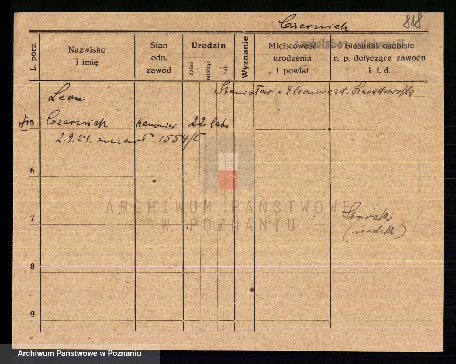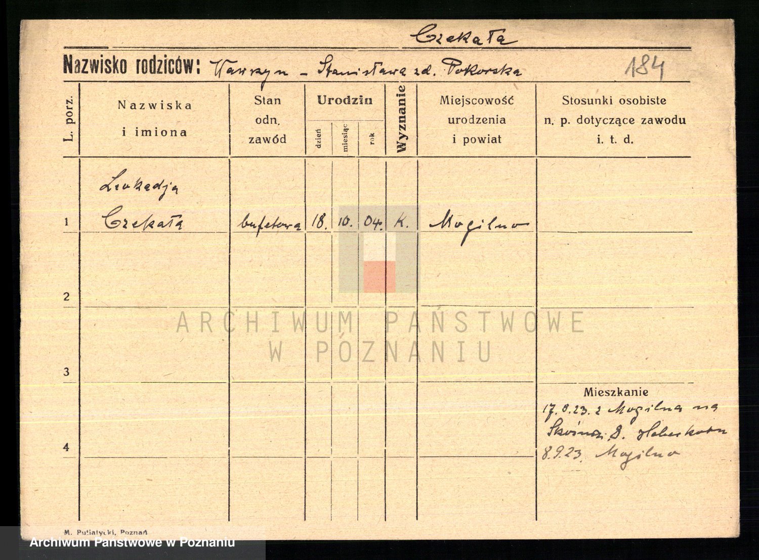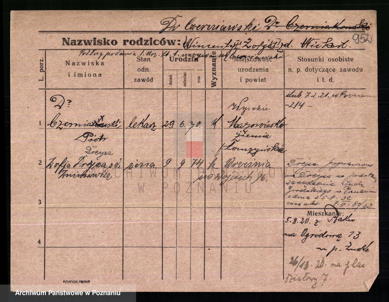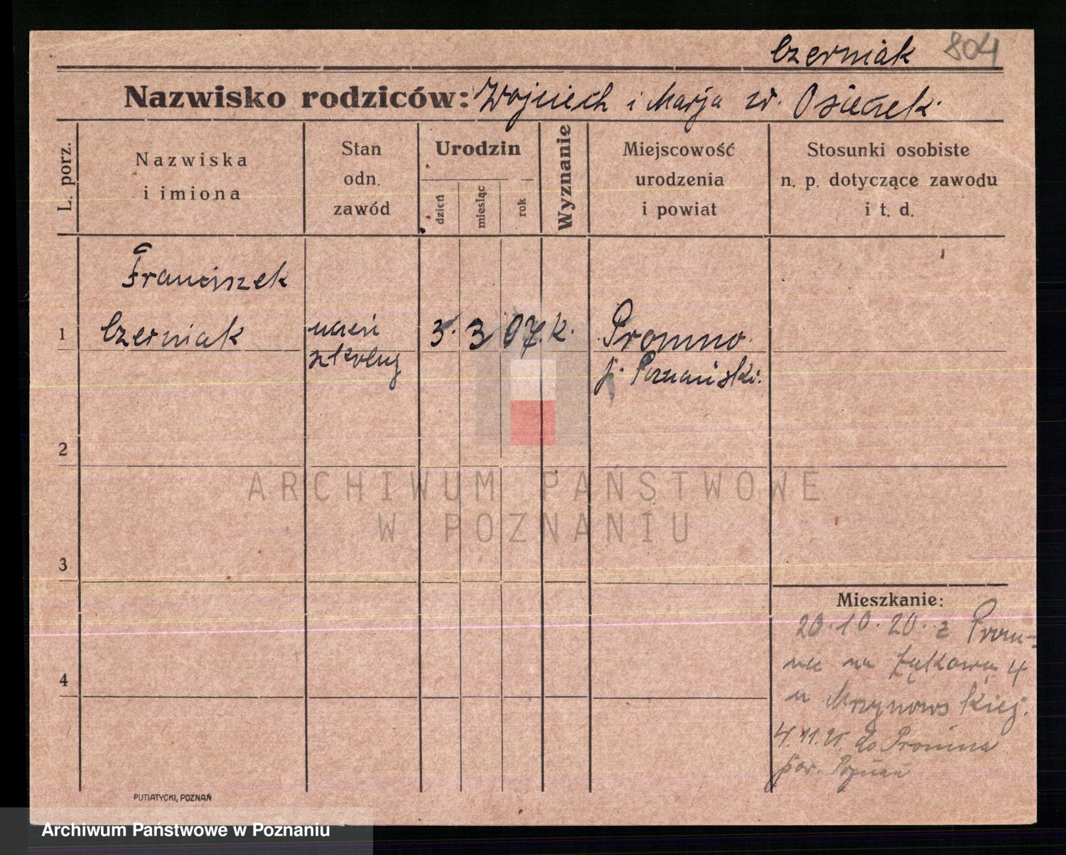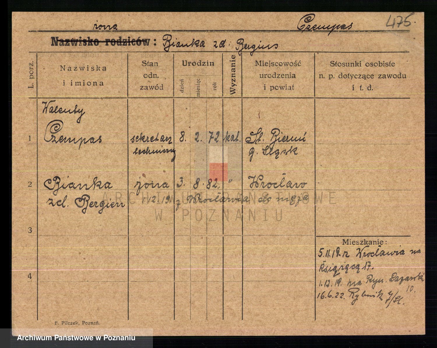 Podgląd karty osobowej dostępny jest po kliknięciu na nazwisko lub ikonkę karty. Można dokonywać powiększenia (ikony na górze) lub przechodzić między kolejnymi skanami (strzałki po bokach).