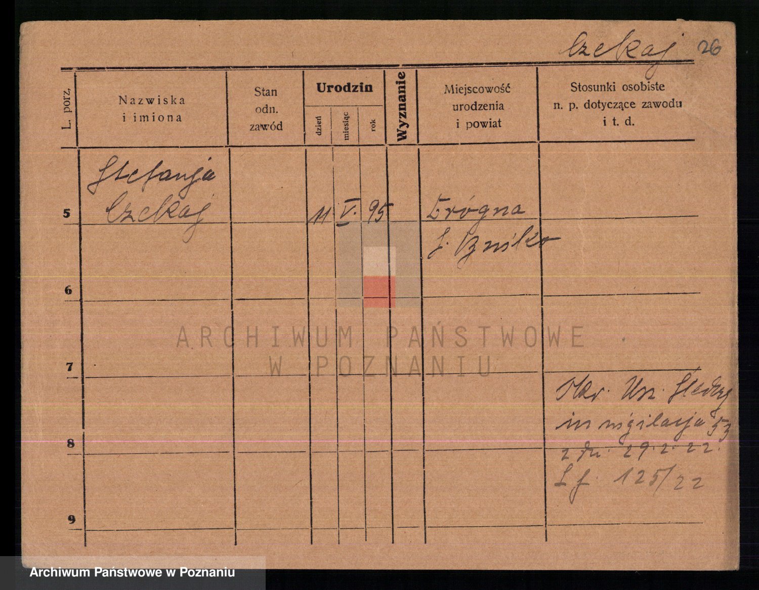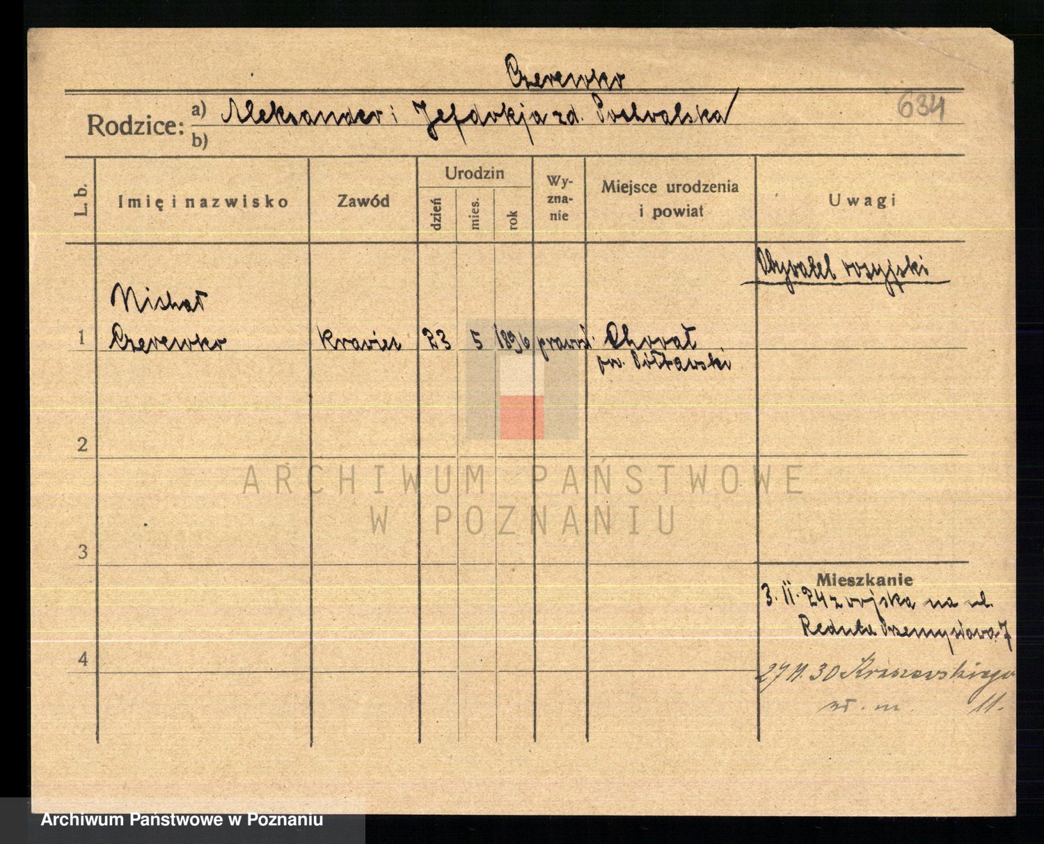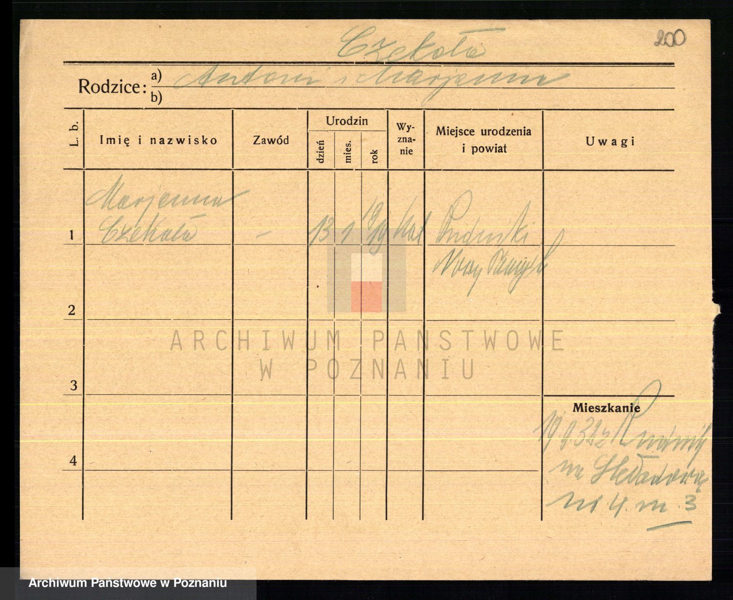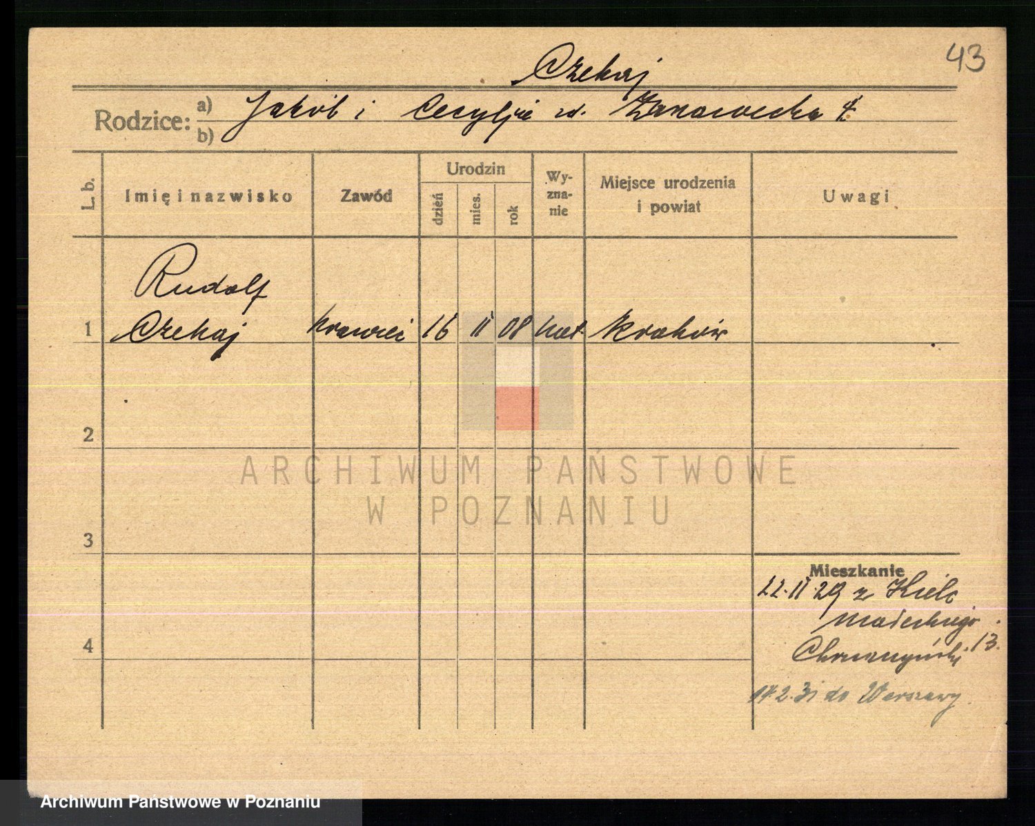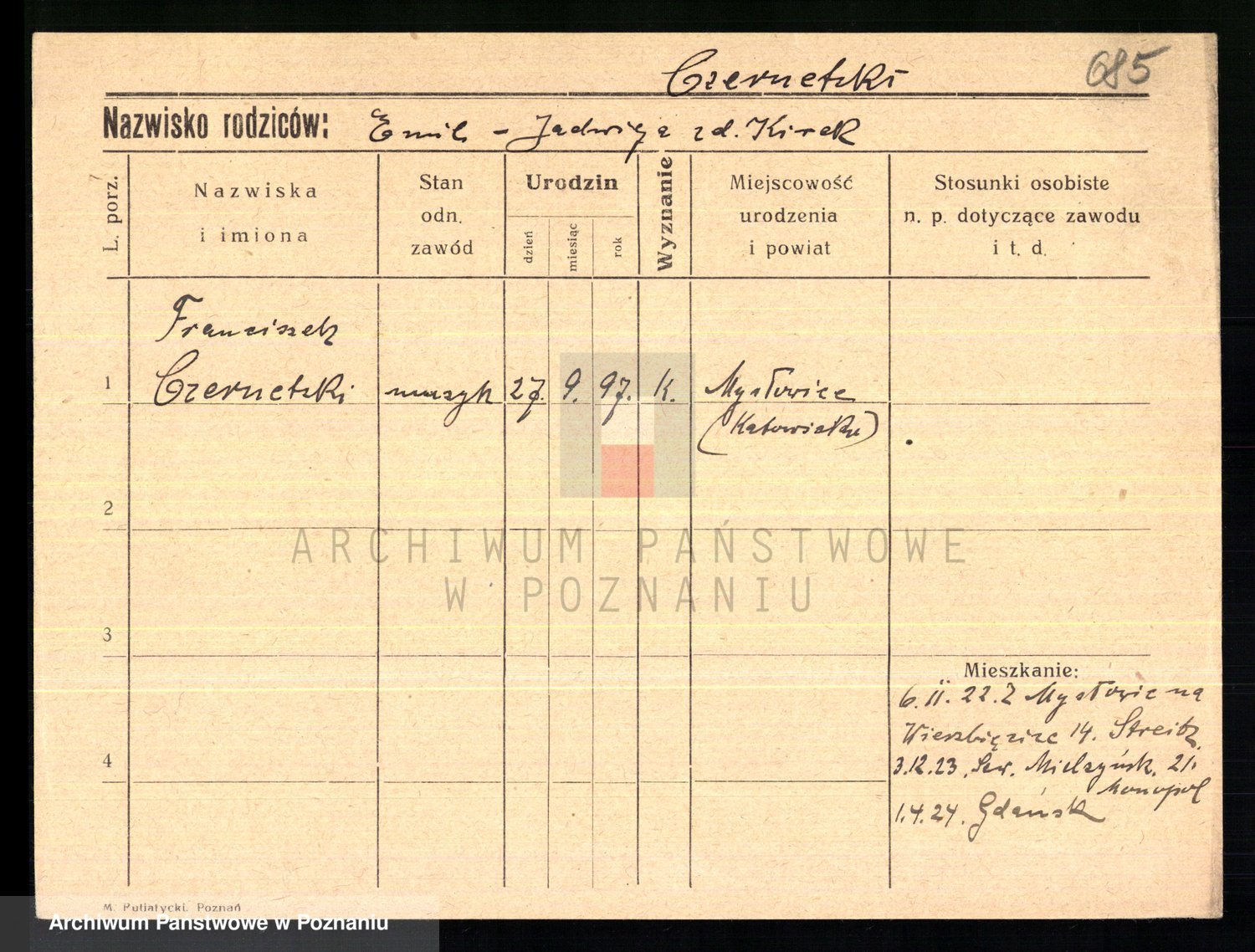 Podgląd karty osobowej dostępny jest po kliknięciu na nazwisko lub ikonkę karty. Można dokonywać powiększenia (ikony na górze) lub przechodzić między kolejnymi skanami (strzałki po bokach).