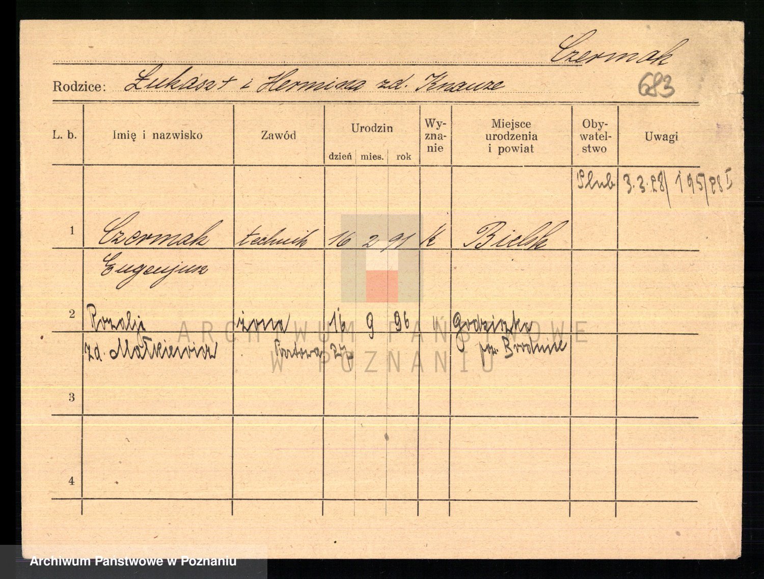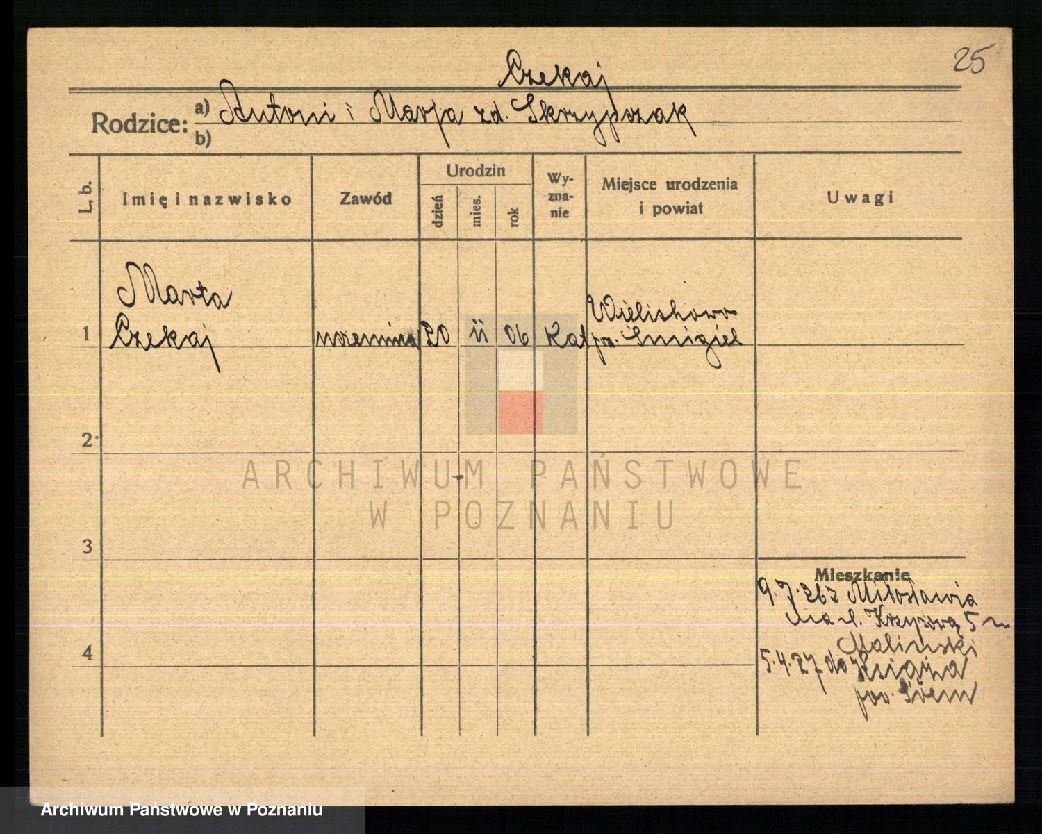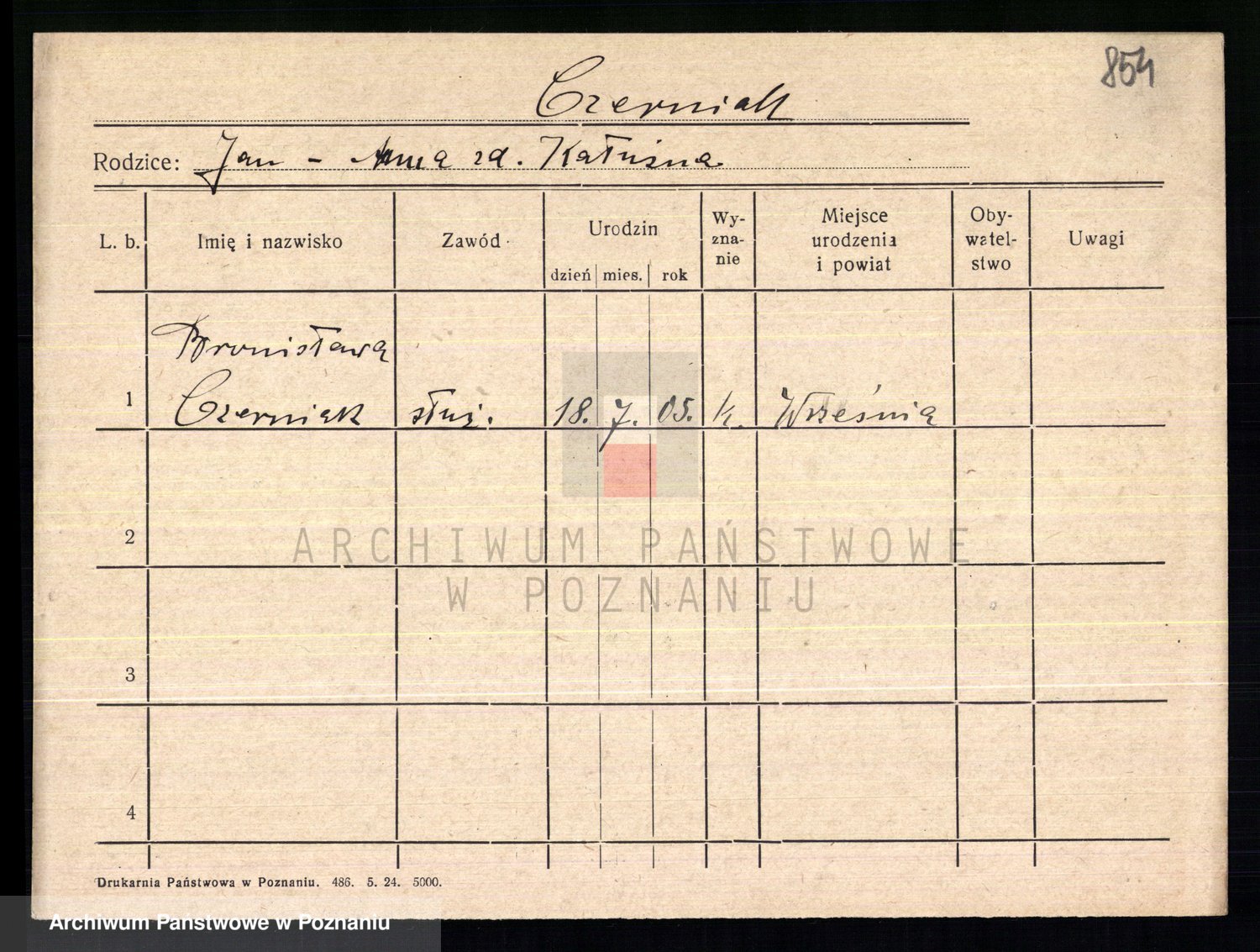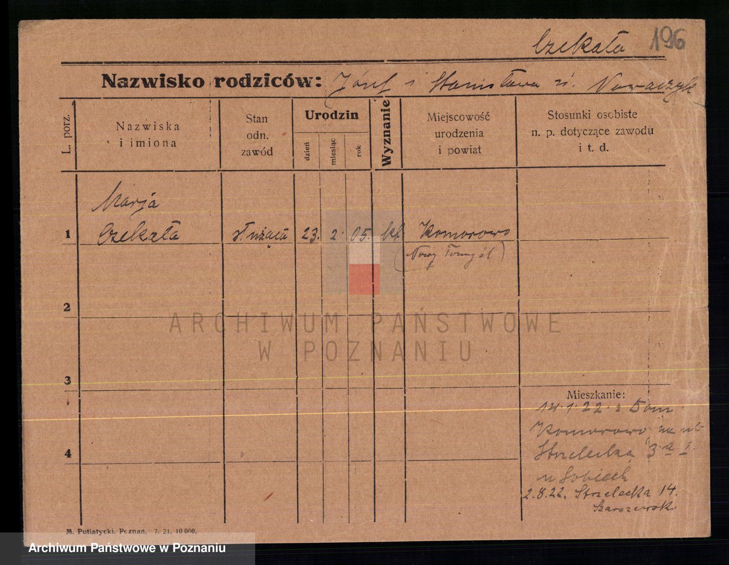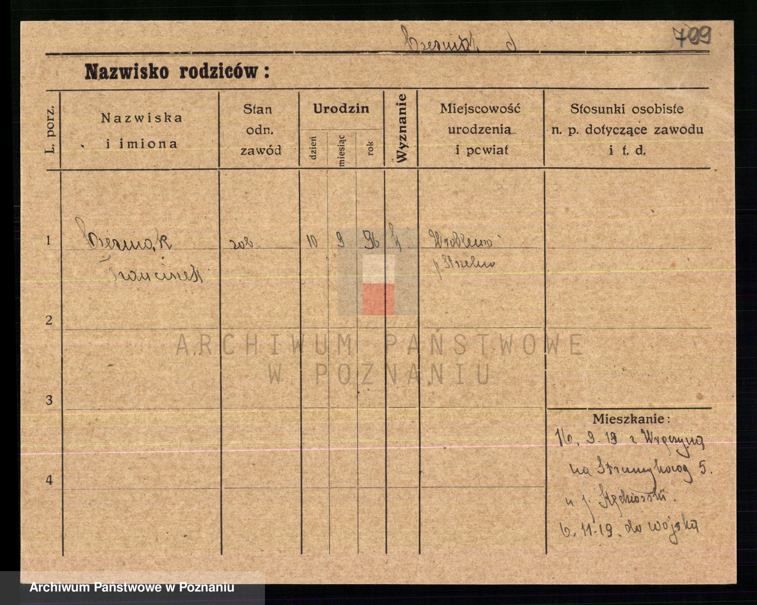 Podgląd karty osobowej dostępny jest po kliknięciu na nazwisko lub ikonkę karty. Można dokonywać powiększenia (ikony na górze) lub przechodzić między kolejnymi skanami (strzałki po bokach).