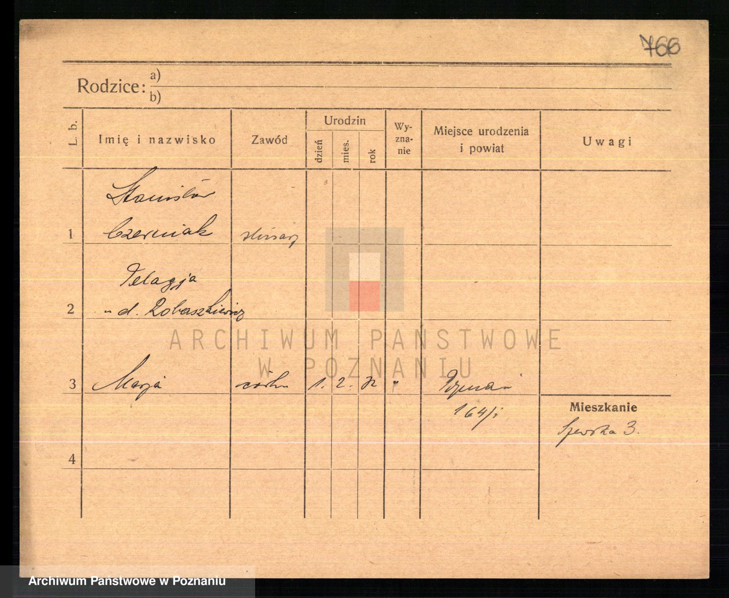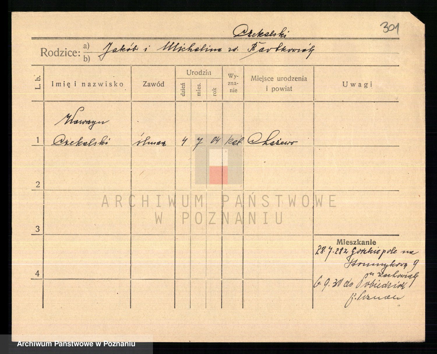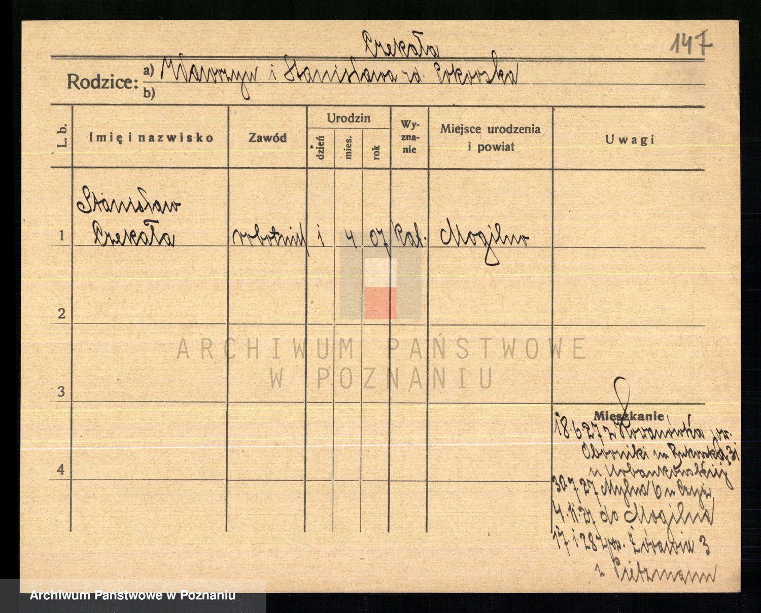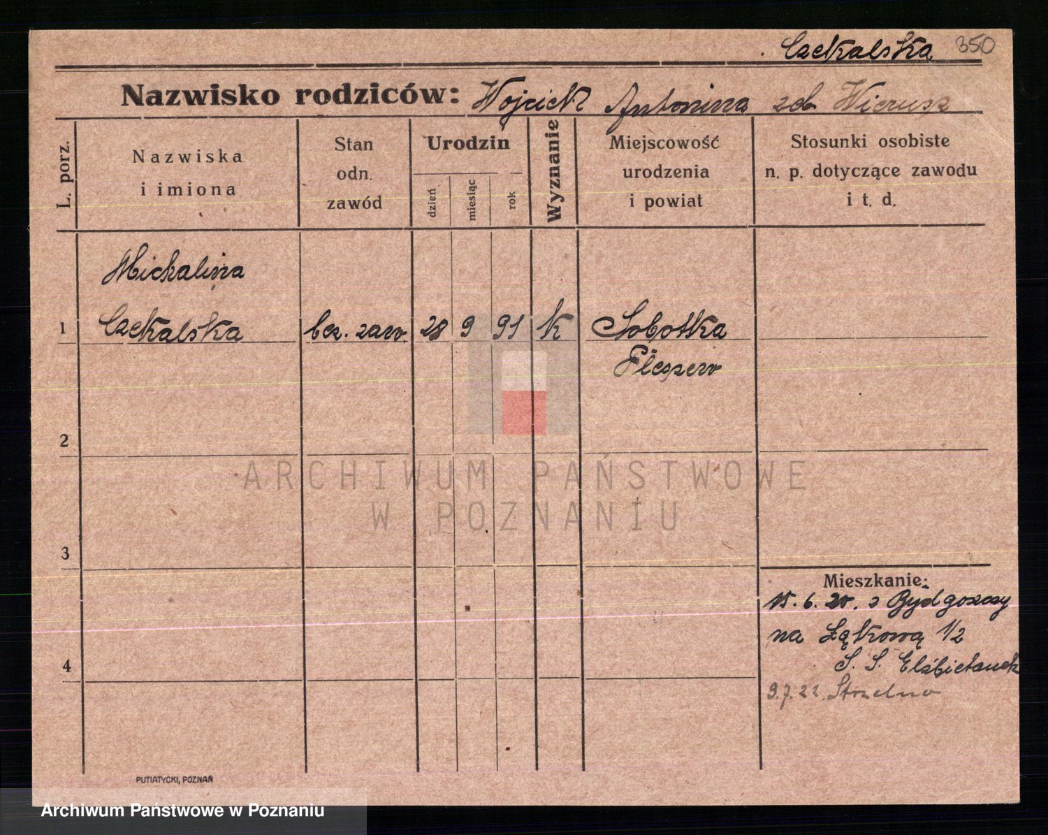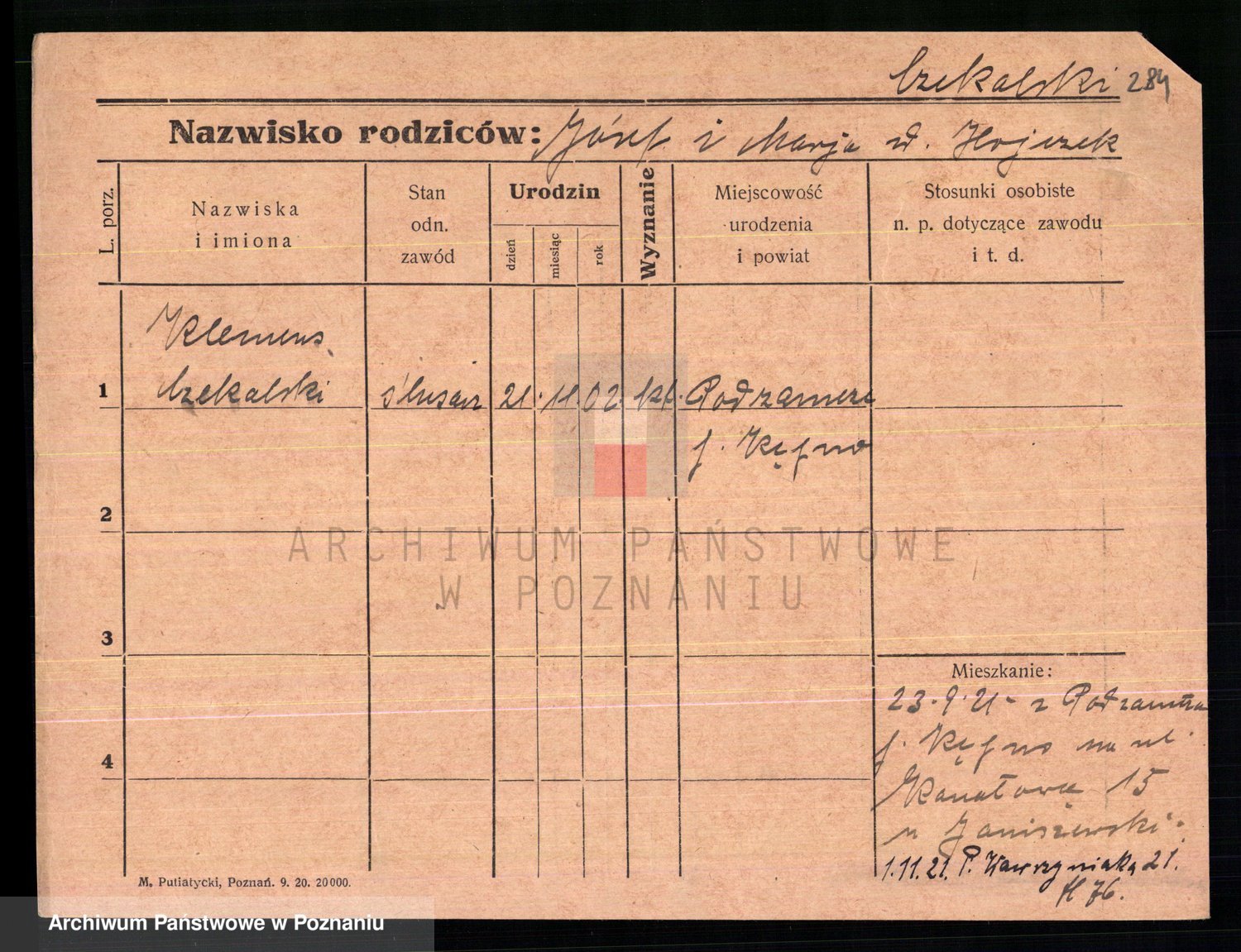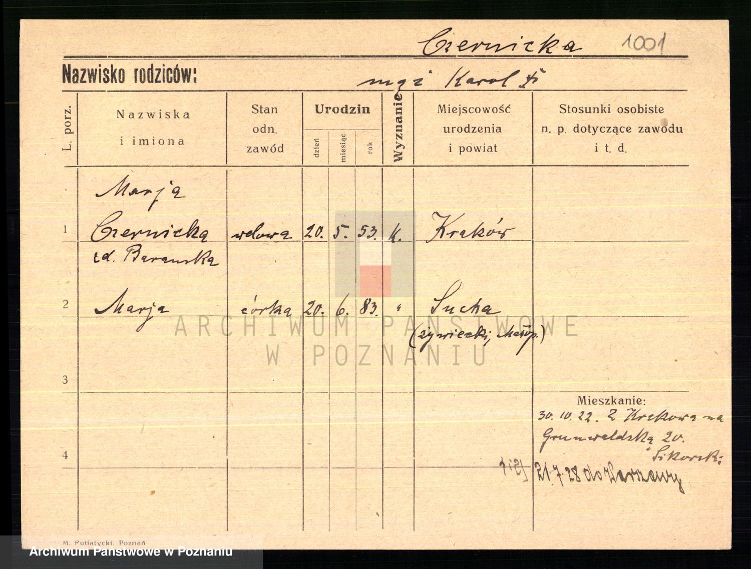 Podgląd karty osobowej dostępny jest po kliknięciu na nazwisko lub ikonkę karty. Można dokonywać powiększenia (ikony na górze) lub przechodzić między kolejnymi skanami (strzałki po bokach).