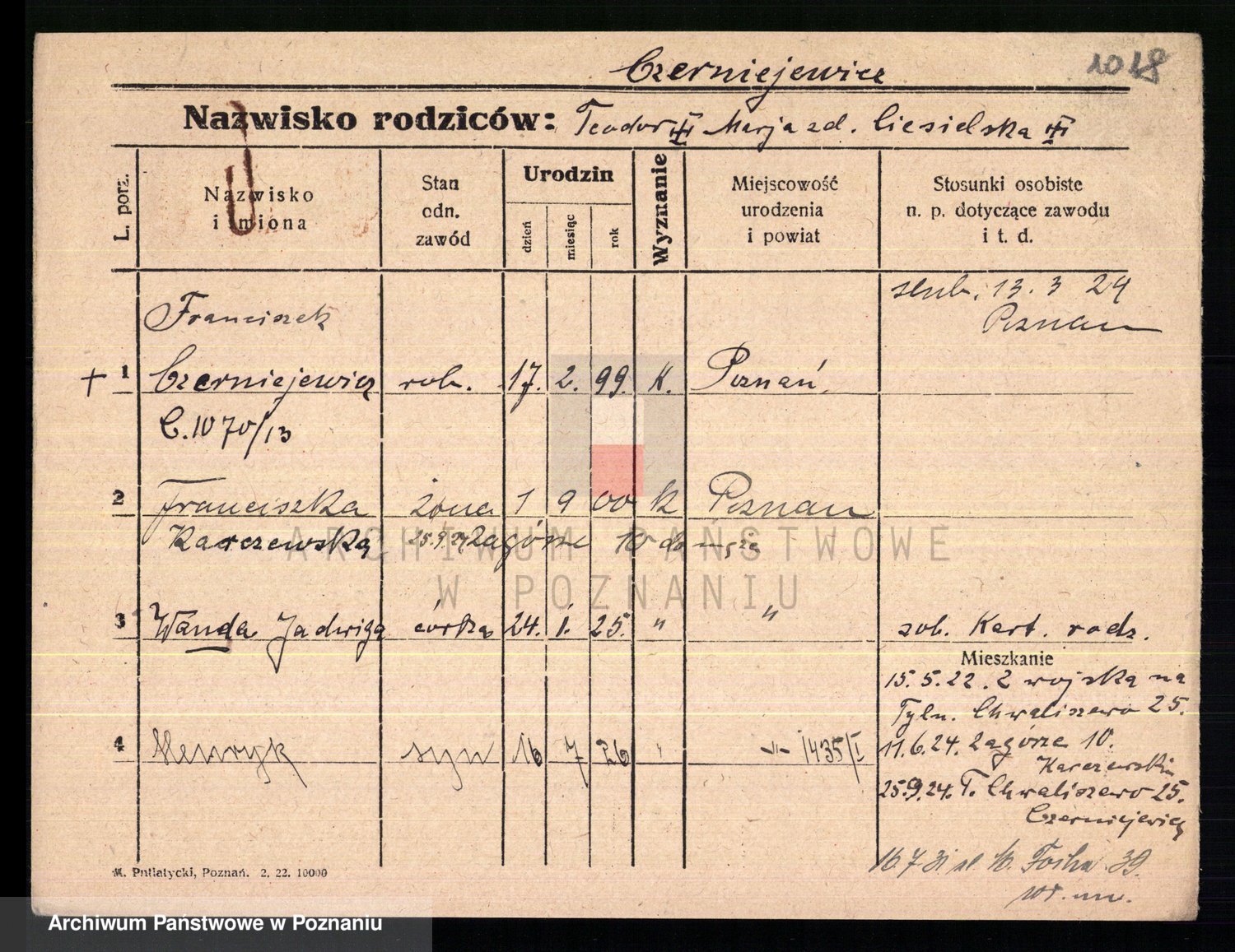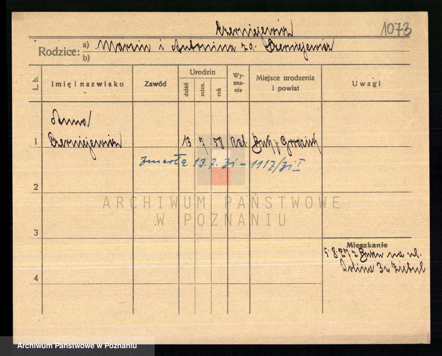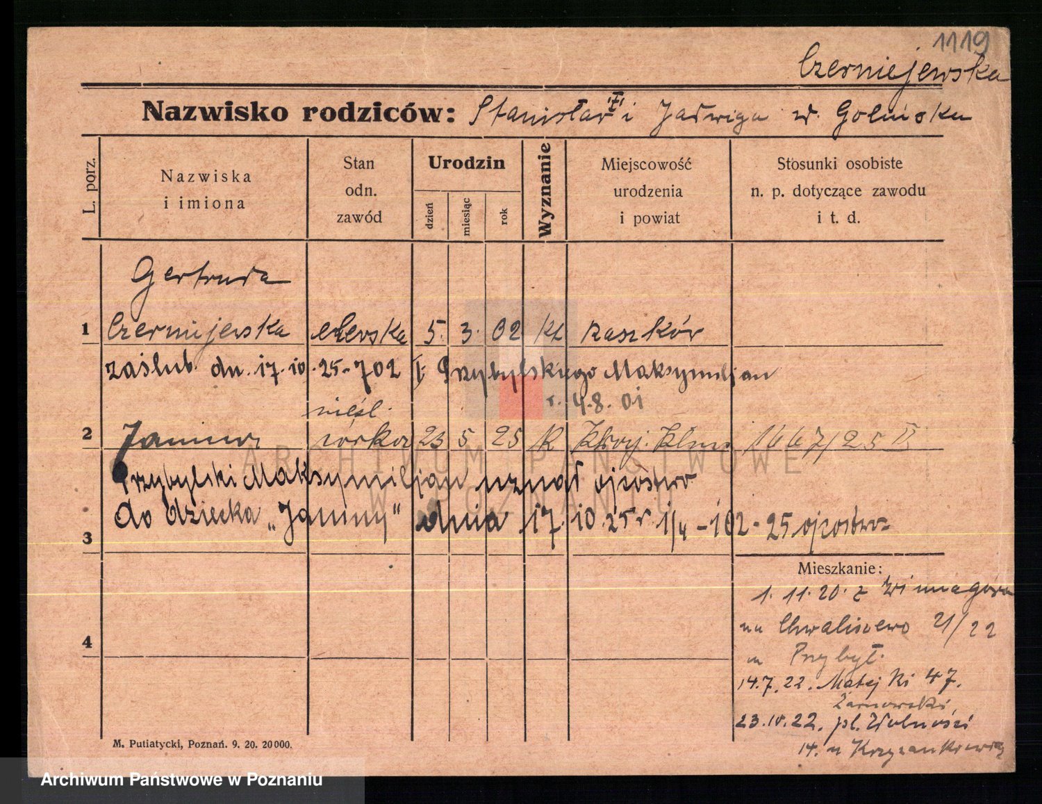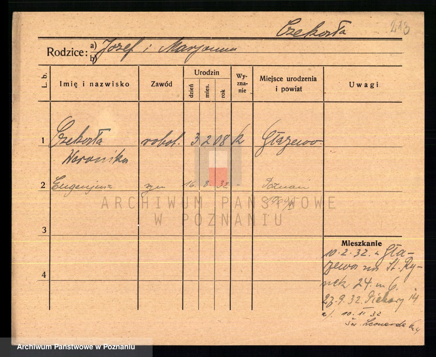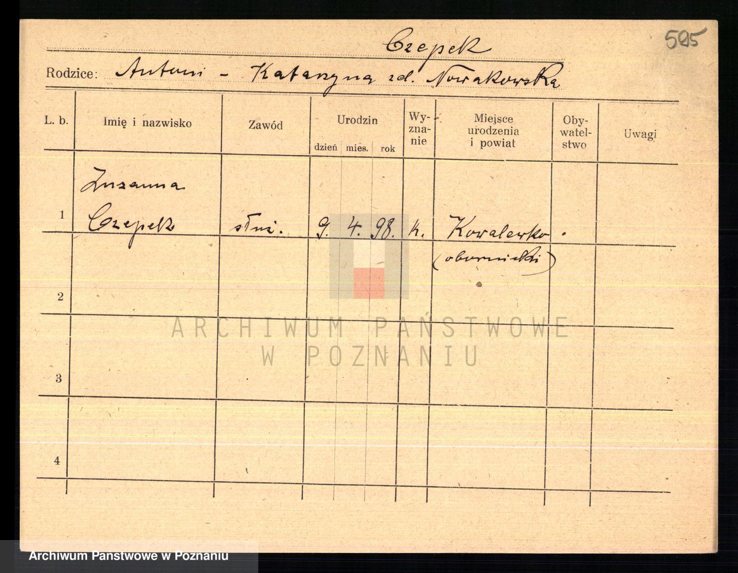 Podgląd karty osobowej dostępny jest po kliknięciu na nazwisko lub ikonkę karty. Można dokonywać powiększenia (ikony na górze) lub przechodzić między kolejnymi skanami (strzałki po bokach).