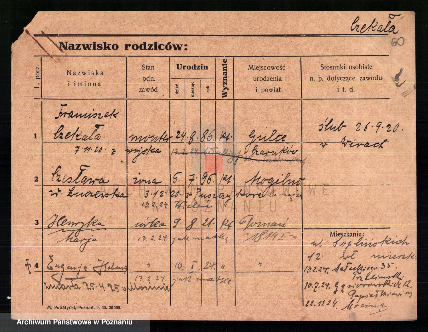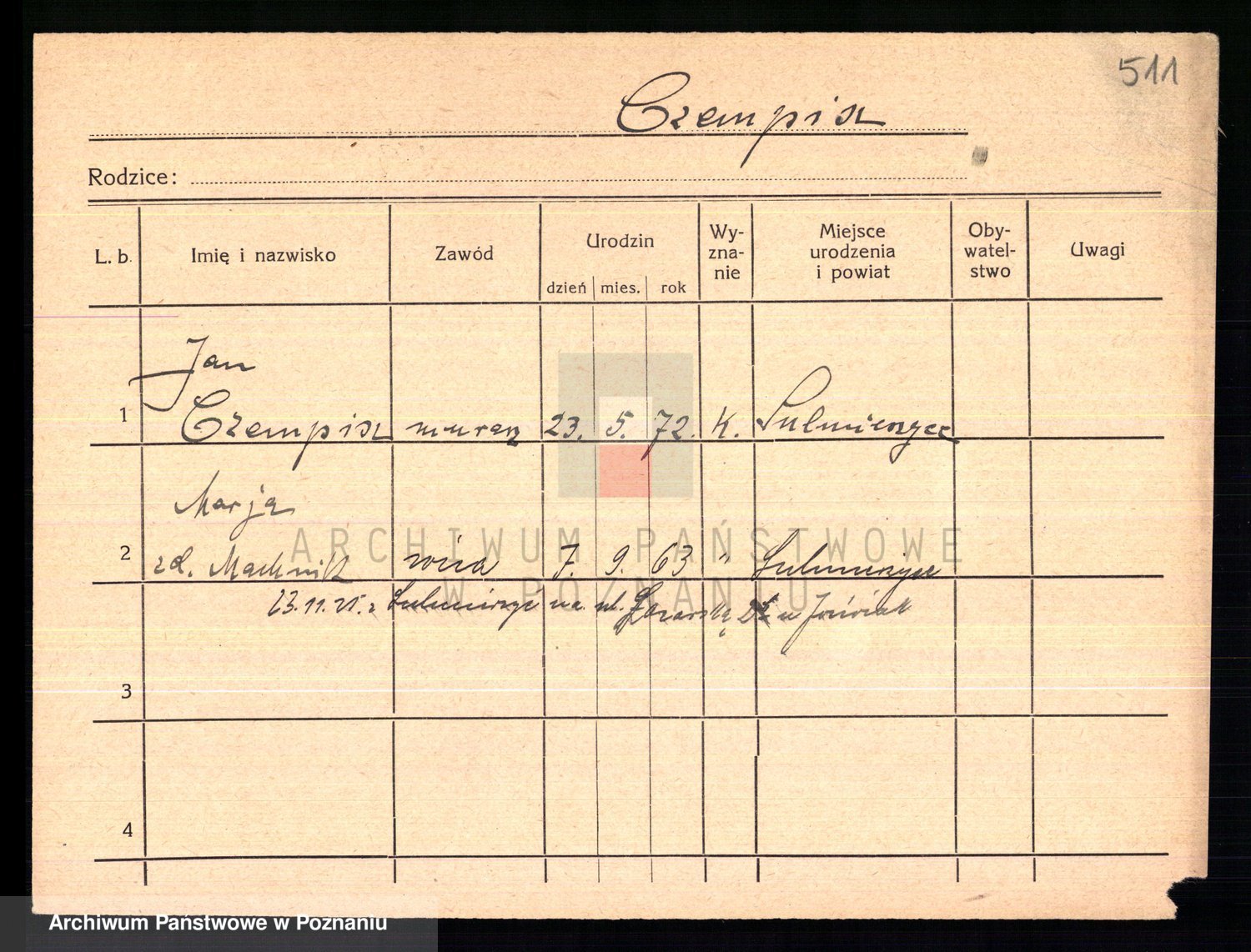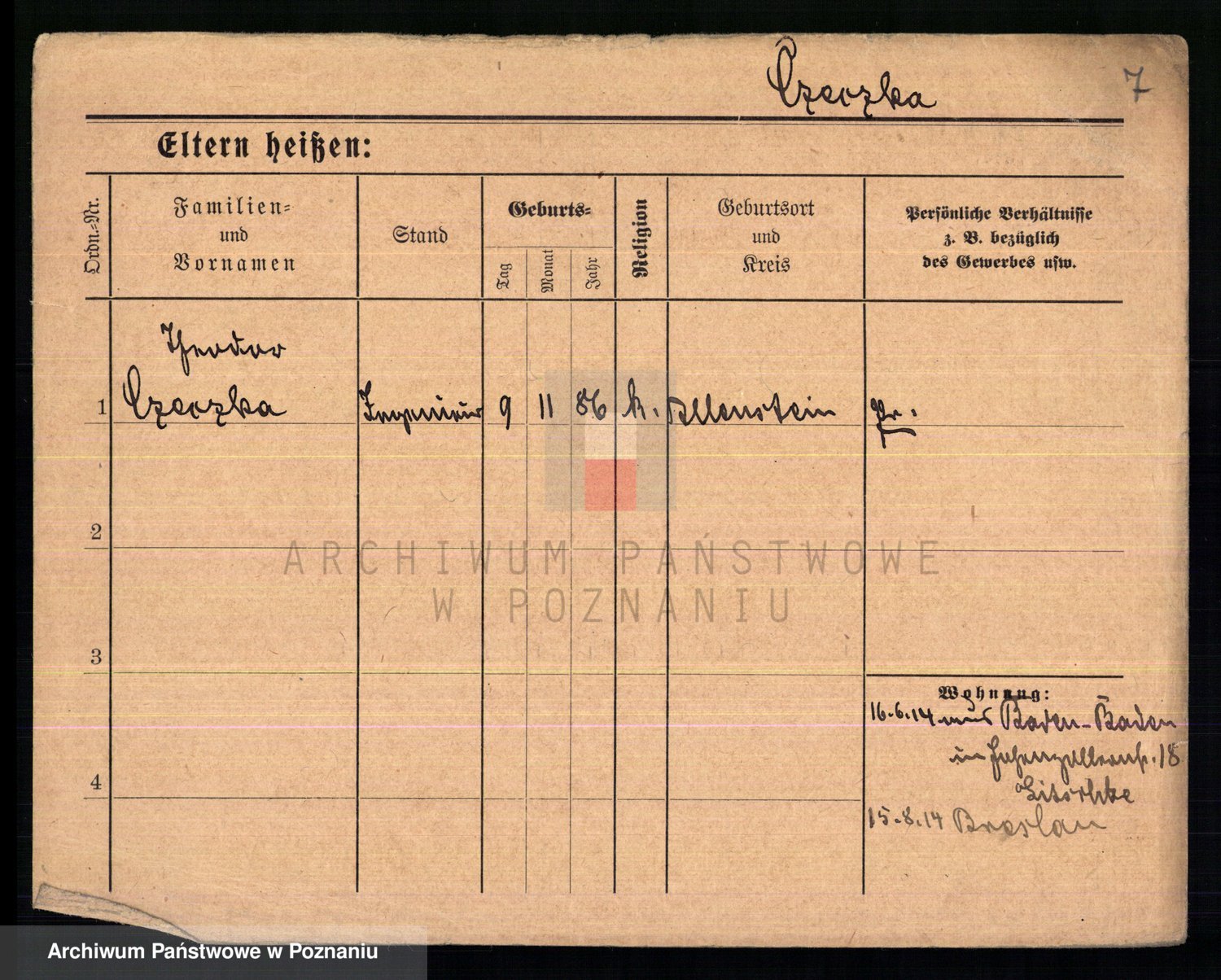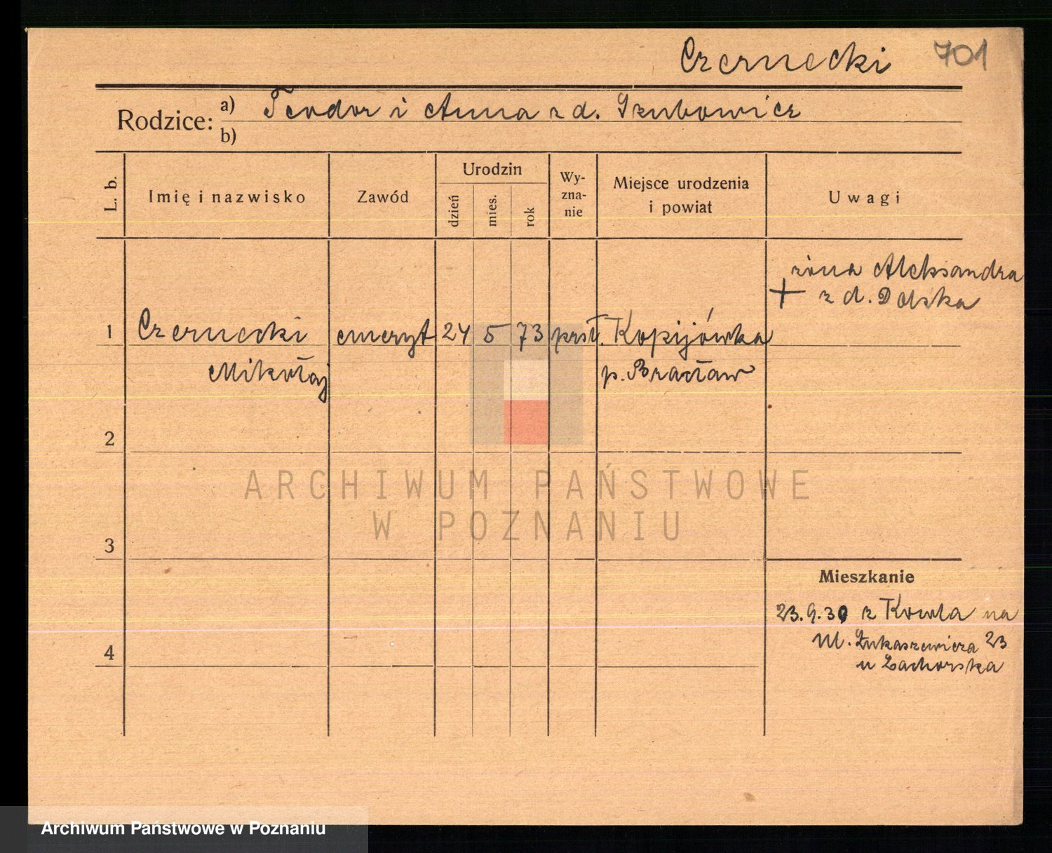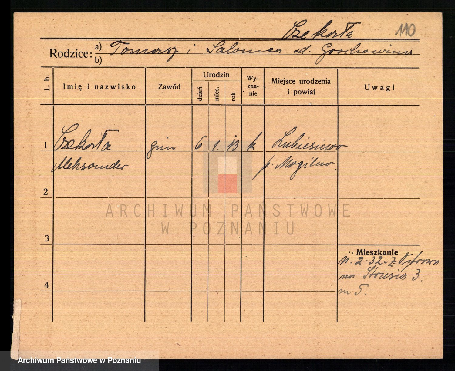 Podgląd karty osobowej dostępny jest po kliknięciu na nazwisko lub ikonkę karty. Można dokonywać powiększenia (ikony na górze) lub przechodzić między kolejnymi skanami (strzałki po bokach).