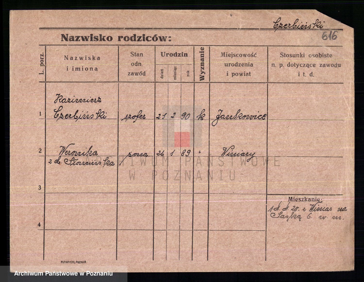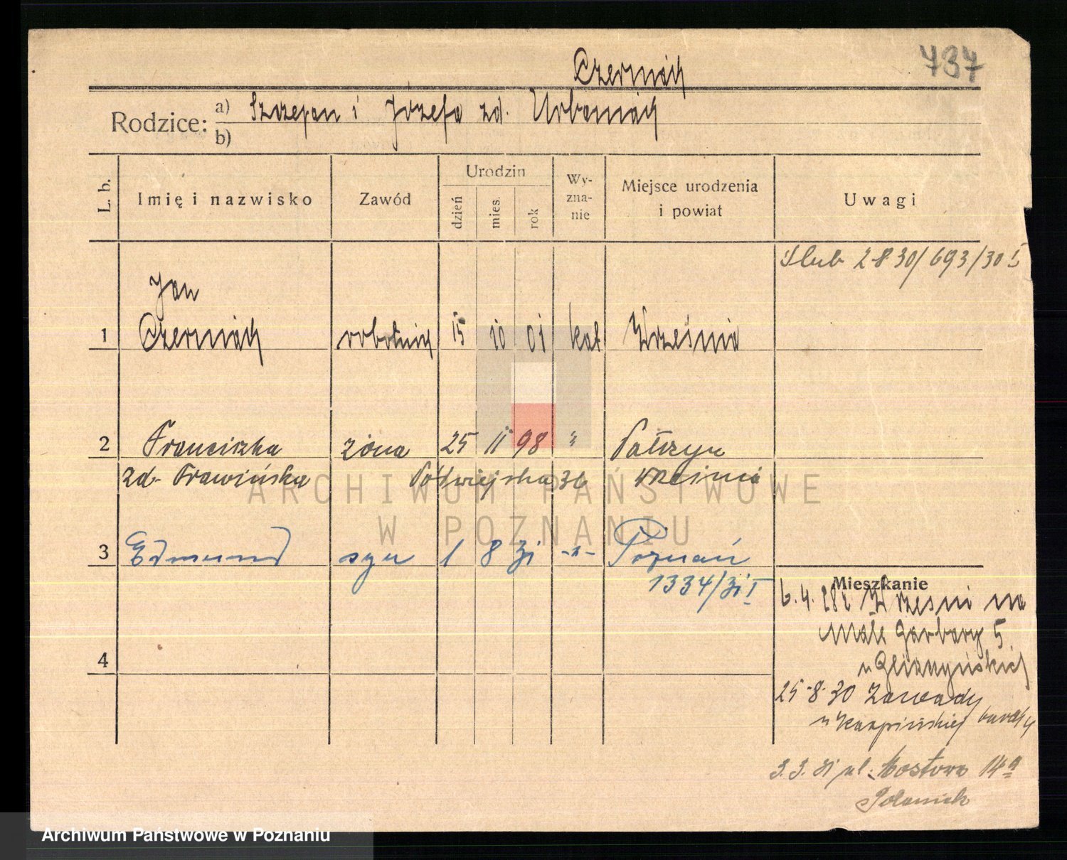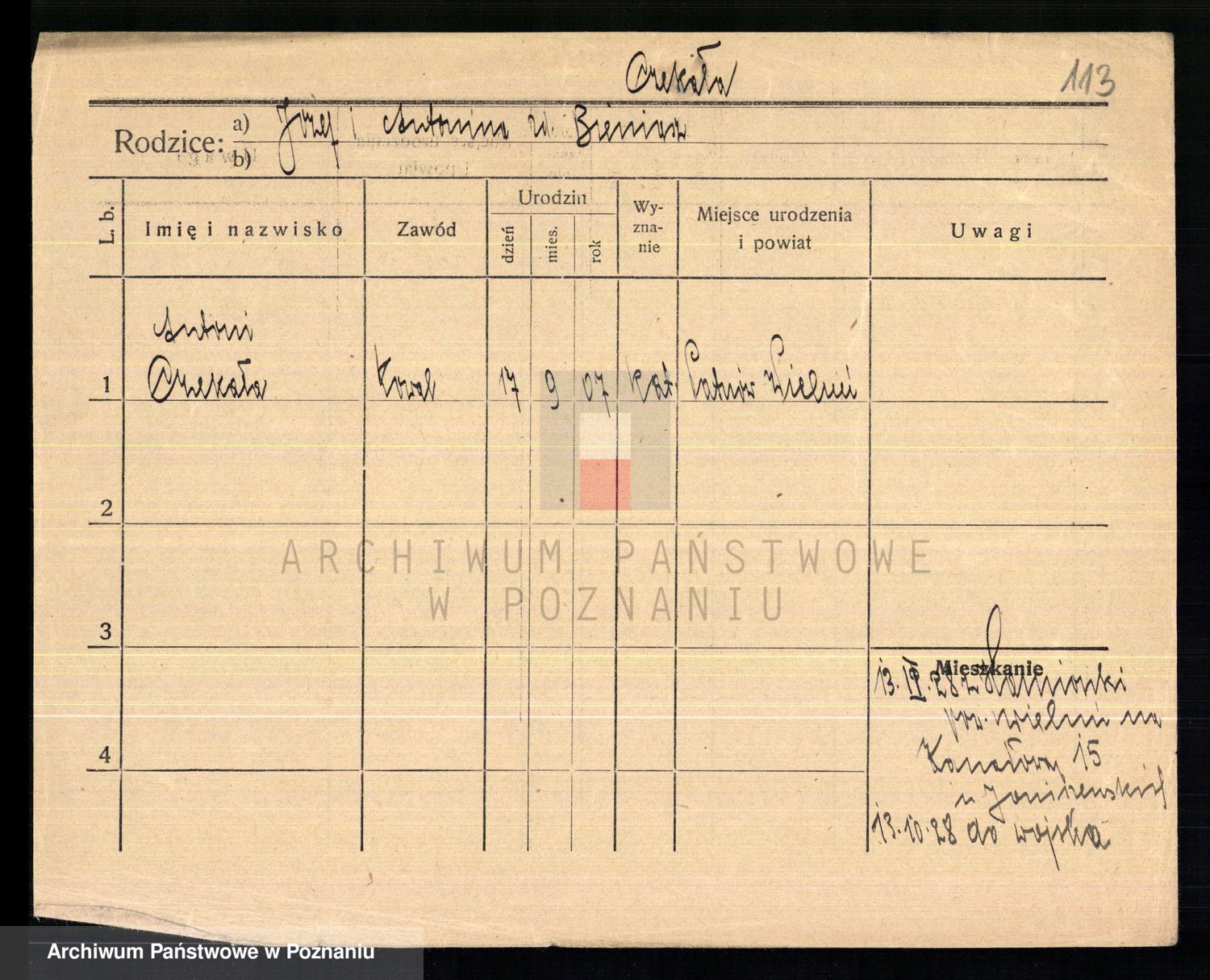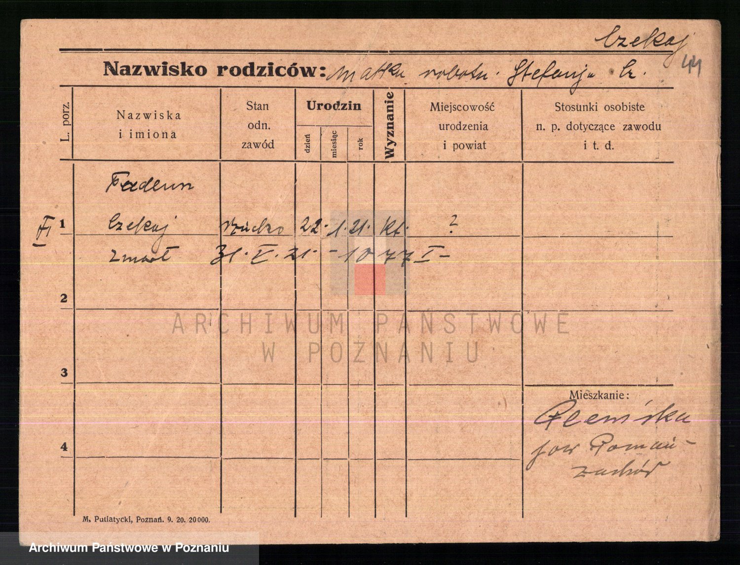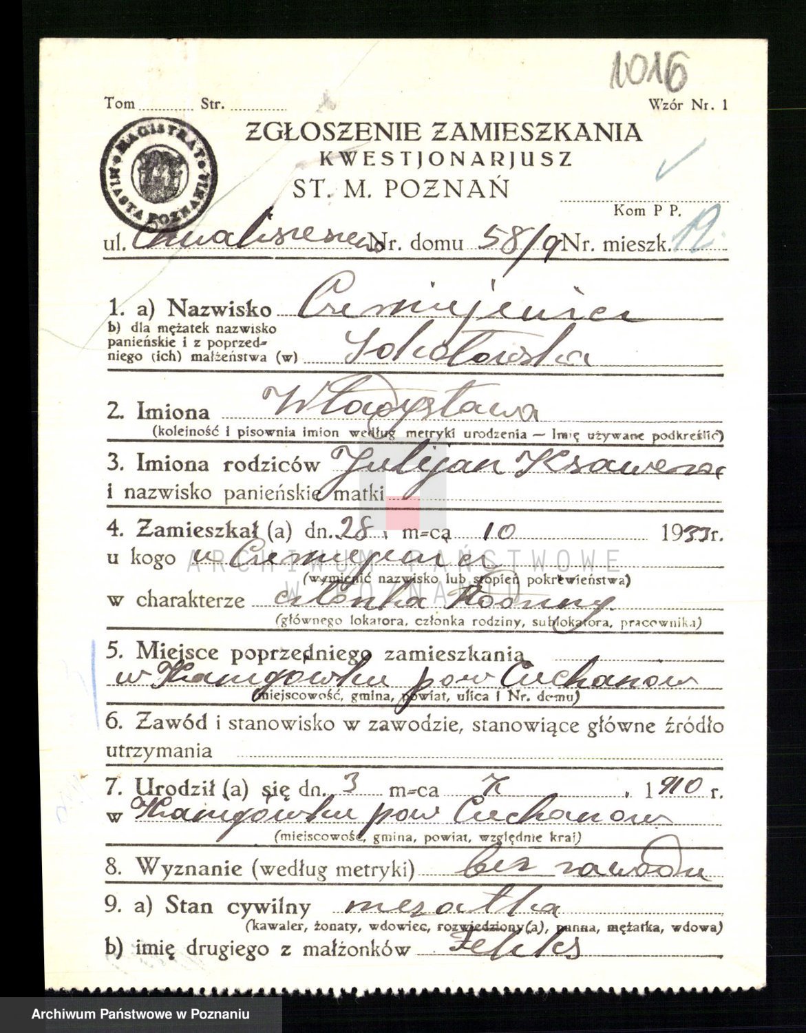 Podgląd karty osobowej dostępny jest po kliknięciu na nazwisko lub ikonkę karty. Można dokonywać powiększenia (ikony na górze) lub przechodzić między kolejnymi skanami (strzałki po bokach).