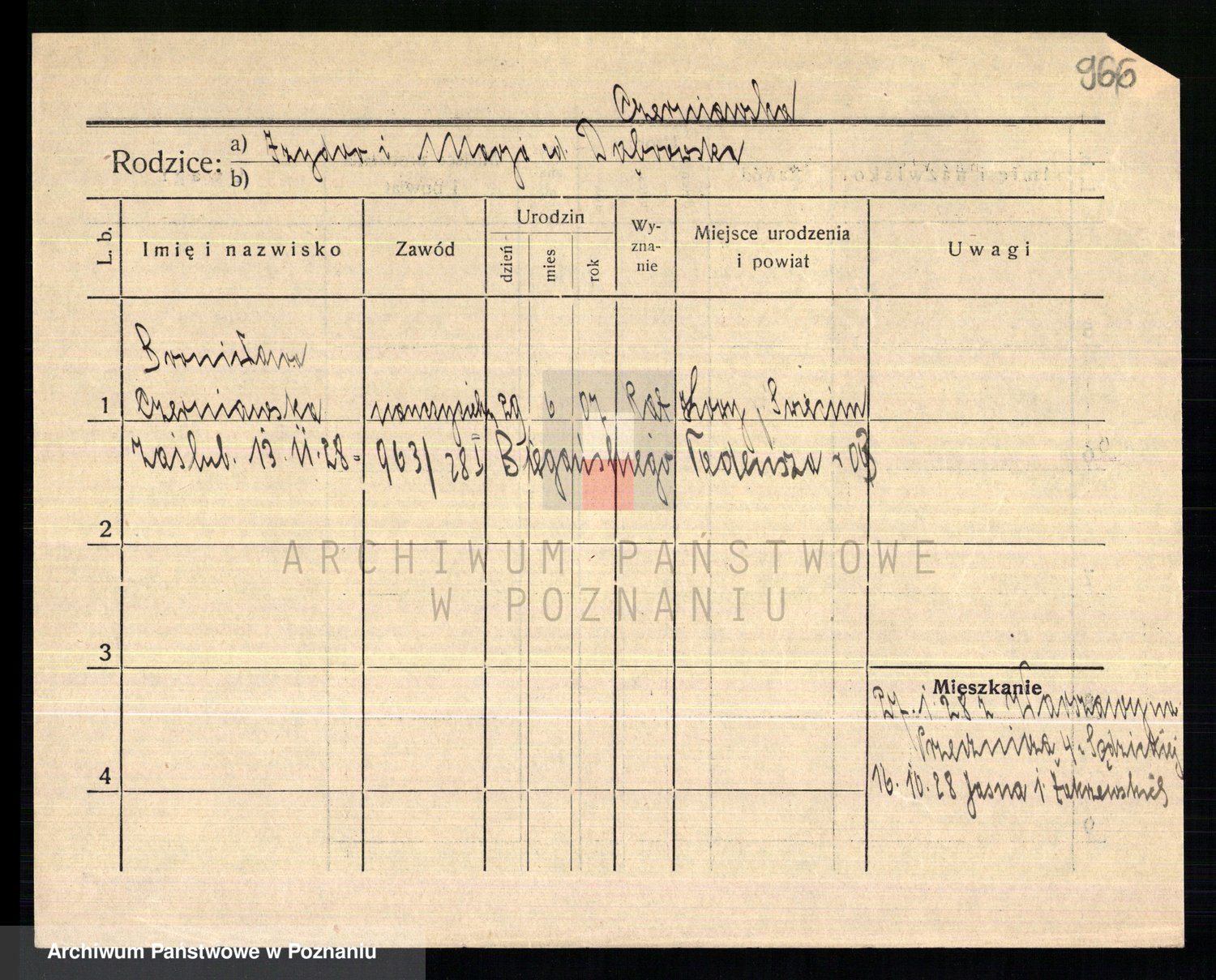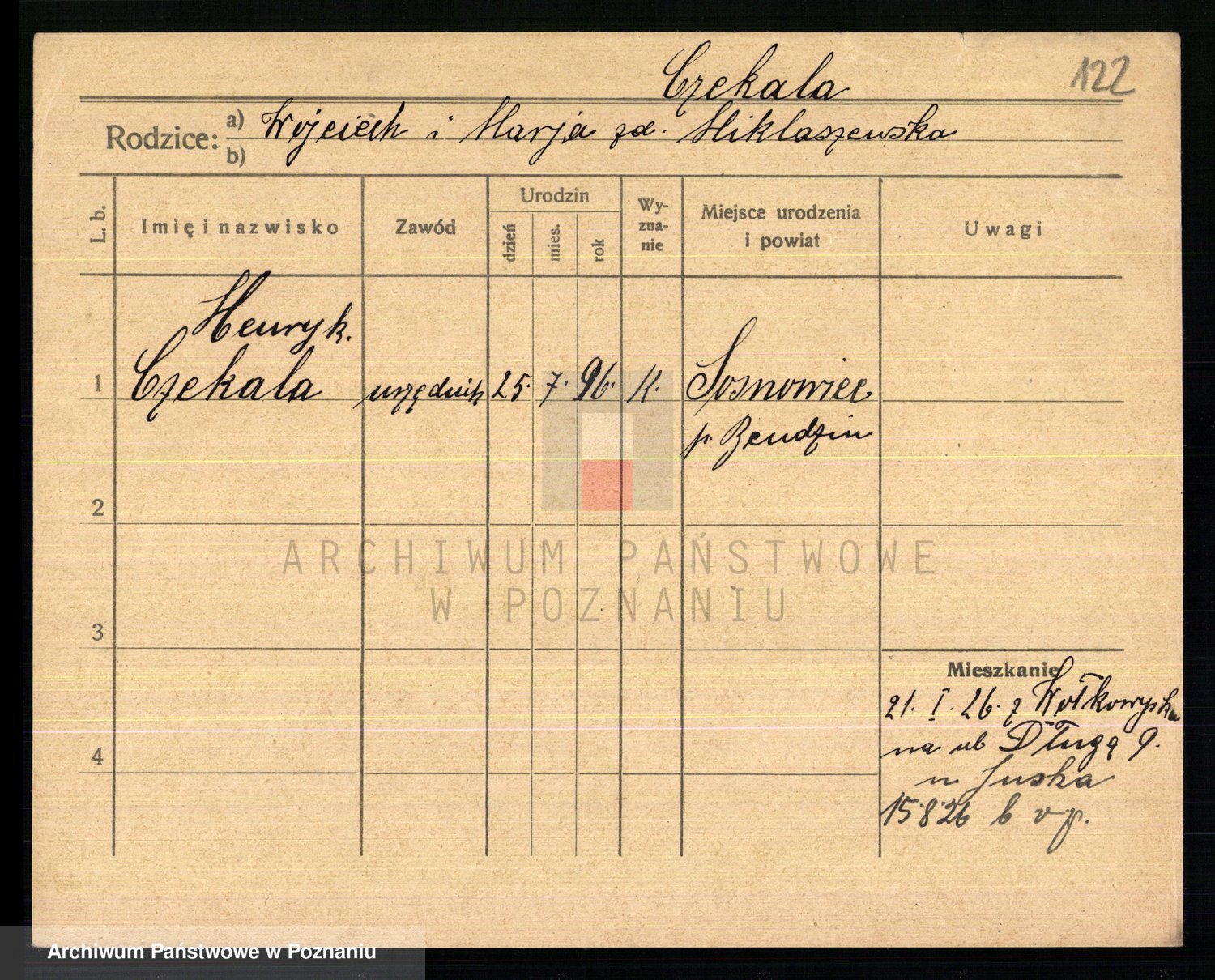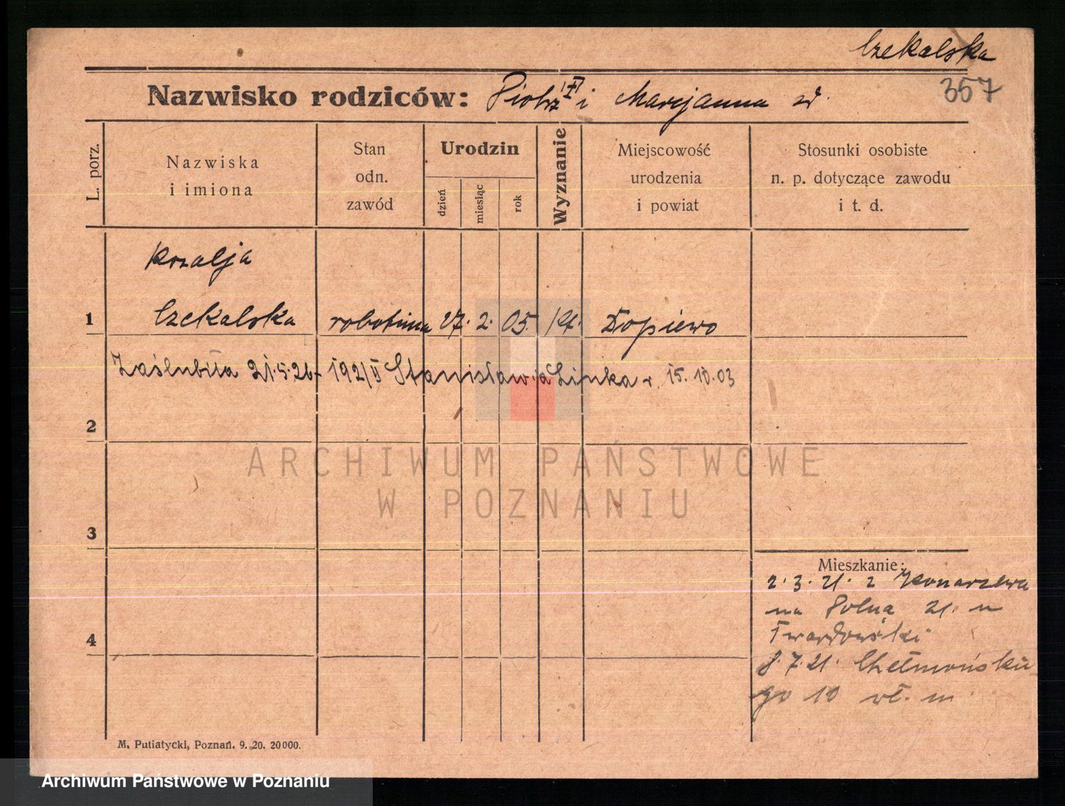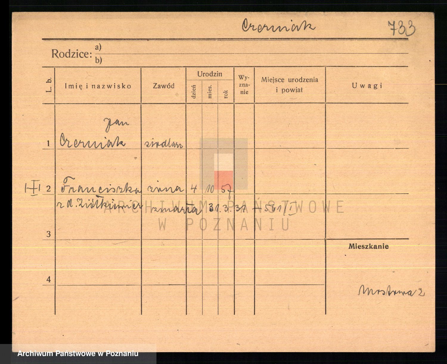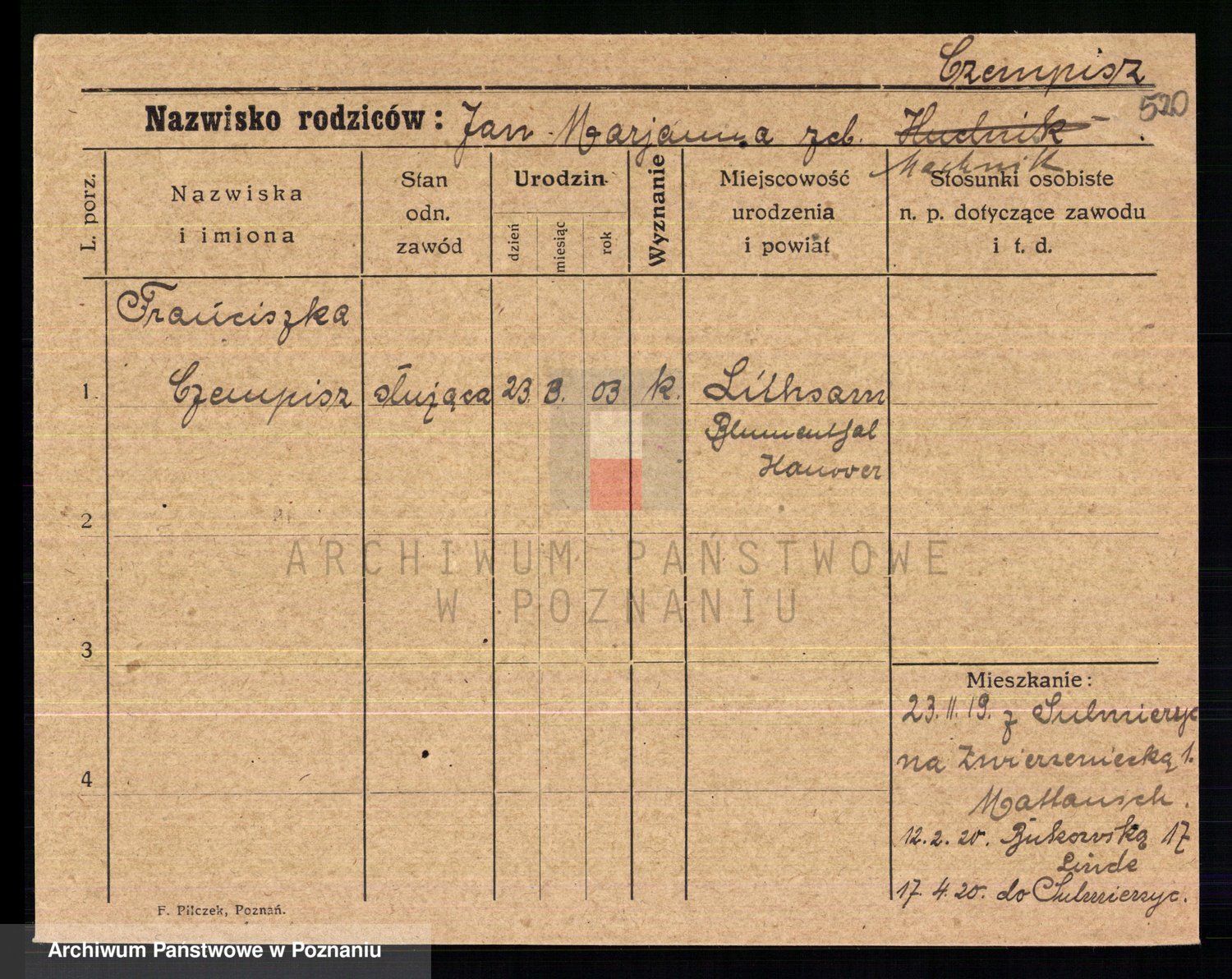 Podgląd karty osobowej dostępny jest po kliknięciu na nazwisko lub ikonkę karty. Można dokonywać powiększenia (ikony na górze) lub przechodzić między kolejnymi skanami (strzałki po bokach).