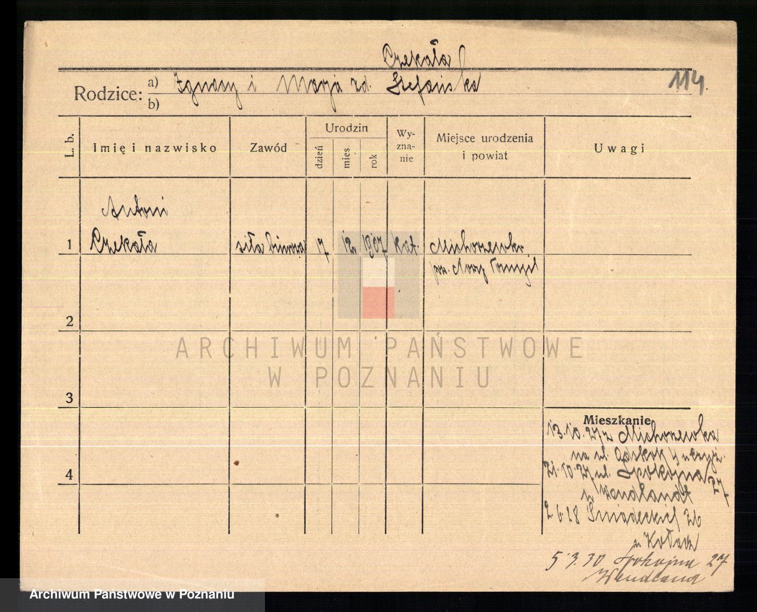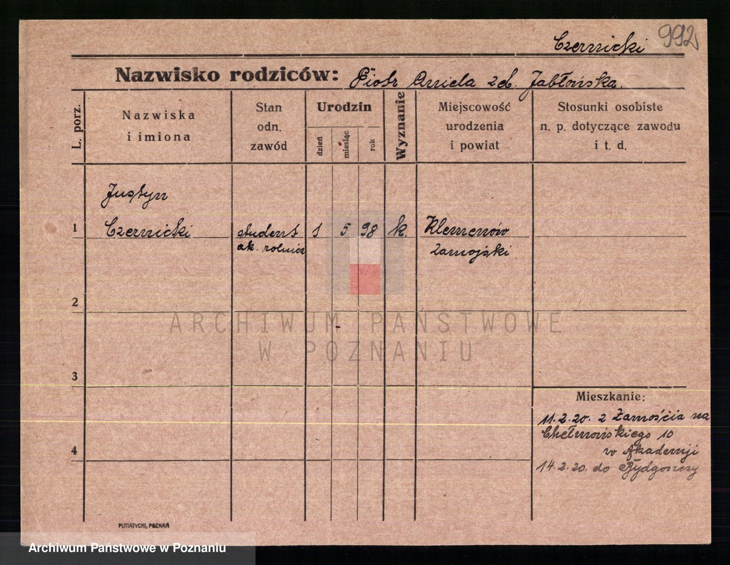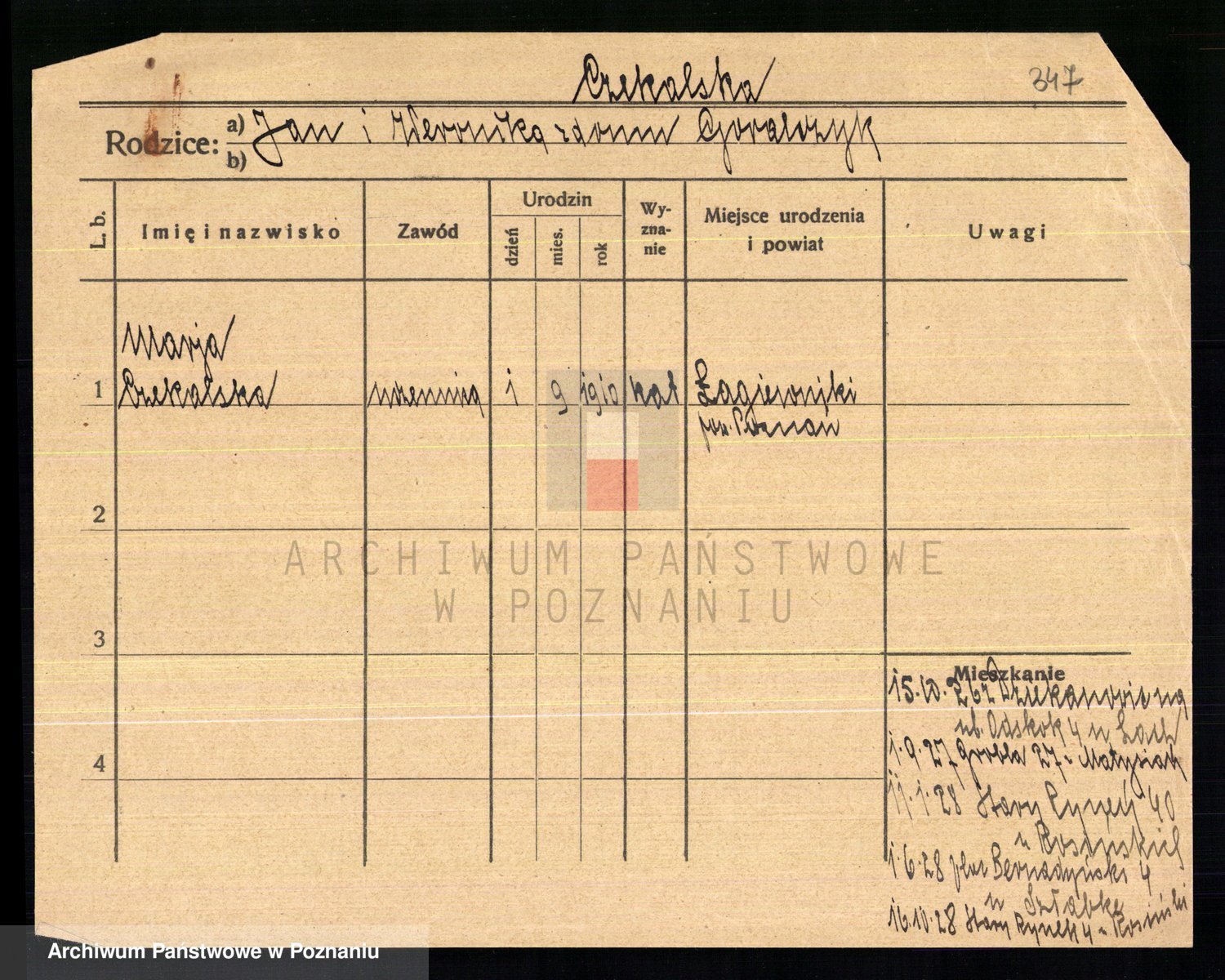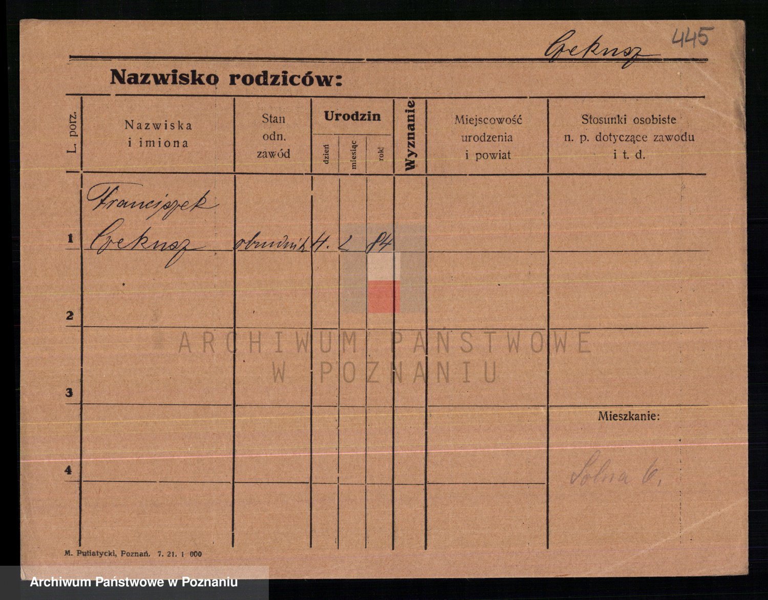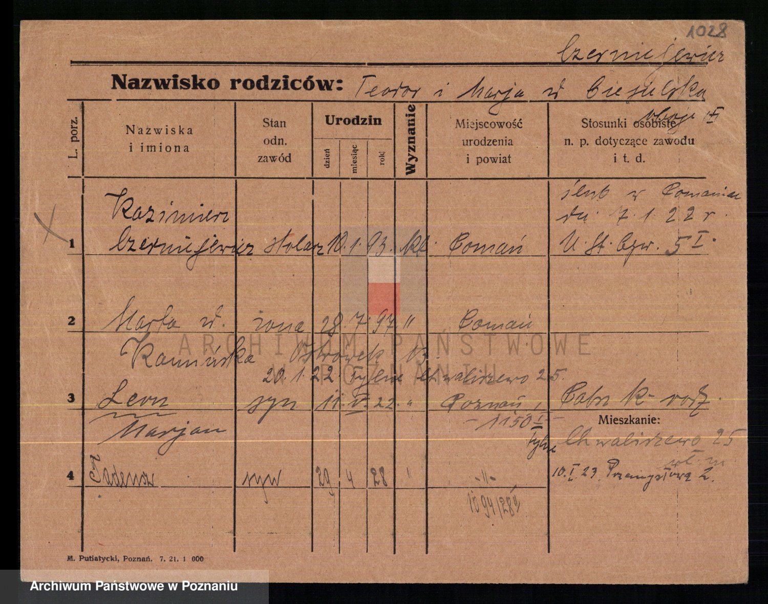 Podgląd karty osobowej dostępny jest po kliknięciu na nazwisko lub ikonkę karty. Można dokonywać powiększenia (ikony na górze) lub przechodzić między kolejnymi skanami (strzałki po bokach).