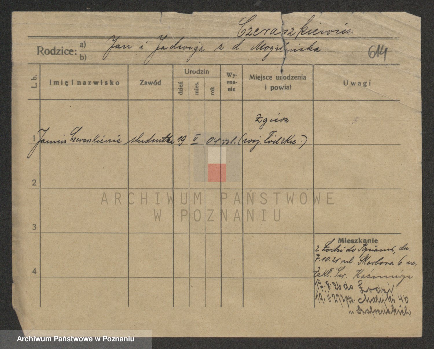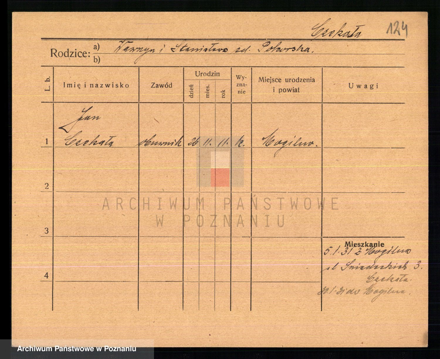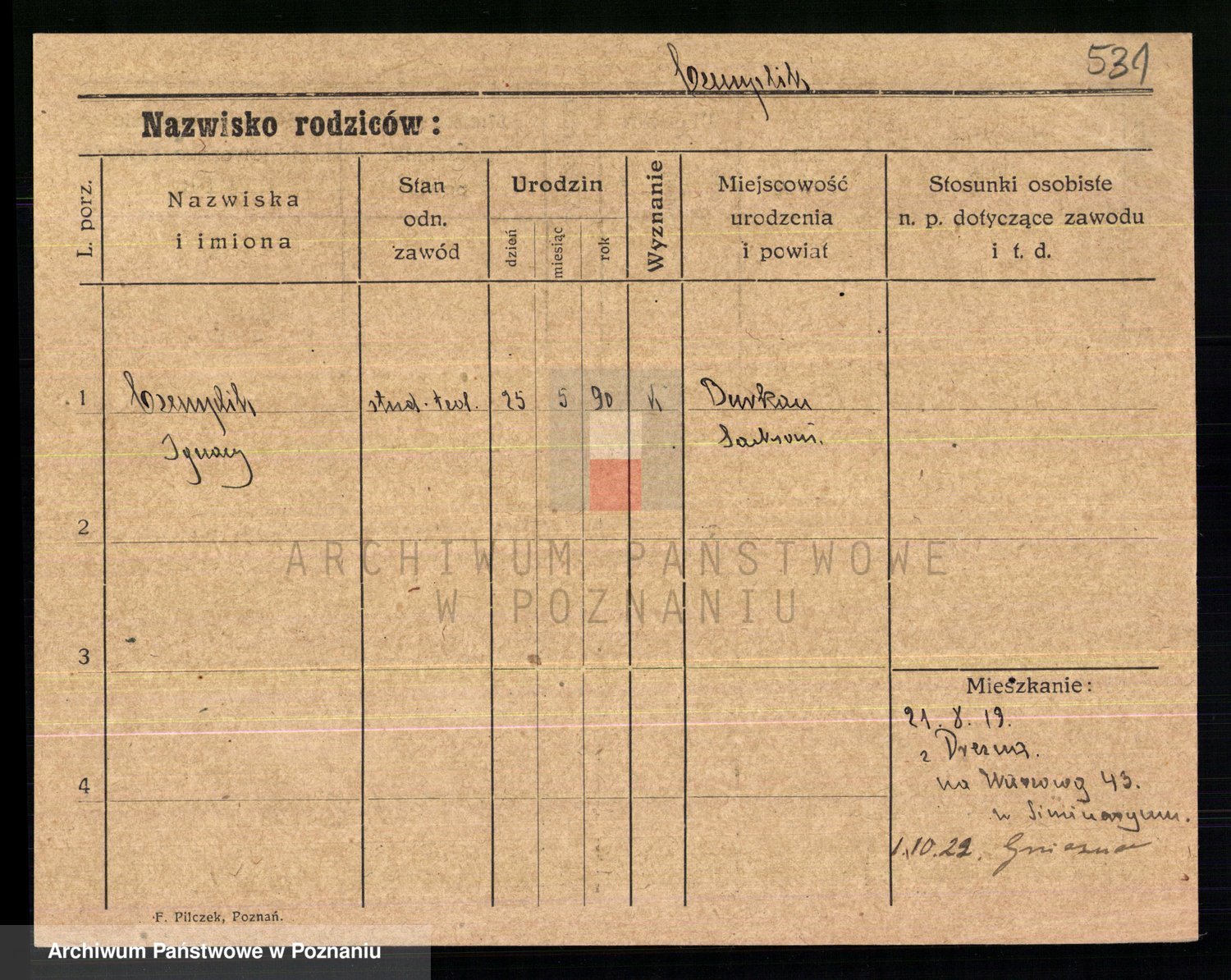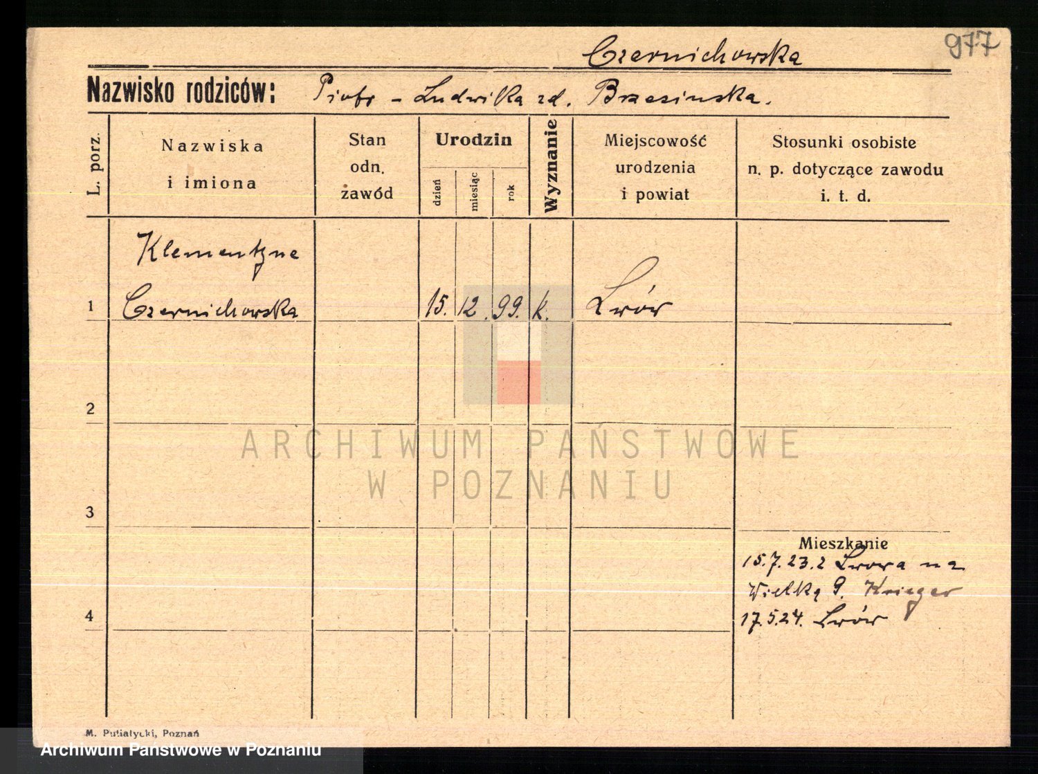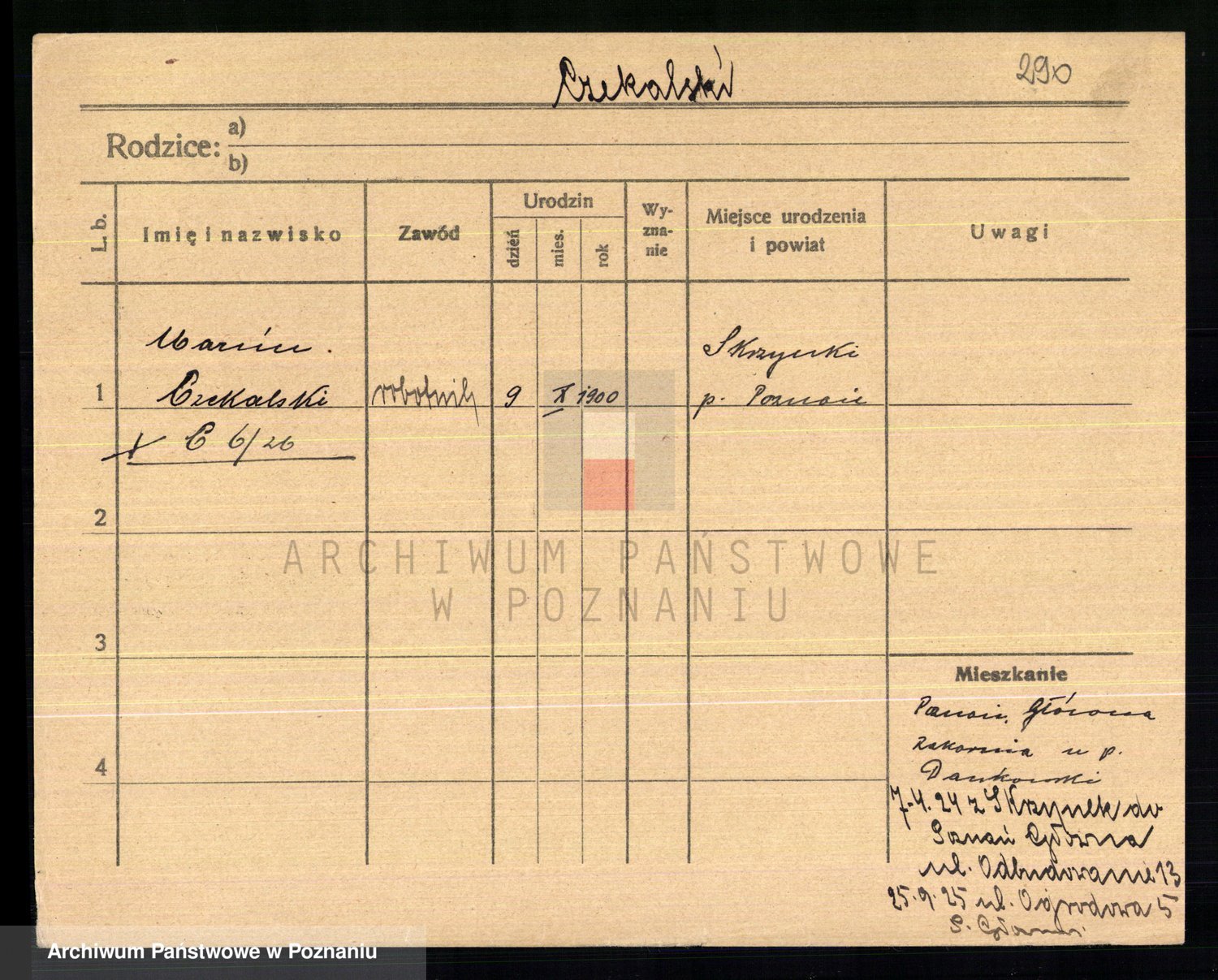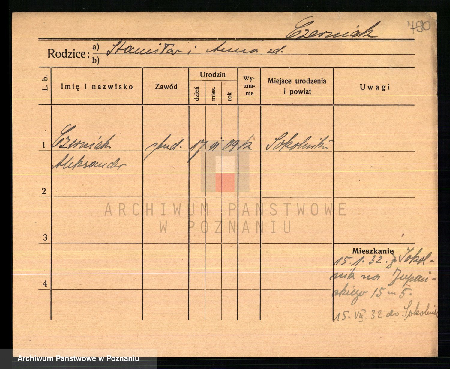 Podgląd karty osobowej dostępny jest po kliknięciu na nazwisko lub ikonkę karty. Można dokonywać powiększenia (ikony na górze) lub przechodzić między kolejnymi skanami (strzałki po bokach).