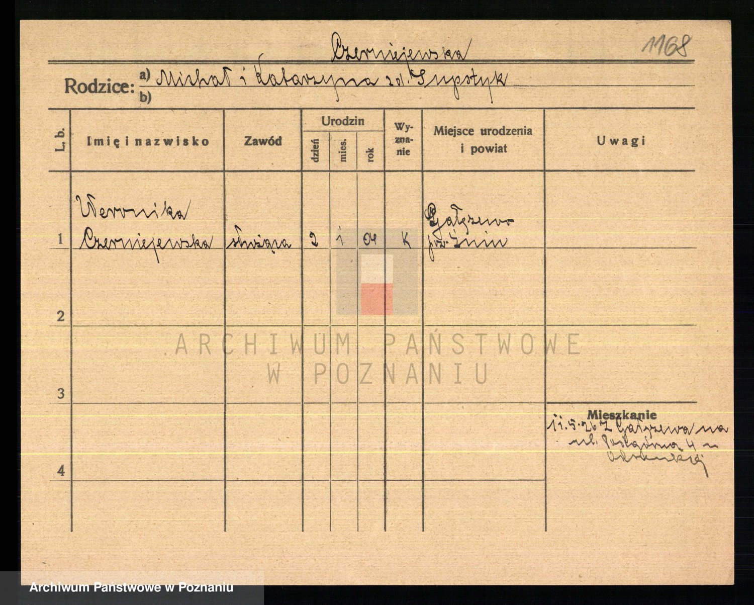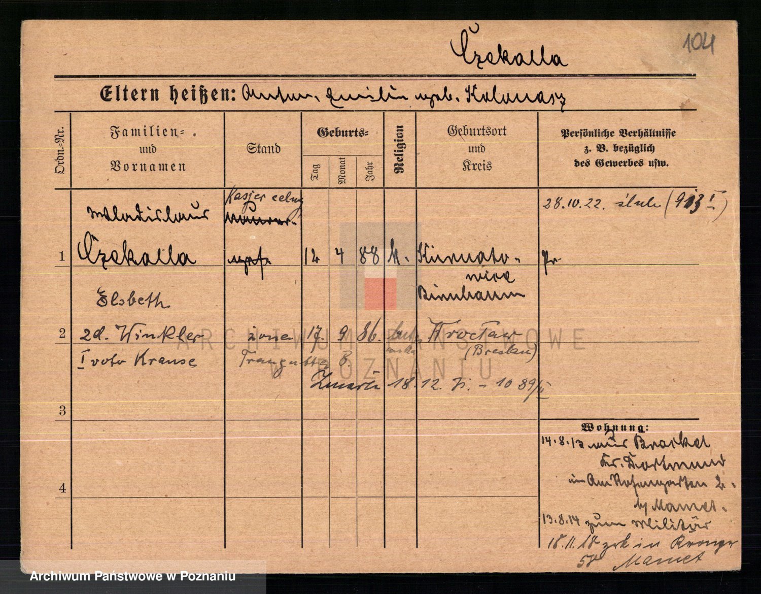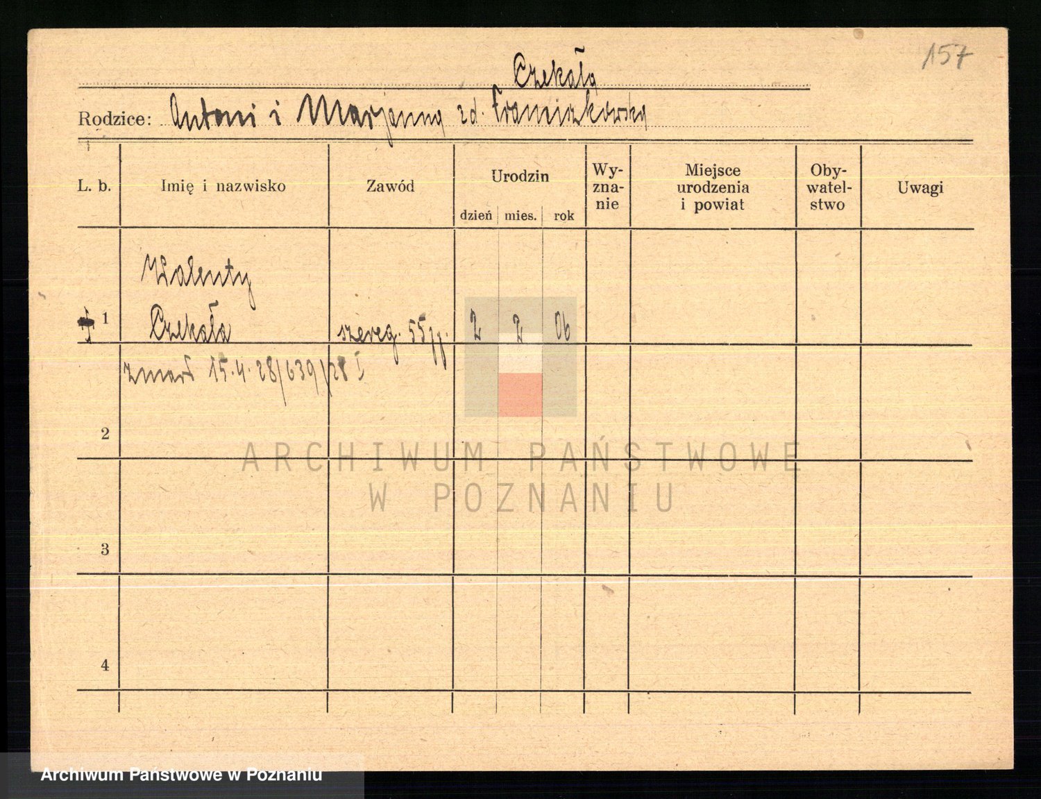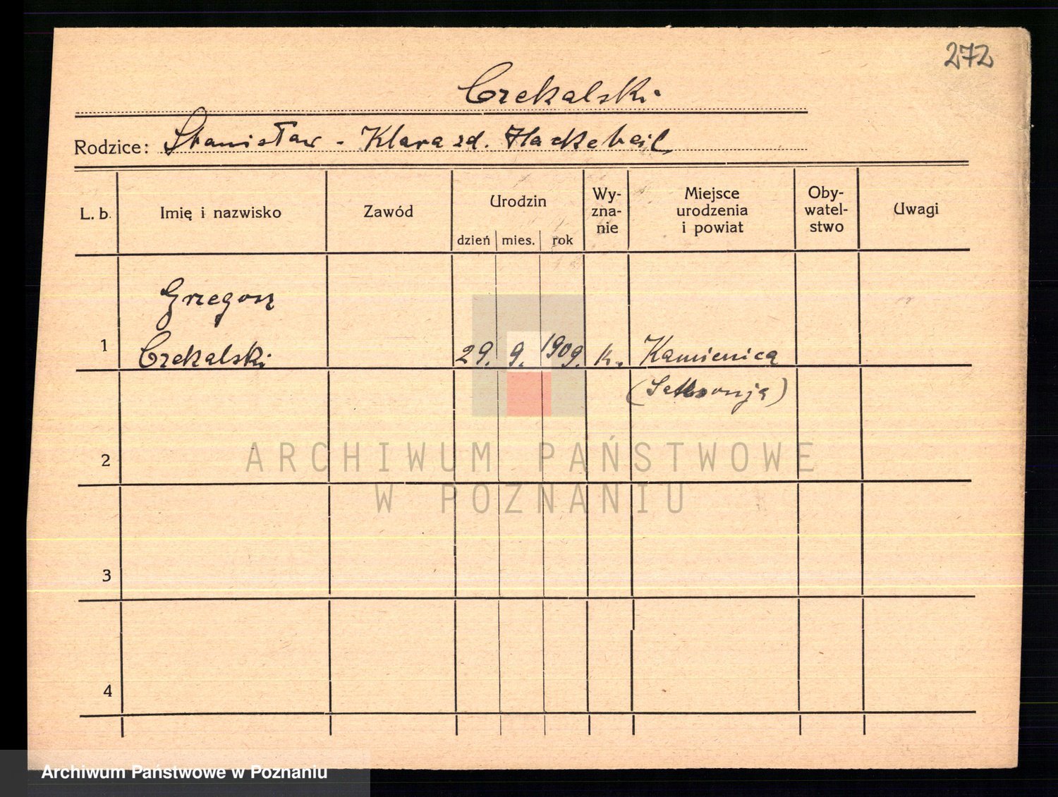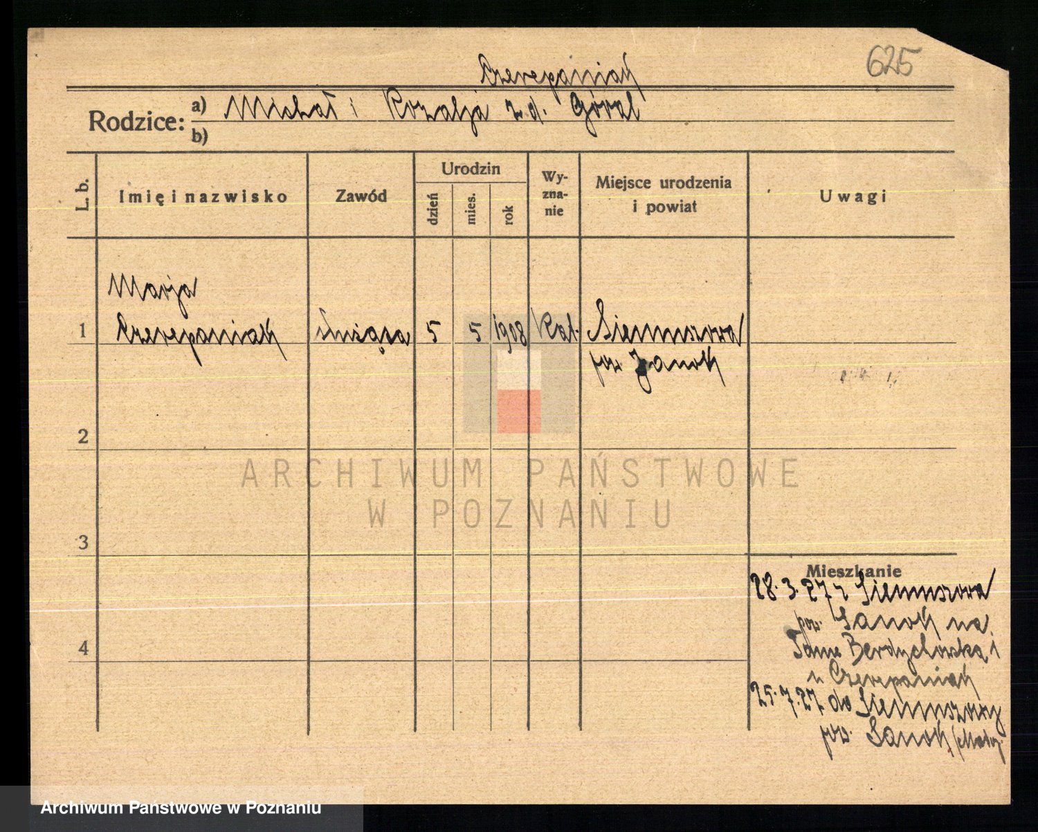 Podgląd karty osobowej dostępny jest po kliknięciu na nazwisko lub ikonkę karty. Można dokonywać powiększenia (ikony na górze) lub przechodzić między kolejnymi skanami (strzałki po bokach).
