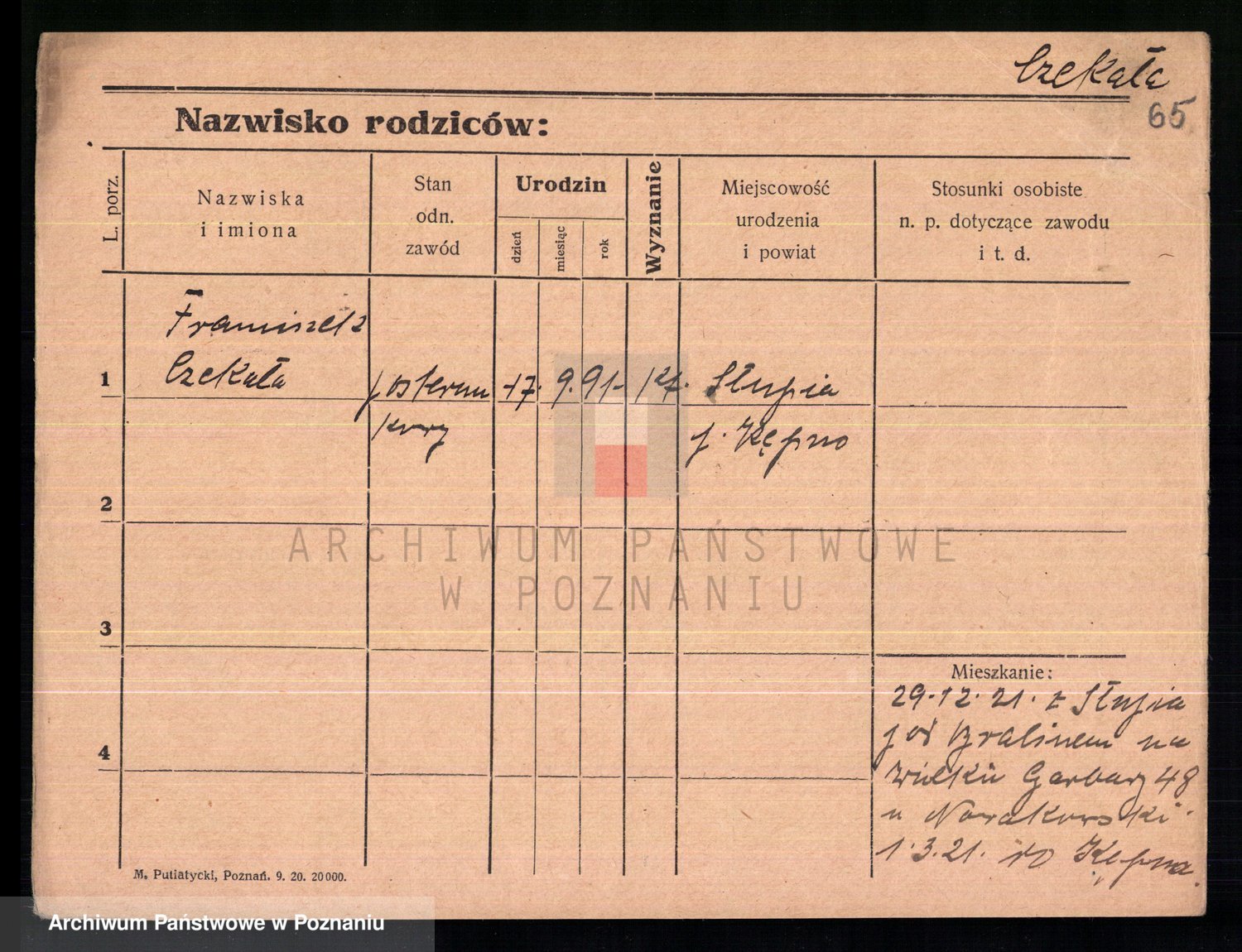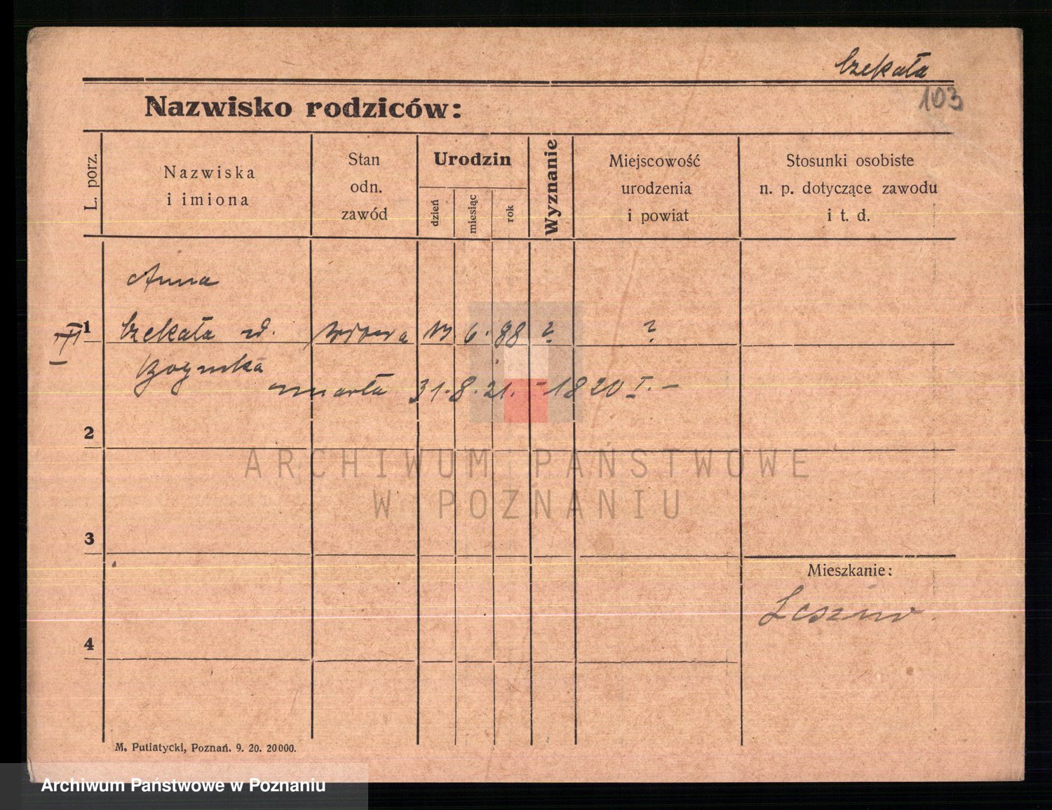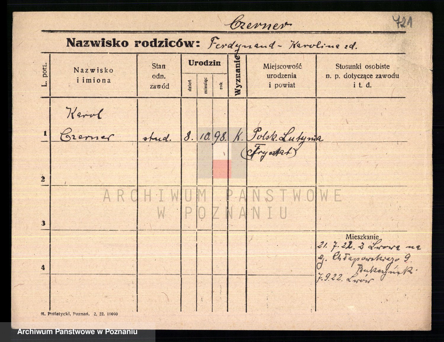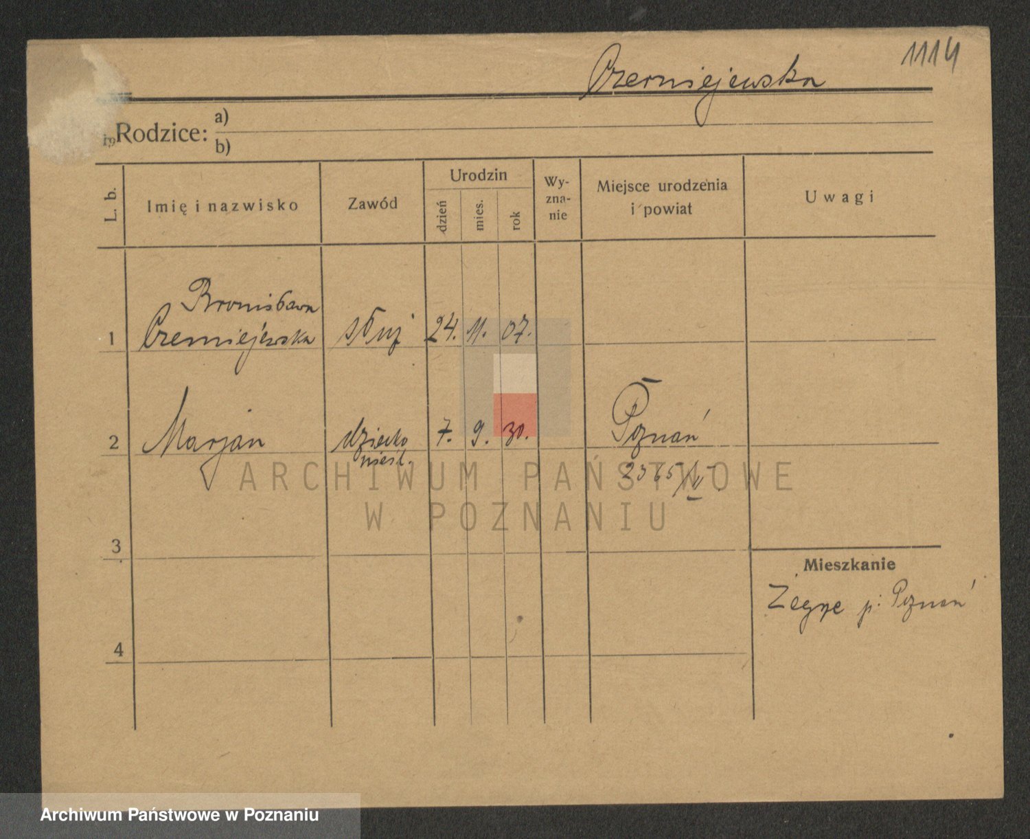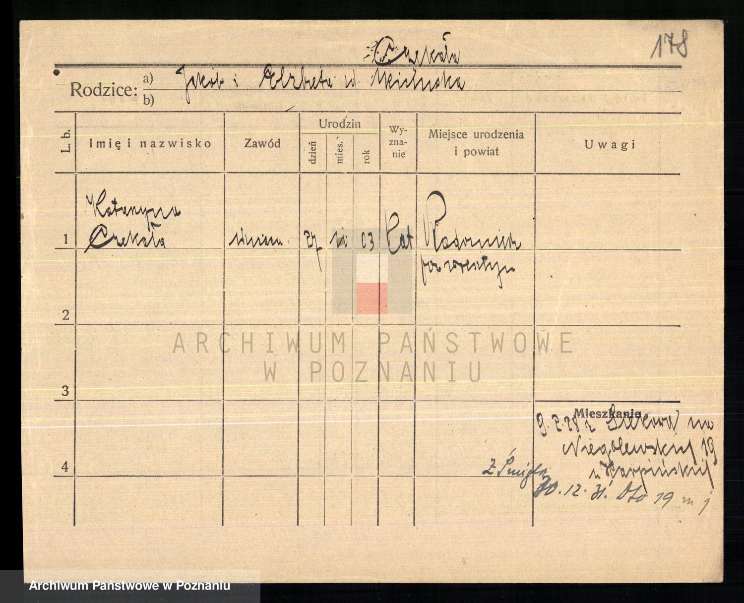 Podgląd karty osobowej dostępny jest po kliknięciu na nazwisko lub ikonkę karty. Można dokonywać powiększenia (ikony na górze) lub przechodzić między kolejnymi skanami (strzałki po bokach).