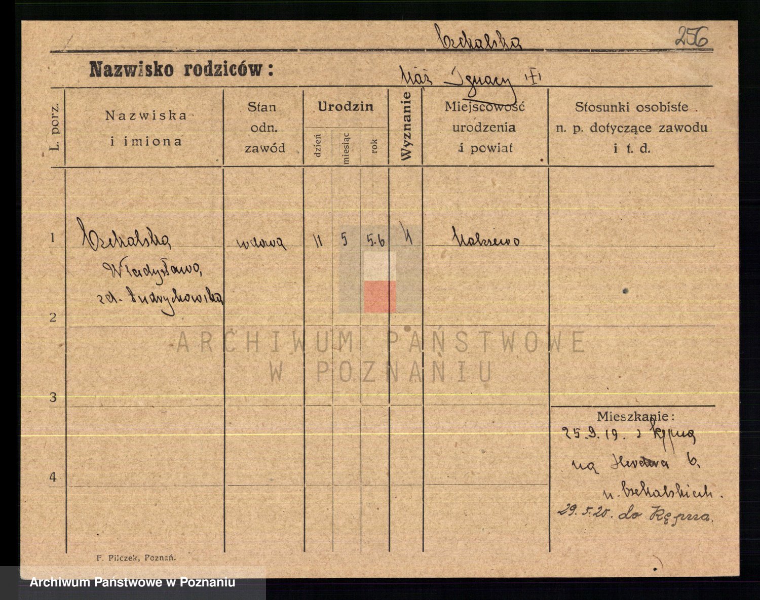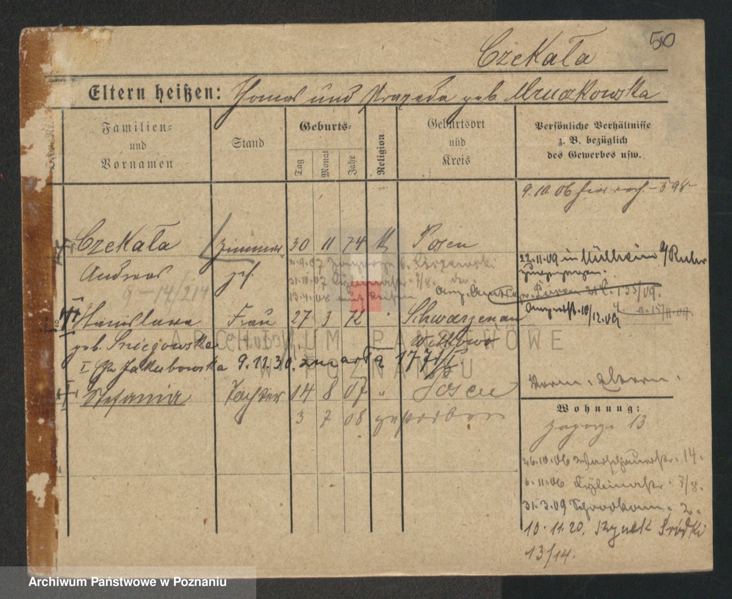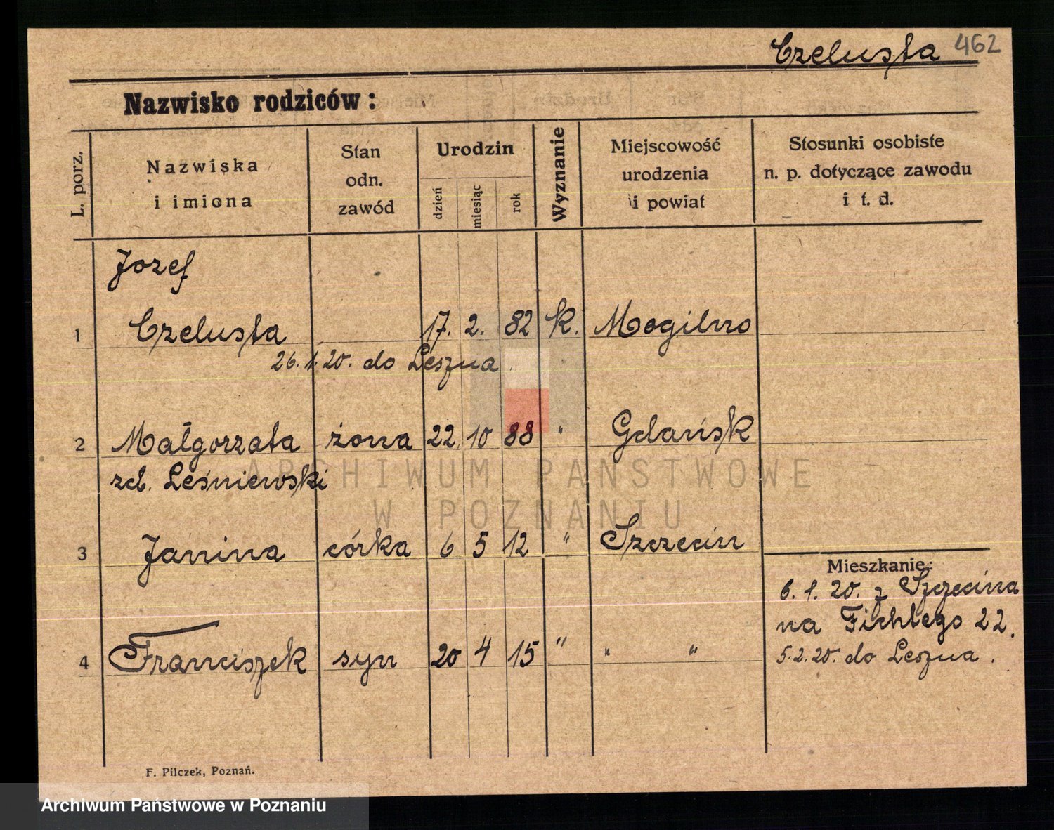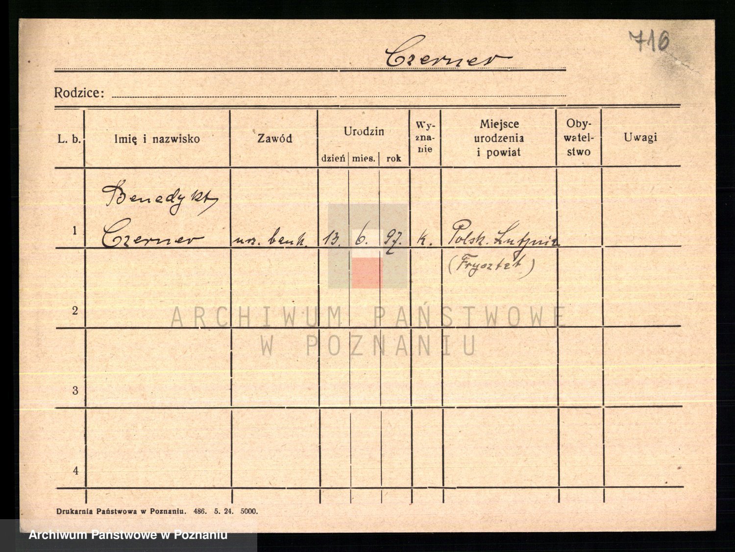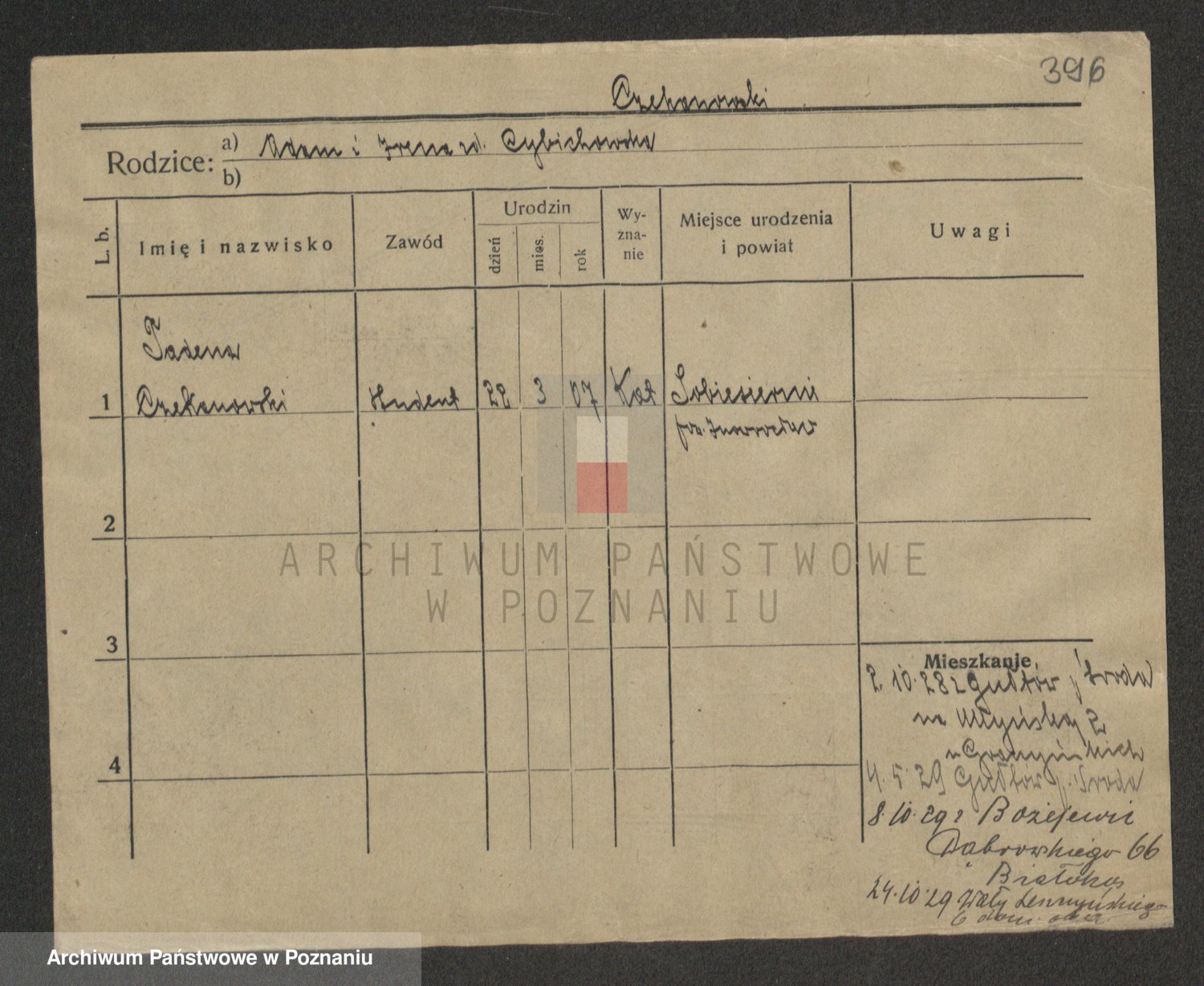 Podgląd karty osobowej dostępny jest po kliknięciu na nazwisko lub ikonkę karty. Można dokonywać powiększenia (ikony na górze) lub przechodzić między kolejnymi skanami (strzałki po bokach).