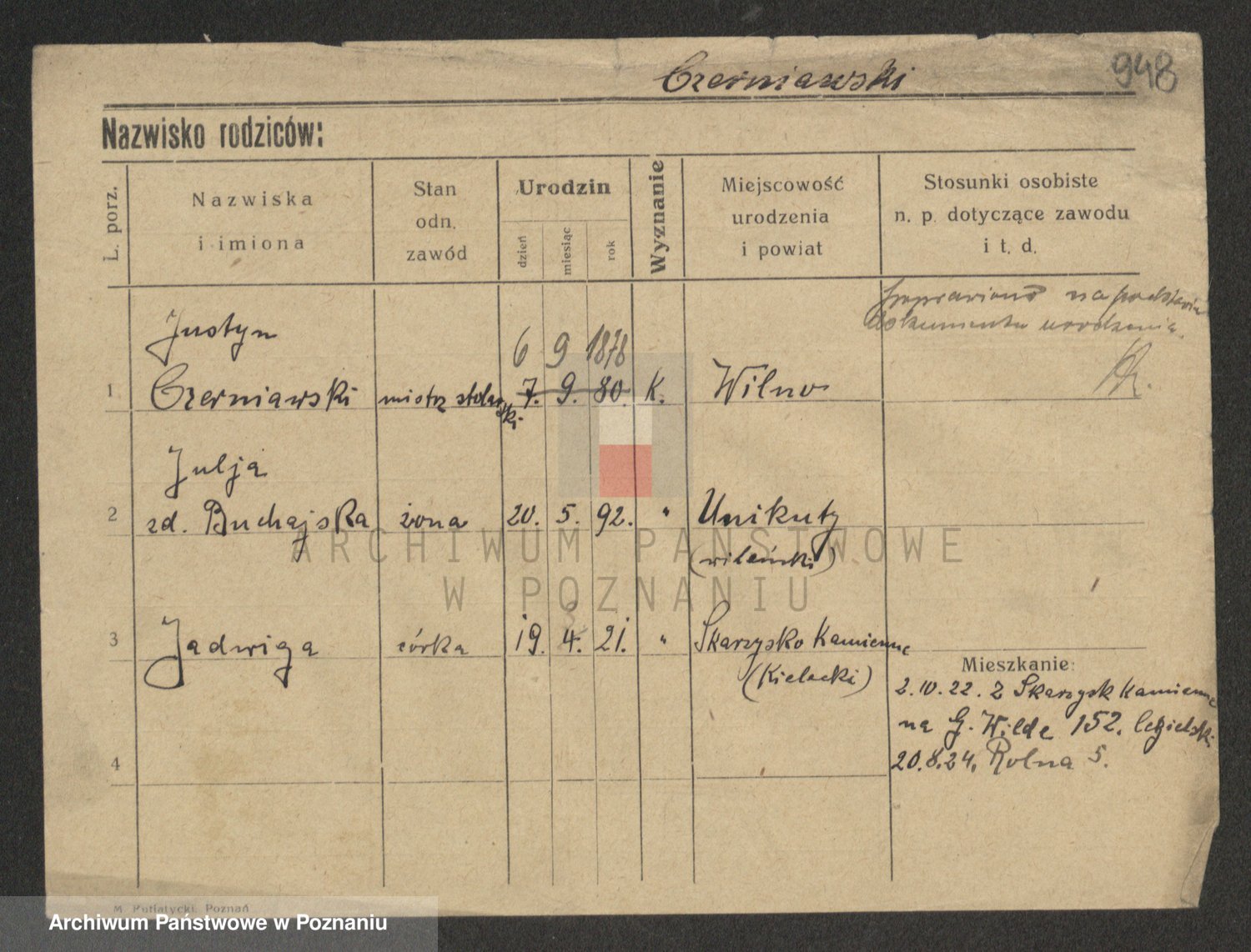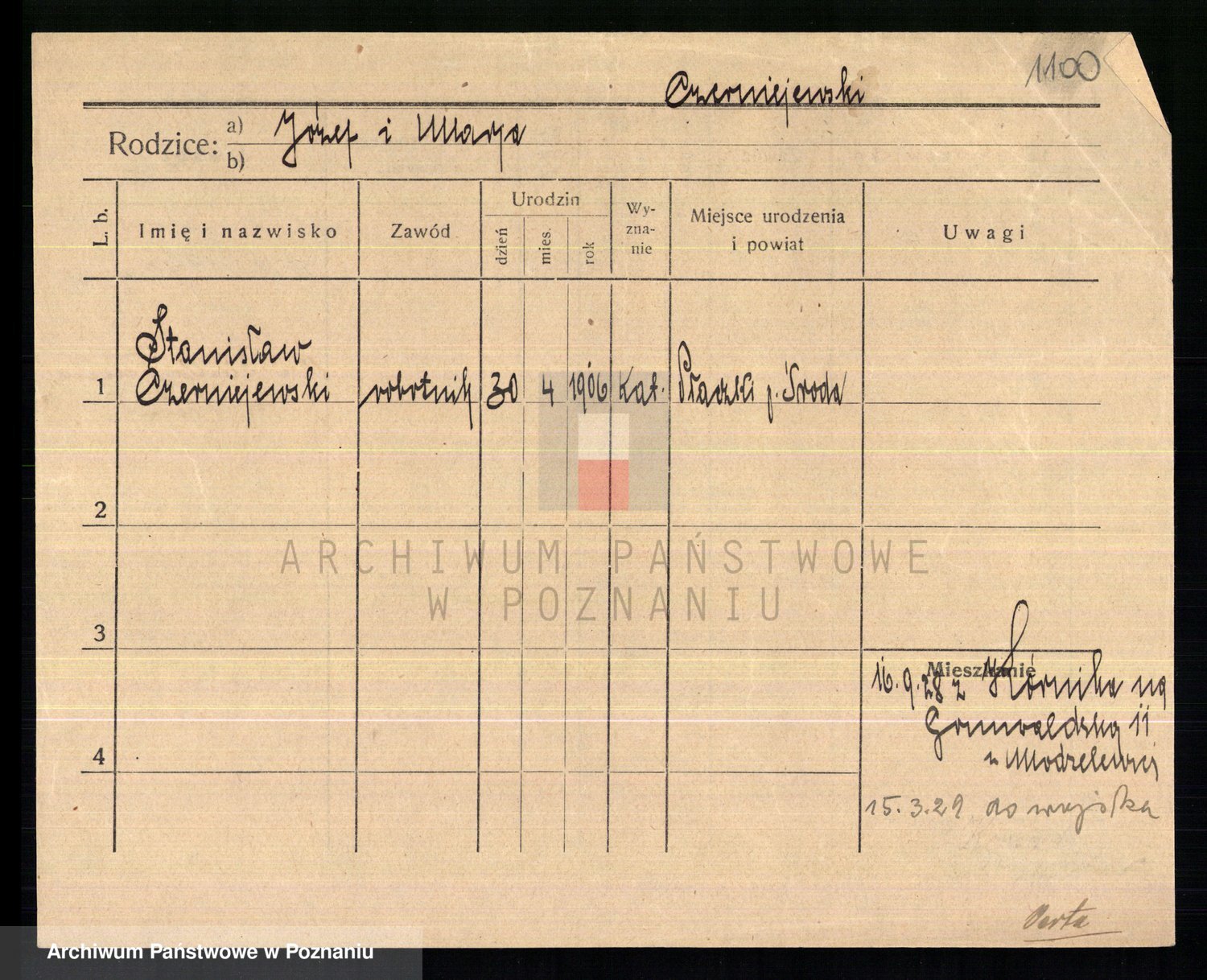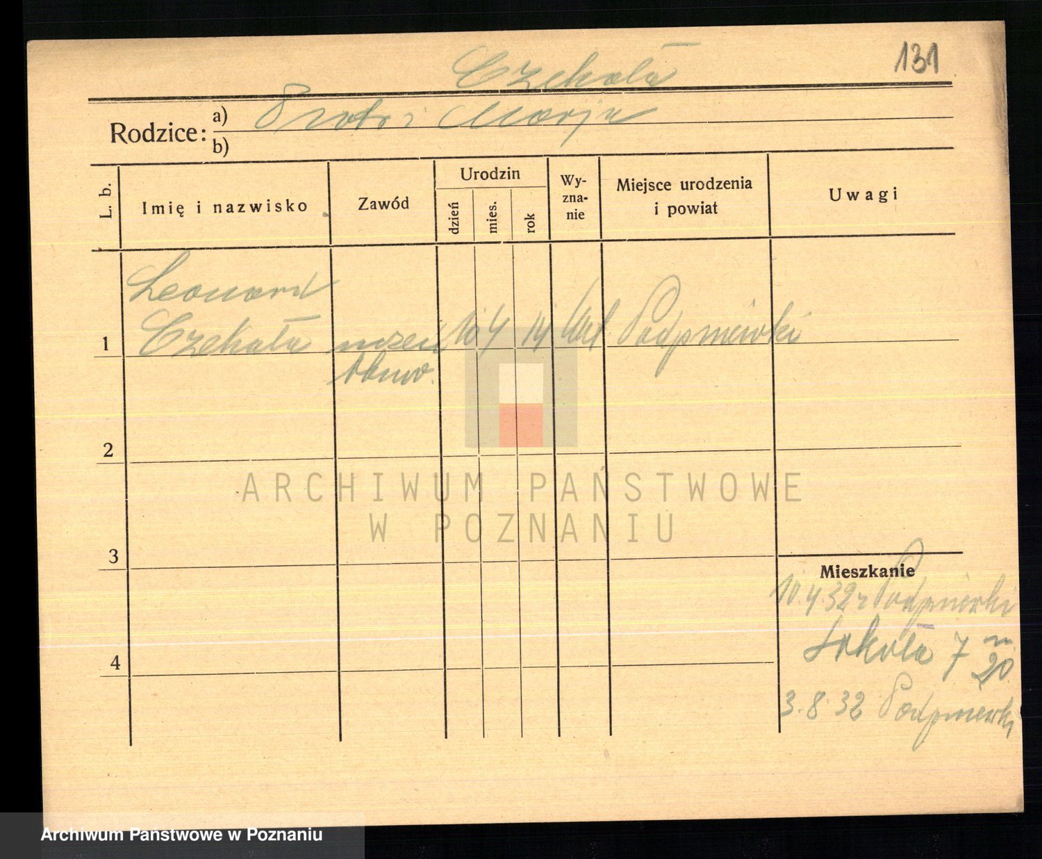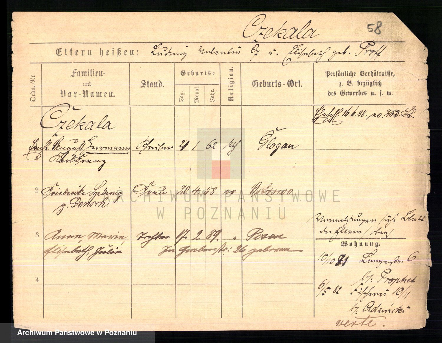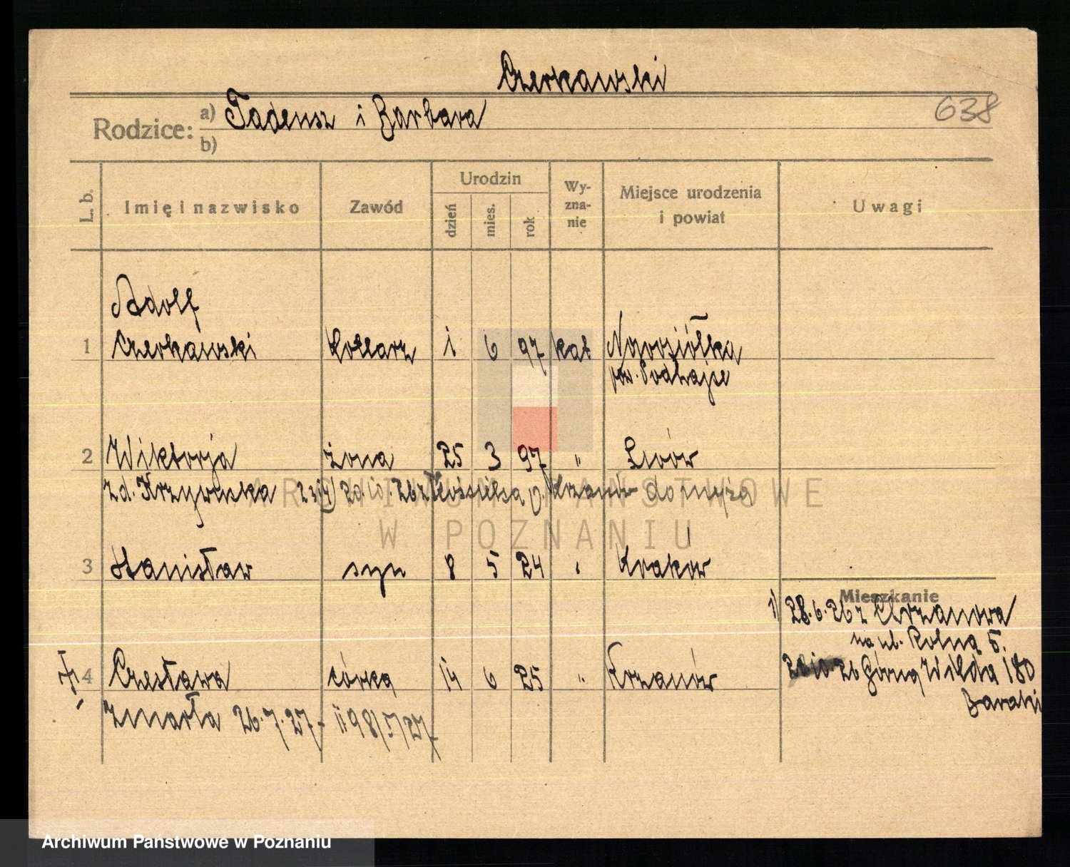 Podgląd karty osobowej dostępny jest po kliknięciu na nazwisko lub ikonkę karty. Można dokonywać powiększenia (ikony na górze) lub przechodzić między kolejnymi skanami (strzałki po bokach).