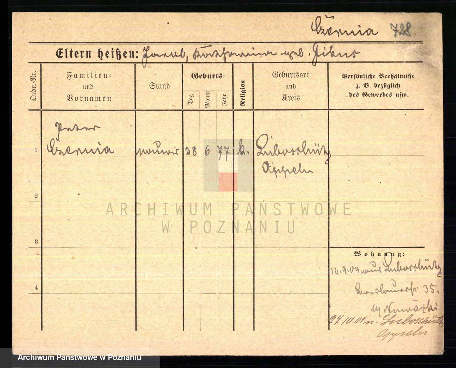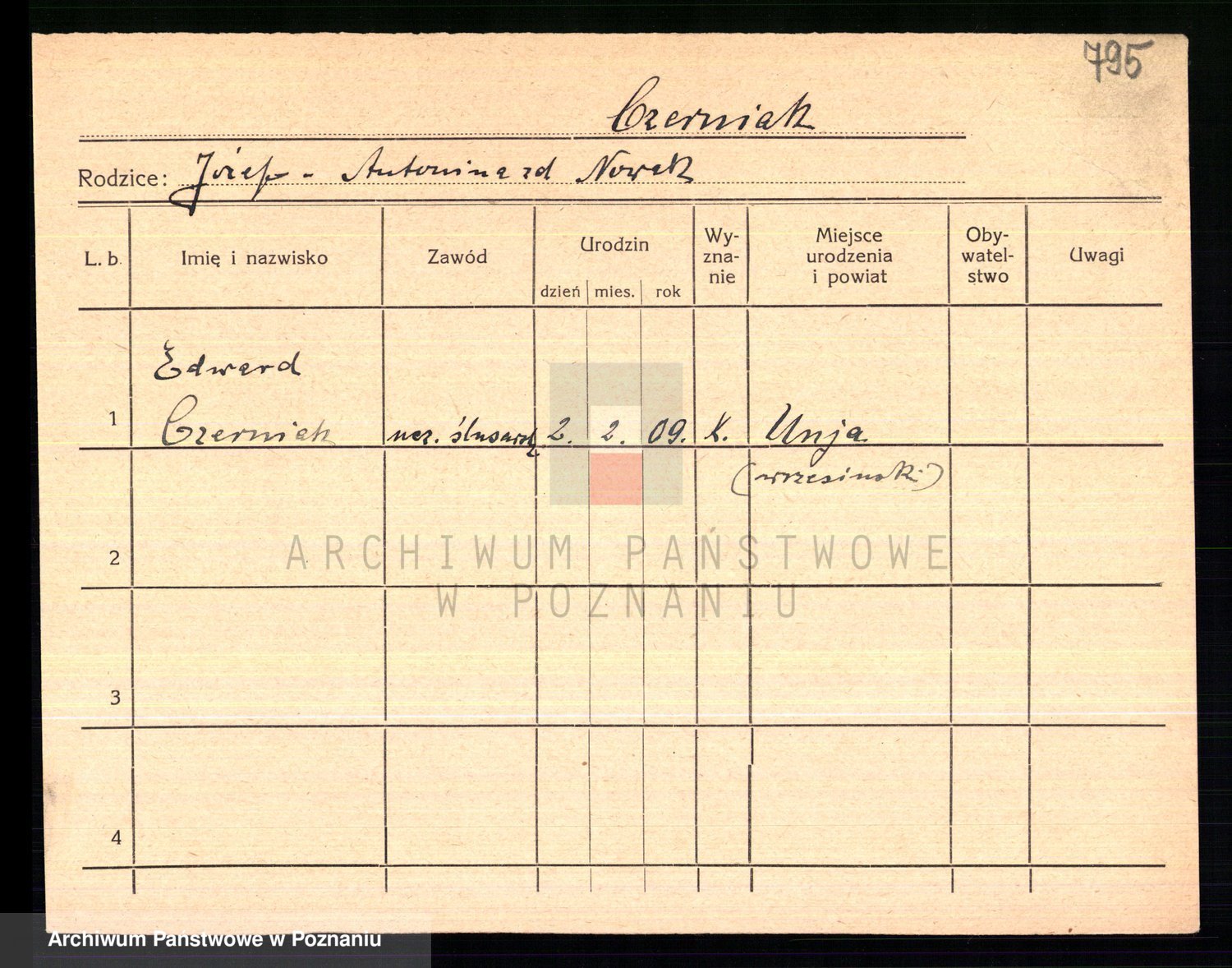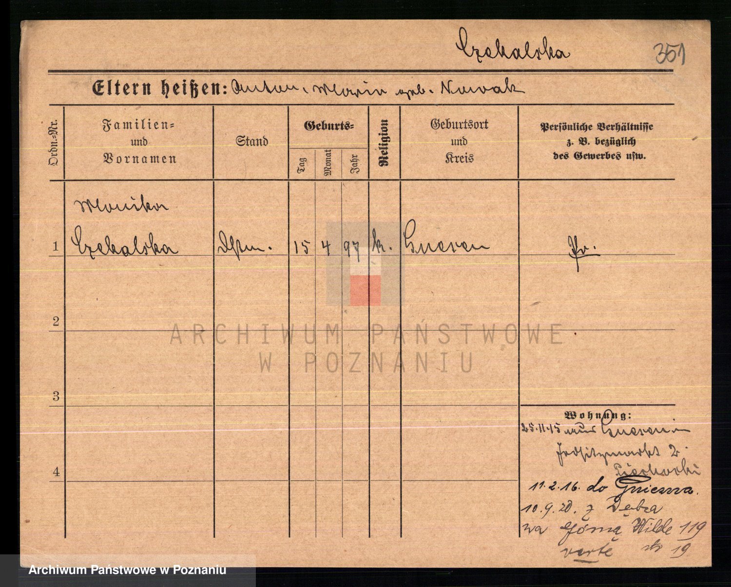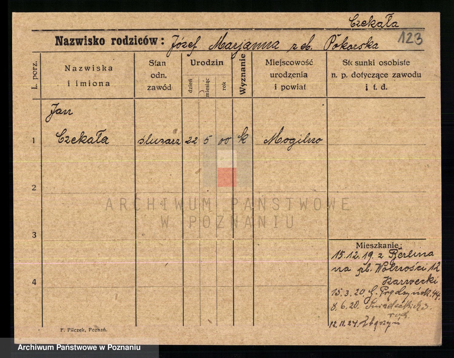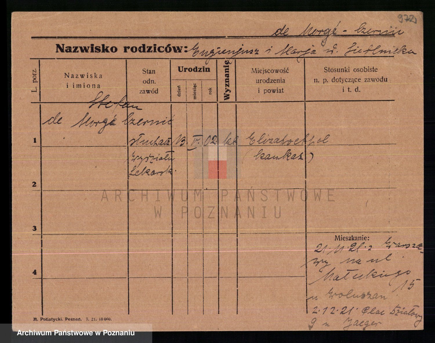 Podgląd karty osobowej dostępny jest po kliknięciu na nazwisko lub ikonkę karty. Można dokonywać powiększenia (ikony na górze) lub przechodzić między kolejnymi skanami (strzałki po bokach).