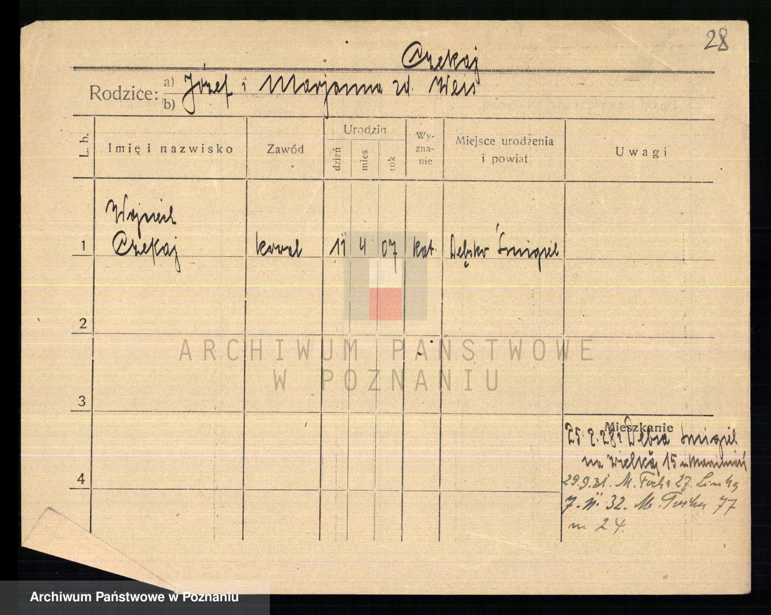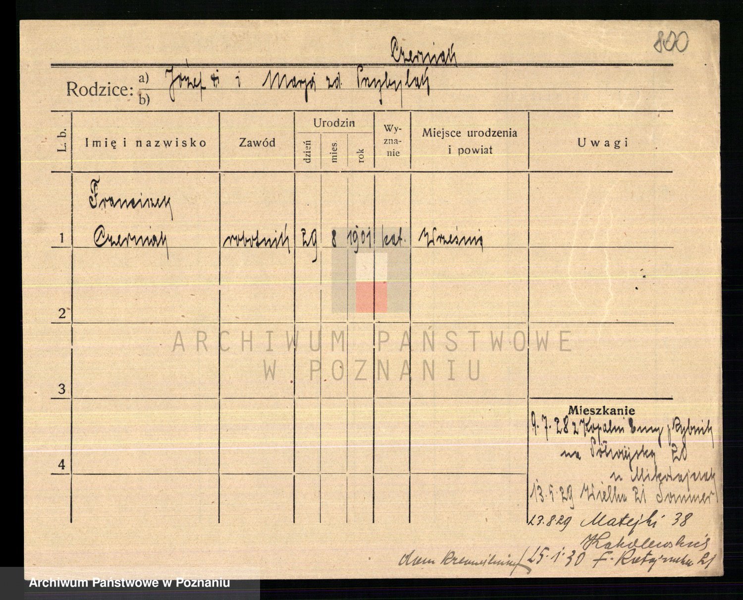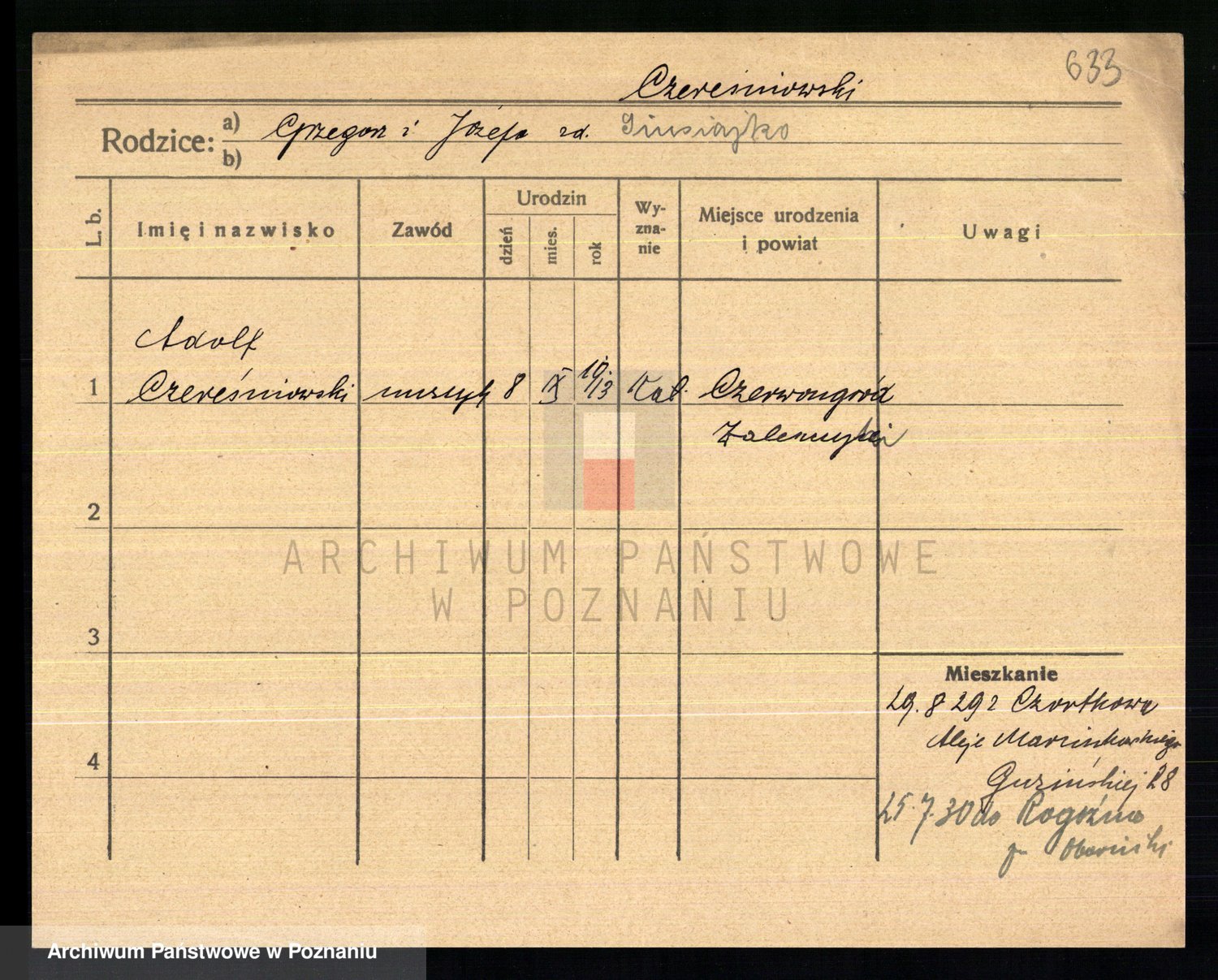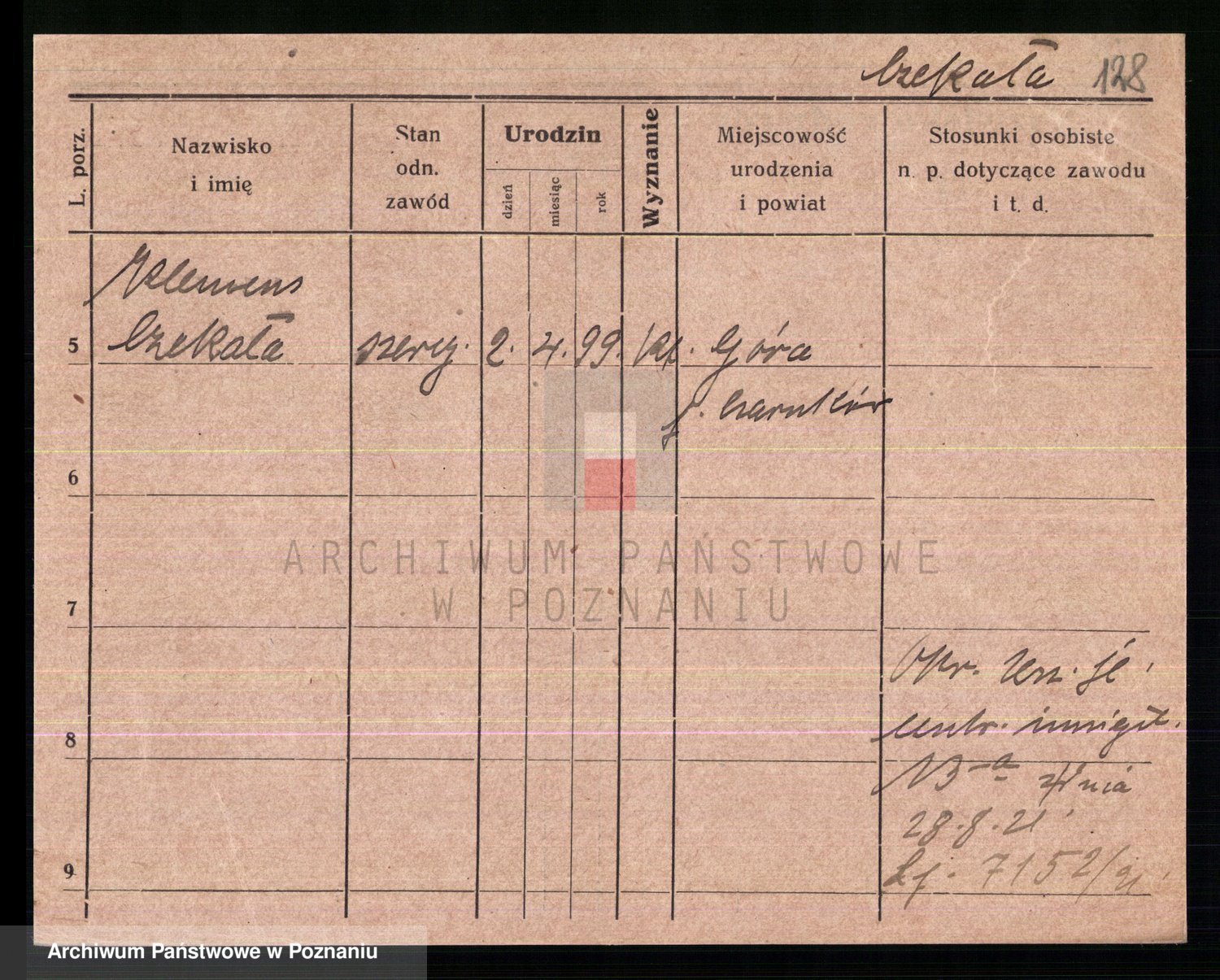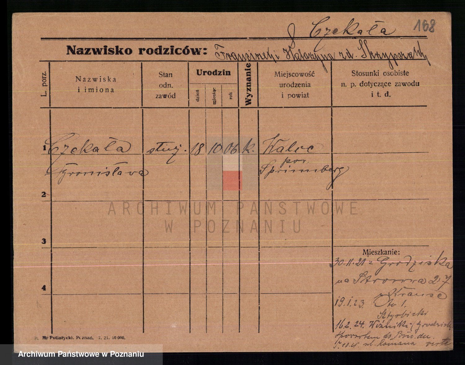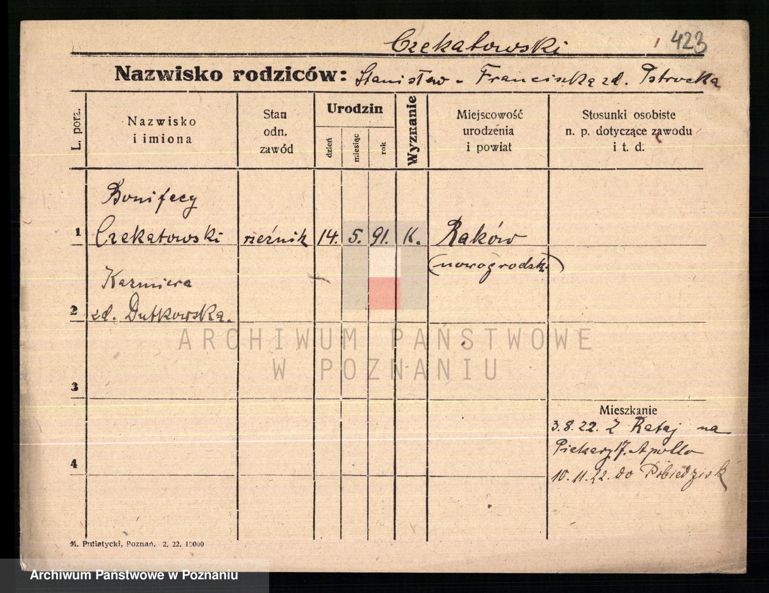 Podgląd karty osobowej dostępny jest po kliknięciu na nazwisko lub ikonkę karty. Można dokonywać powiększenia (ikony na górze) lub przechodzić między kolejnymi skanami (strzałki po bokach).