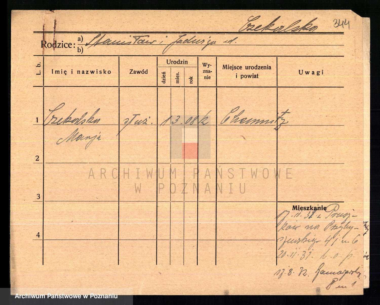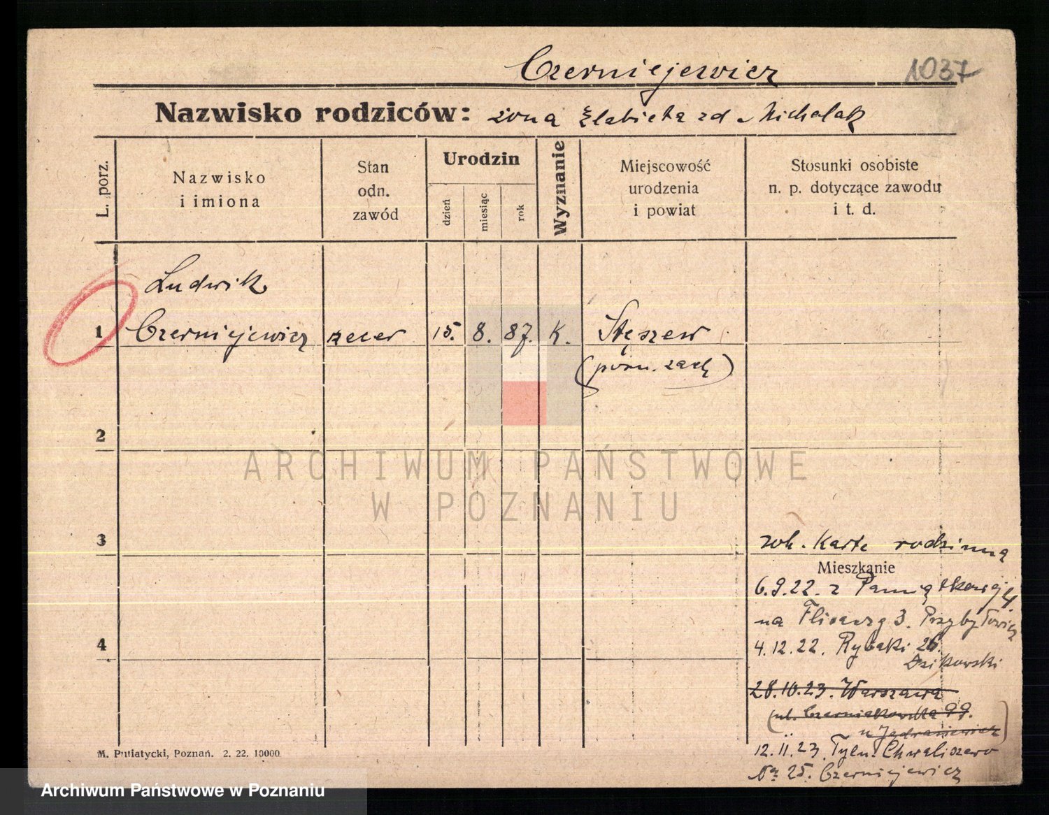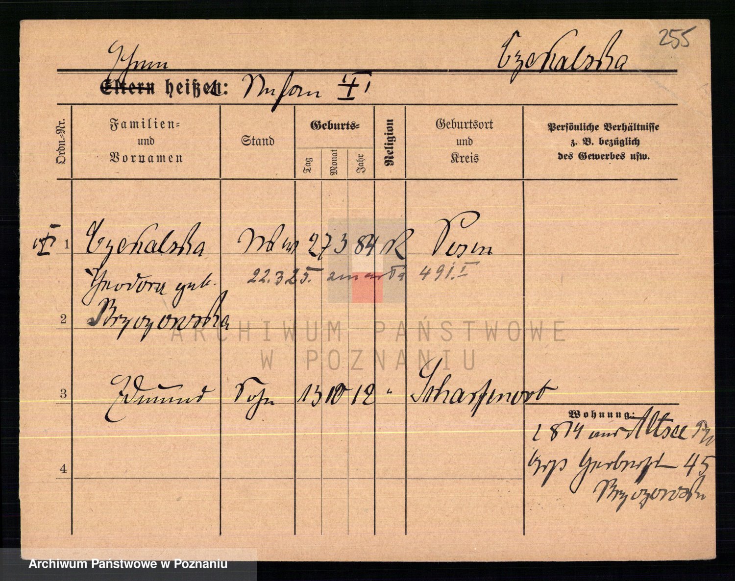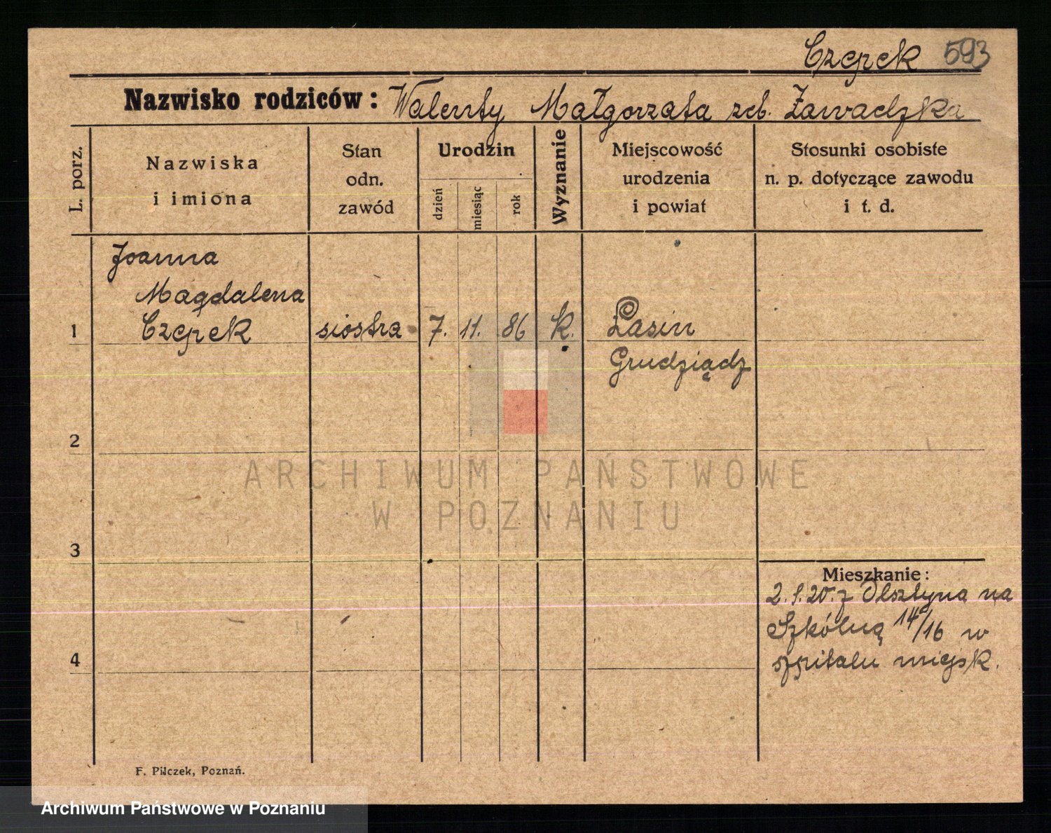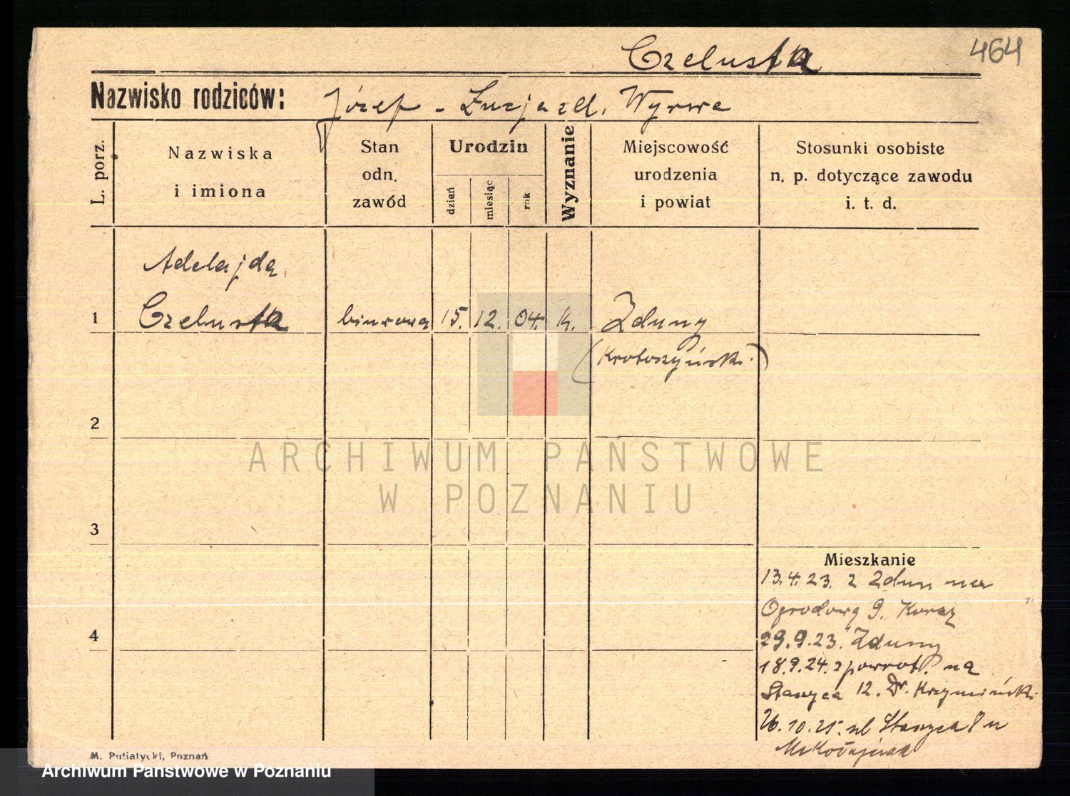Podgląd karty osobowej dostępny jest po kliknięciu na nazwisko lub ikonkę karty. Można dokonywać powiększenia (ikony na górze) lub przechodzić między kolejnymi skanami (strzałki po bokach).