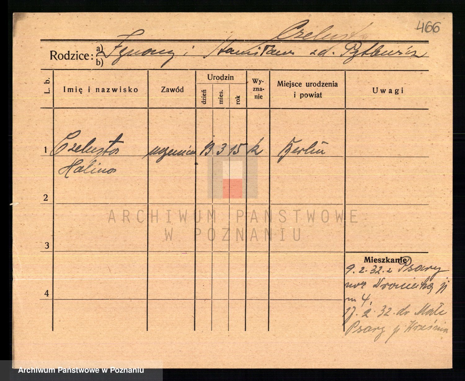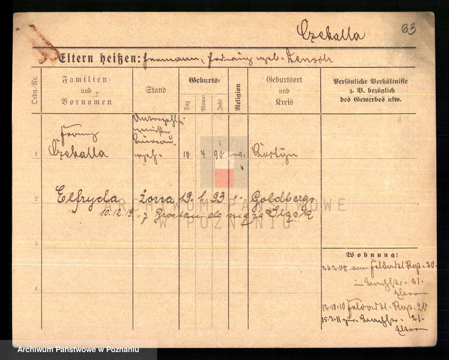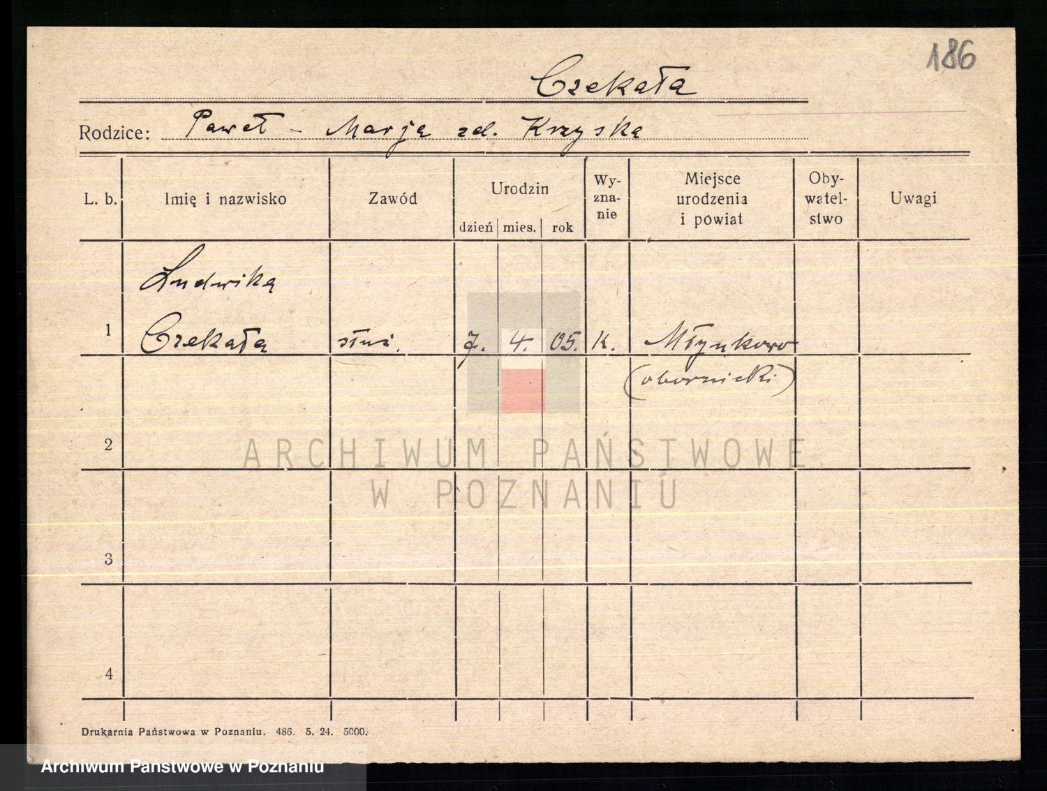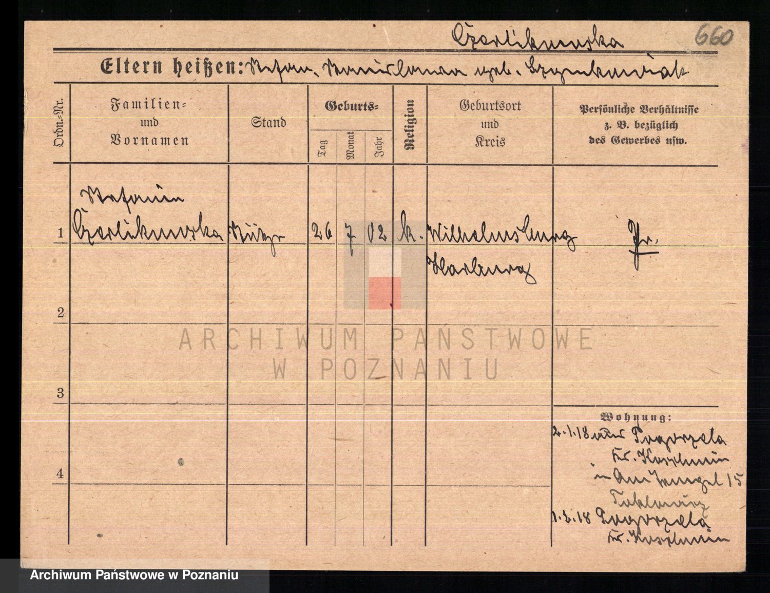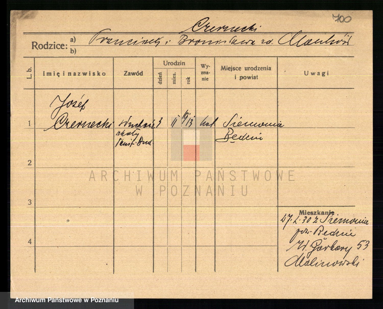 Podgląd karty osobowej dostępny jest po kliknięciu na nazwisko lub ikonkę karty. Można dokonywać powiększenia (ikony na górze) lub przechodzić między kolejnymi skanami (strzałki po bokach).