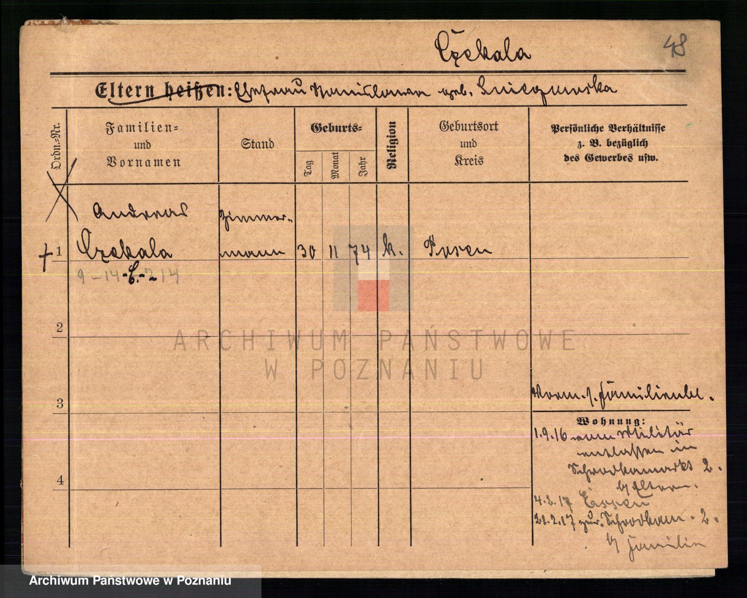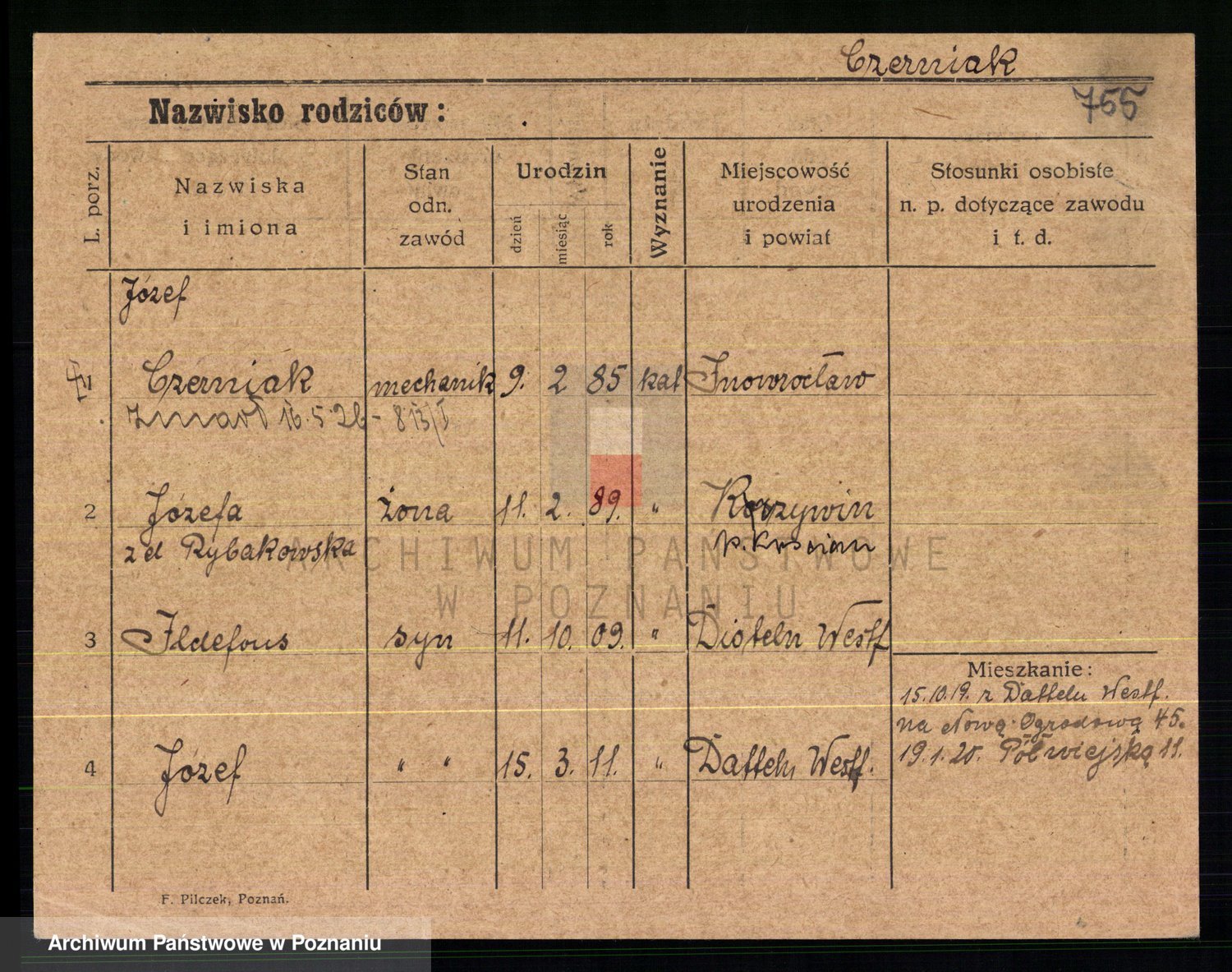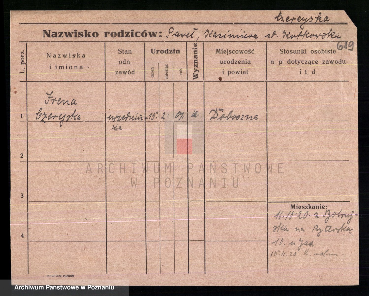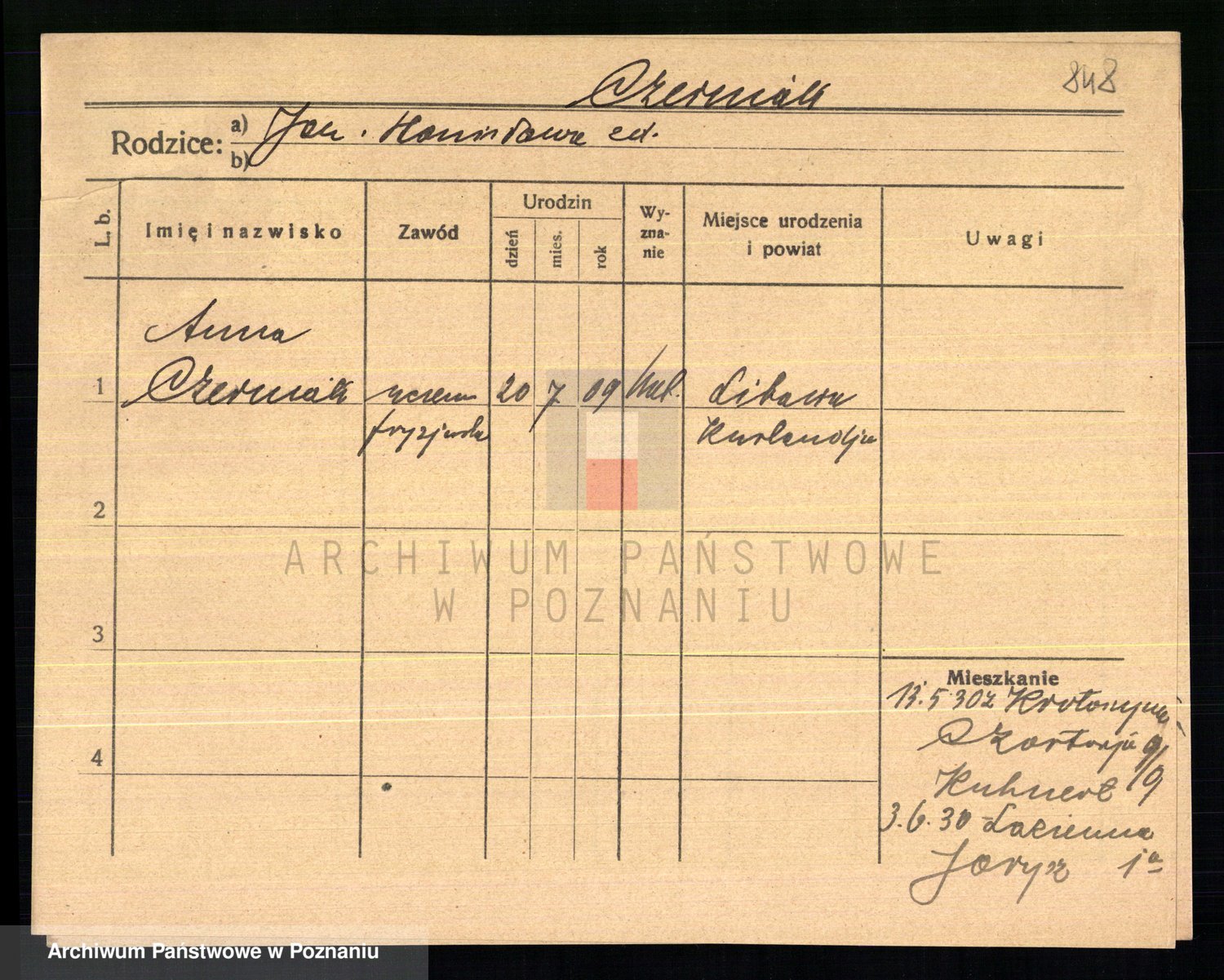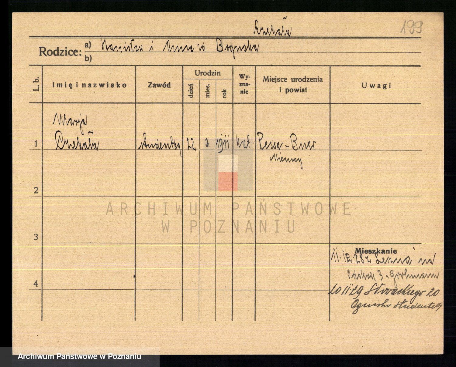 Podgląd karty osobowej dostępny jest po kliknięciu na nazwisko lub ikonkę karty. Można dokonywać powiększenia (ikony na górze) lub przechodzić między kolejnymi skanami (strzałki po bokach).