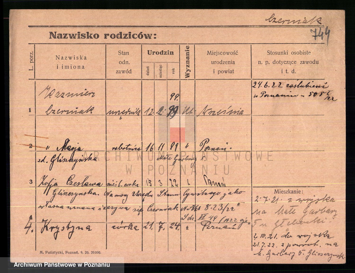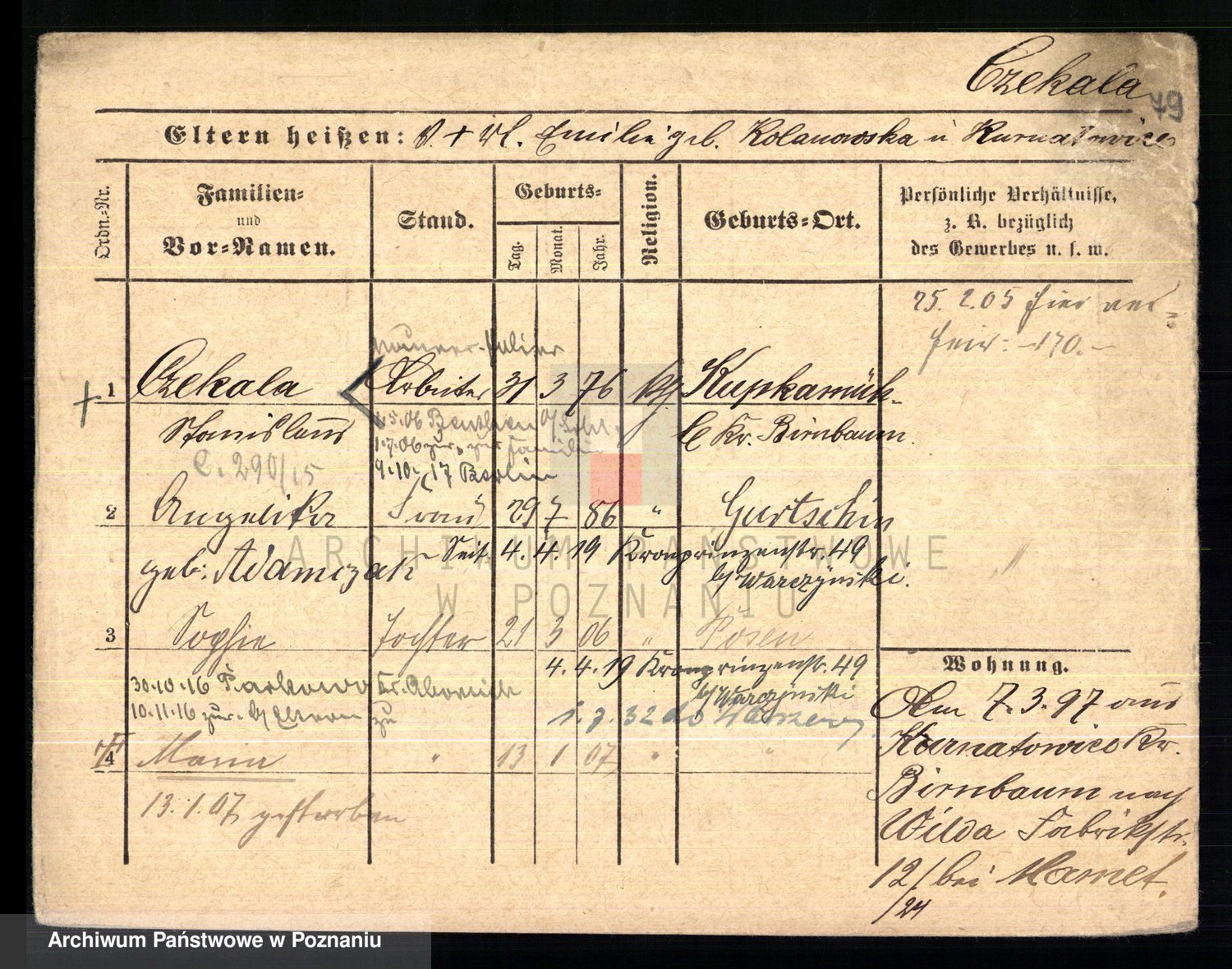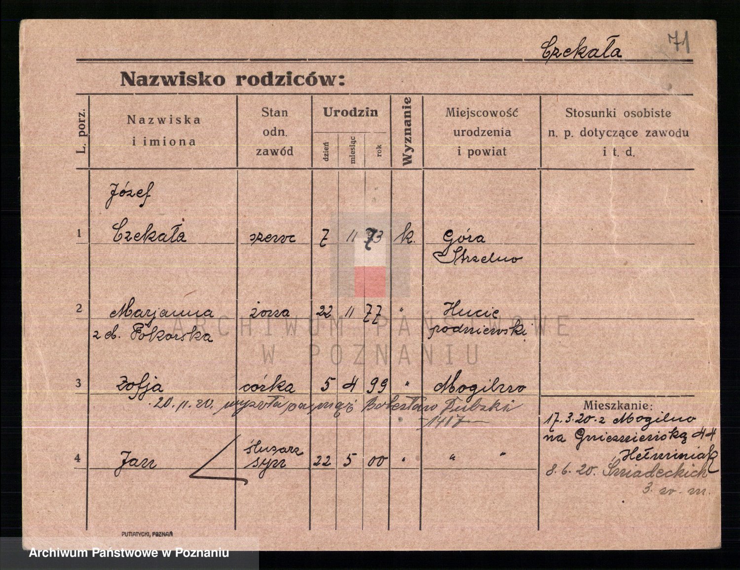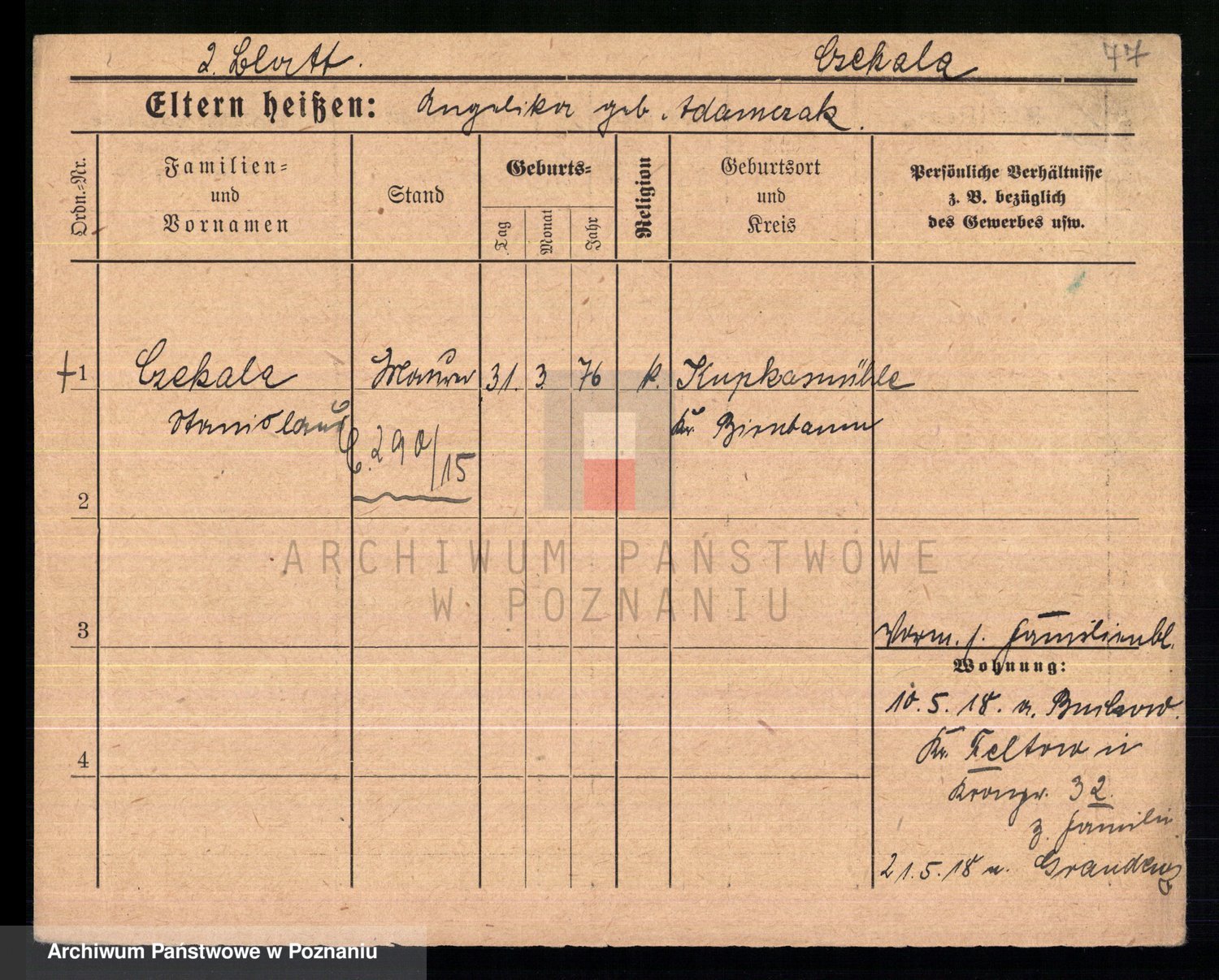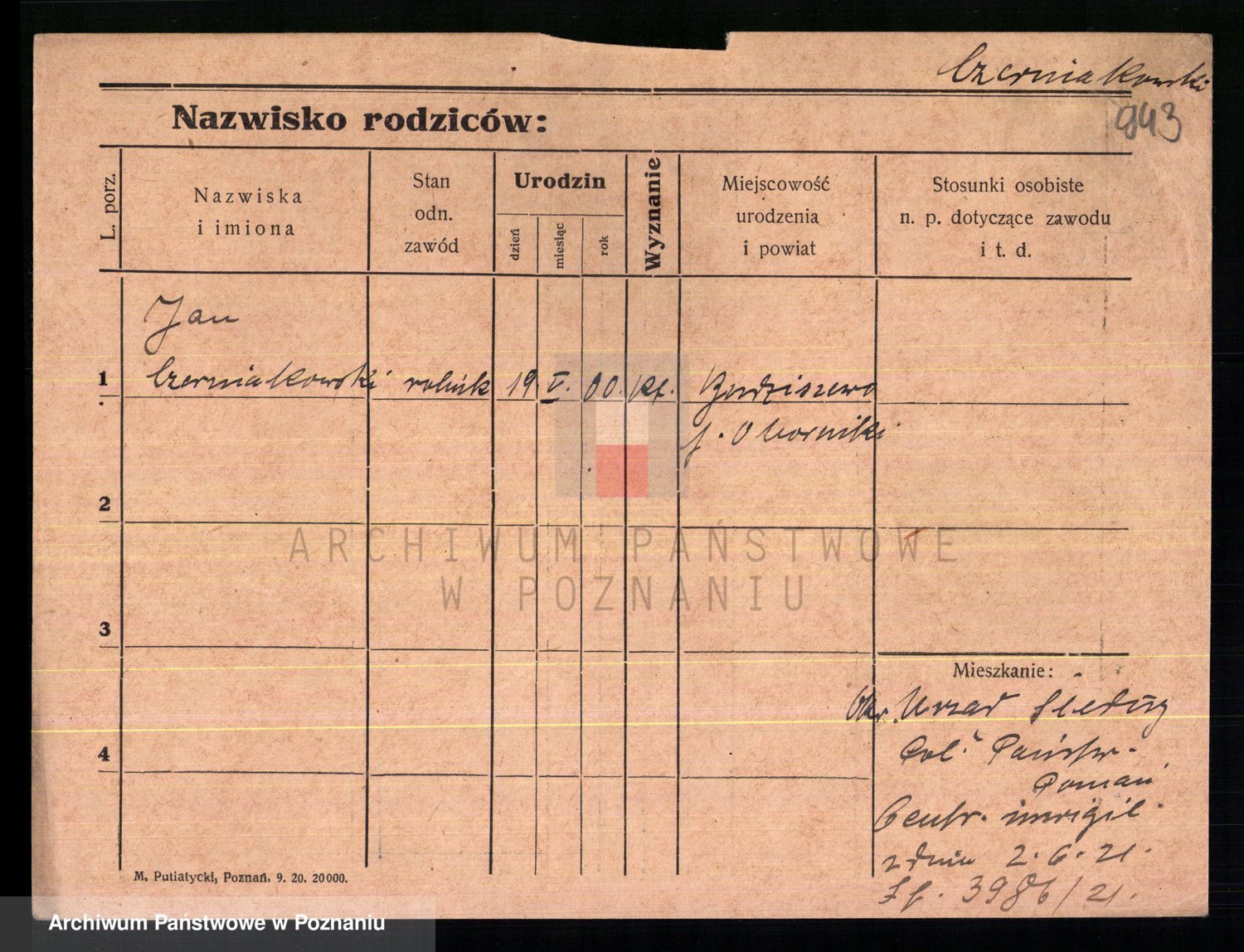 Podgląd karty osobowej dostępny jest po kliknięciu na nazwisko lub ikonkę karty. Można dokonywać powiększenia (ikony na górze) lub przechodzić między kolejnymi skanami (strzałki po bokach).