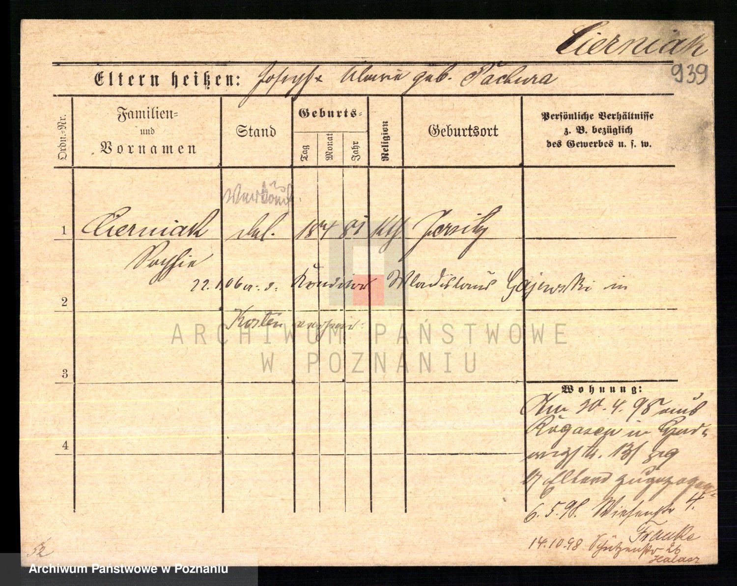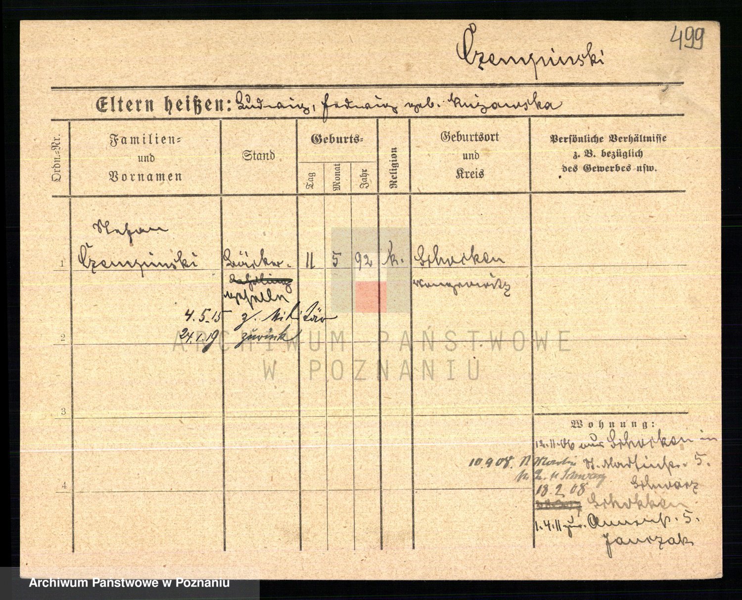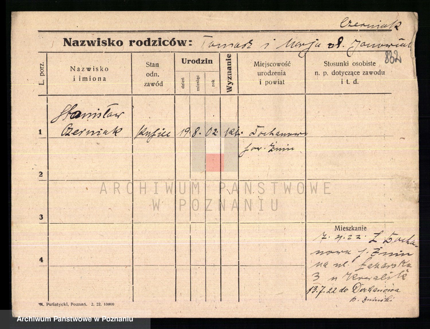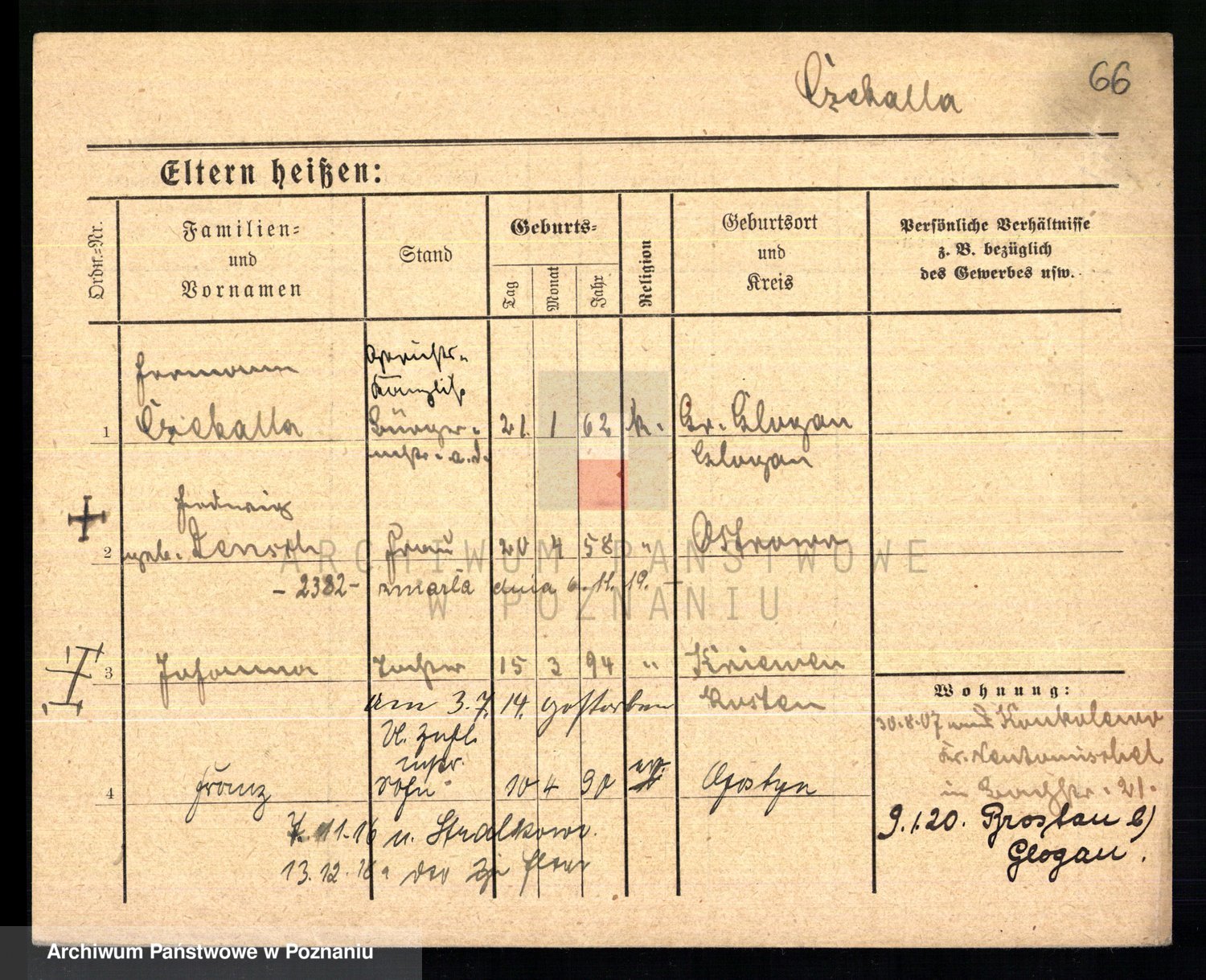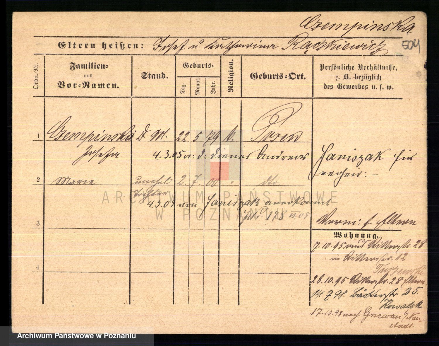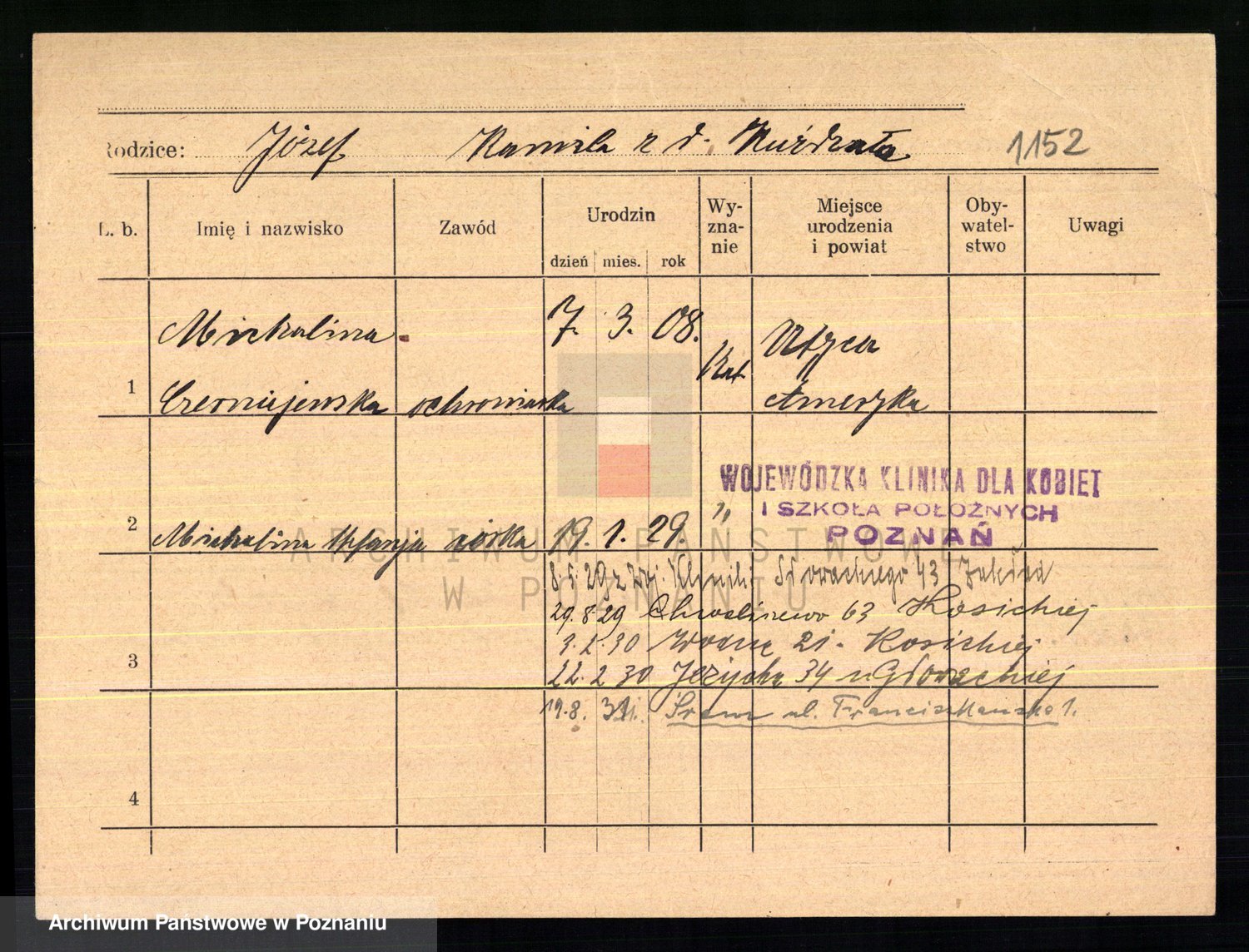 Podgląd karty osobowej dostępny jest po kliknięciu na nazwisko lub ikonkę karty. Można dokonywać powiększenia (ikony na górze) lub przechodzić między kolejnymi skanami (strzałki po bokach).