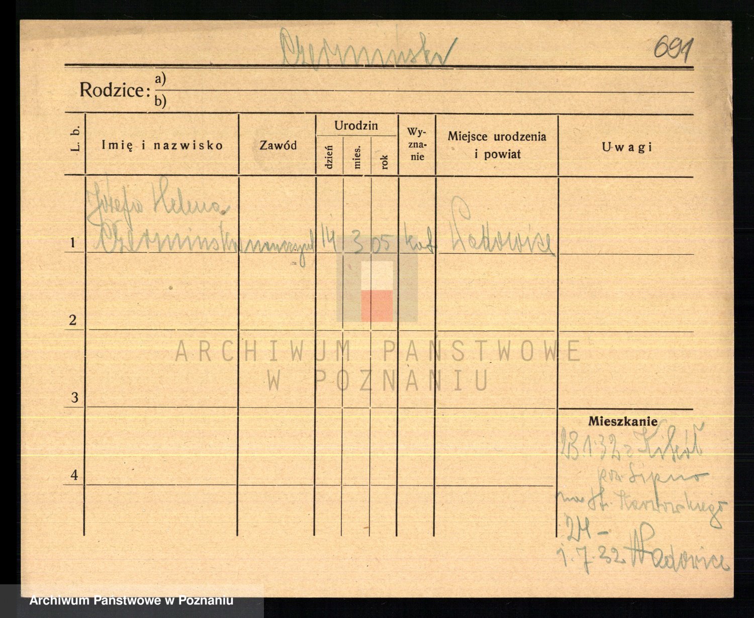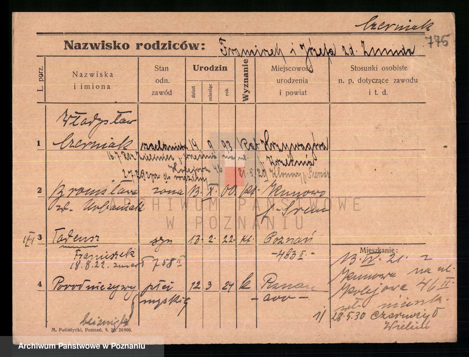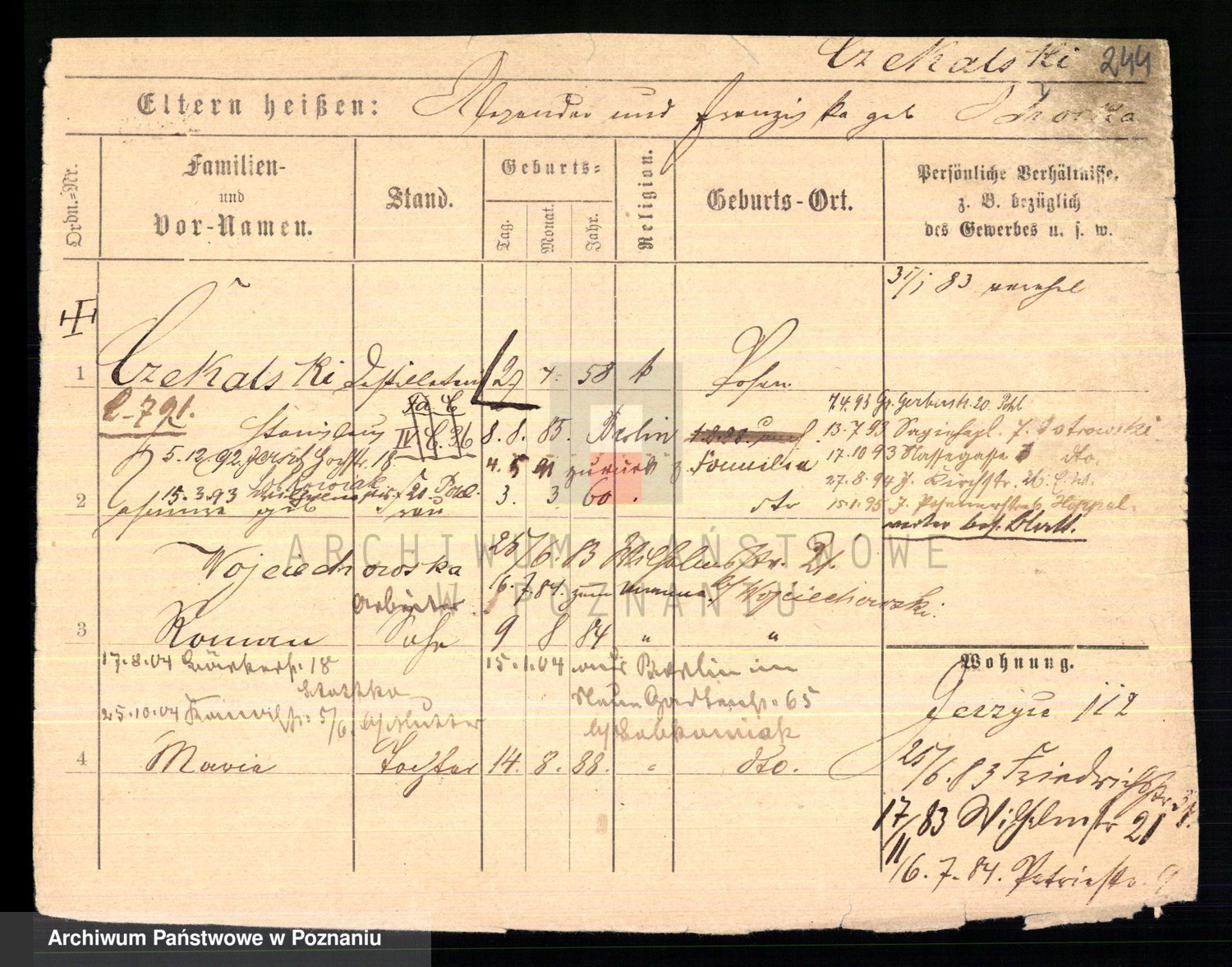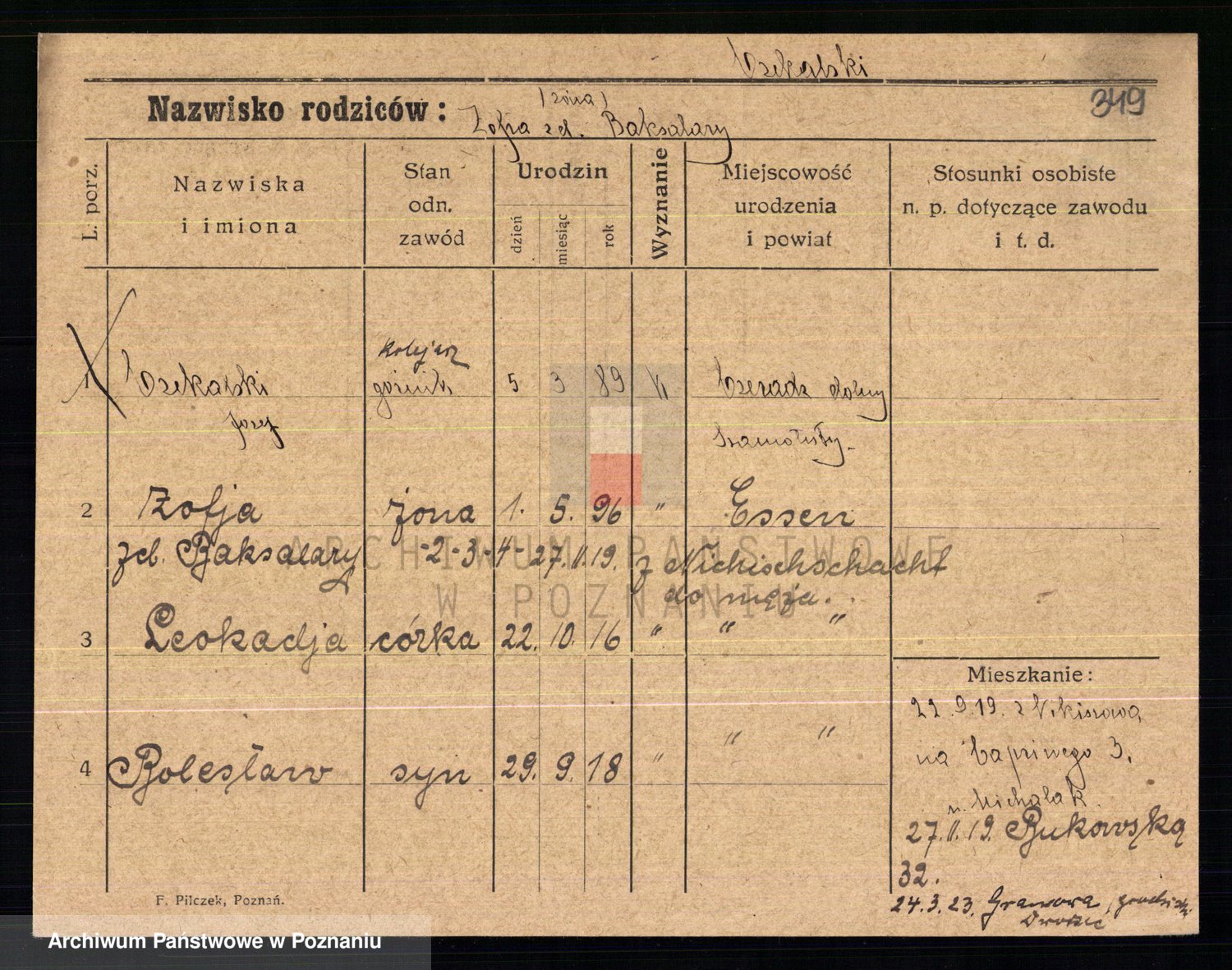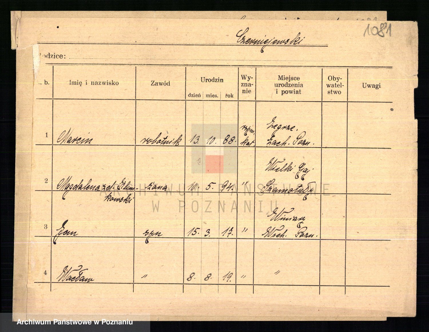 Podgląd karty osobowej dostępny jest po kliknięciu na nazwisko lub ikonkę karty. Można dokonywać powiększenia (ikony na górze) lub przechodzić między kolejnymi skanami (strzałki po bokach).