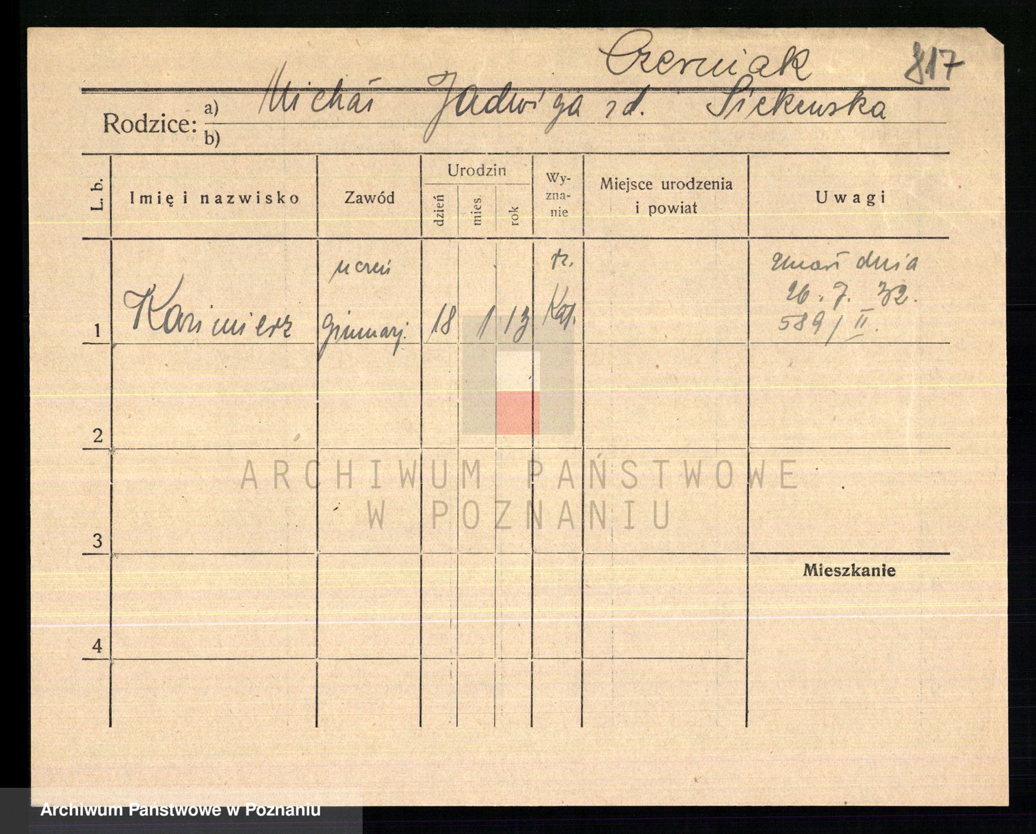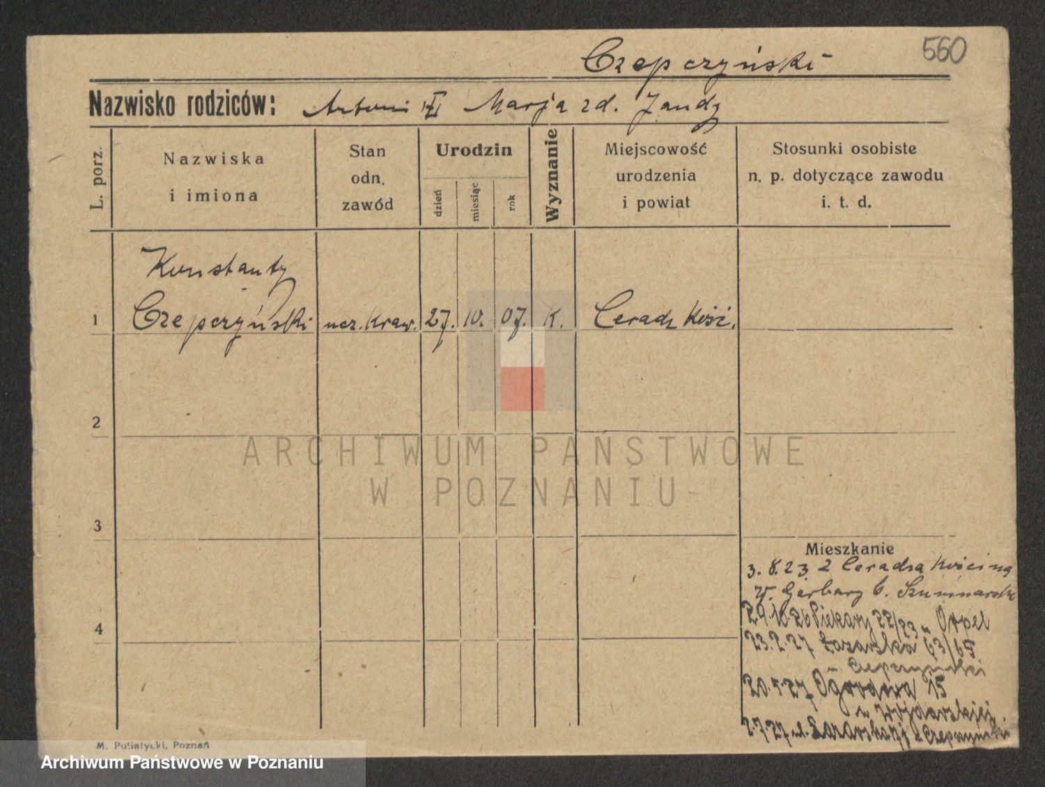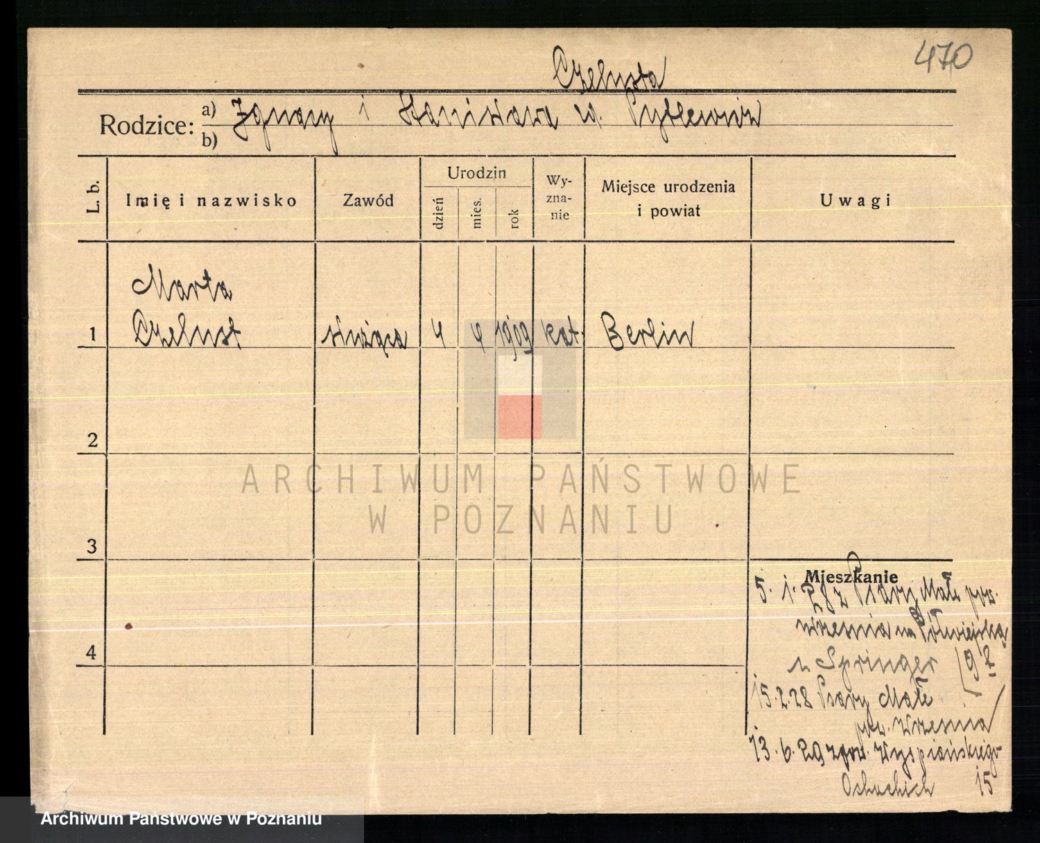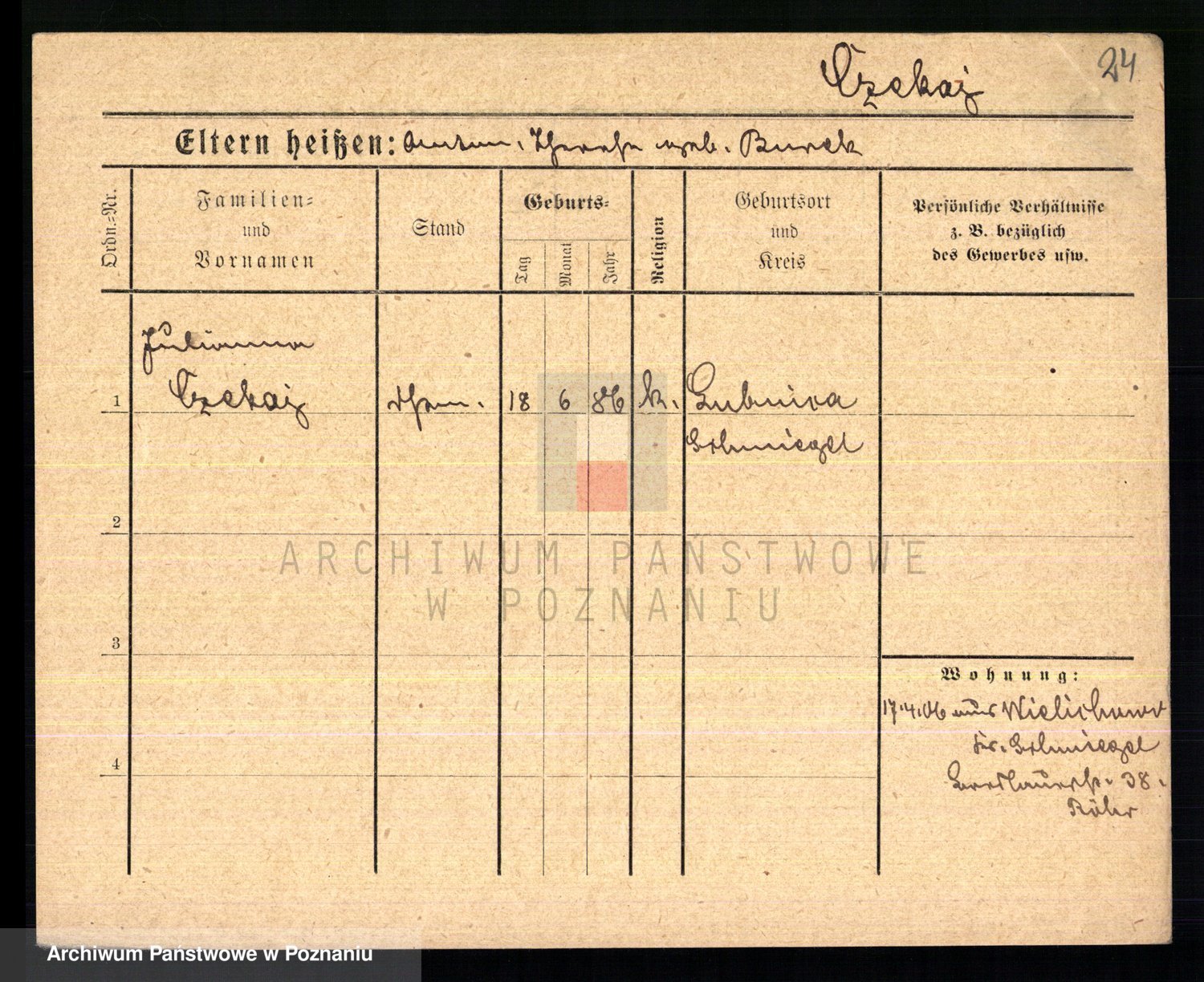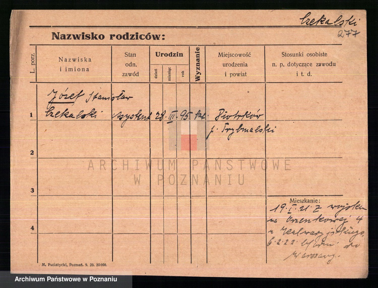 Podgląd karty osobowej dostępny jest po kliknięciu na nazwisko lub ikonkę karty. Można dokonywać powiększenia (ikony na górze) lub przechodzić między kolejnymi skanami (strzałki po bokach).