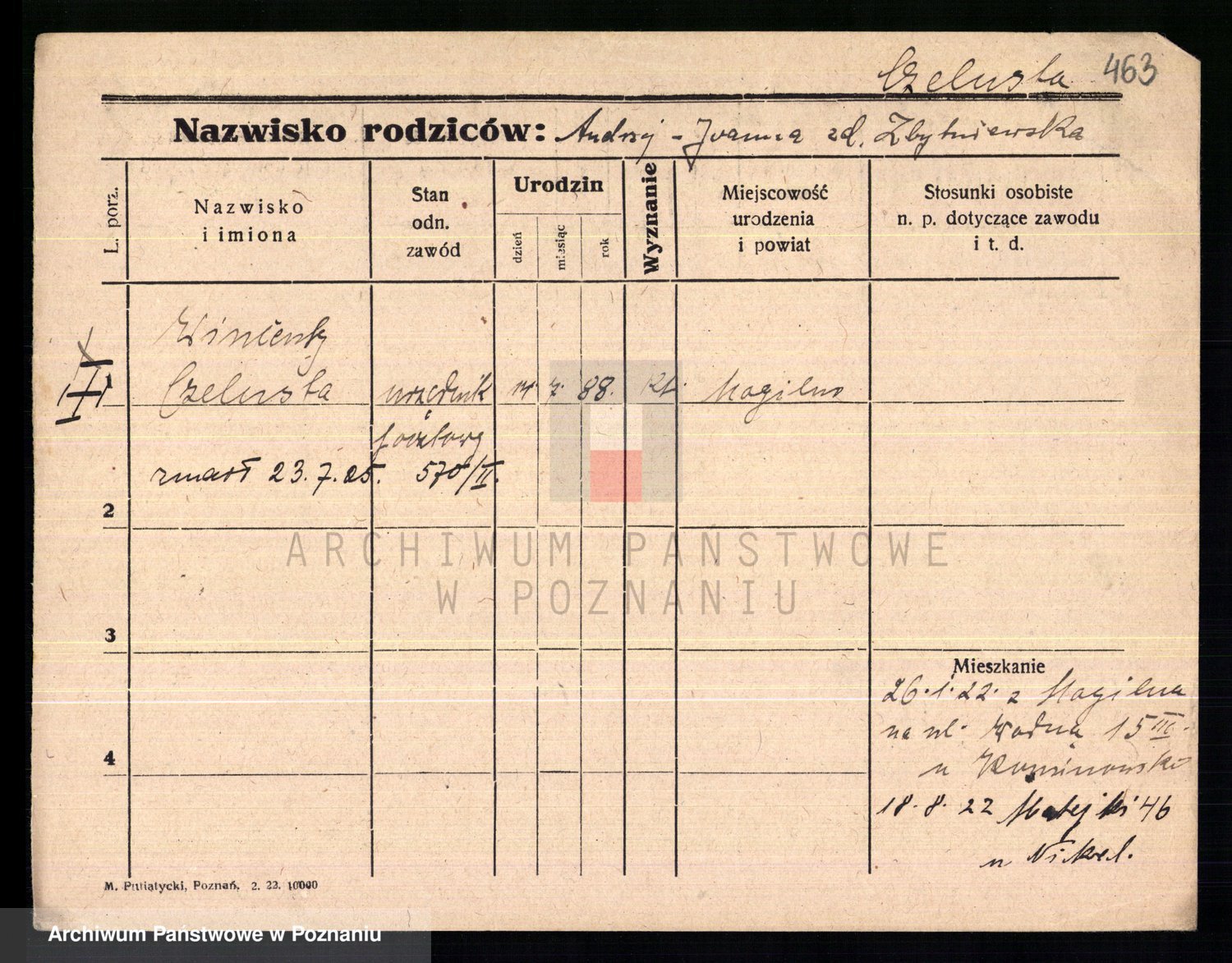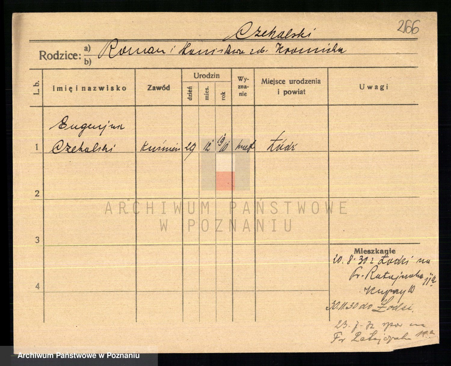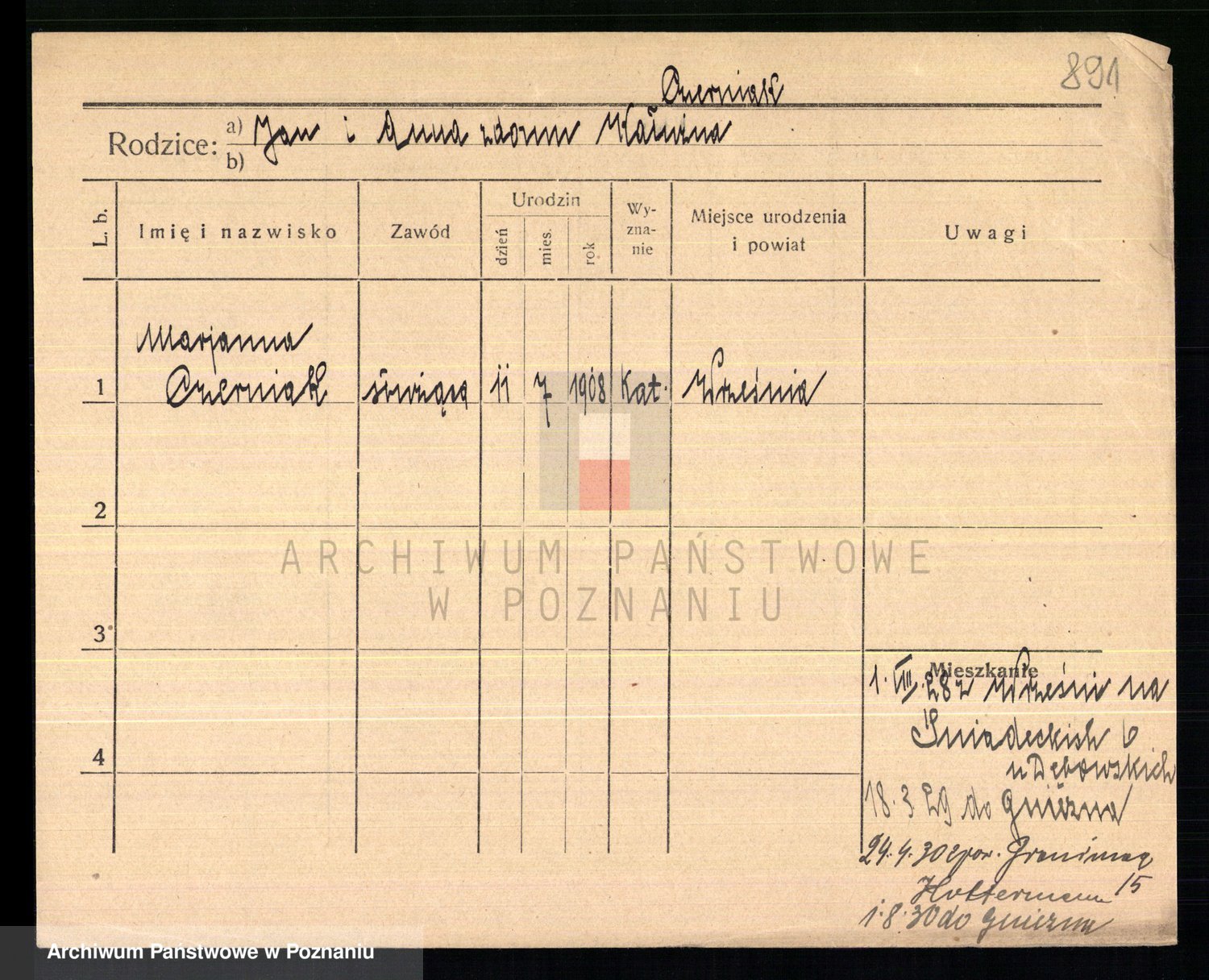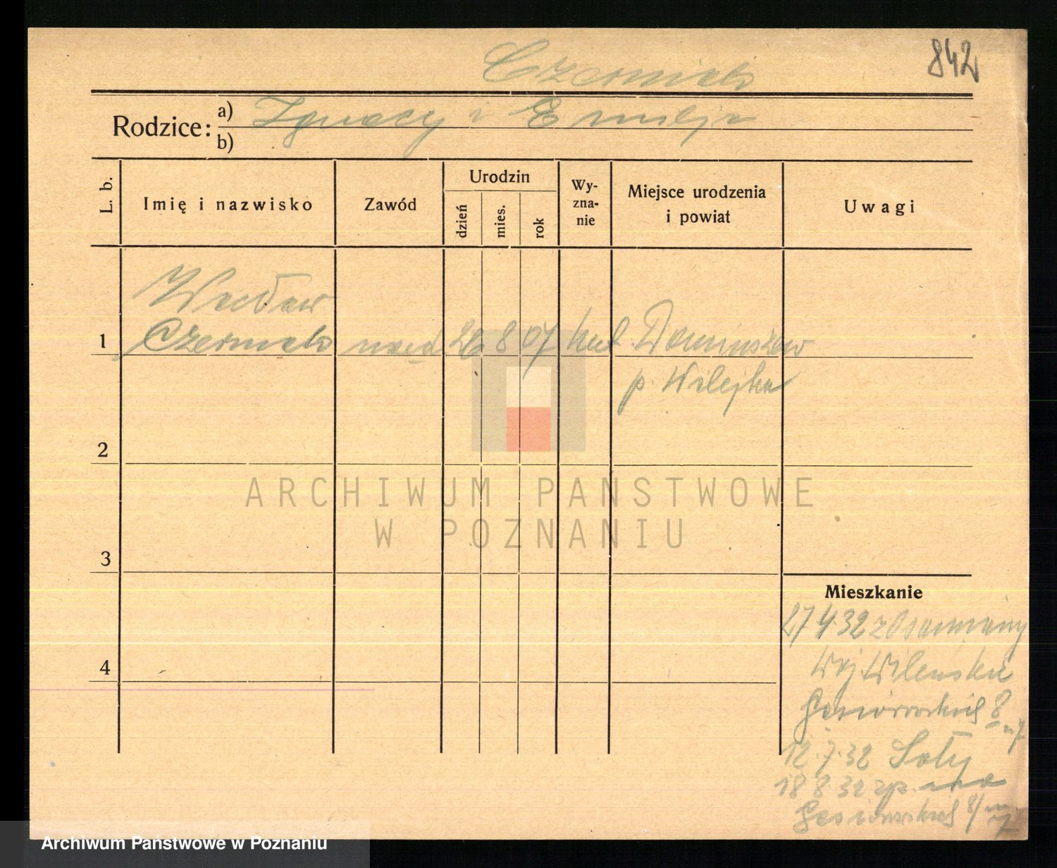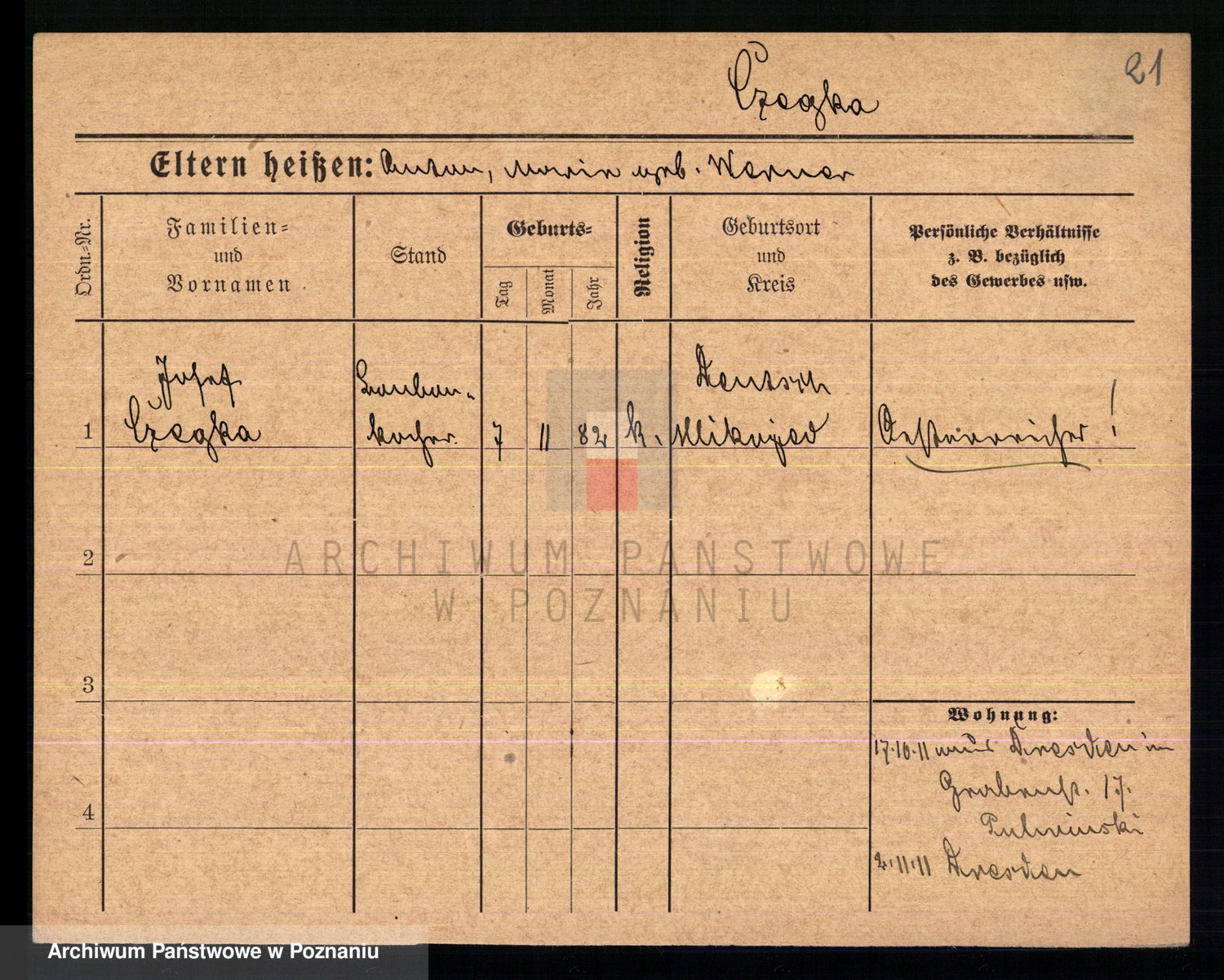Podgląd karty osobowej dostępny jest po kliknięciu na nazwisko lub ikonkę karty. Można dokonywać powiększenia (ikony na górze) lub przechodzić między kolejnymi skanami (strzałki po bokach).