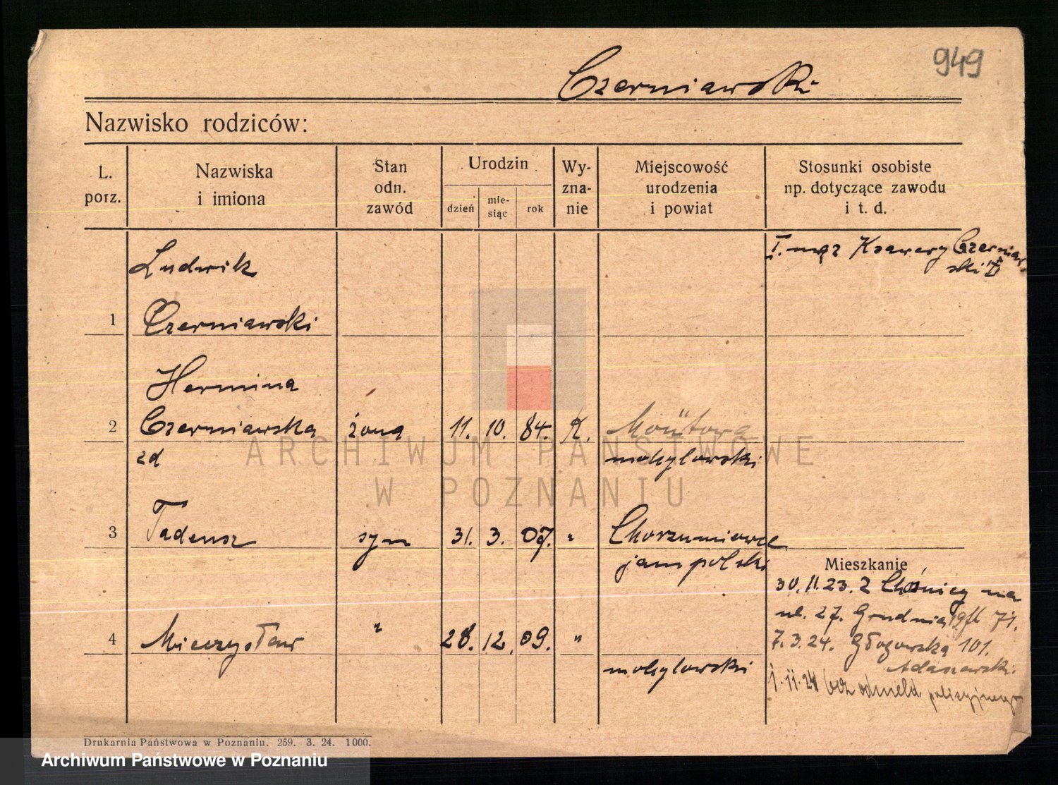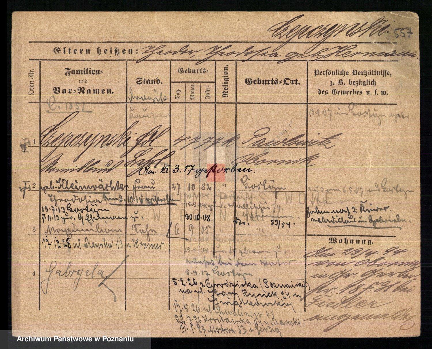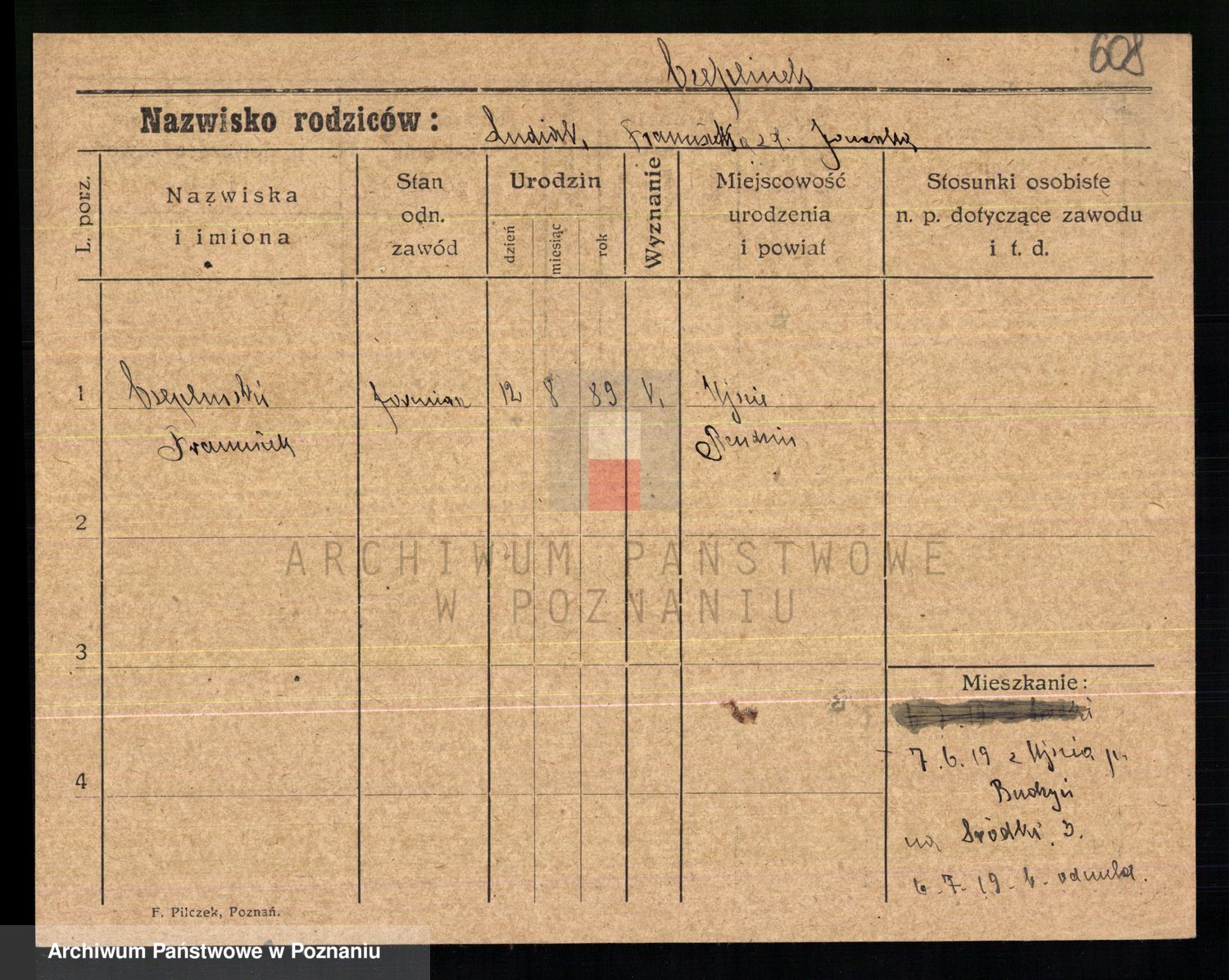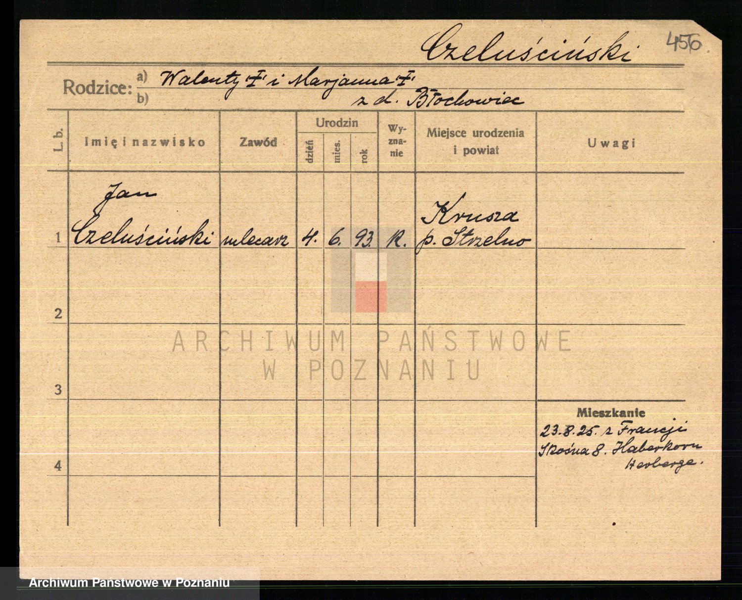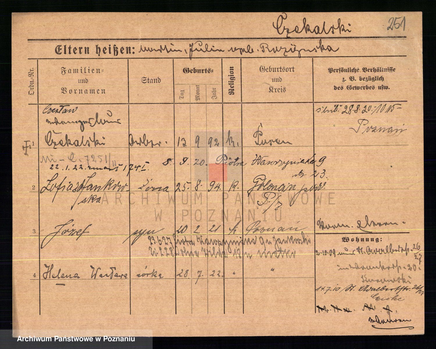 Podgląd karty osobowej dostępny jest po kliknięciu na nazwisko lub ikonkę karty. Można dokonywać powiększenia (ikony na górze) lub przechodzić między kolejnymi skanami (strzałki po bokach).