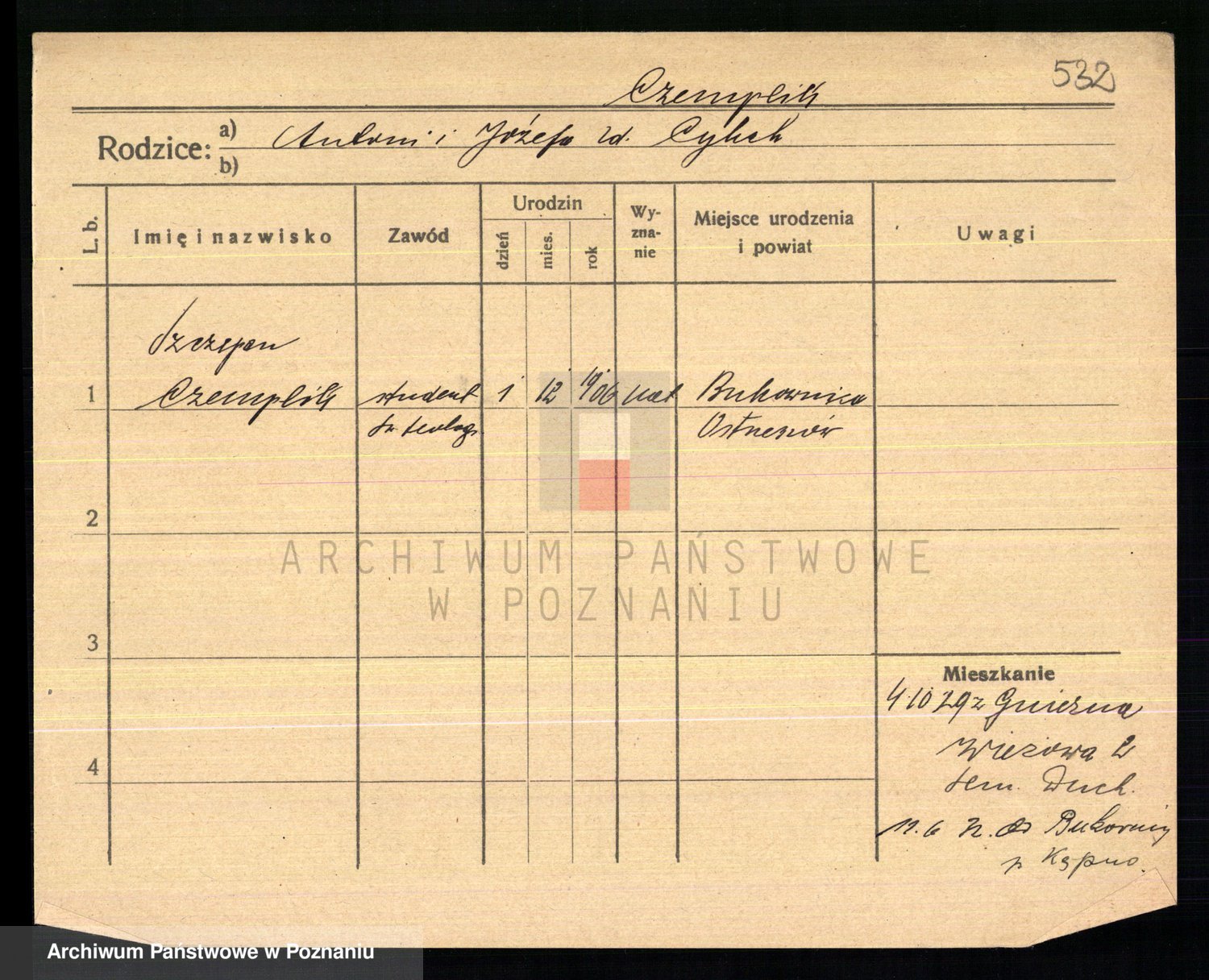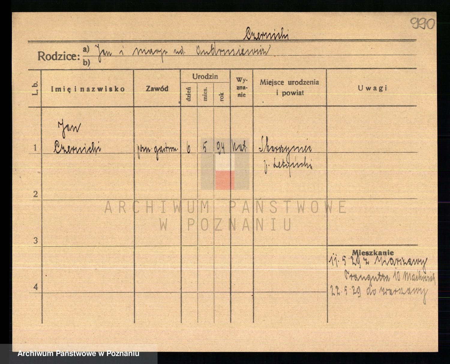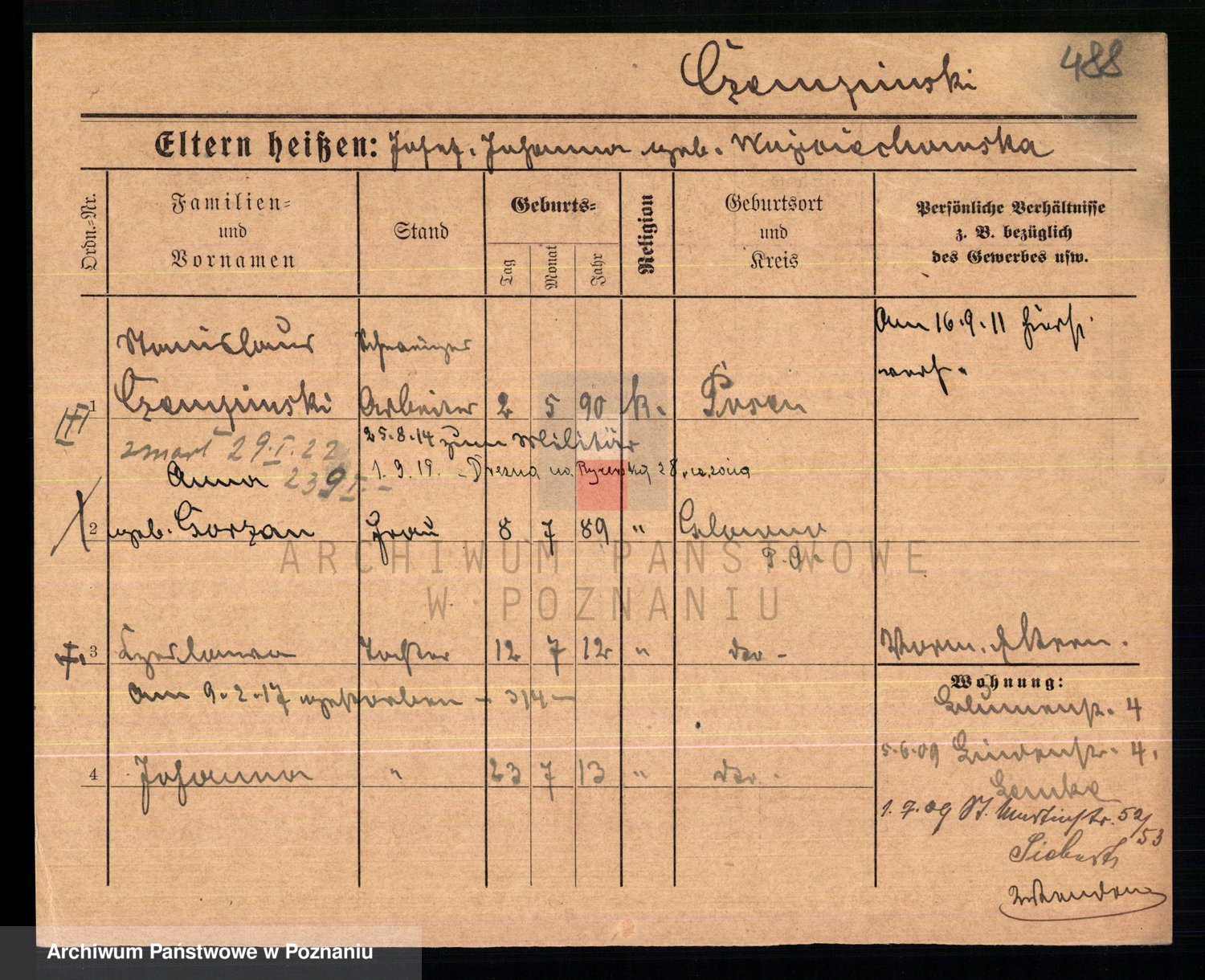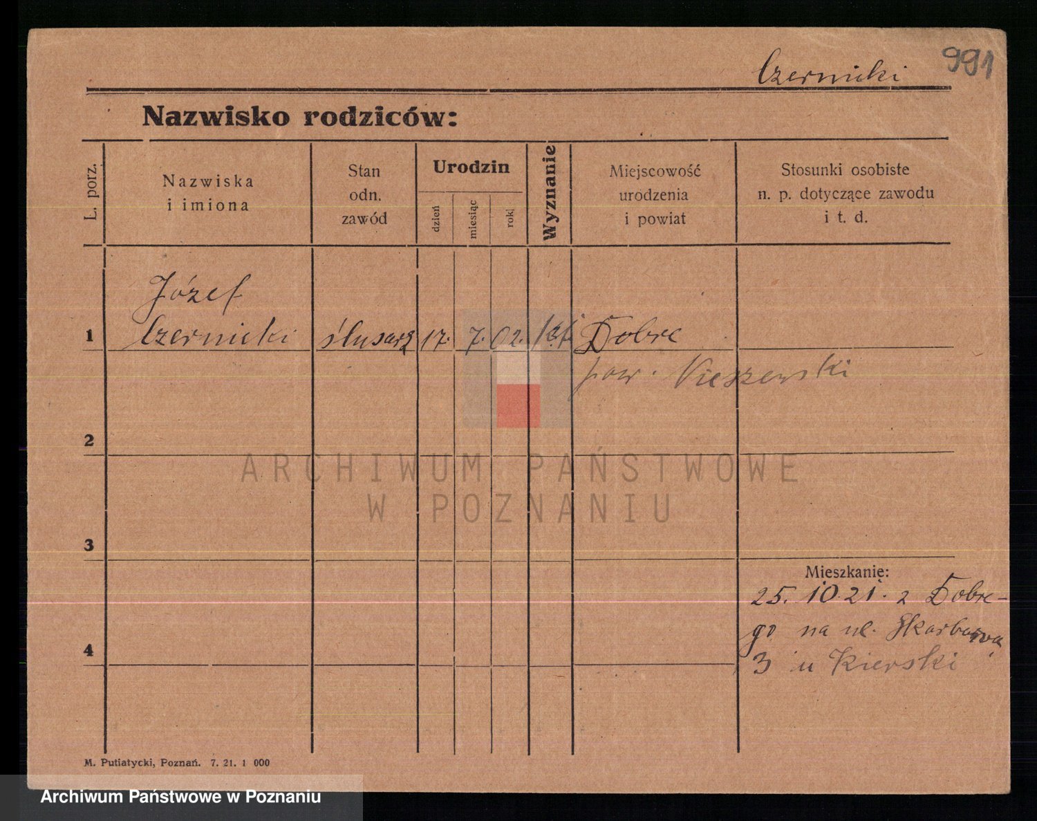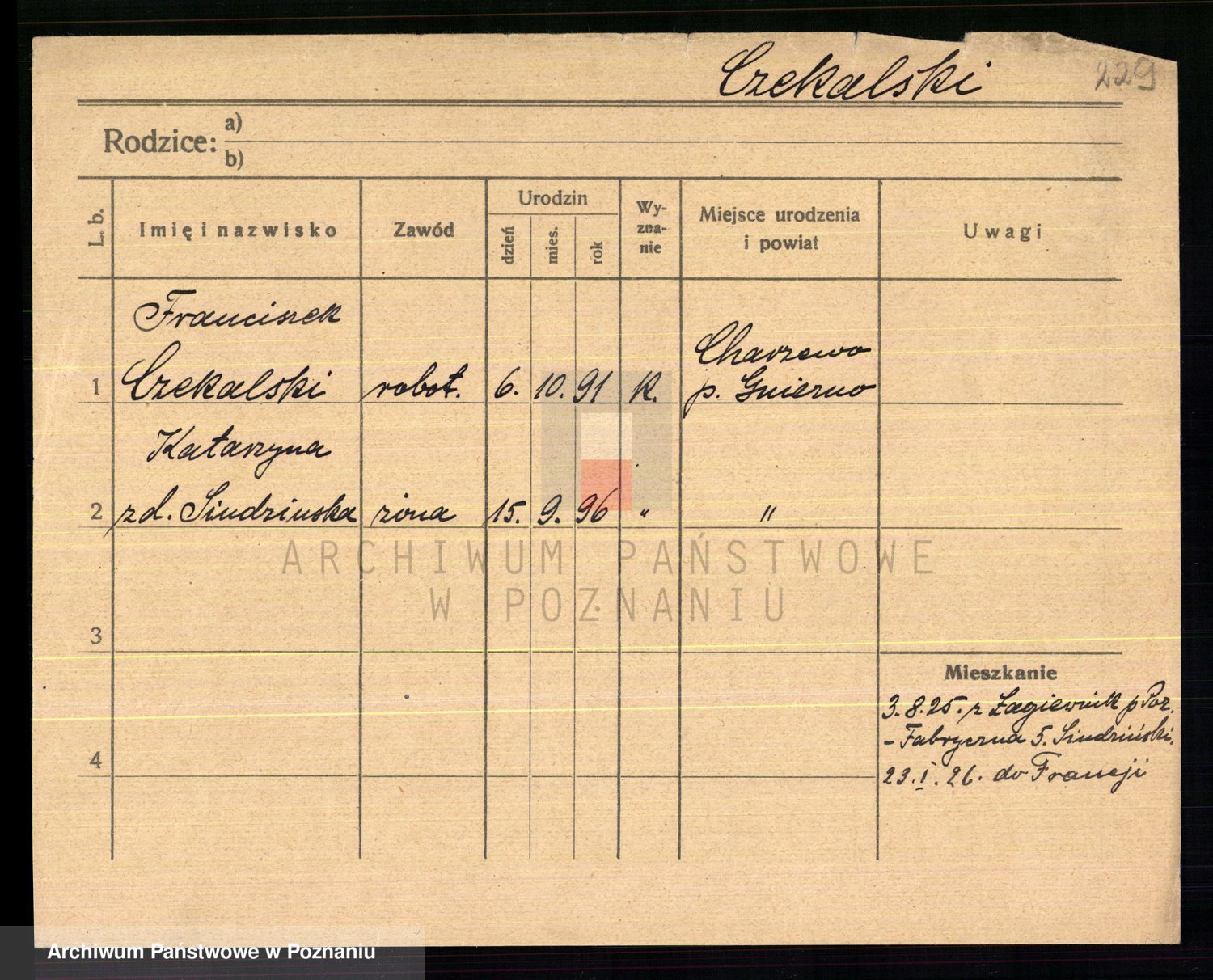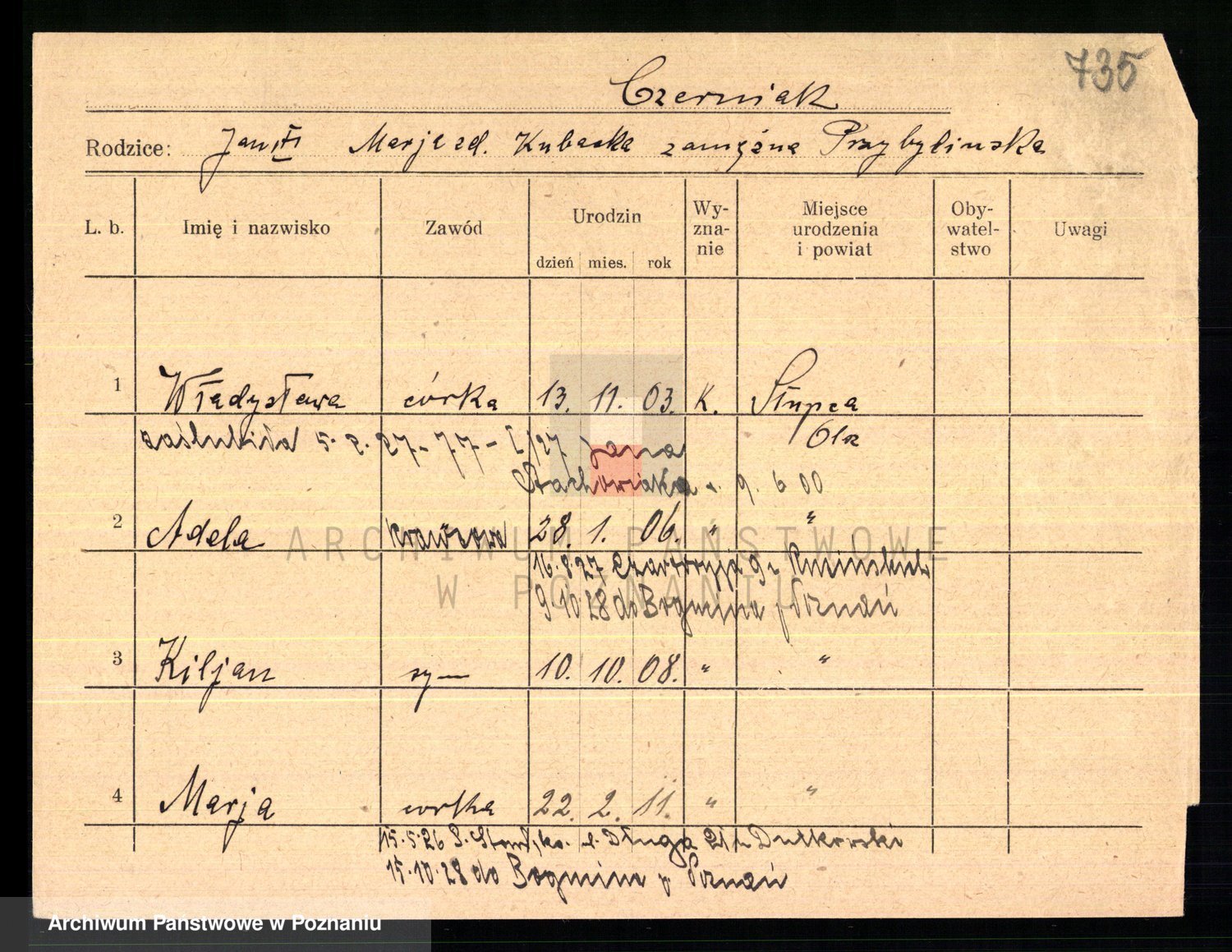 Podgląd karty osobowej dostępny jest po kliknięciu na nazwisko lub ikonkę karty. Można dokonywać powiększenia (ikony na górze) lub przechodzić między kolejnymi skanami (strzałki po bokach).