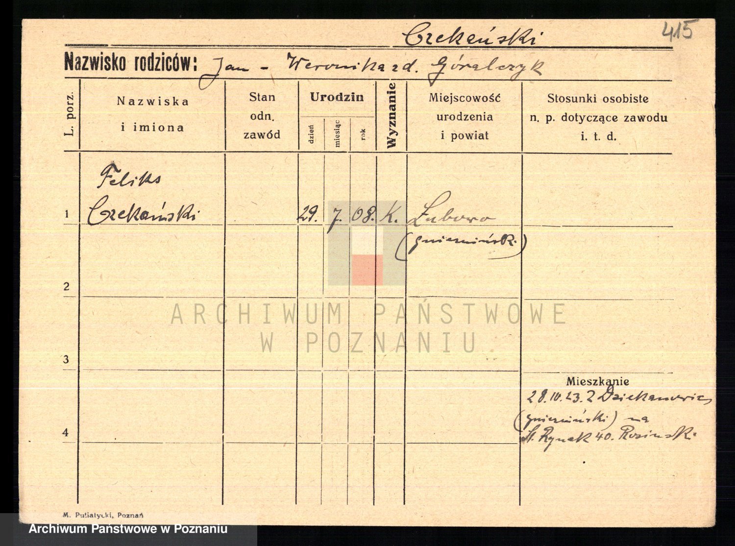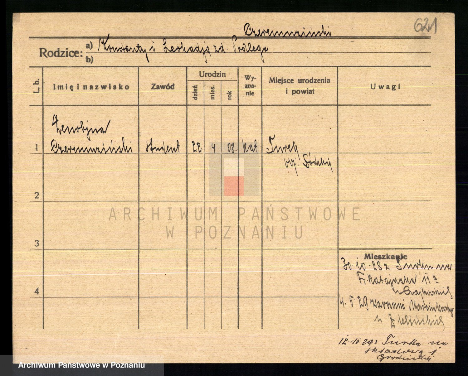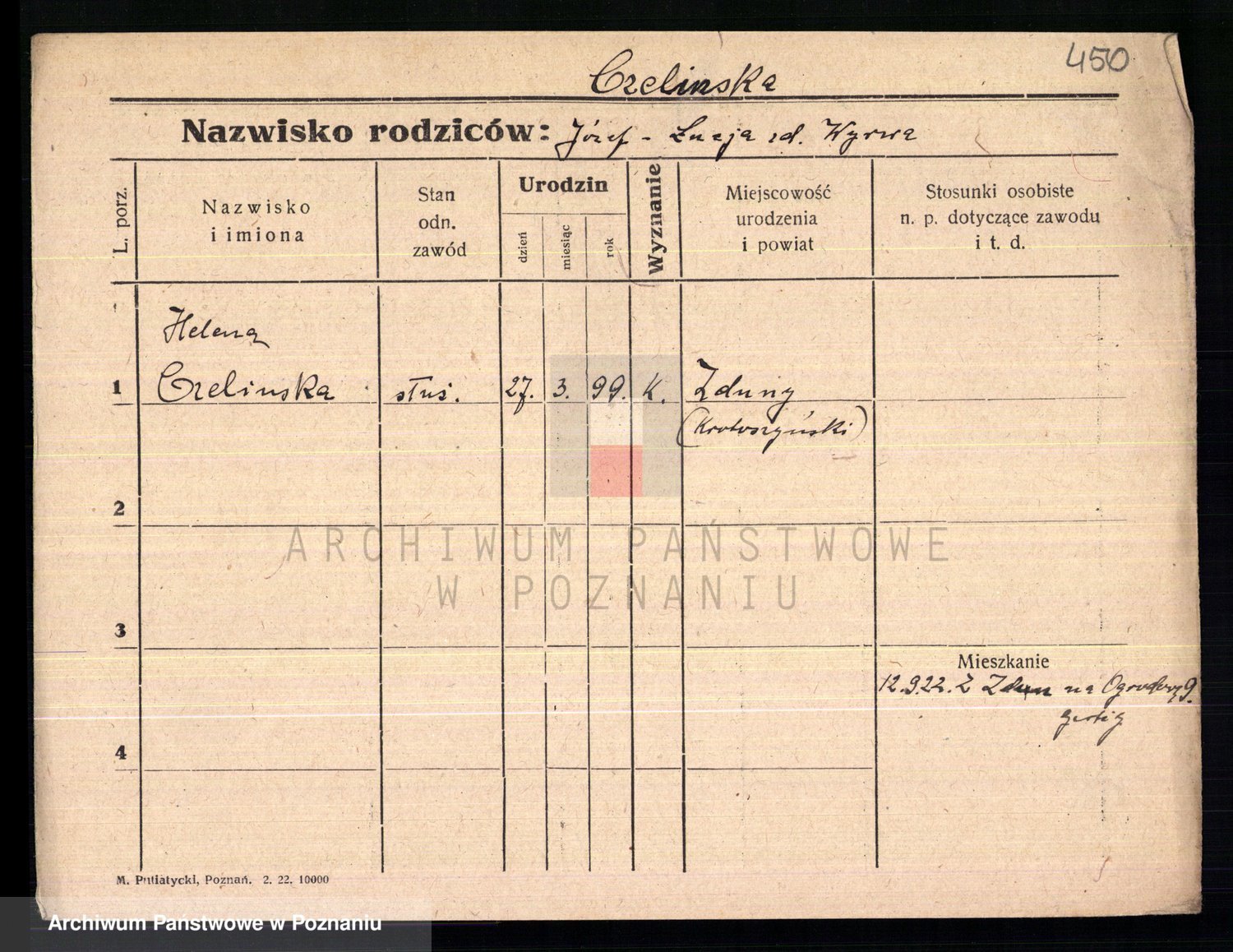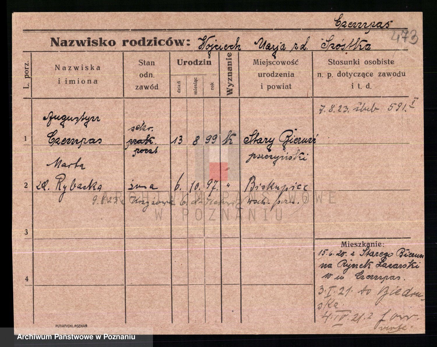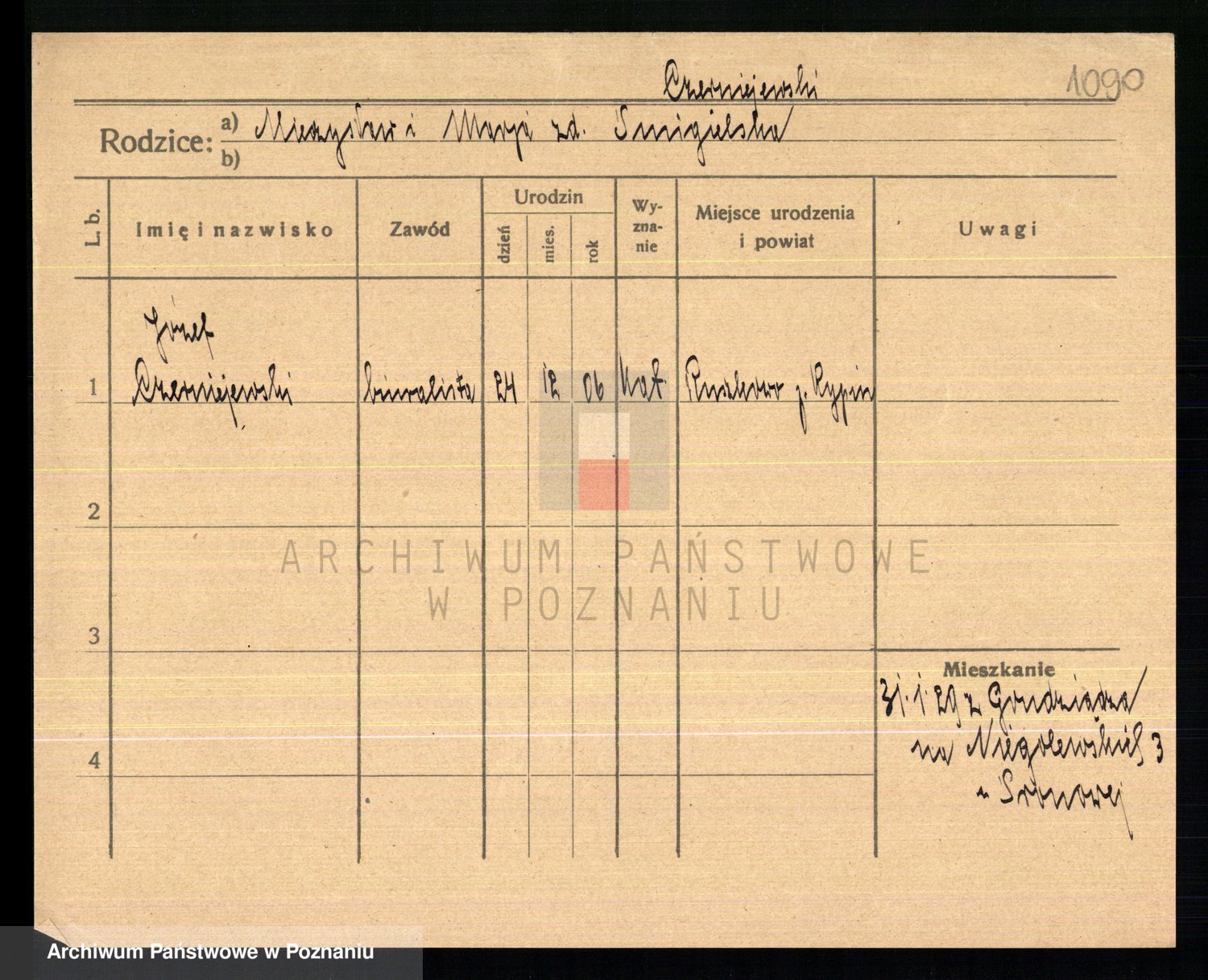 Podgląd karty osobowej dostępny jest po kliknięciu na nazwisko lub ikonkę karty. Można dokonywać powiększenia (ikony na górze) lub przechodzić między kolejnymi skanami (strzałki po bokach).
