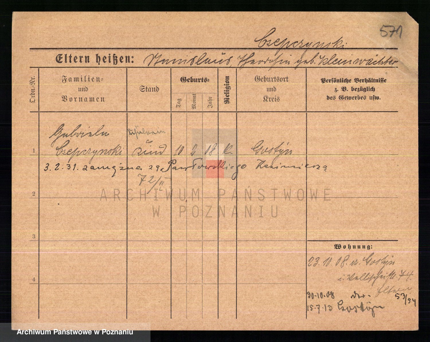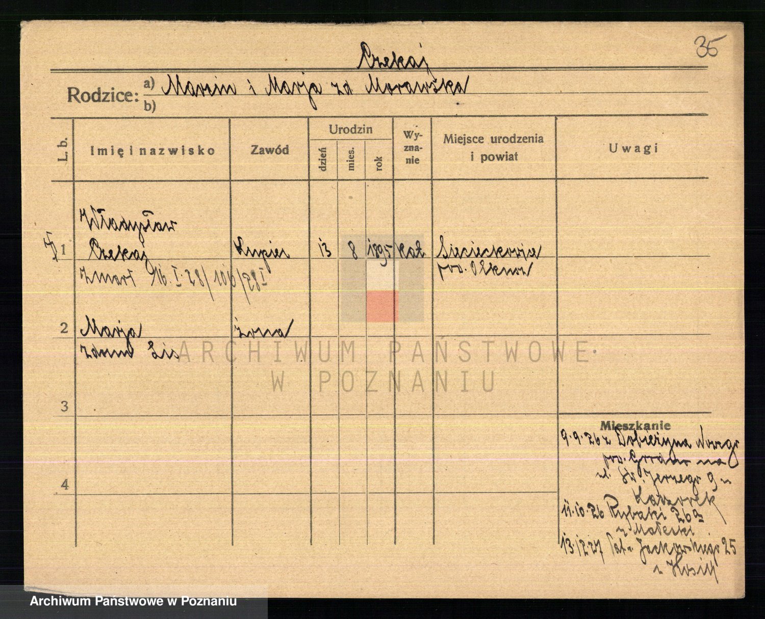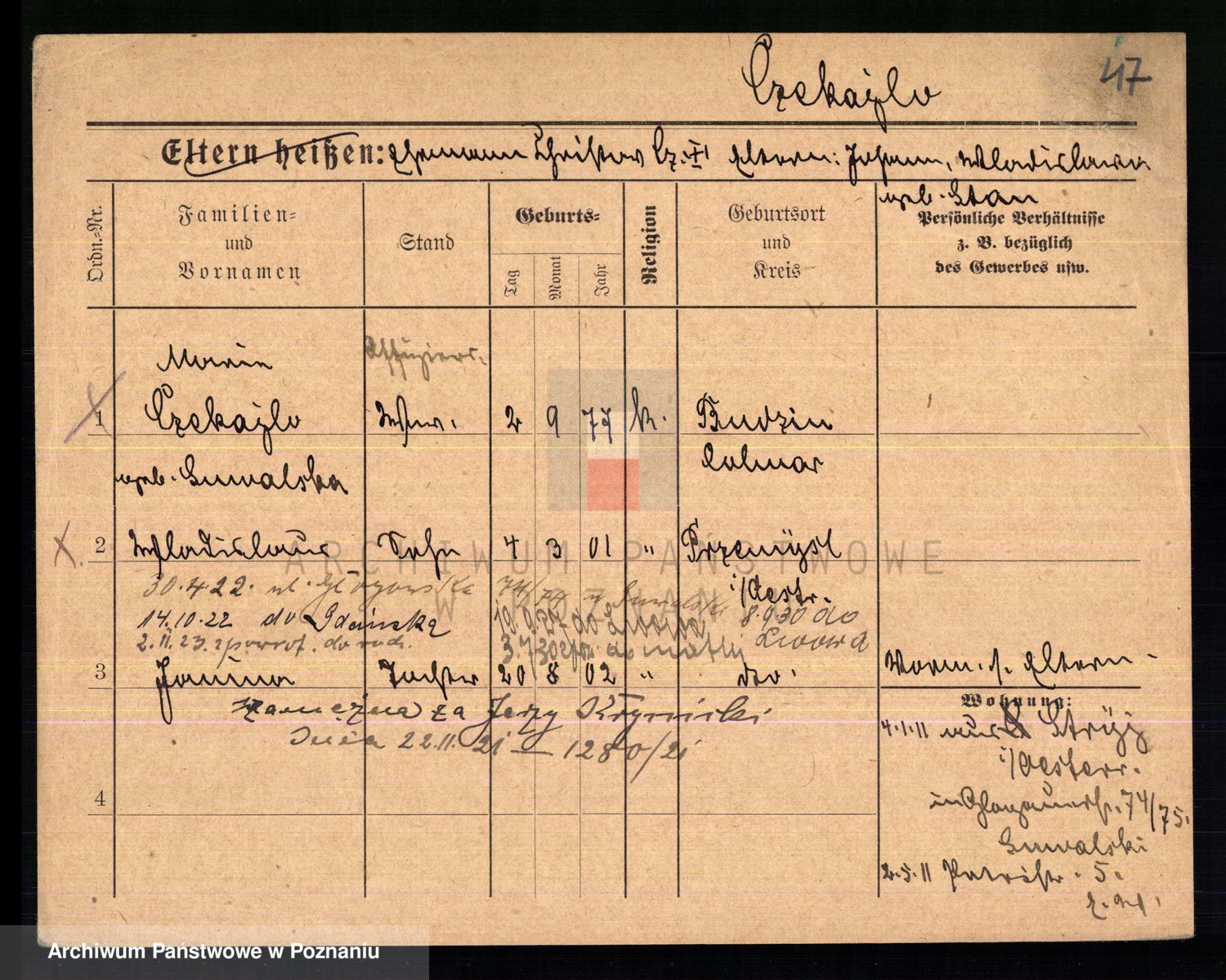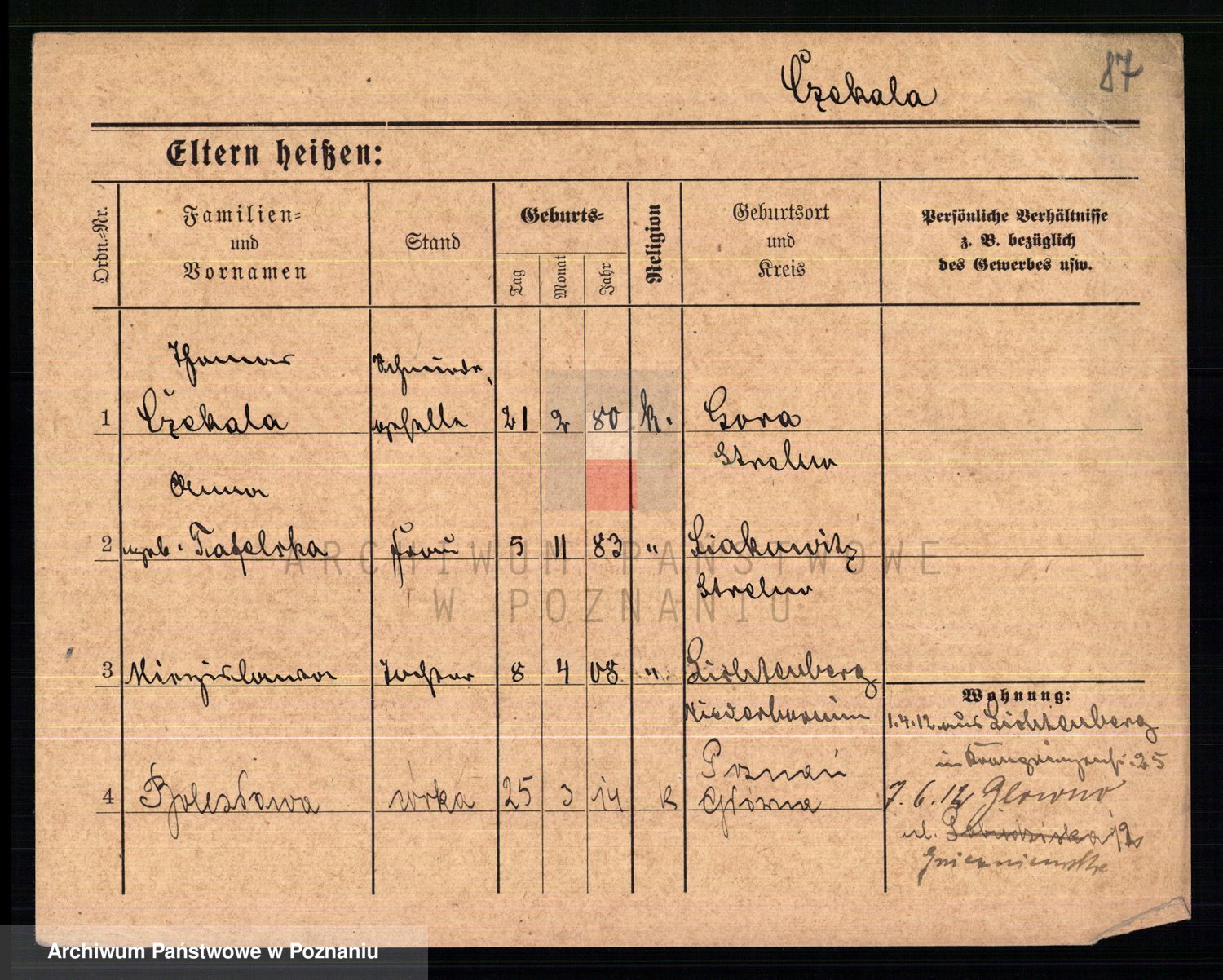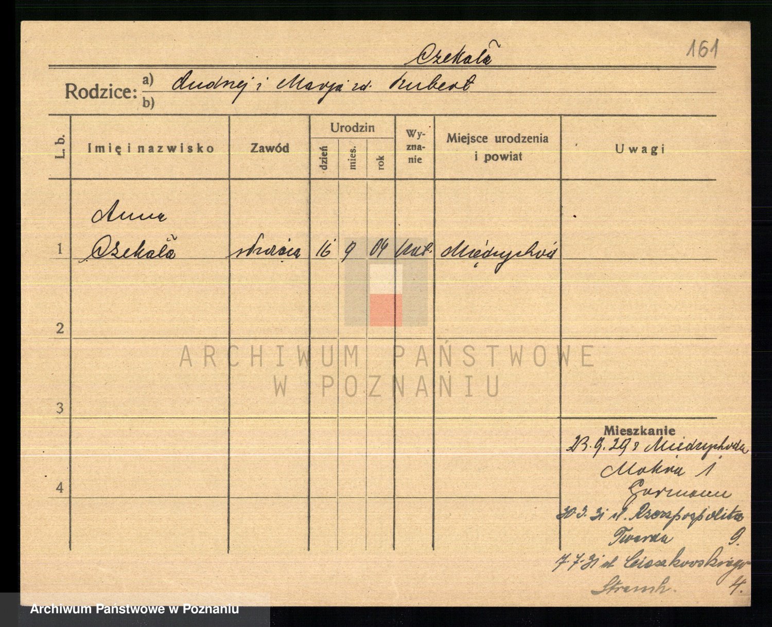 Podgląd karty osobowej dostępny jest po kliknięciu na nazwisko lub ikonkę karty. Można dokonywać powiększenia (ikony na górze) lub przechodzić między kolejnymi skanami (strzałki po bokach).