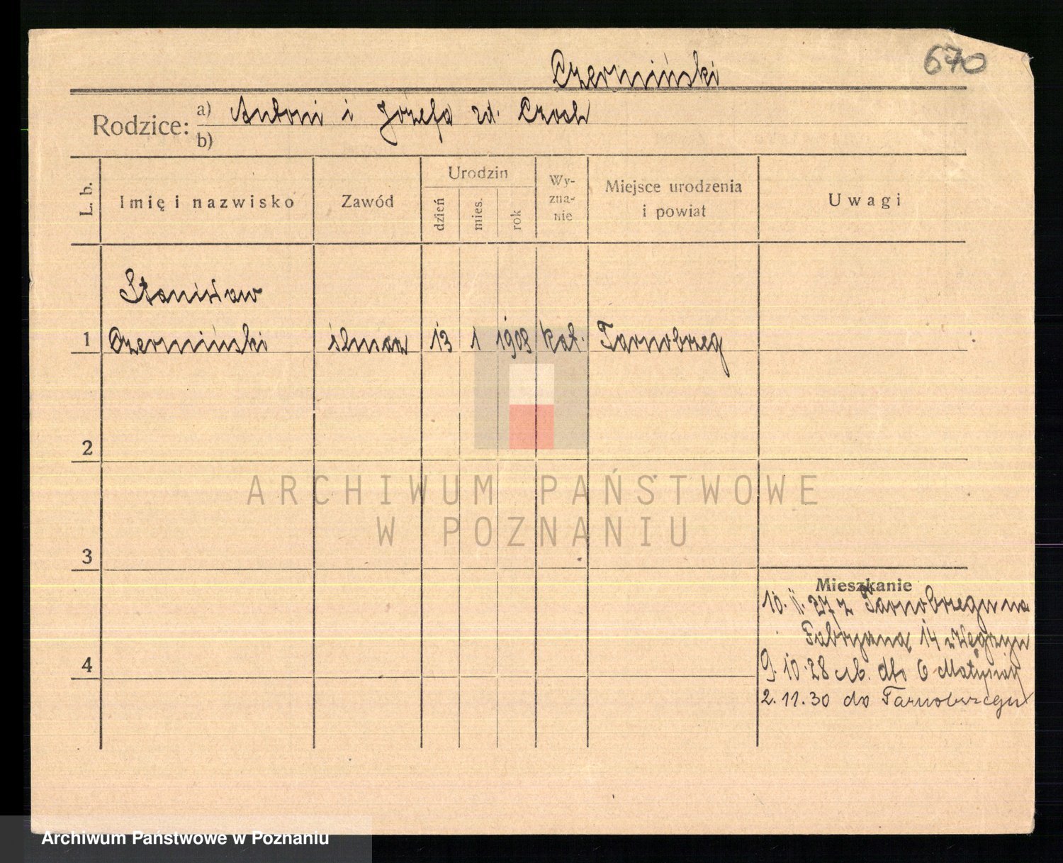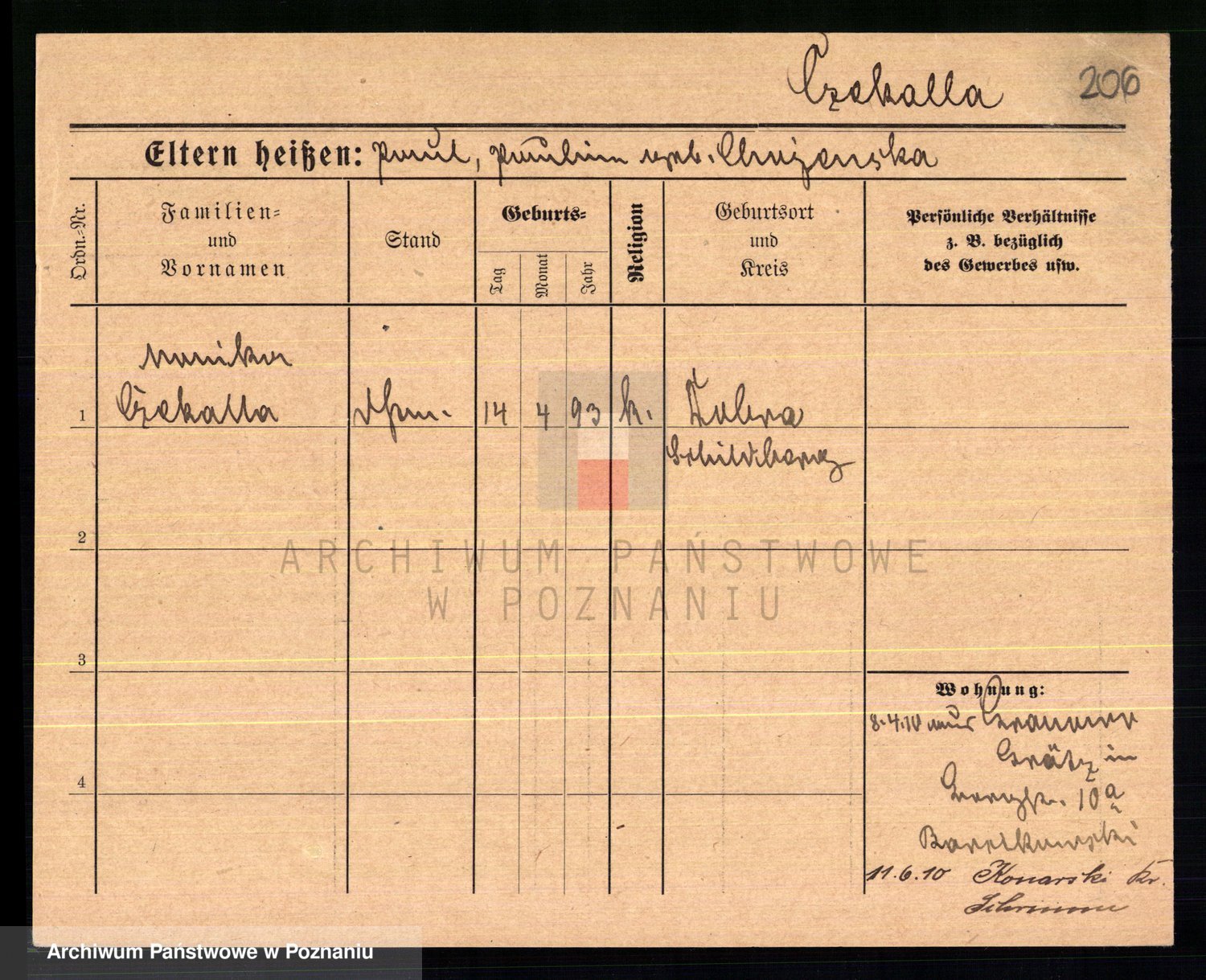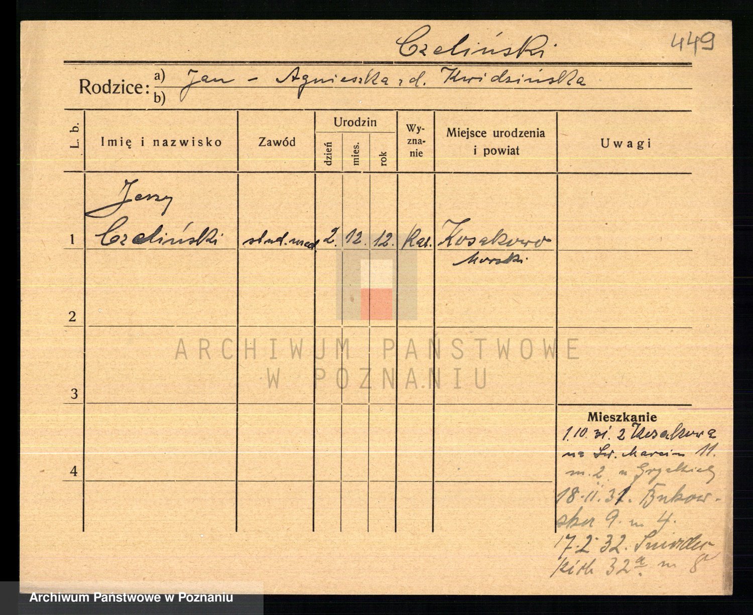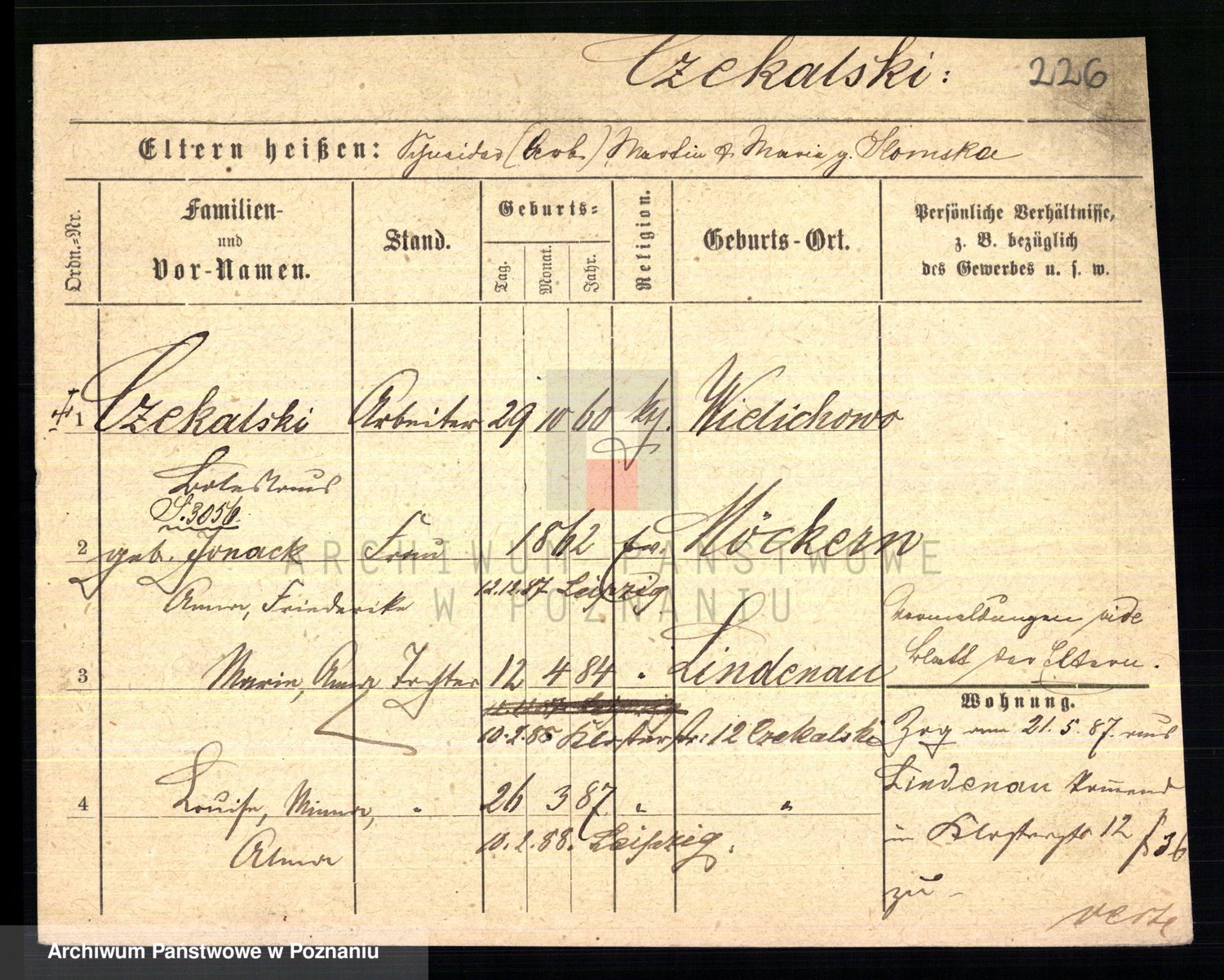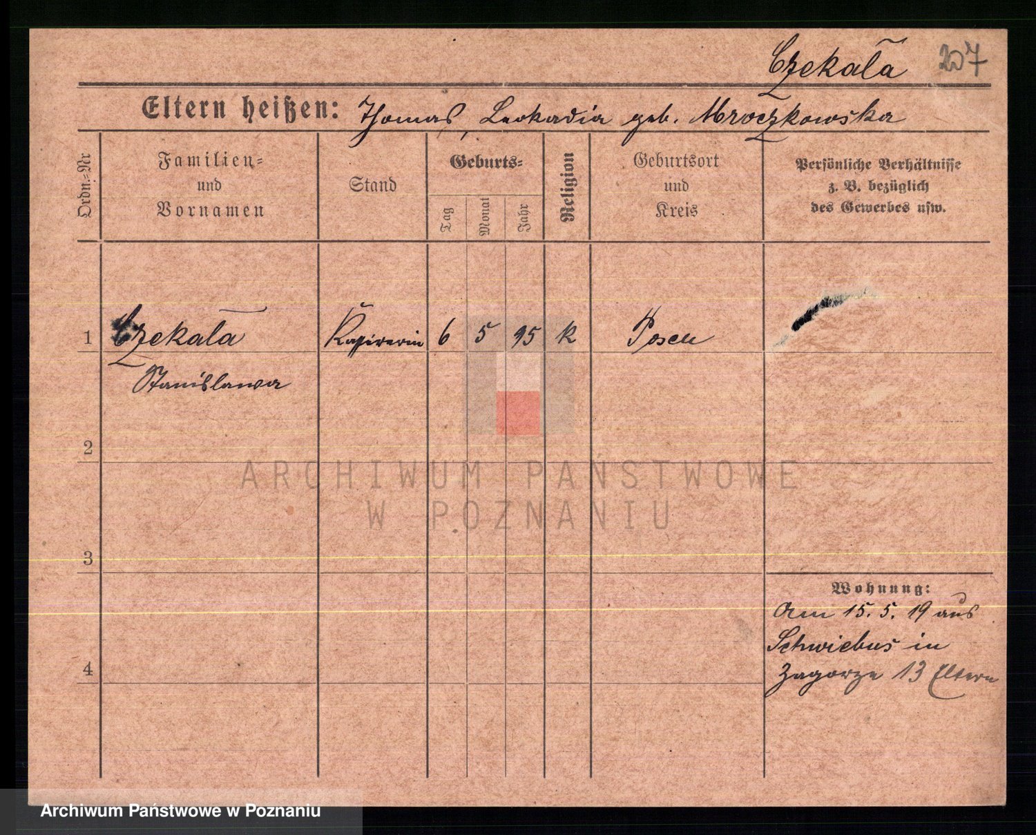 Podgląd karty osobowej dostępny jest po kliknięciu na nazwisko lub ikonkę karty. Można dokonywać powiększenia (ikony na górze) lub przechodzić między kolejnymi skanami (strzałki po bokach).