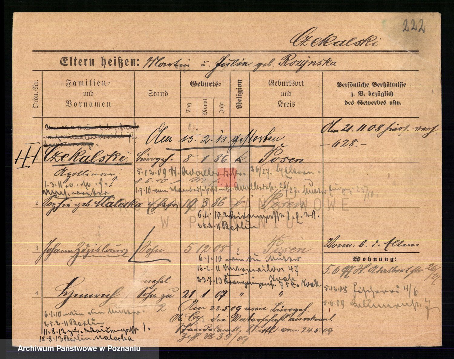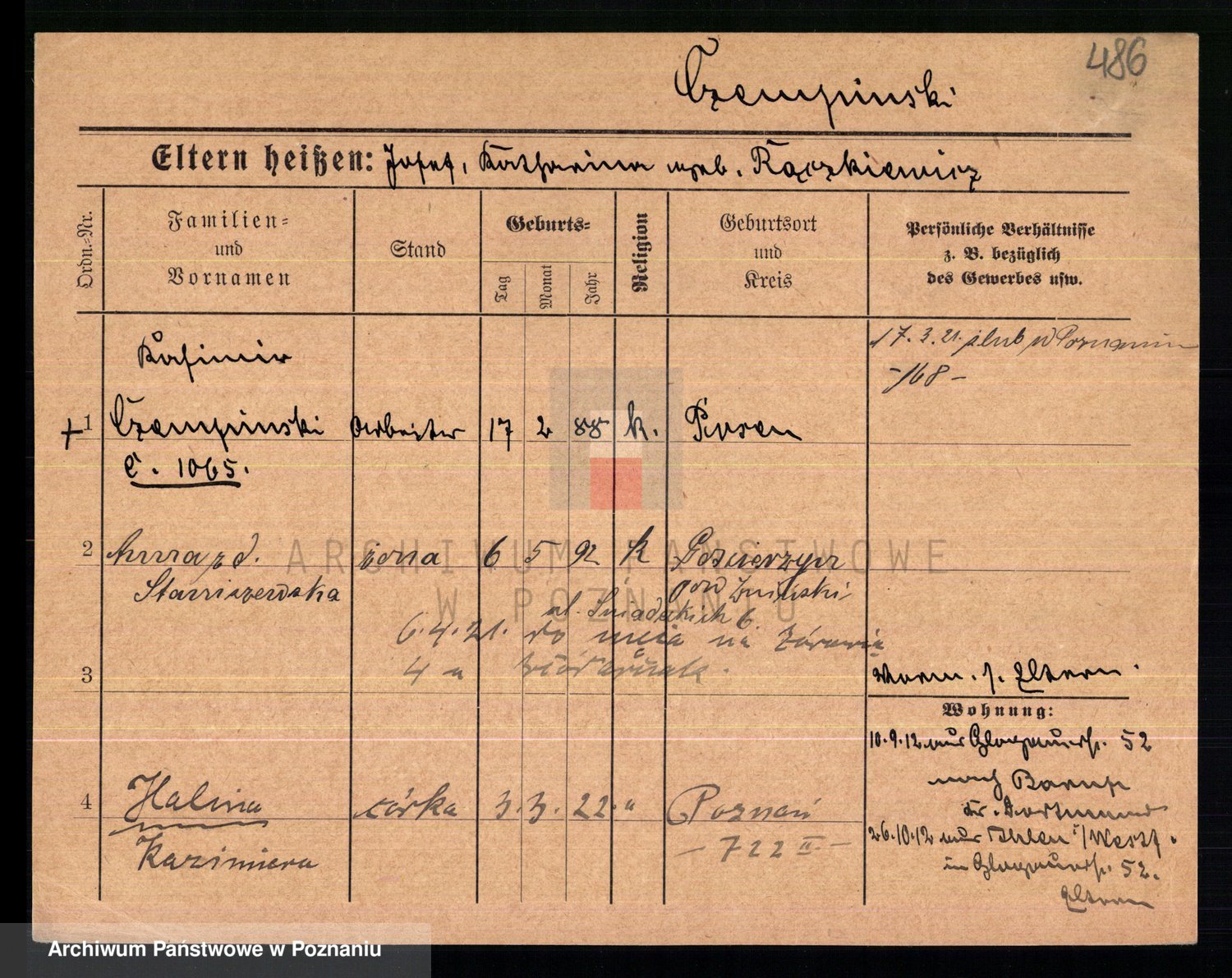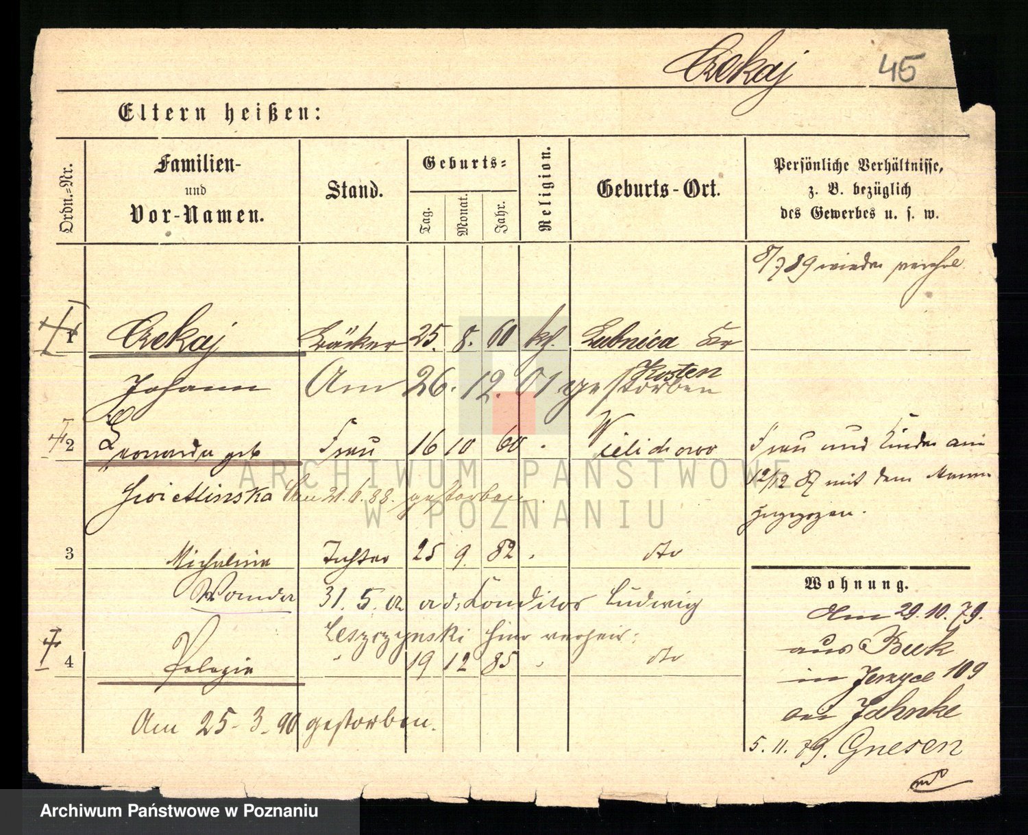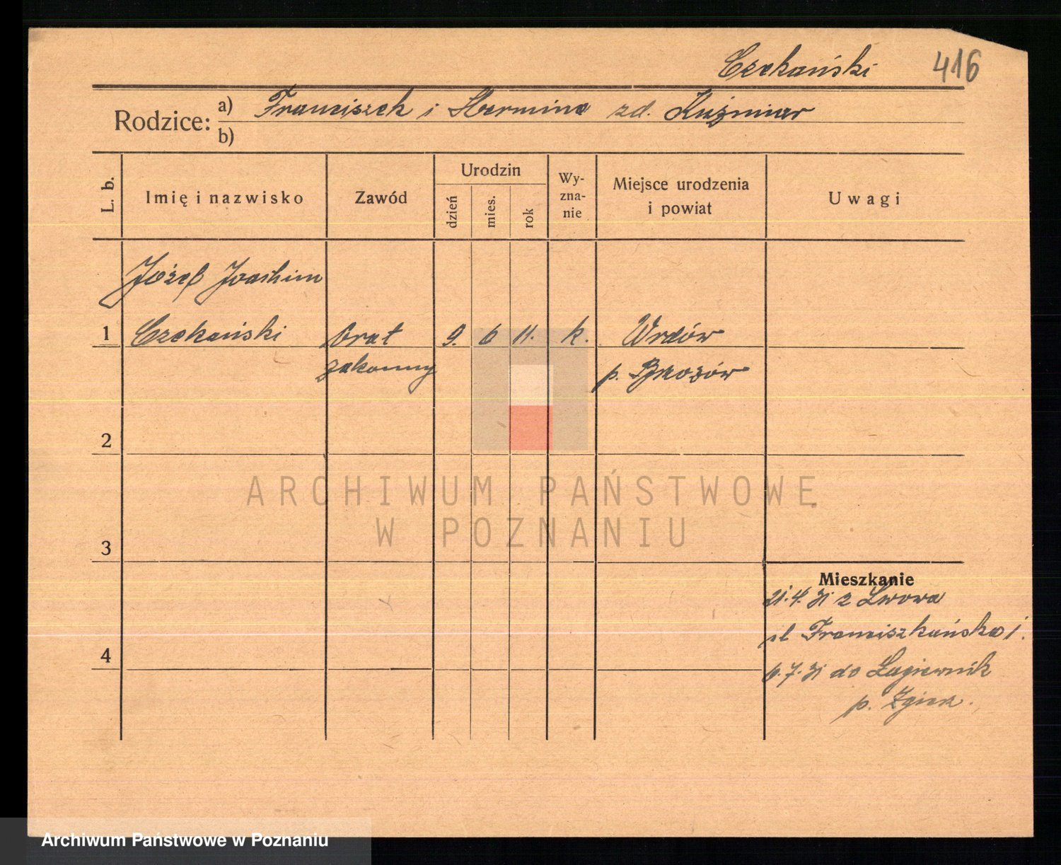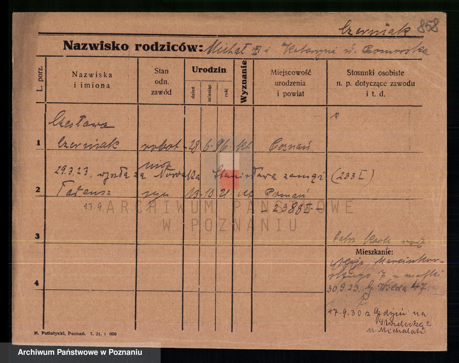 Podgląd karty osobowej dostępny jest po kliknięciu na nazwisko lub ikonkę karty. Można dokonywać powiększenia (ikony na górze) lub przechodzić między kolejnymi skanami (strzałki po bokach).