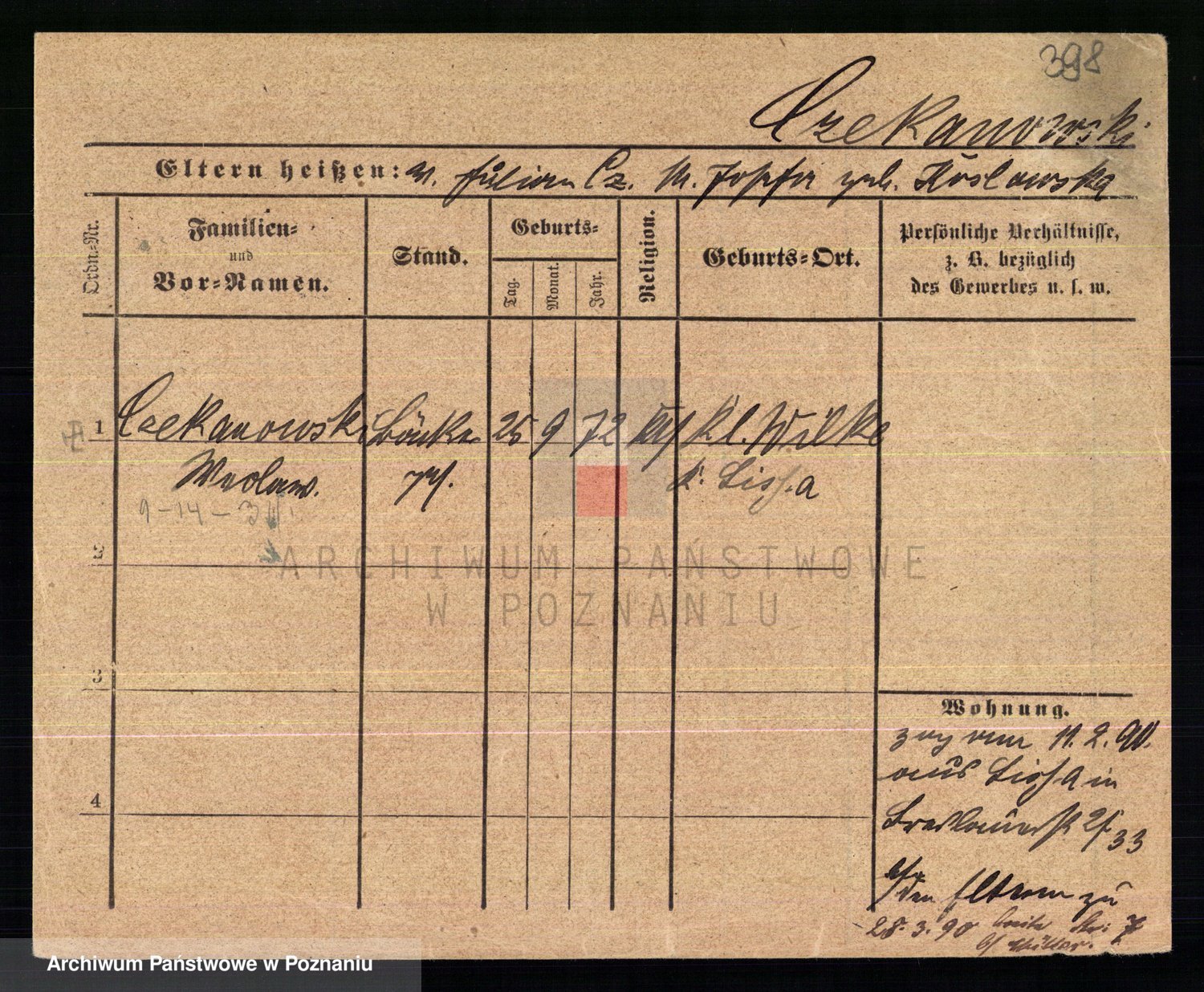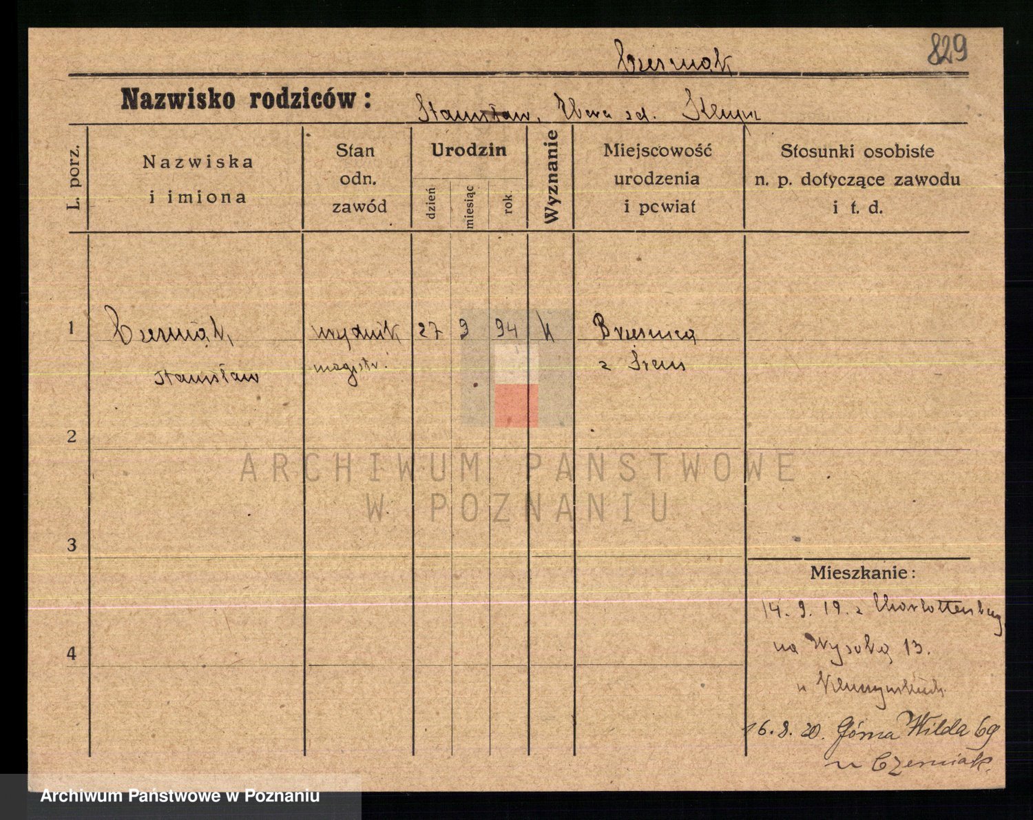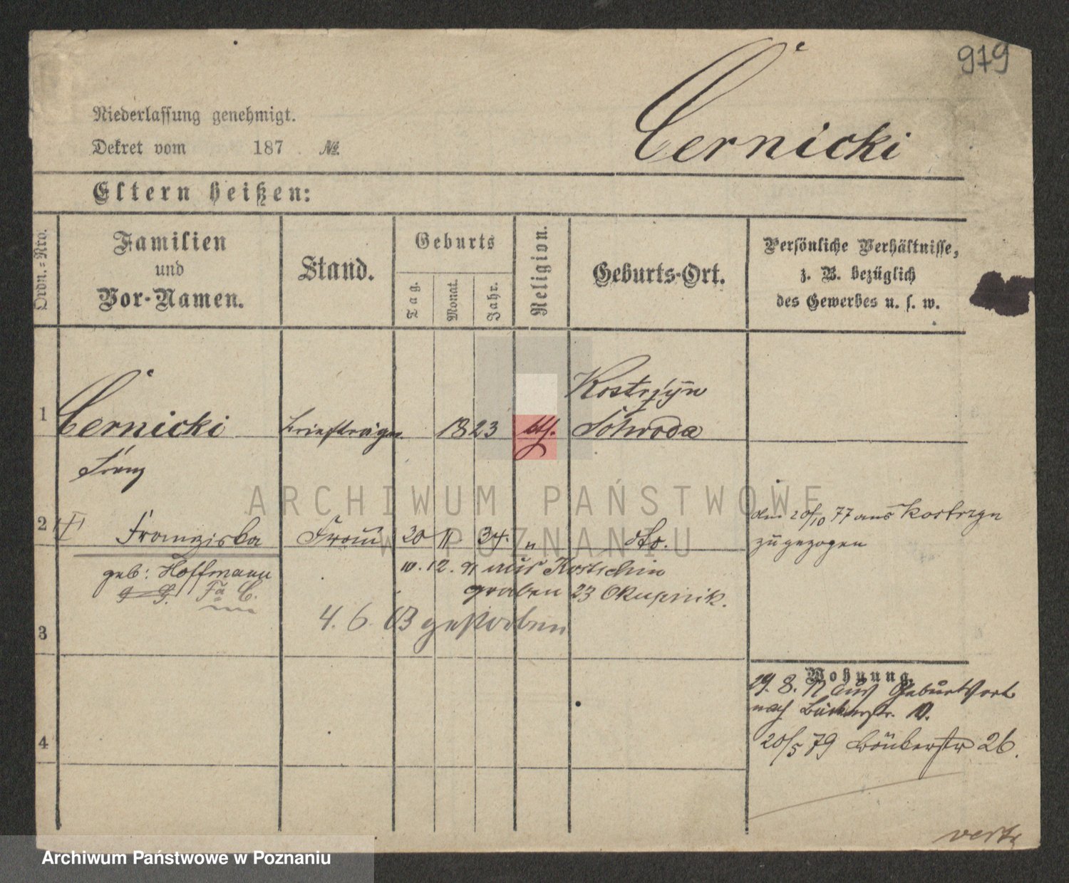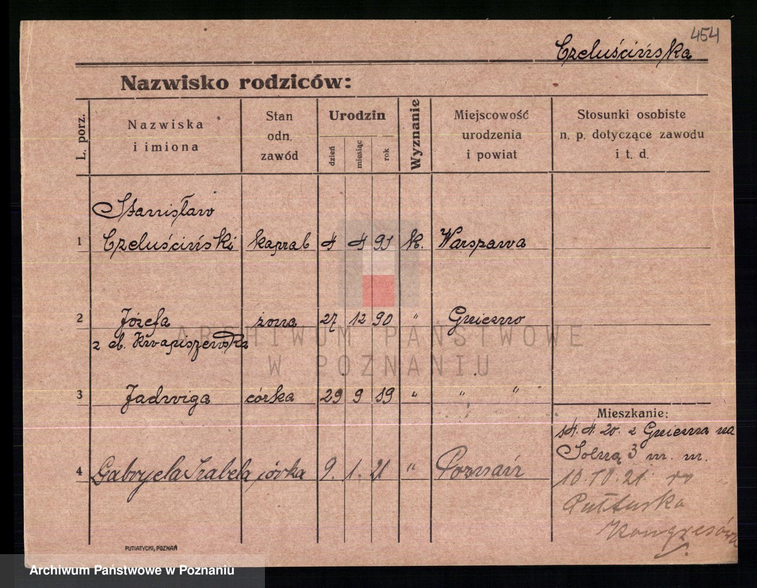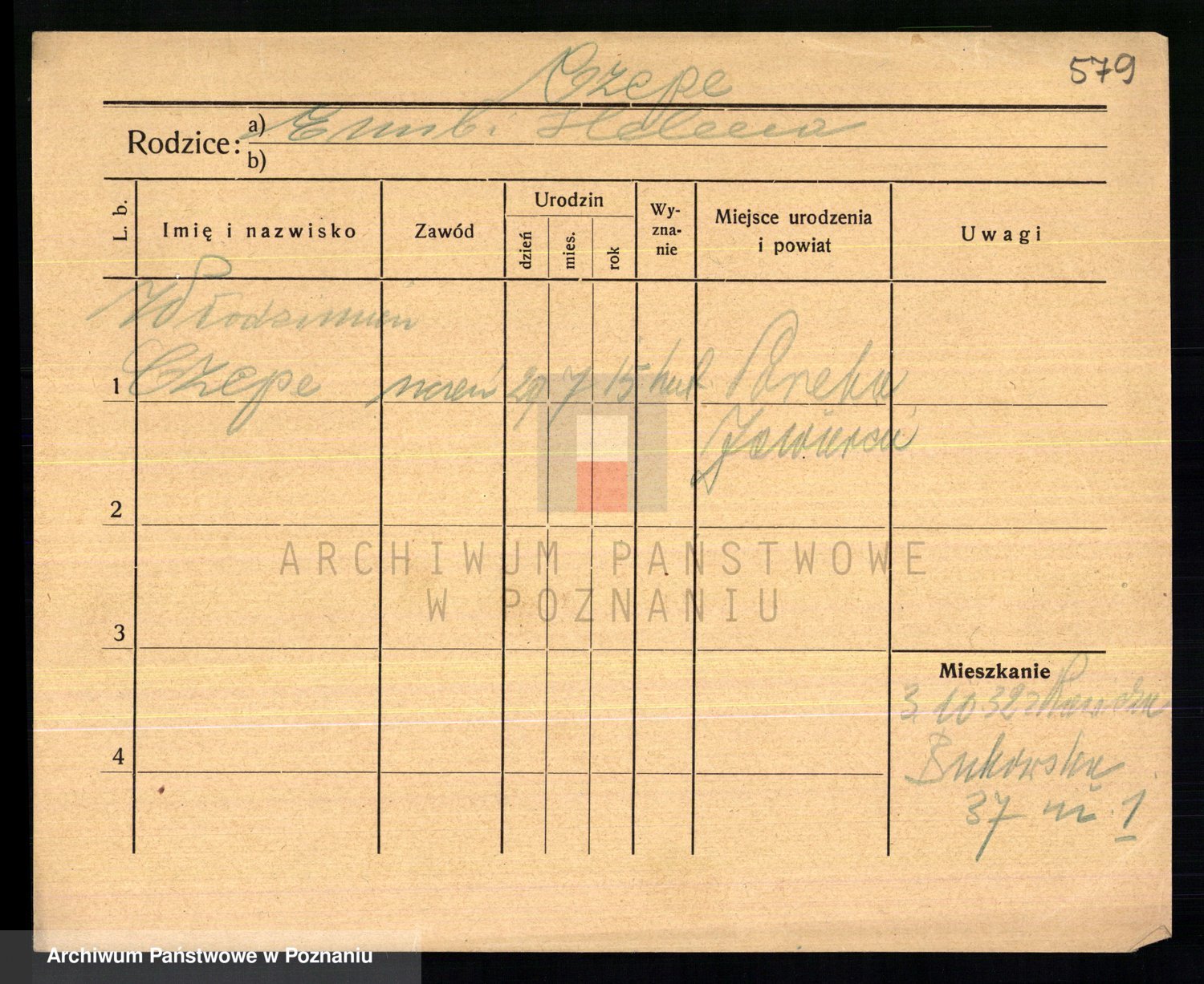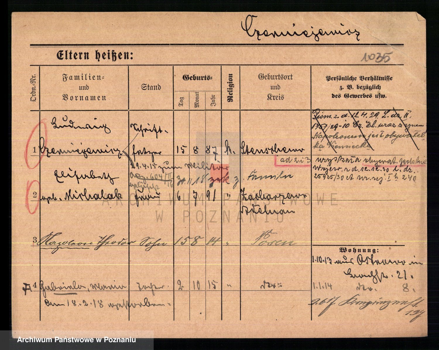 Podgląd karty osobowej dostępny jest po kliknięciu na nazwisko lub ikonkę karty. Można dokonywać powiększenia (ikony na górze) lub przechodzić między kolejnymi skanami (strzałki po bokach).