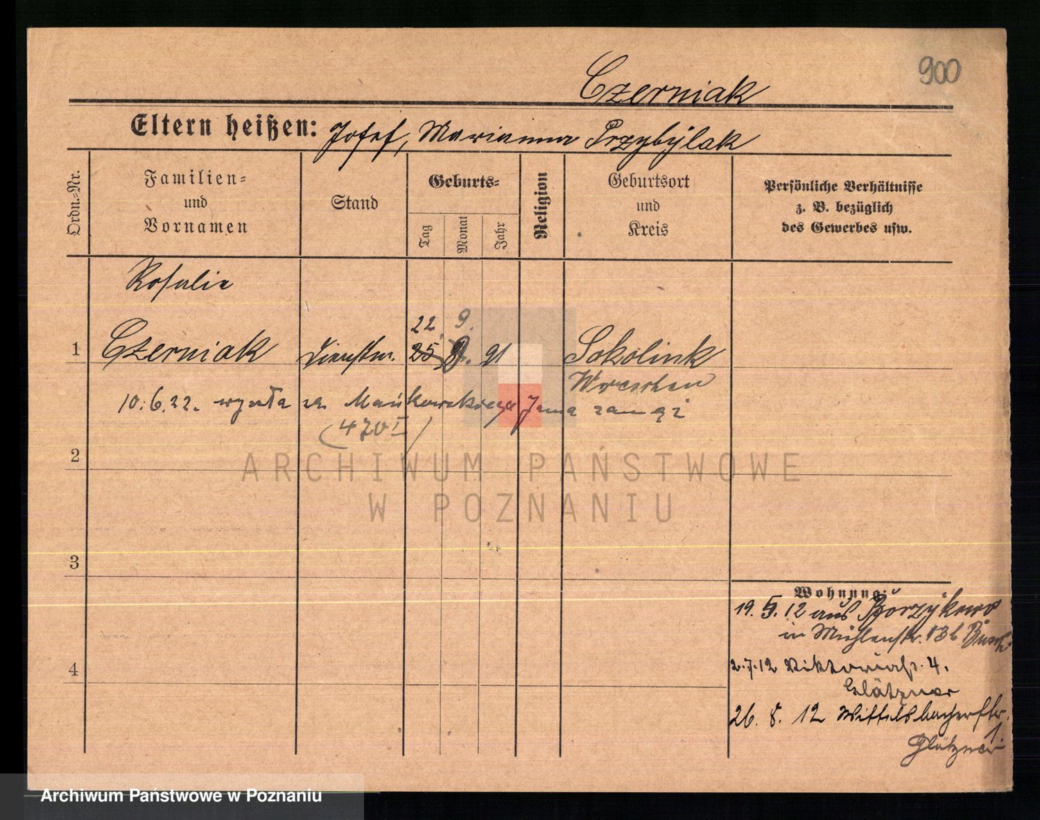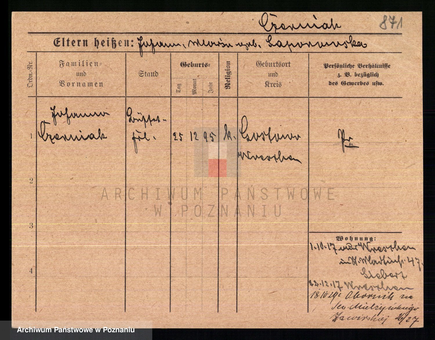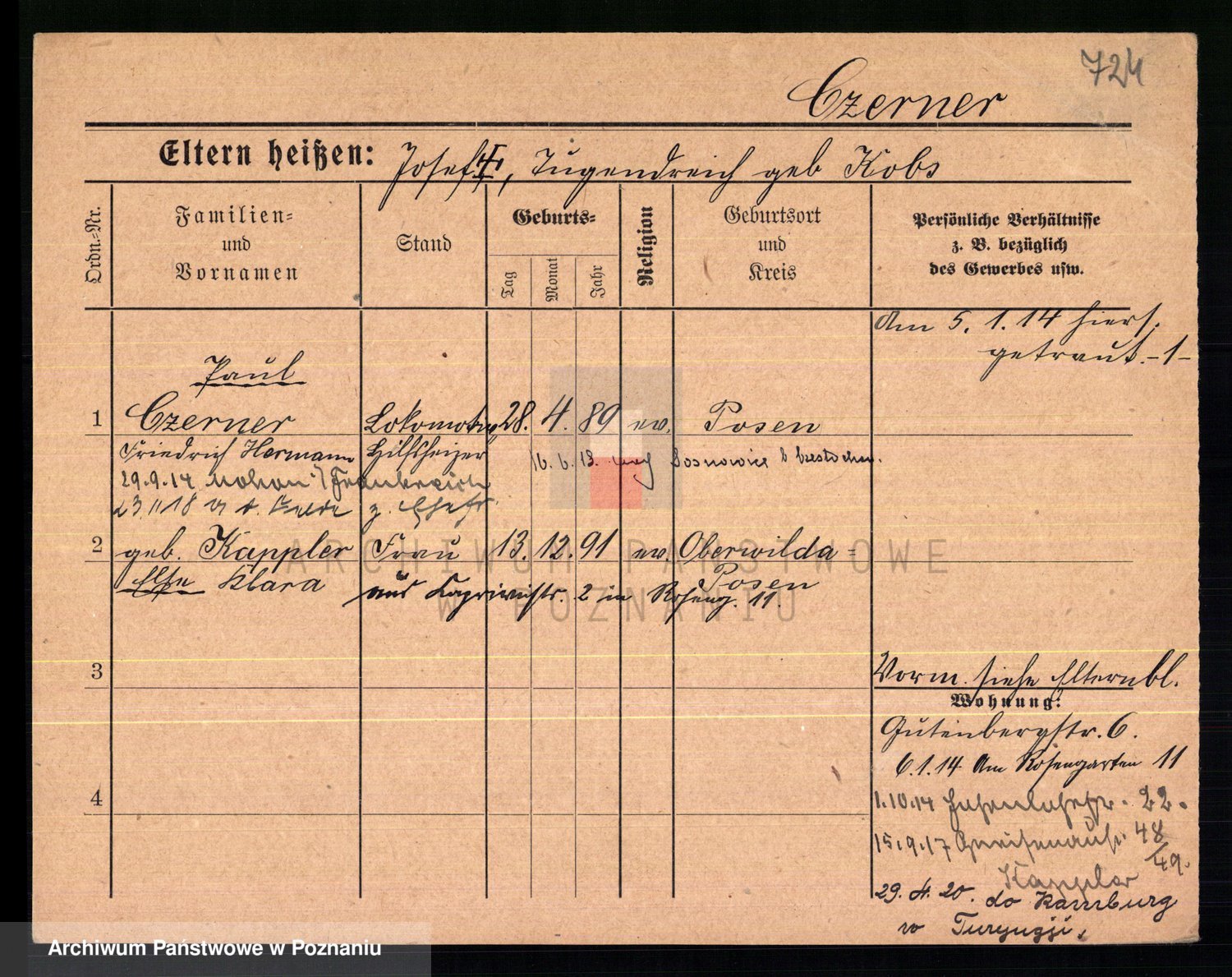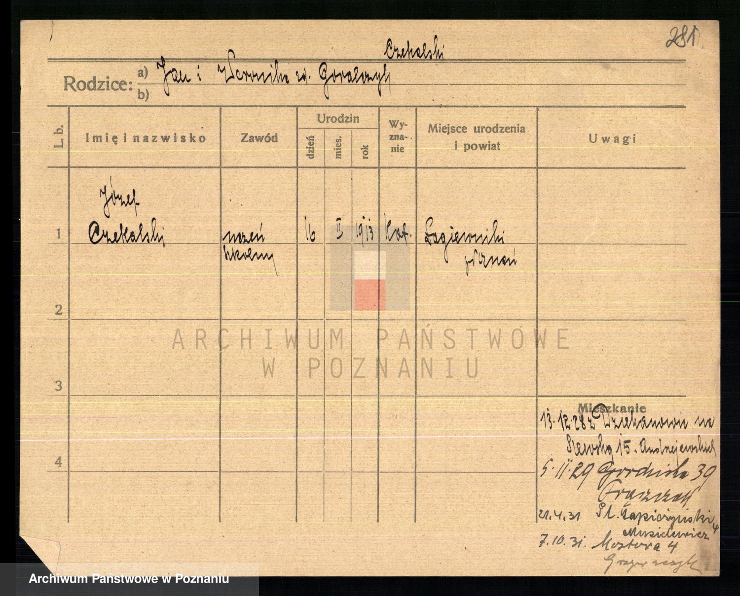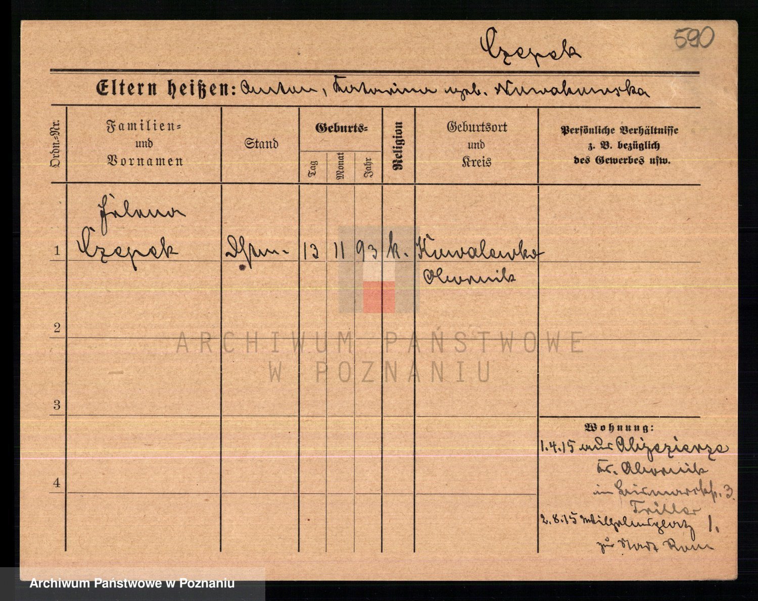 Podgląd karty osobowej dostępny jest po kliknięciu na nazwisko lub ikonkę karty. Można dokonywać powiększenia (ikony na górze) lub przechodzić między kolejnymi skanami (strzałki po bokach).