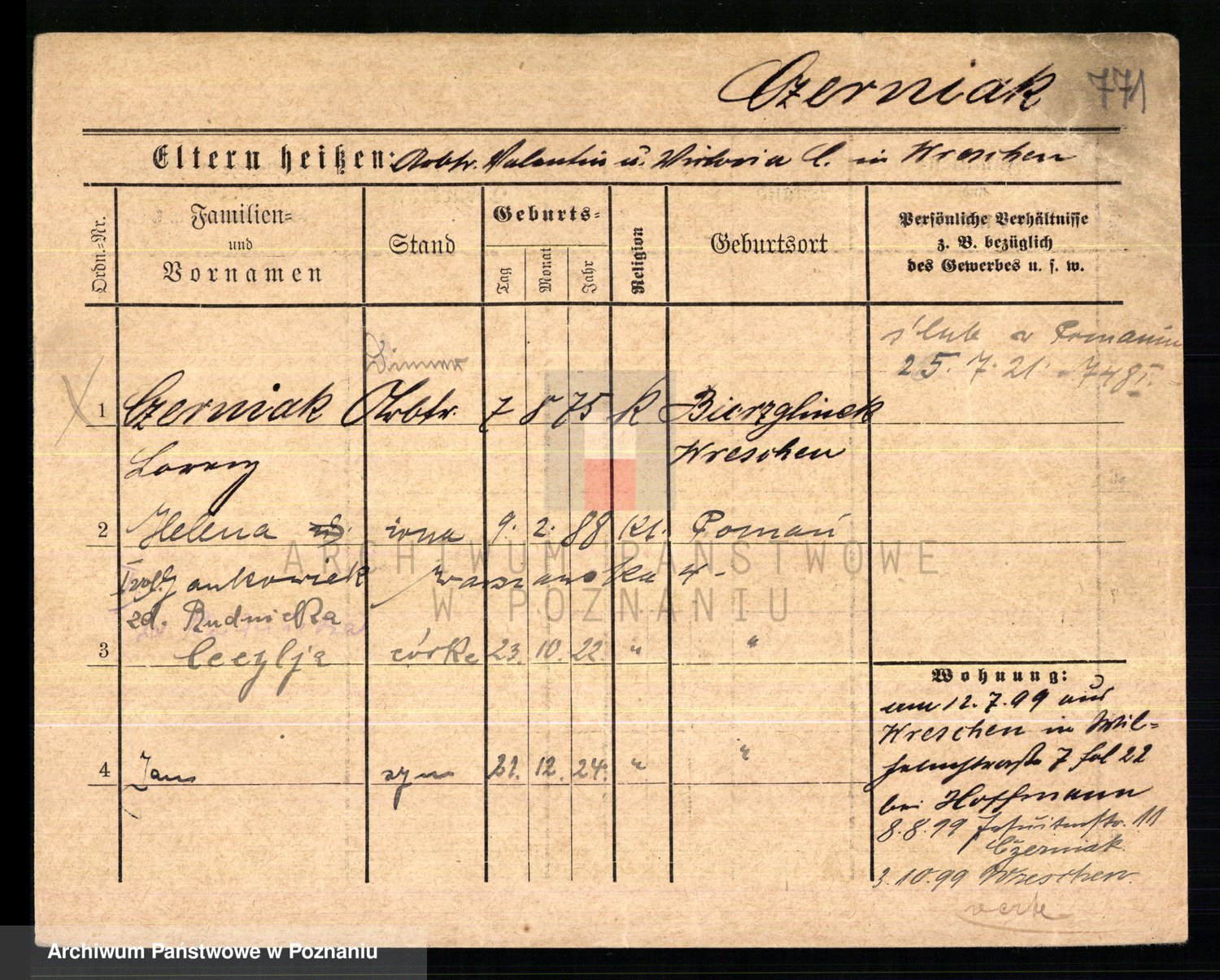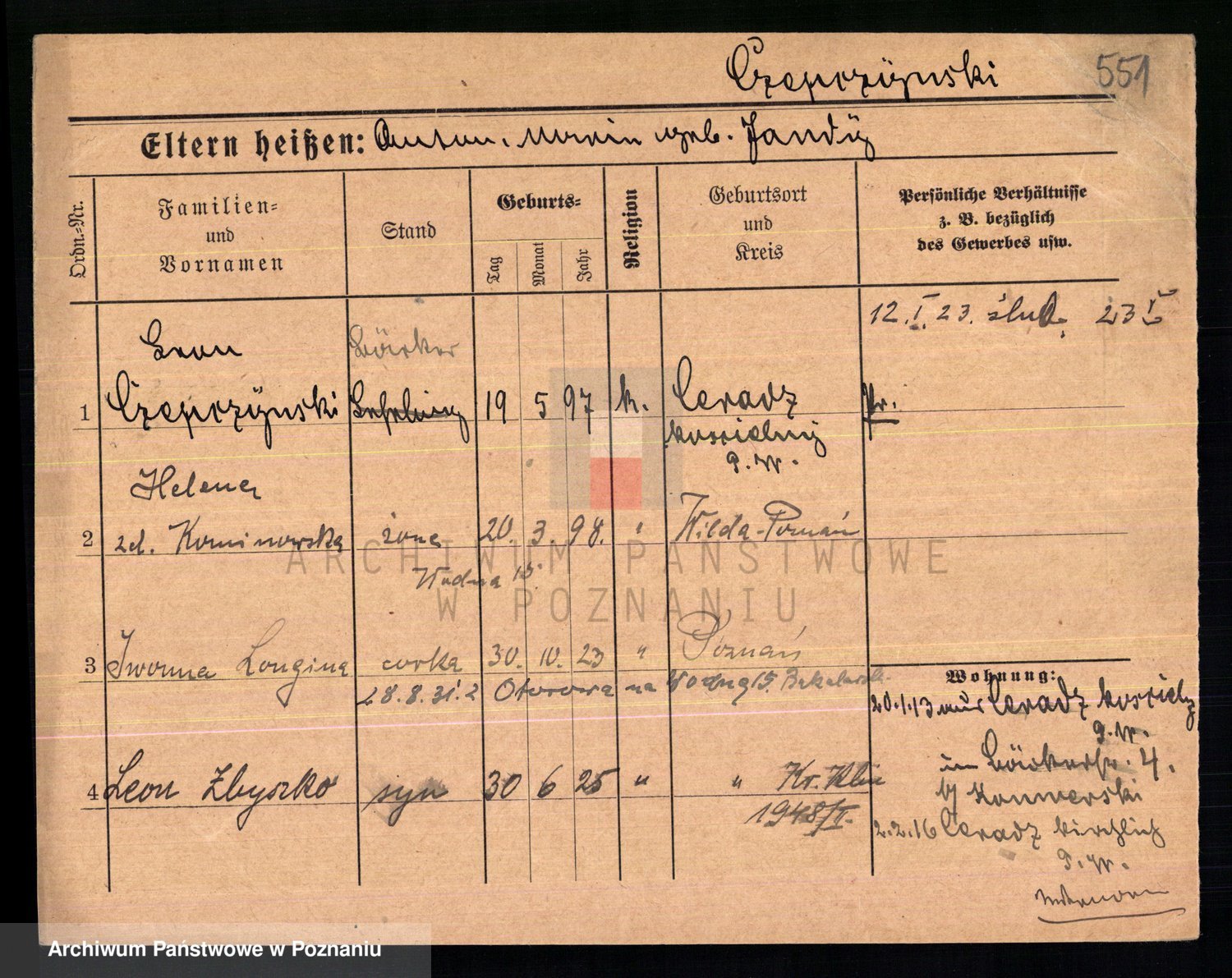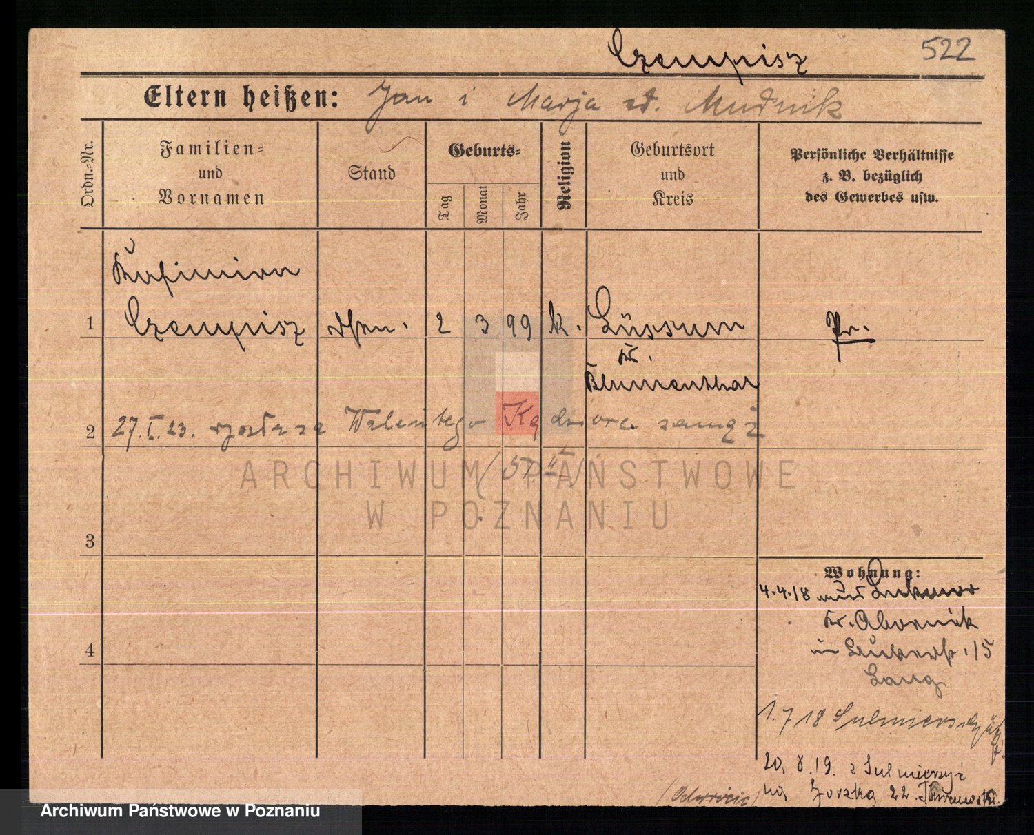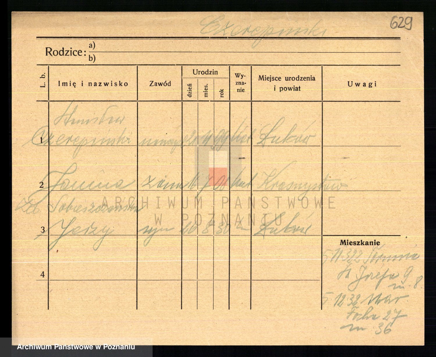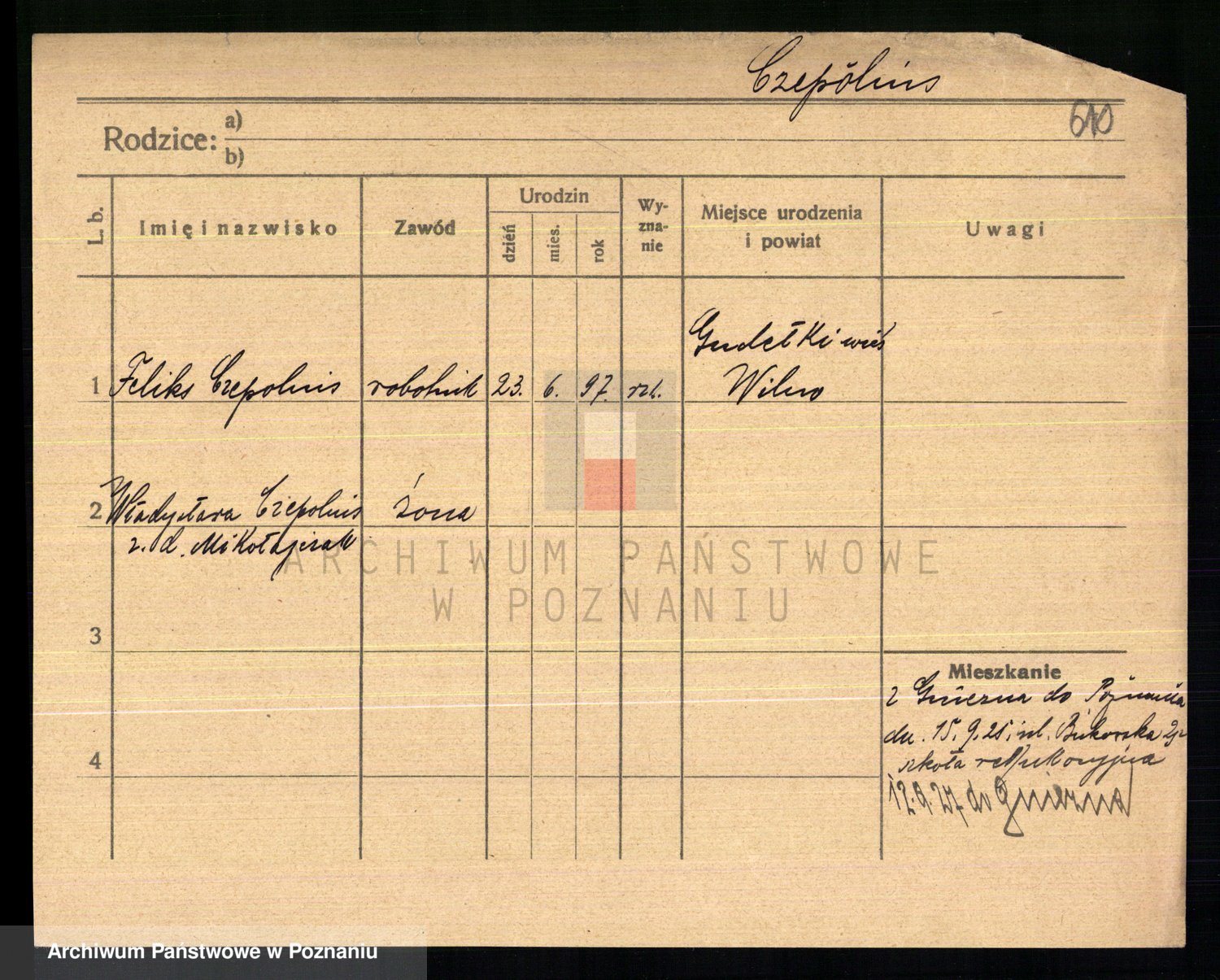 Podgląd karty osobowej dostępny jest po kliknięciu na nazwisko lub ikonkę karty. Można dokonywać powiększenia (ikony na górze) lub przechodzić między kolejnymi skanami (strzałki po bokach).