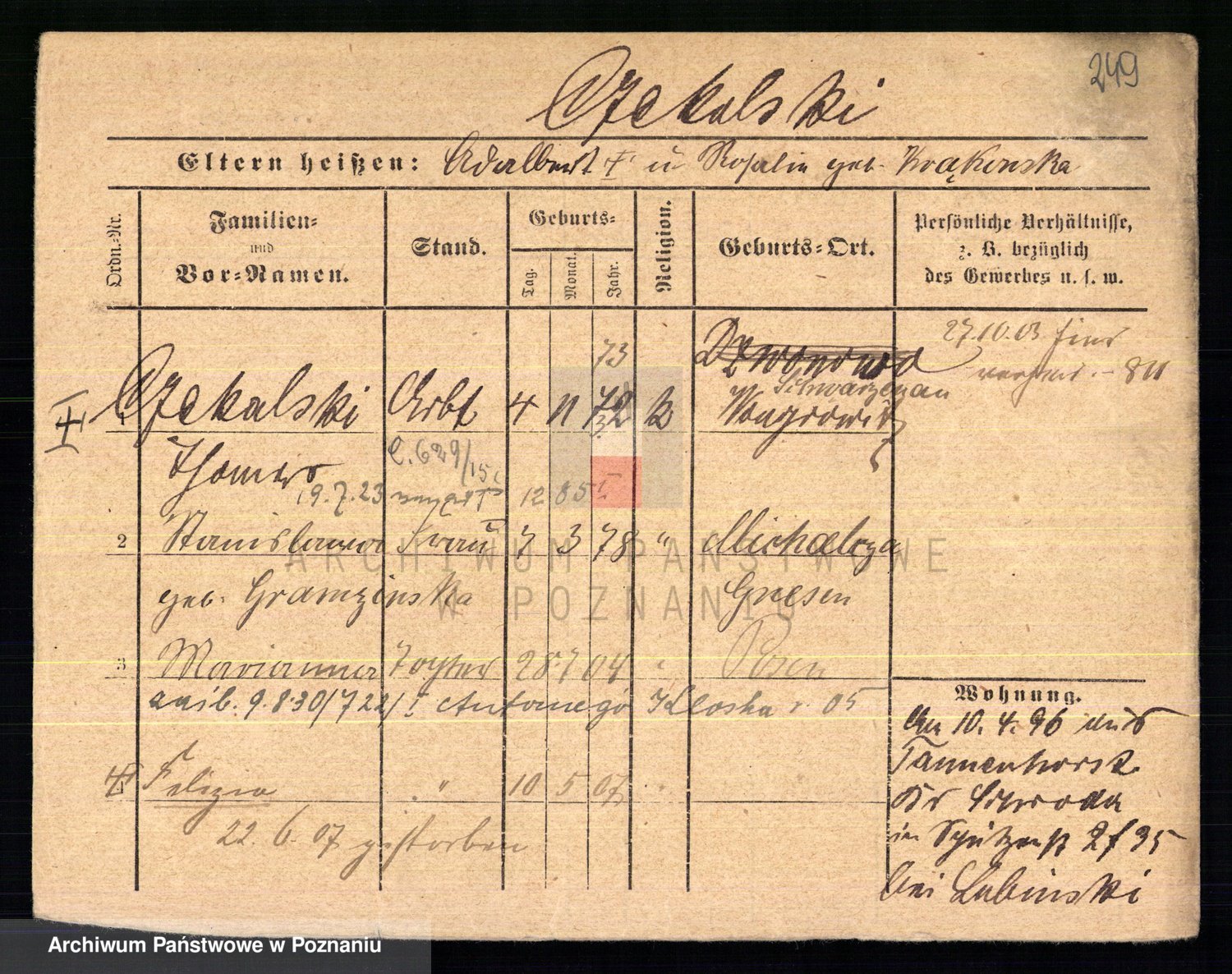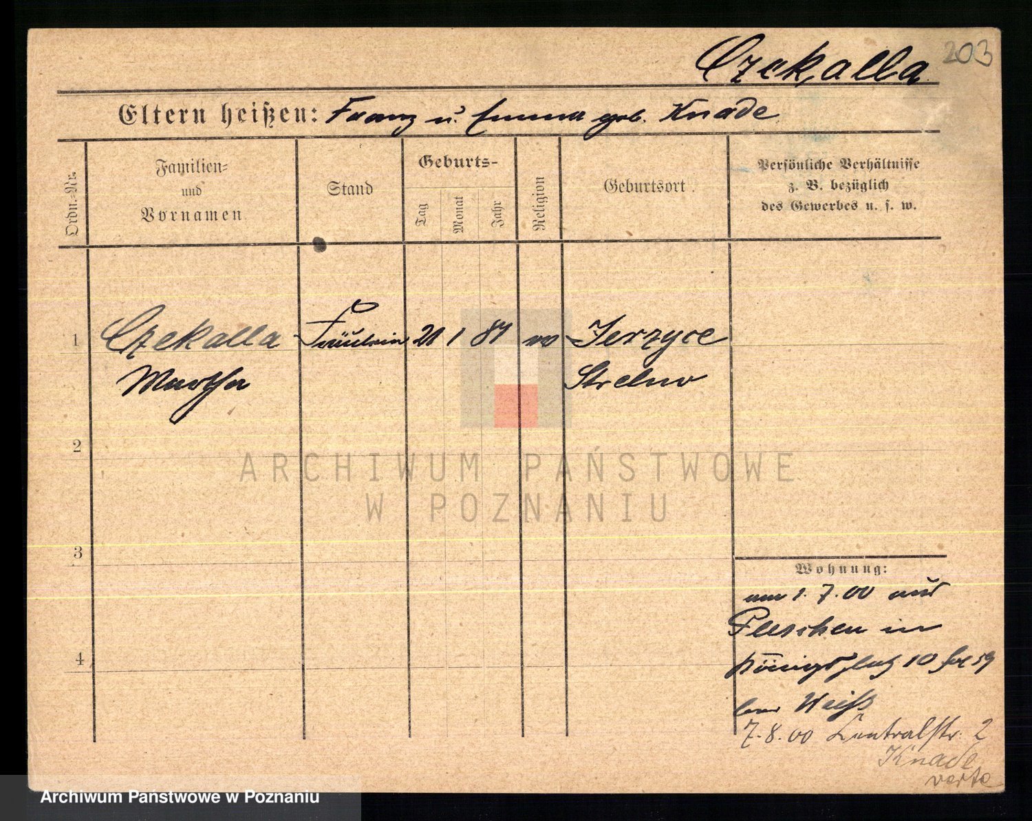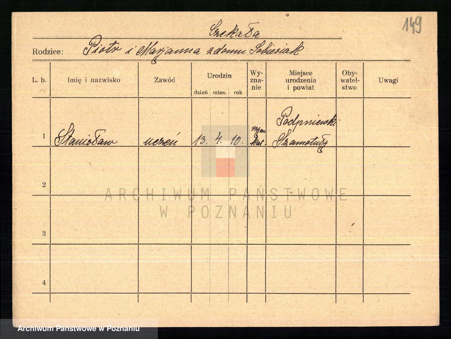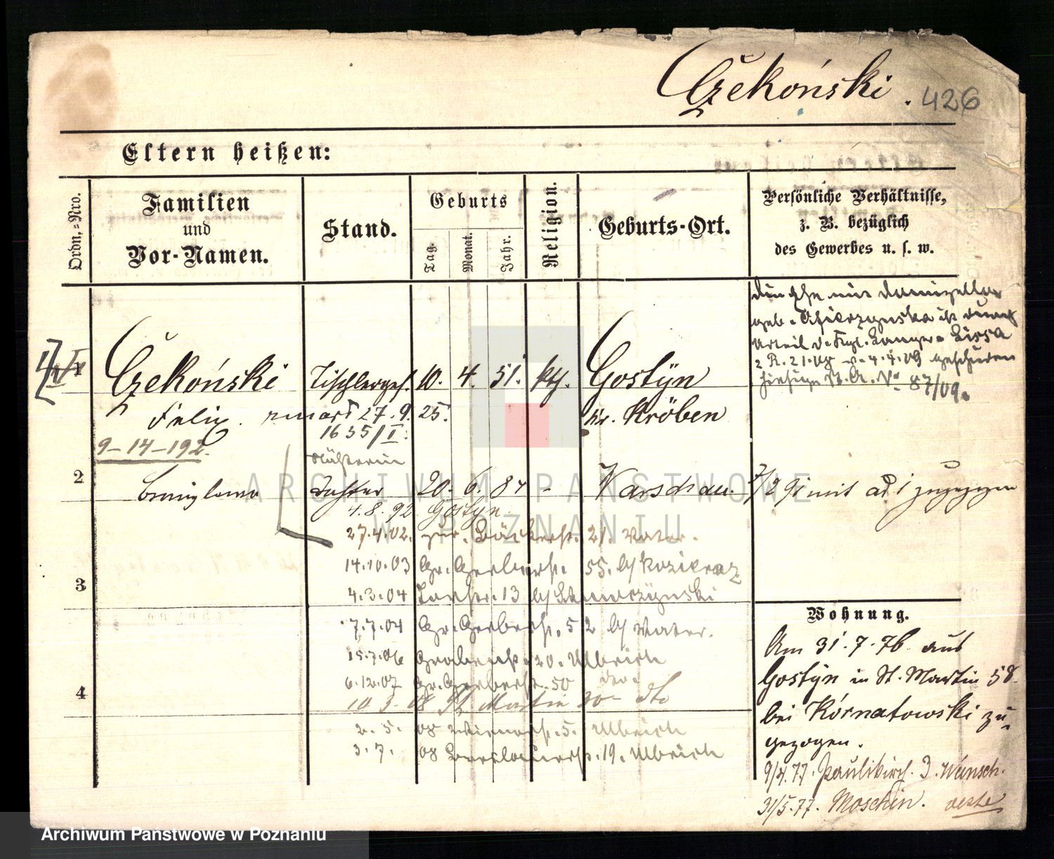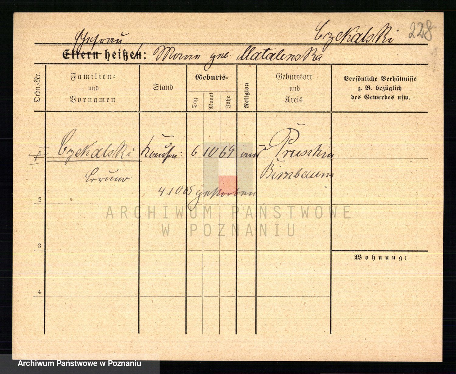 Podgląd karty osobowej dostępny jest po kliknięciu na nazwisko lub ikonkę karty. Można dokonywać powiększenia (ikony na górze) lub przechodzić między kolejnymi skanami (strzałki po bokach).