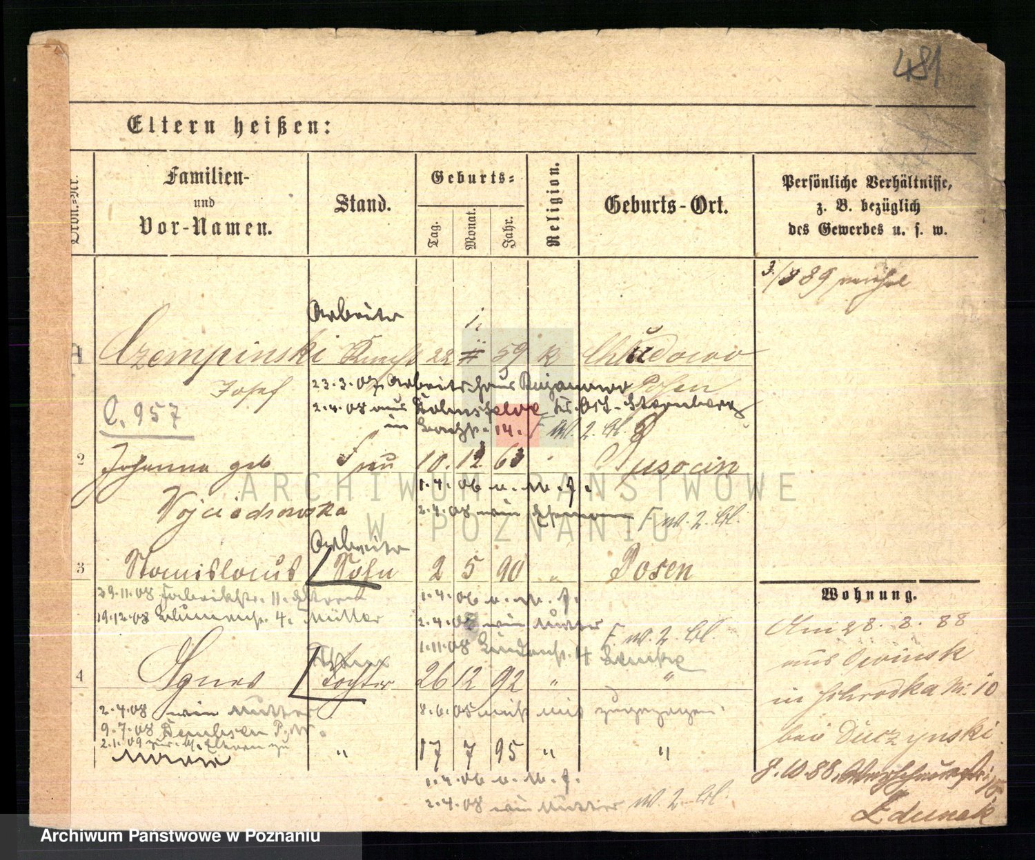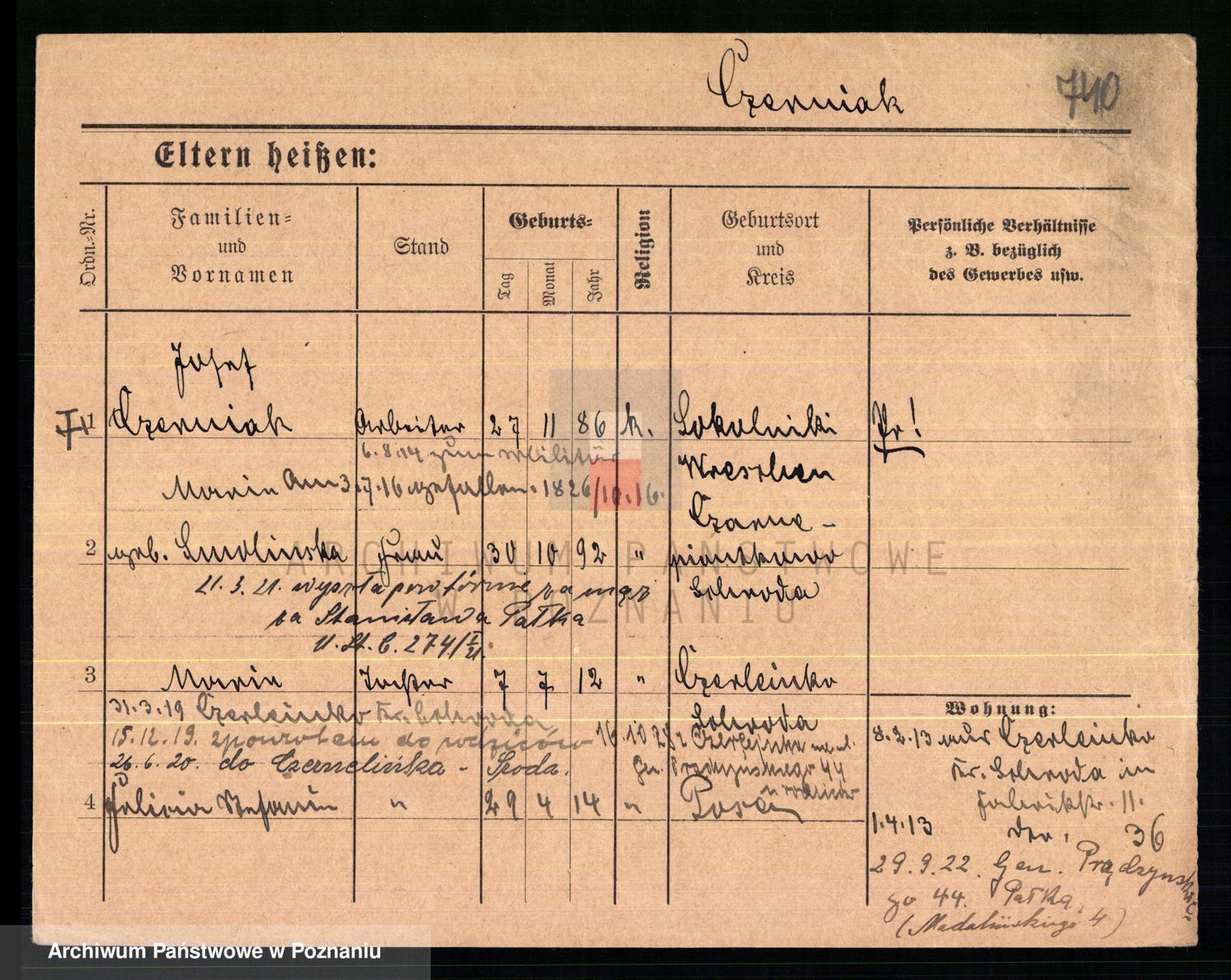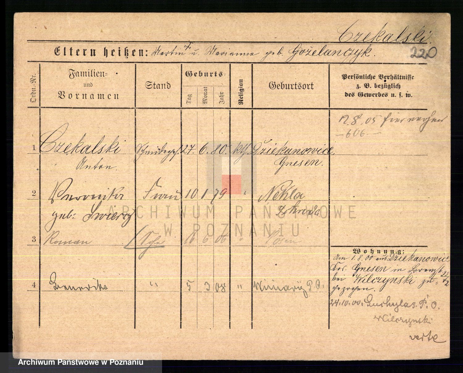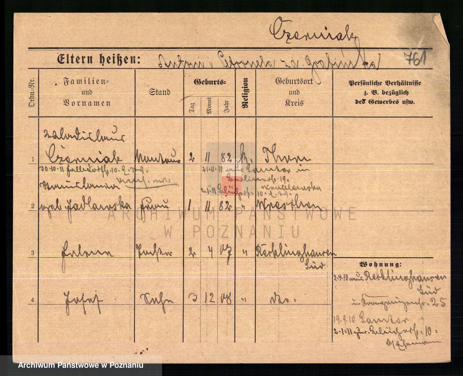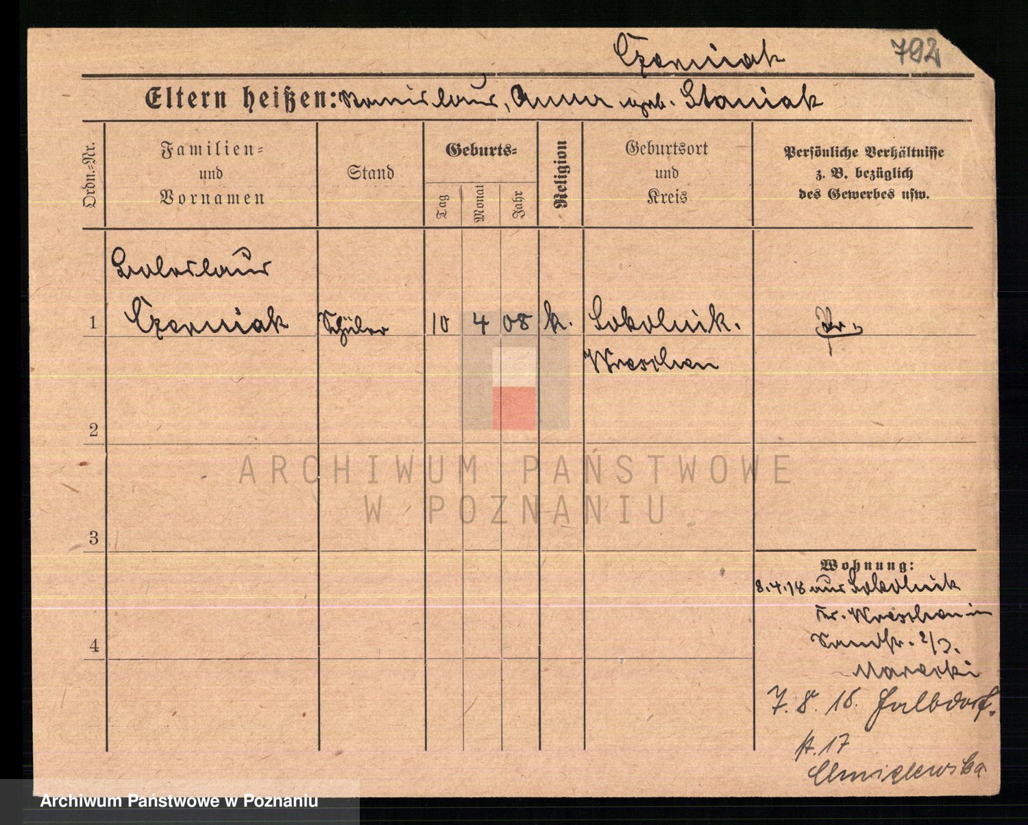 Podgląd karty osobowej dostępny jest po kliknięciu na nazwisko lub ikonkę karty. Można dokonywać powiększenia (ikony na górze) lub przechodzić między kolejnymi skanami (strzałki po bokach).