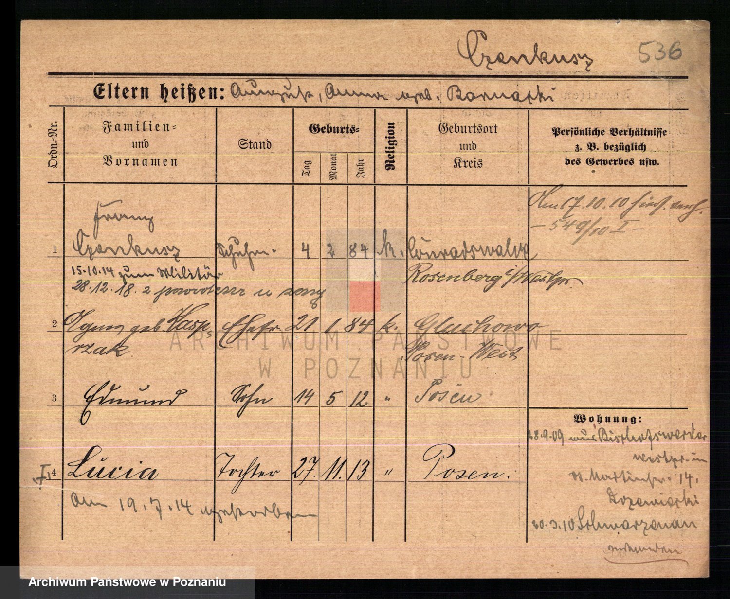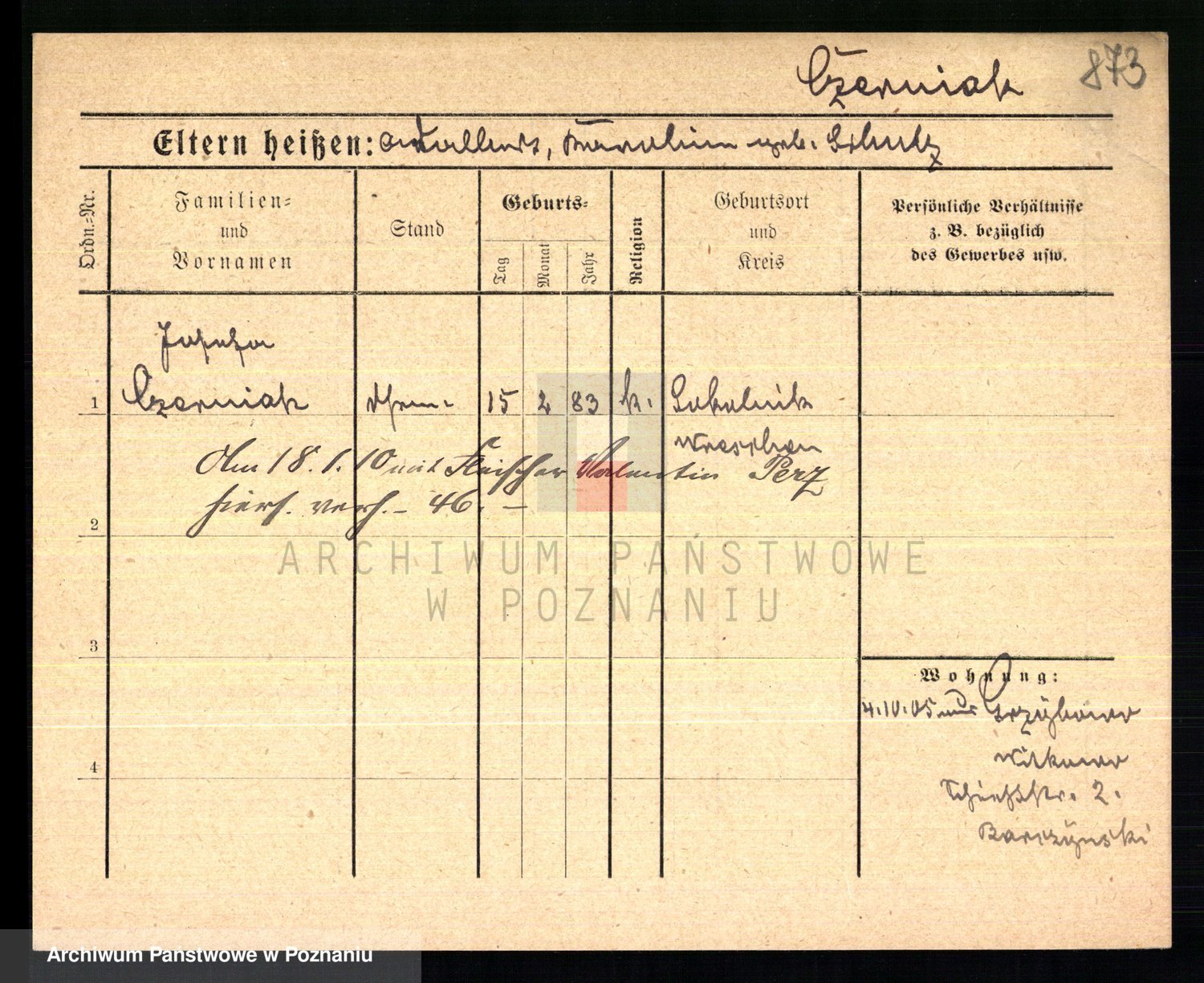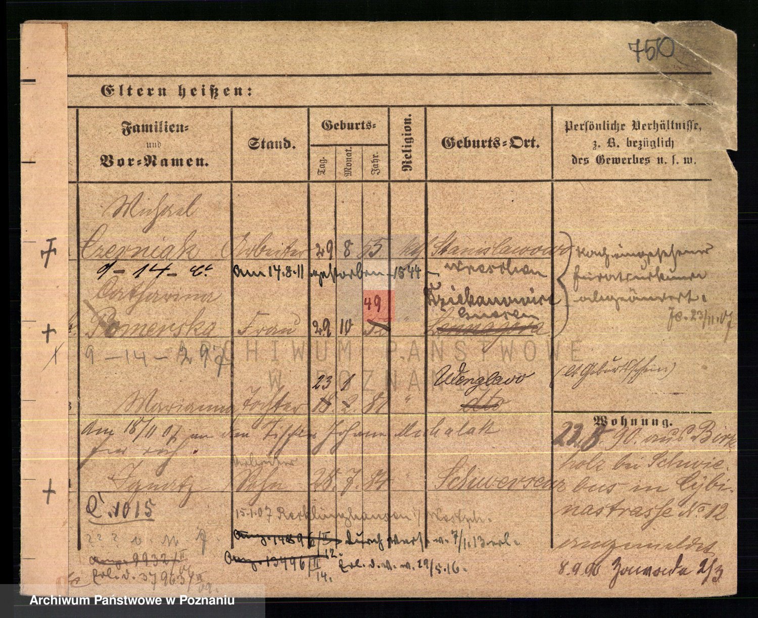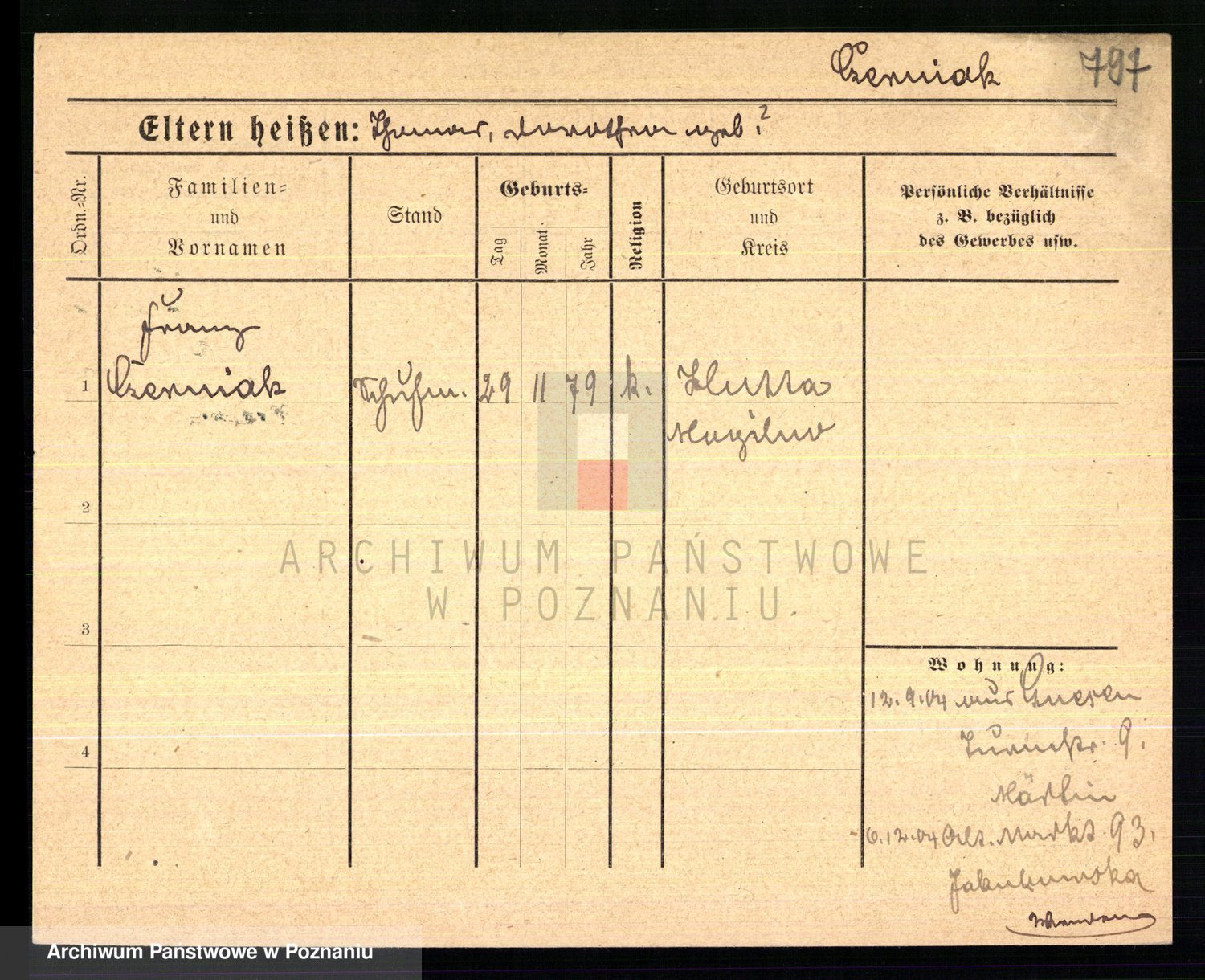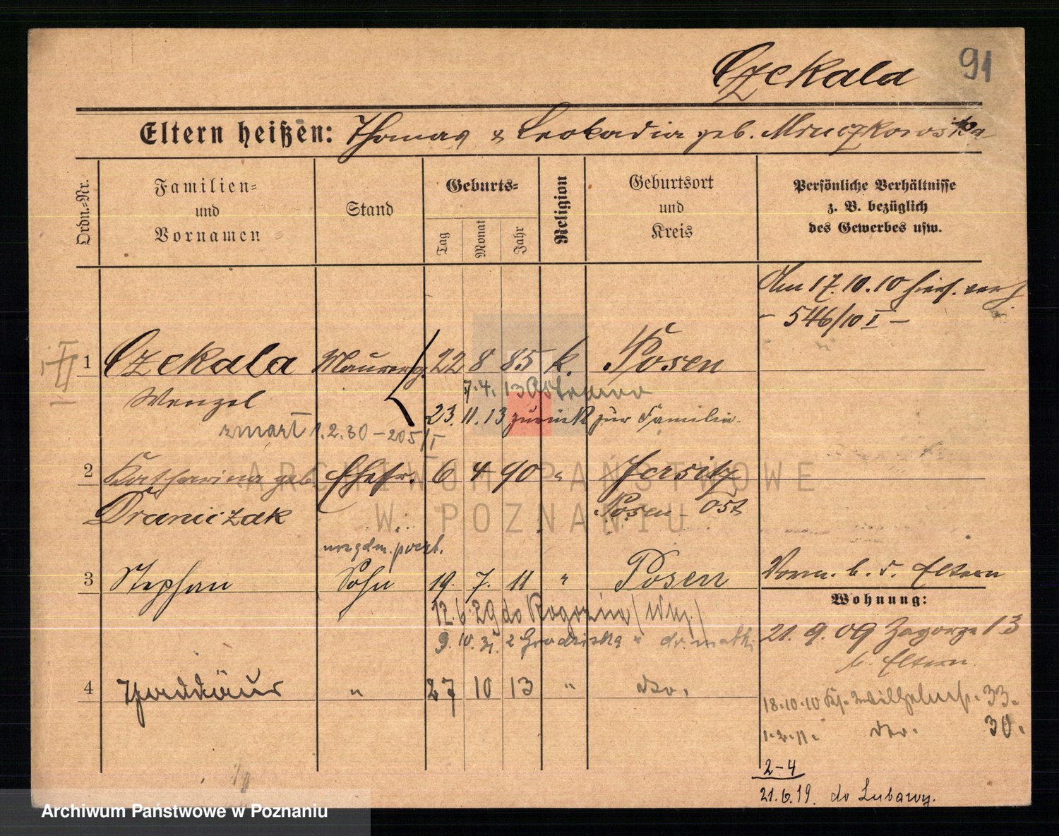 Podgląd karty osobowej dostępny jest po kliknięciu na nazwisko lub ikonkę karty. Można dokonywać powiększenia (ikony na górze) lub przechodzić między kolejnymi skanami (strzałki po bokach).